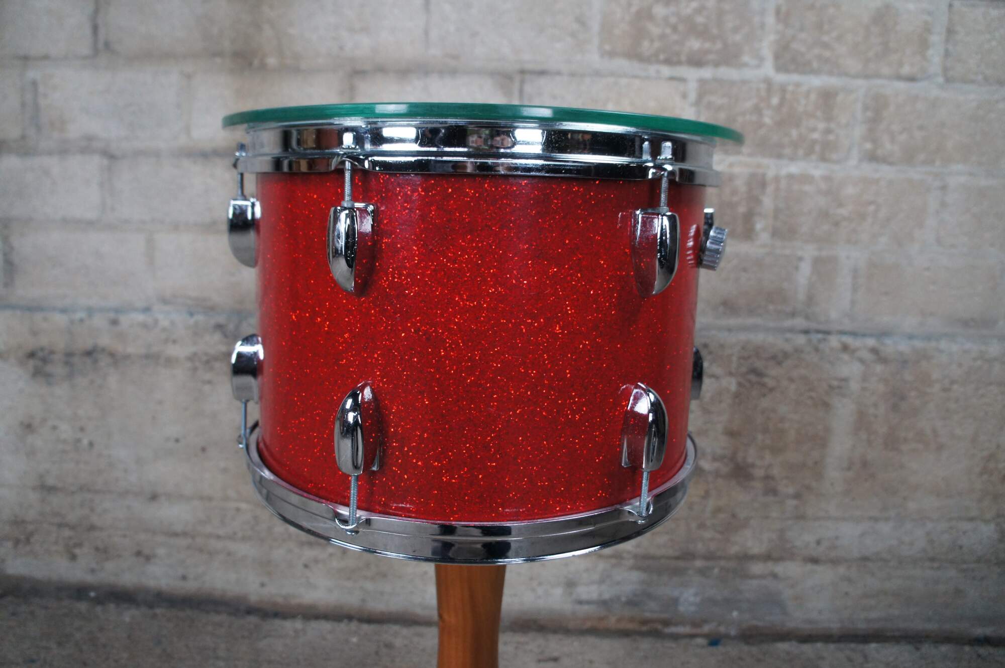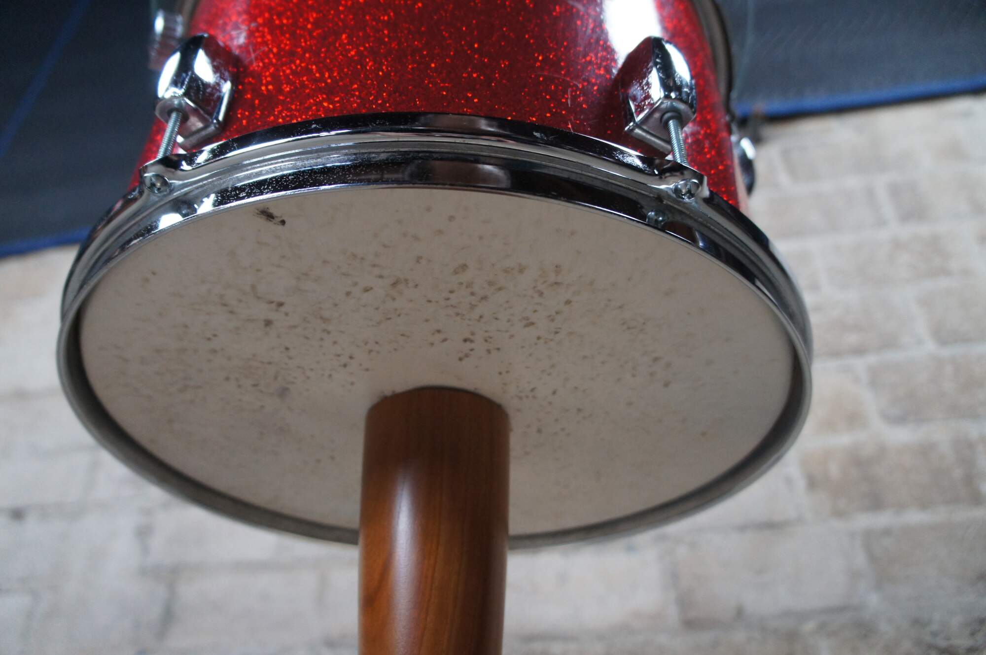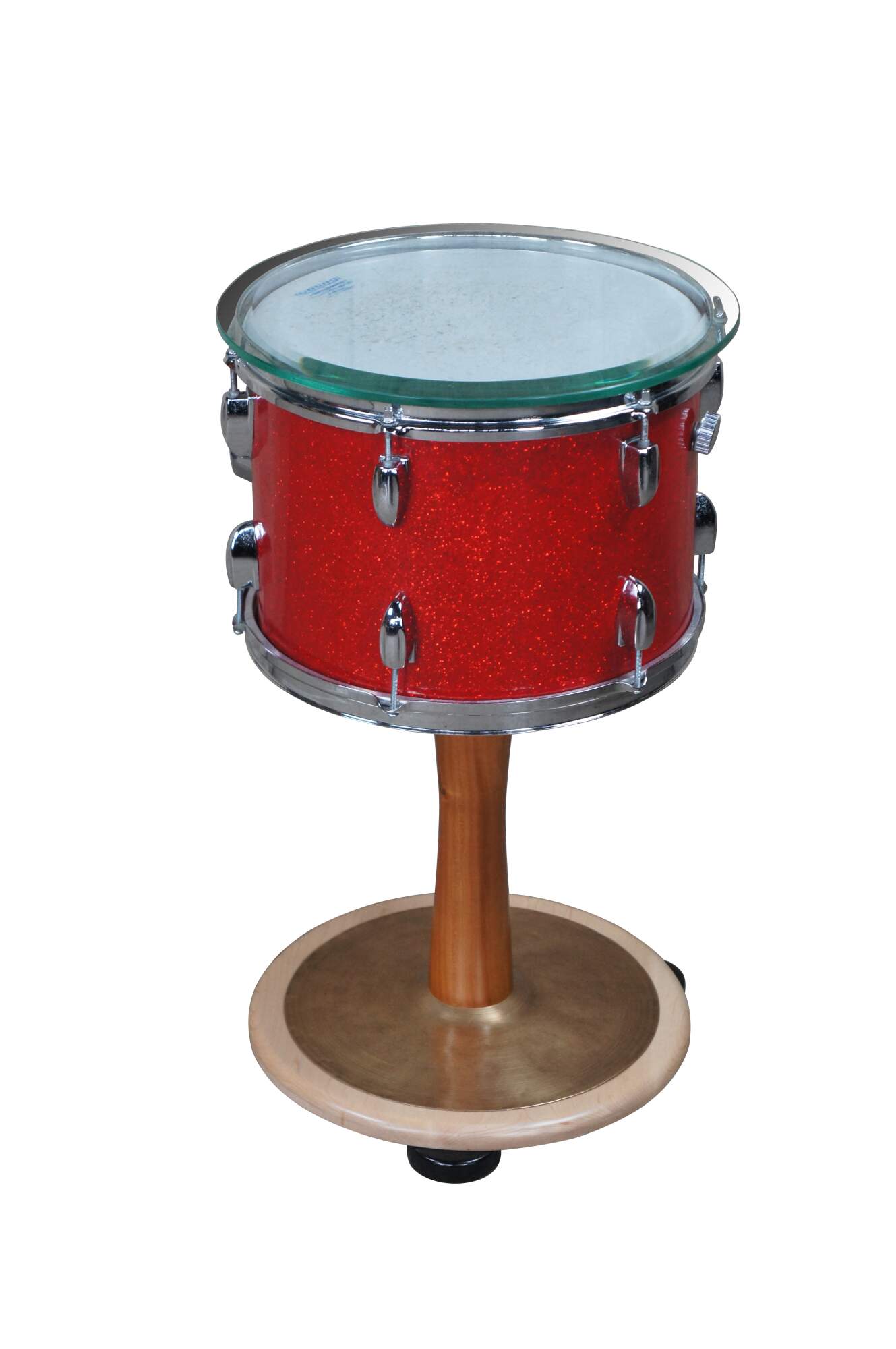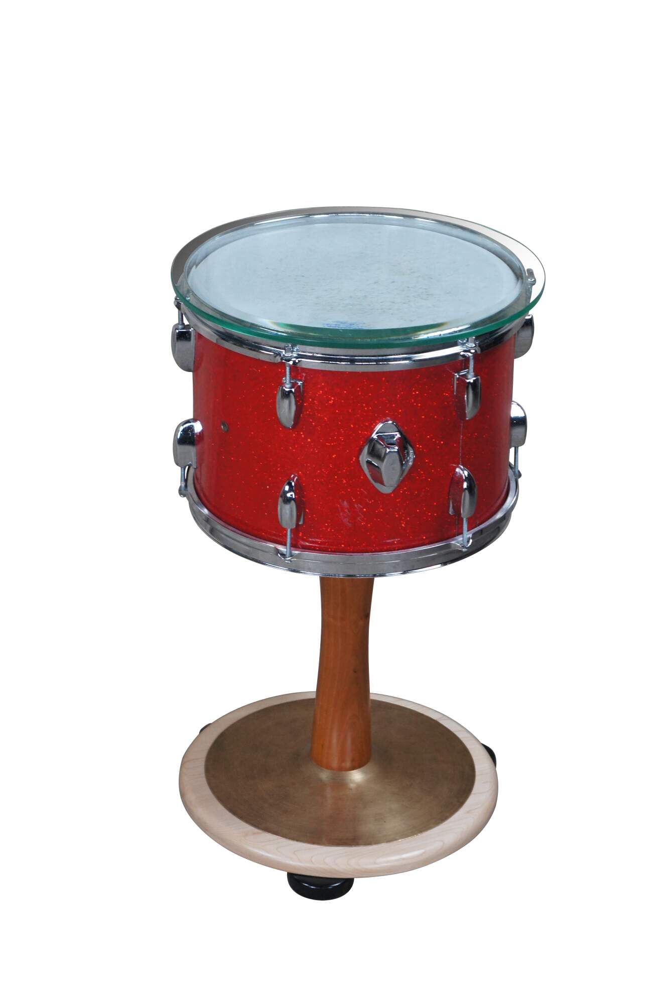 Vintage reclaimed / arts & crafts drum side table. Made from an old Ludwig drum with red sparkle varnish, turned support and cymbal accent base.