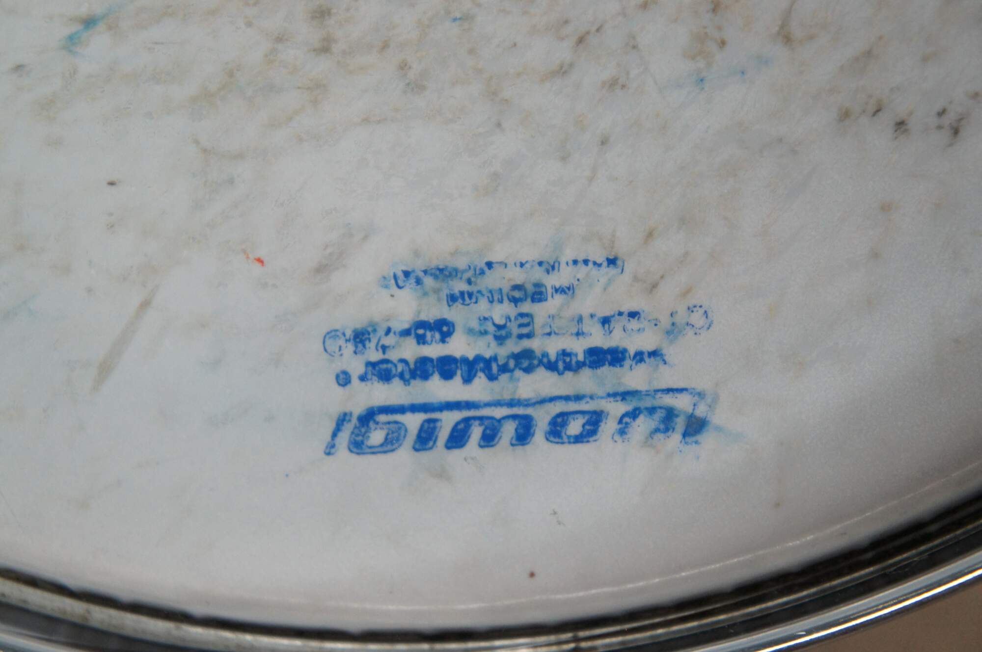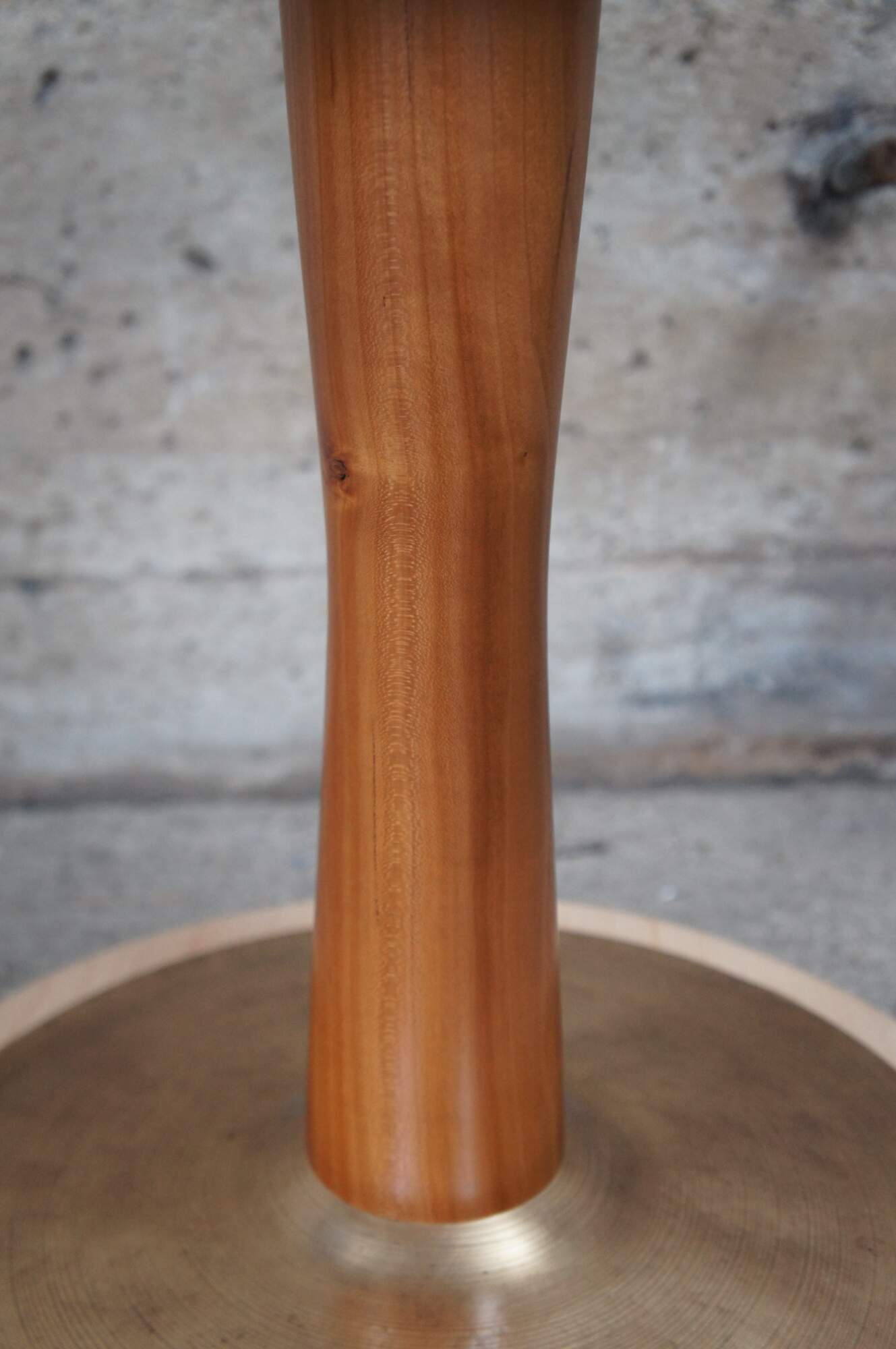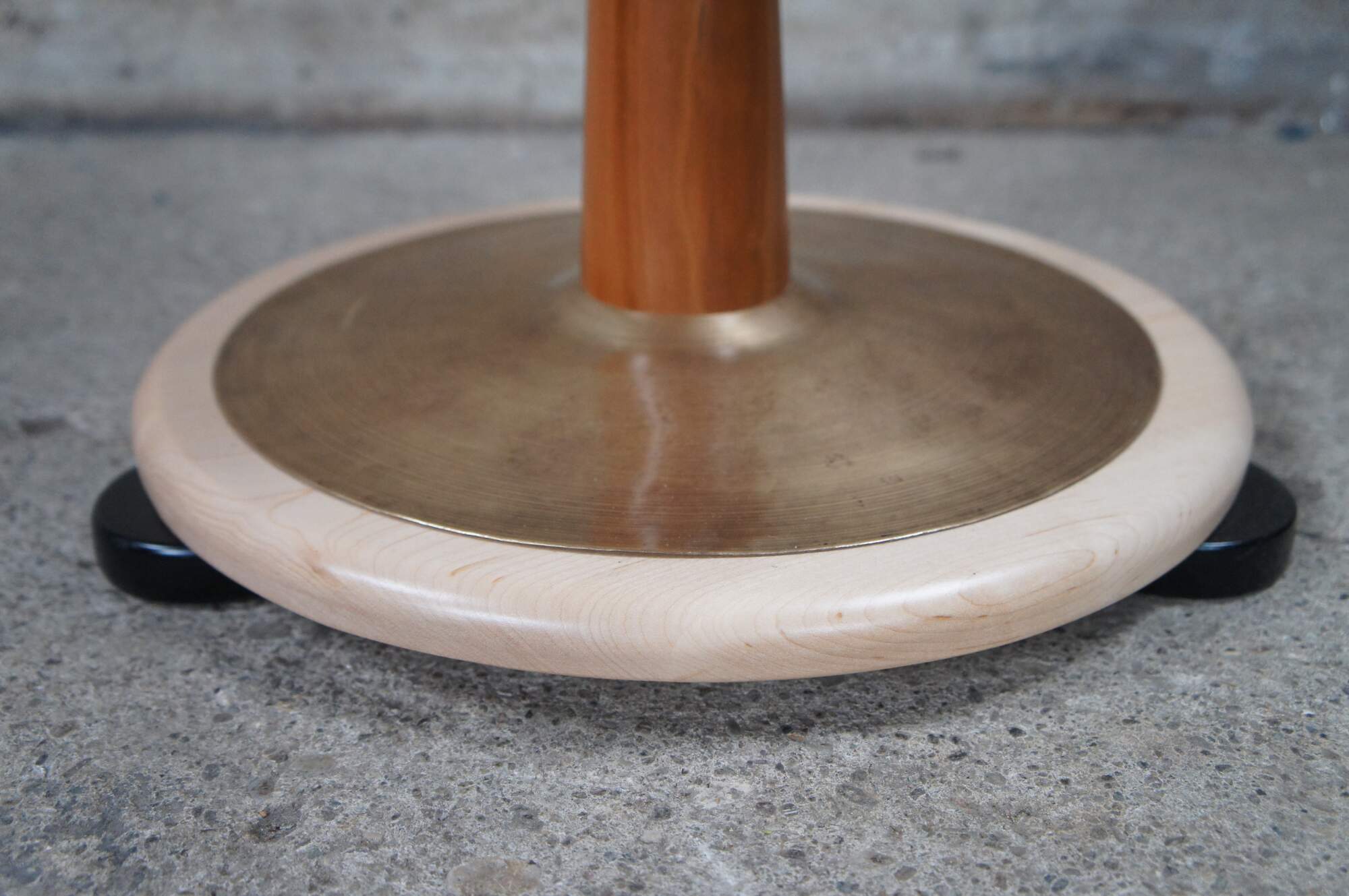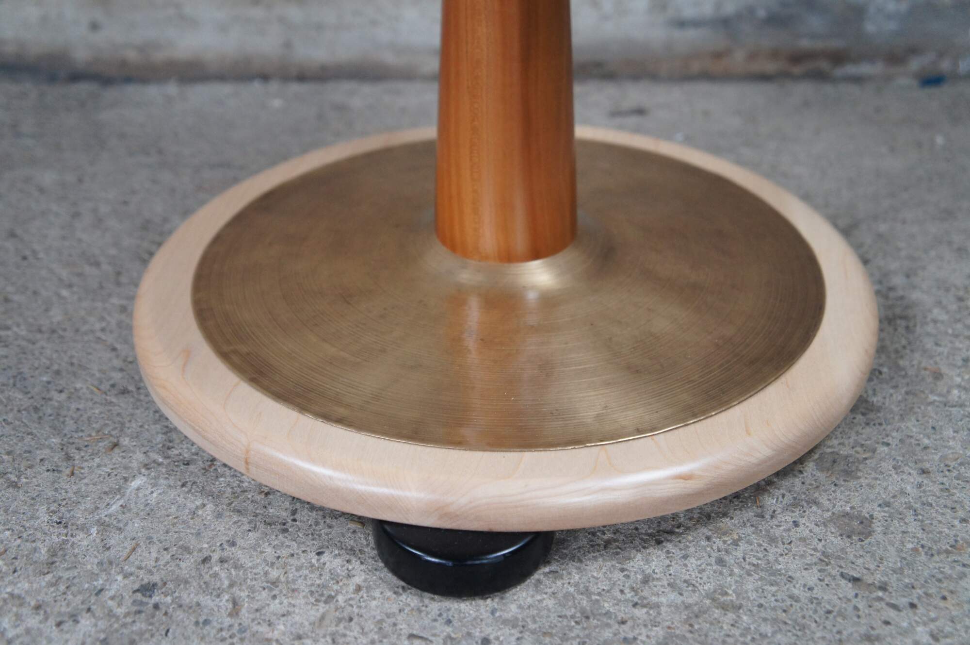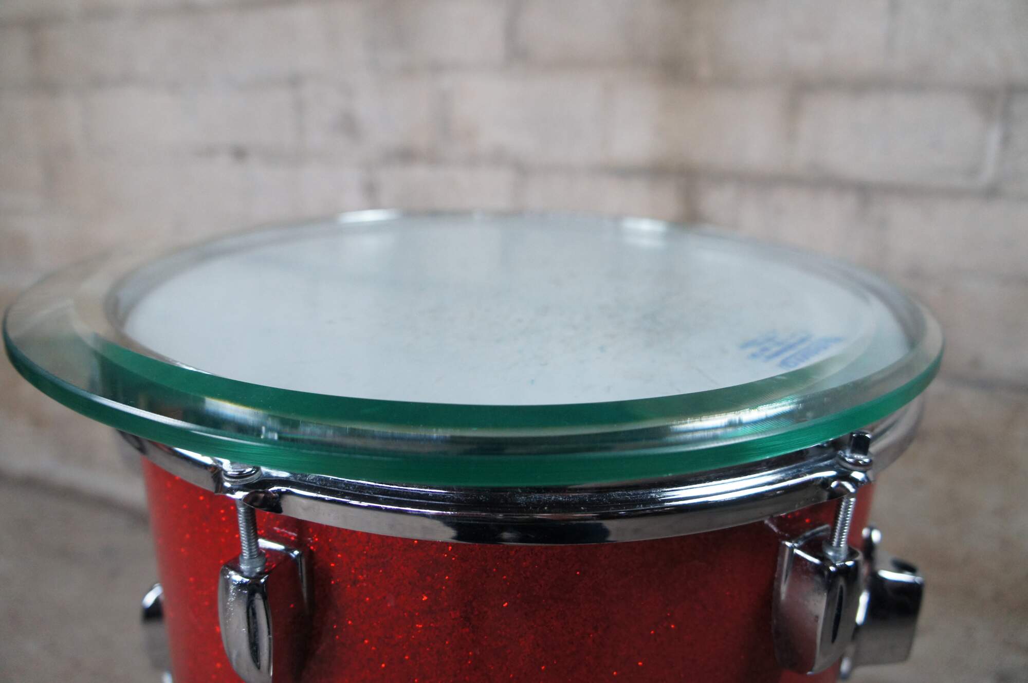 Vintage reclaimed / arts & crafts drum side table. Made from an old Ludwig drum with red sparkle varnish, turned support and cymbal accent base.