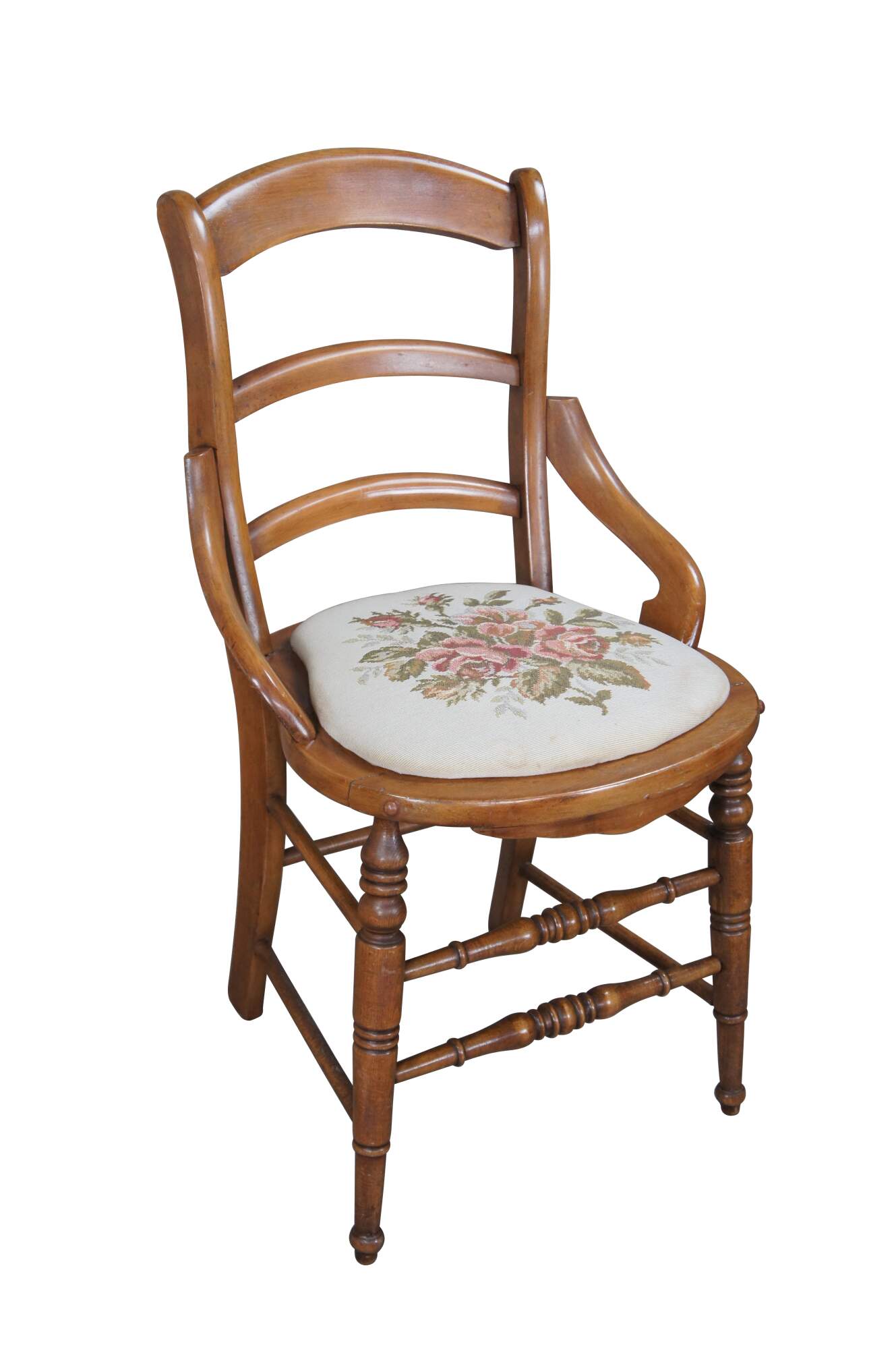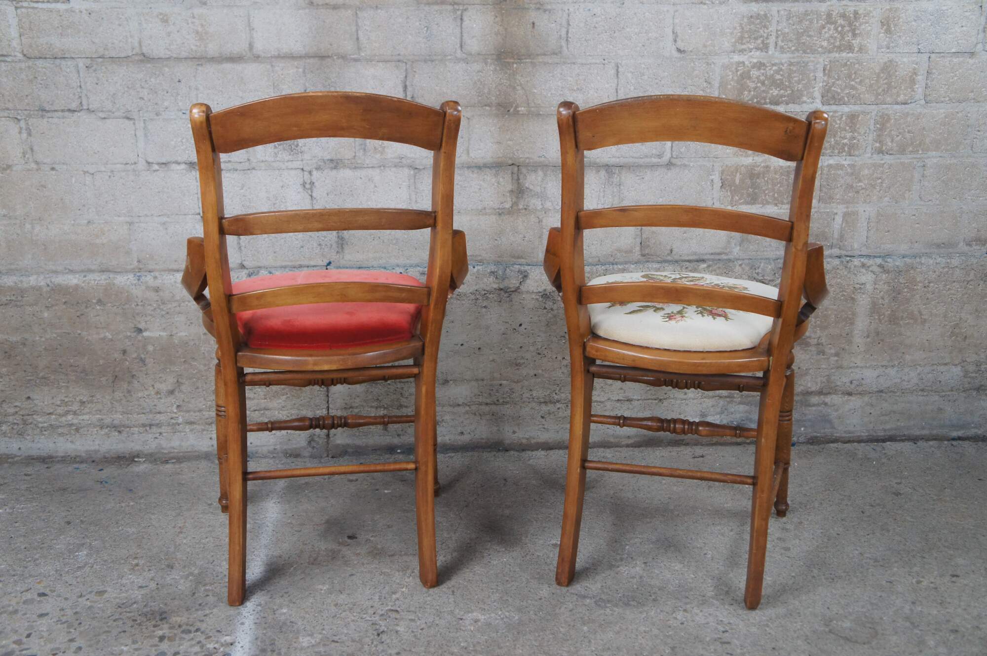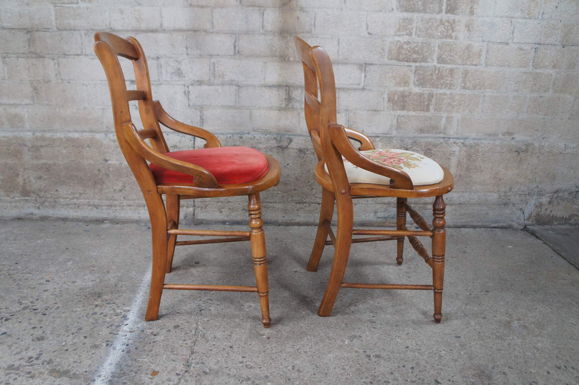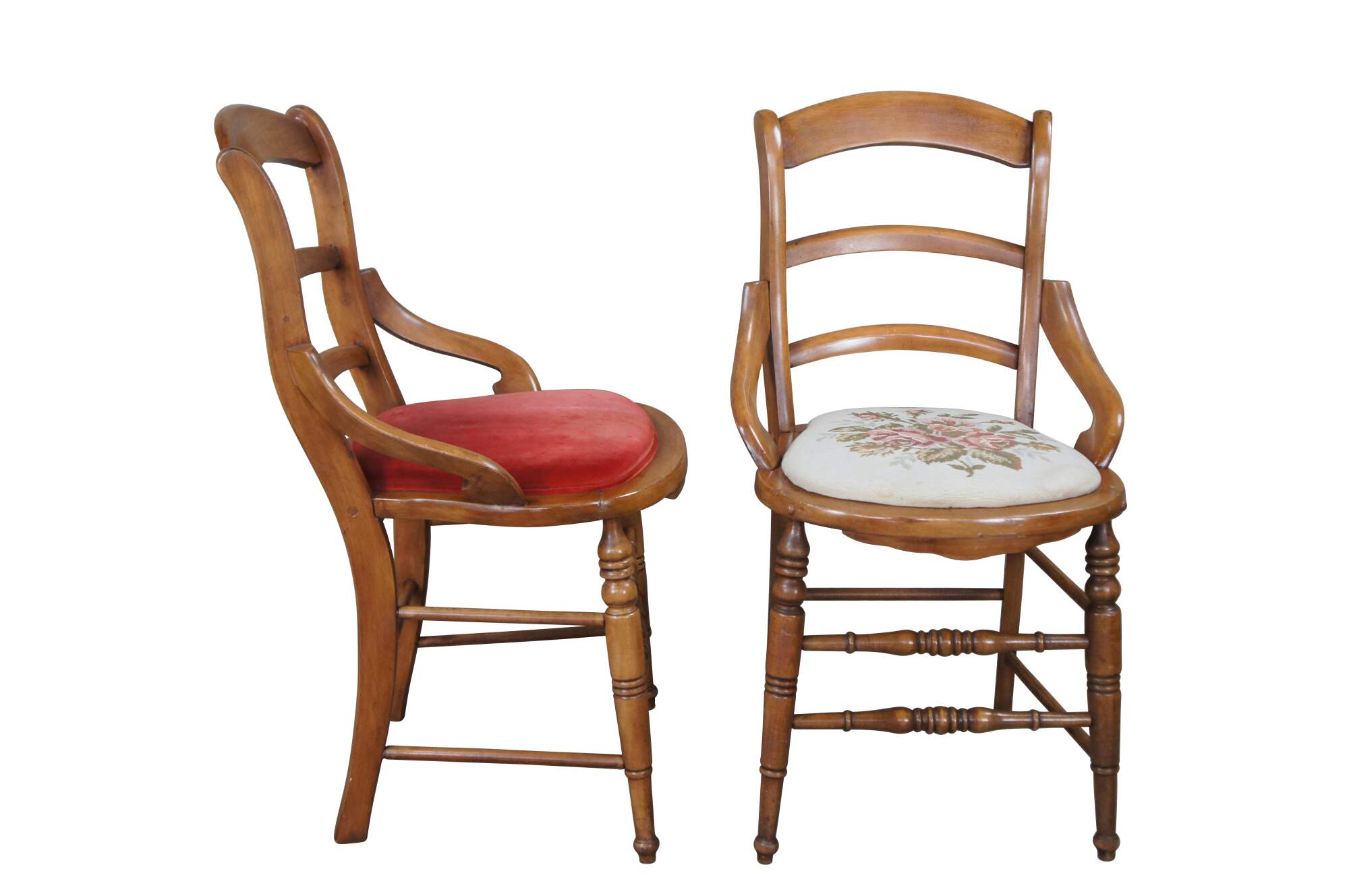 Two antique Victorian Eastlake parlor accent chairs. Made of maple featuring ladderback design with low arm, turned posts, and needlepoint / velvet seats.