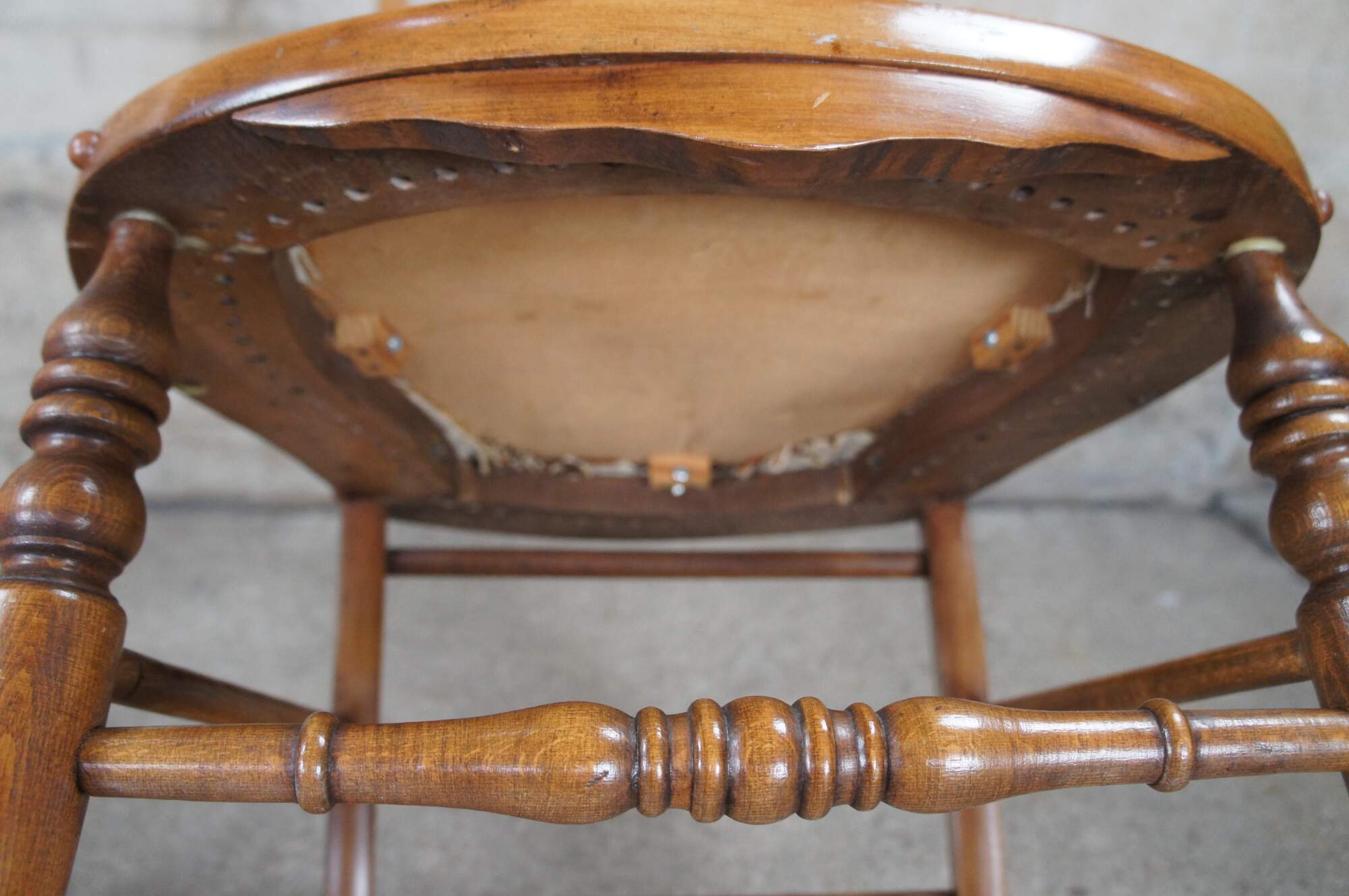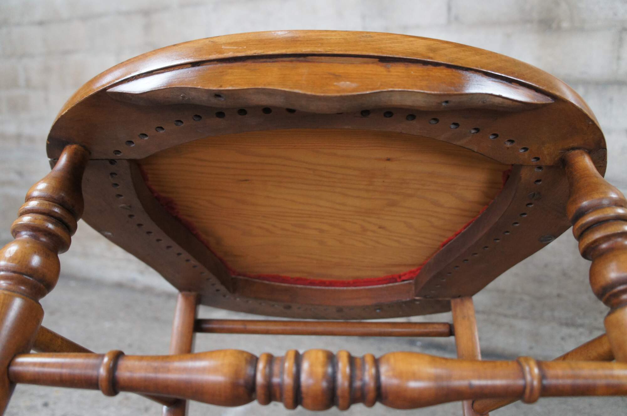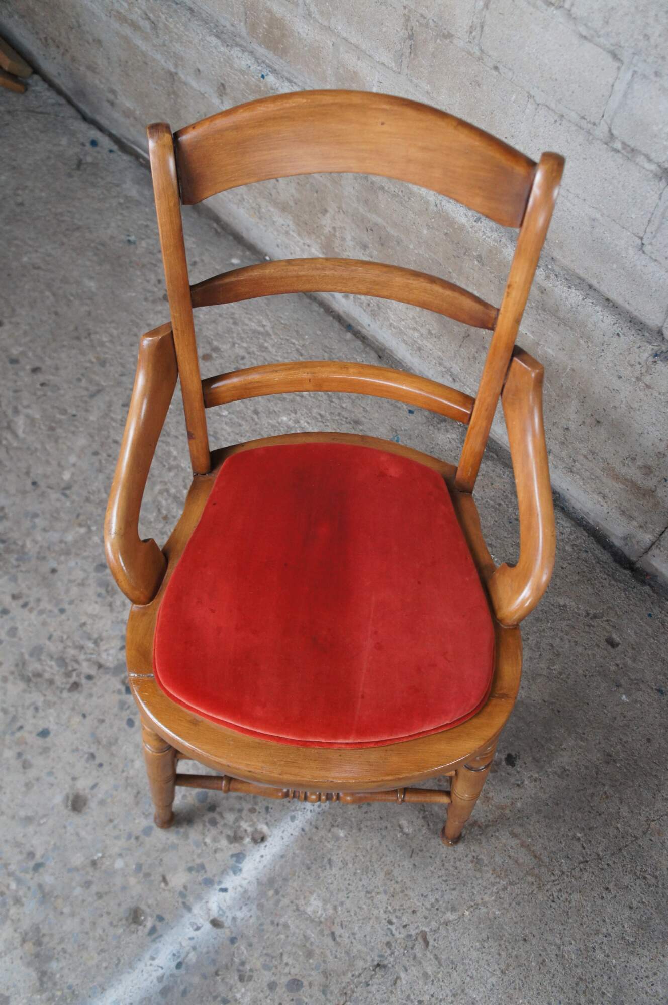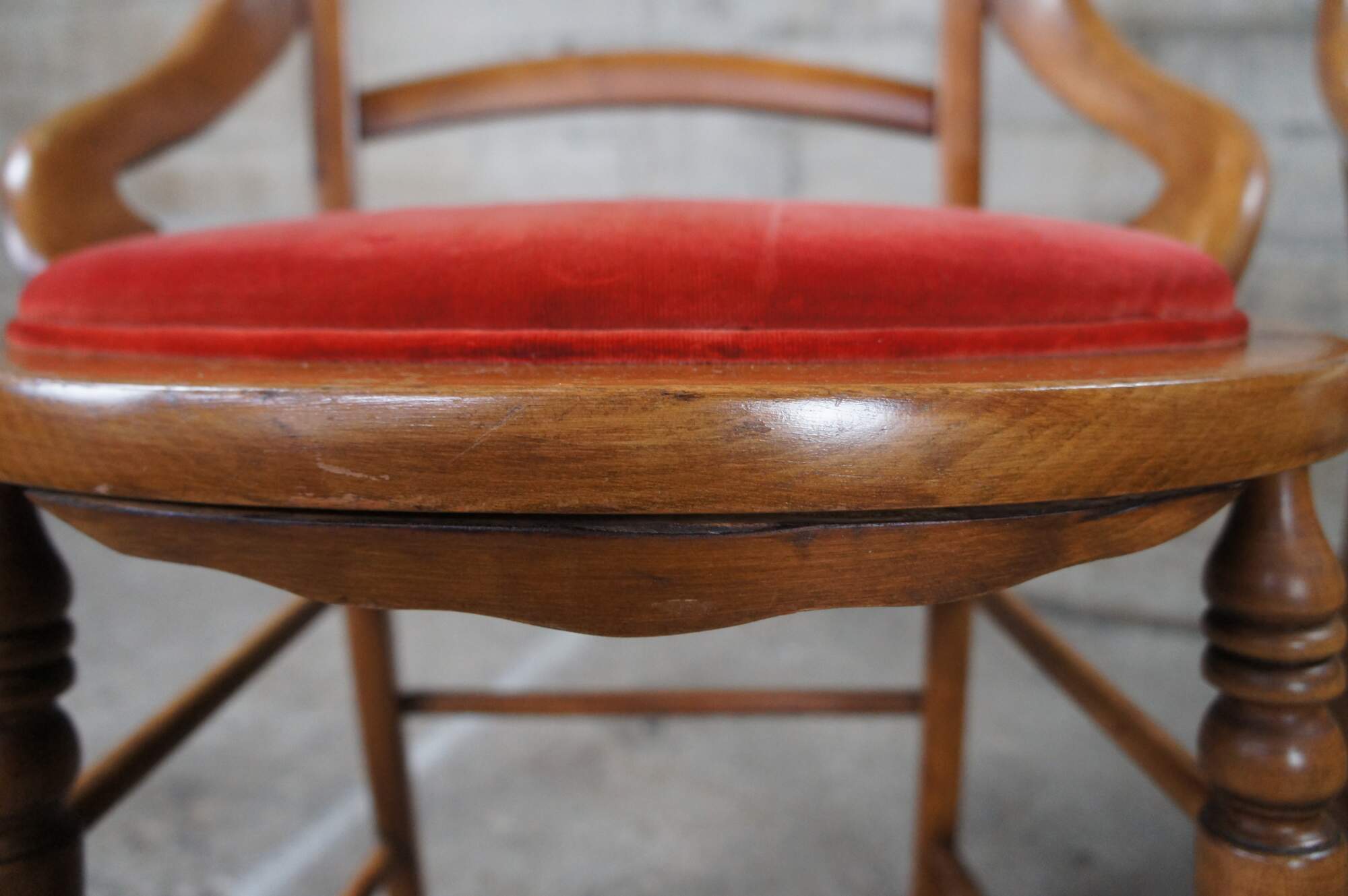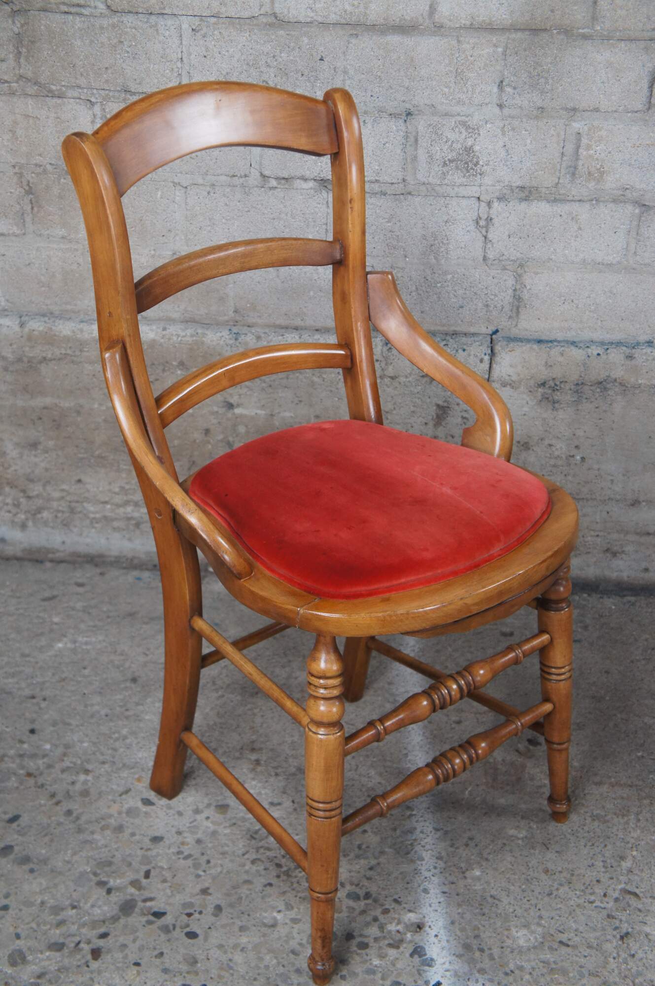 Two antique Victorian Eastlake parlor accent chairs. Made of maple featuring ladderback design with low arm, turned posts, and needlepoint / velvet seats.