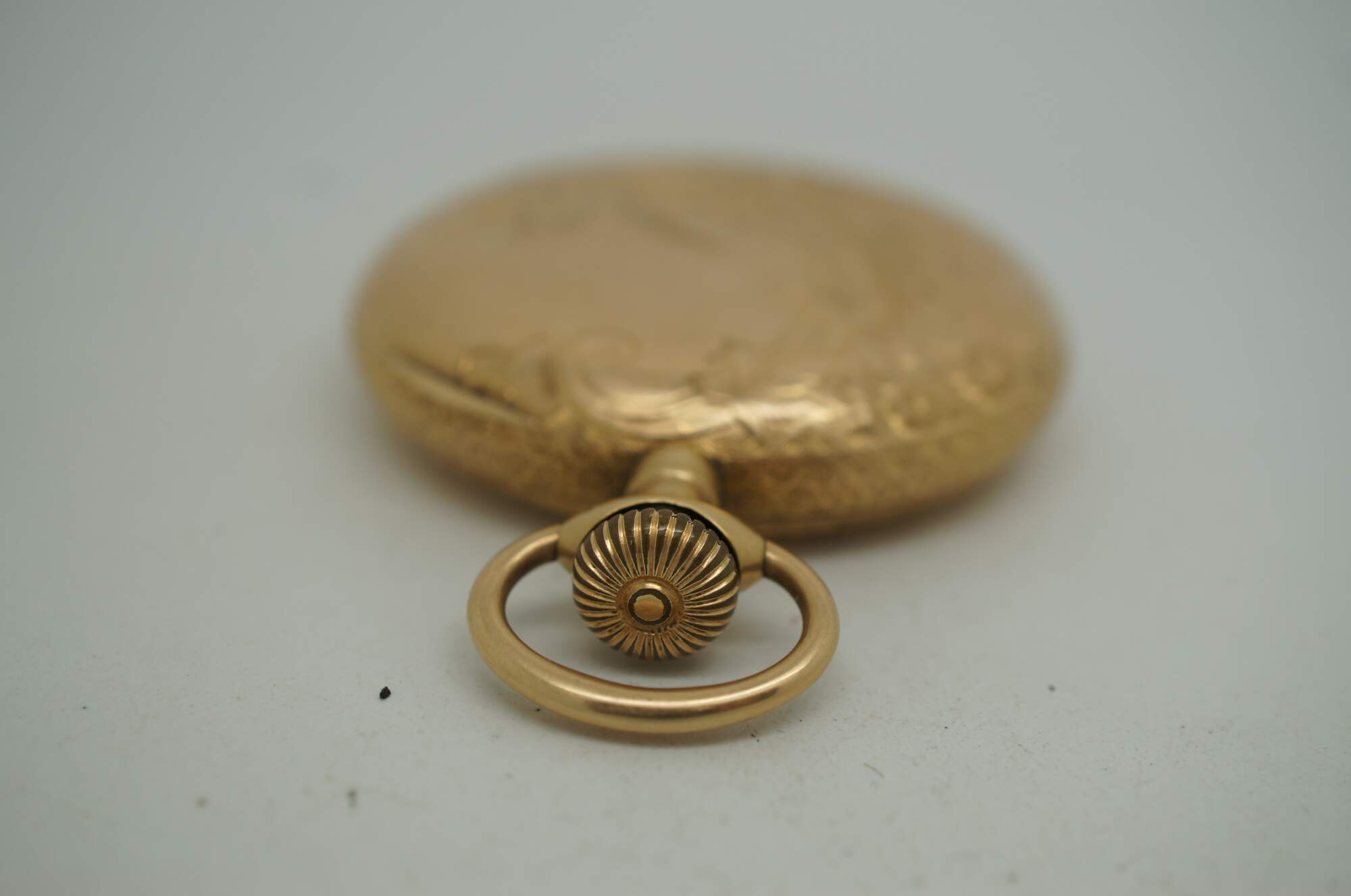 Circa 1909 yellow 14K gold Washington Watch Company pocket watch, beautifully etched with the head of a winged dragon / Phoenix / Griffon peeking out of a scrolling foliate motif. Case: Western Watch Case Company - Serial Numered: 146283 - 14K Gold. Movement: Lafayette - Serial Number: 1748747 - Grade: Sangamo - Model: 4 - Estimated Production Year: 1909 - Size: 16s - 23 Ruby Jewels - Movement Configuration: Hunting. White face marked Washington Clock Co, black and red lettering, Arabic numerals, one minute subdial, black hands. Mechanical / wind up.