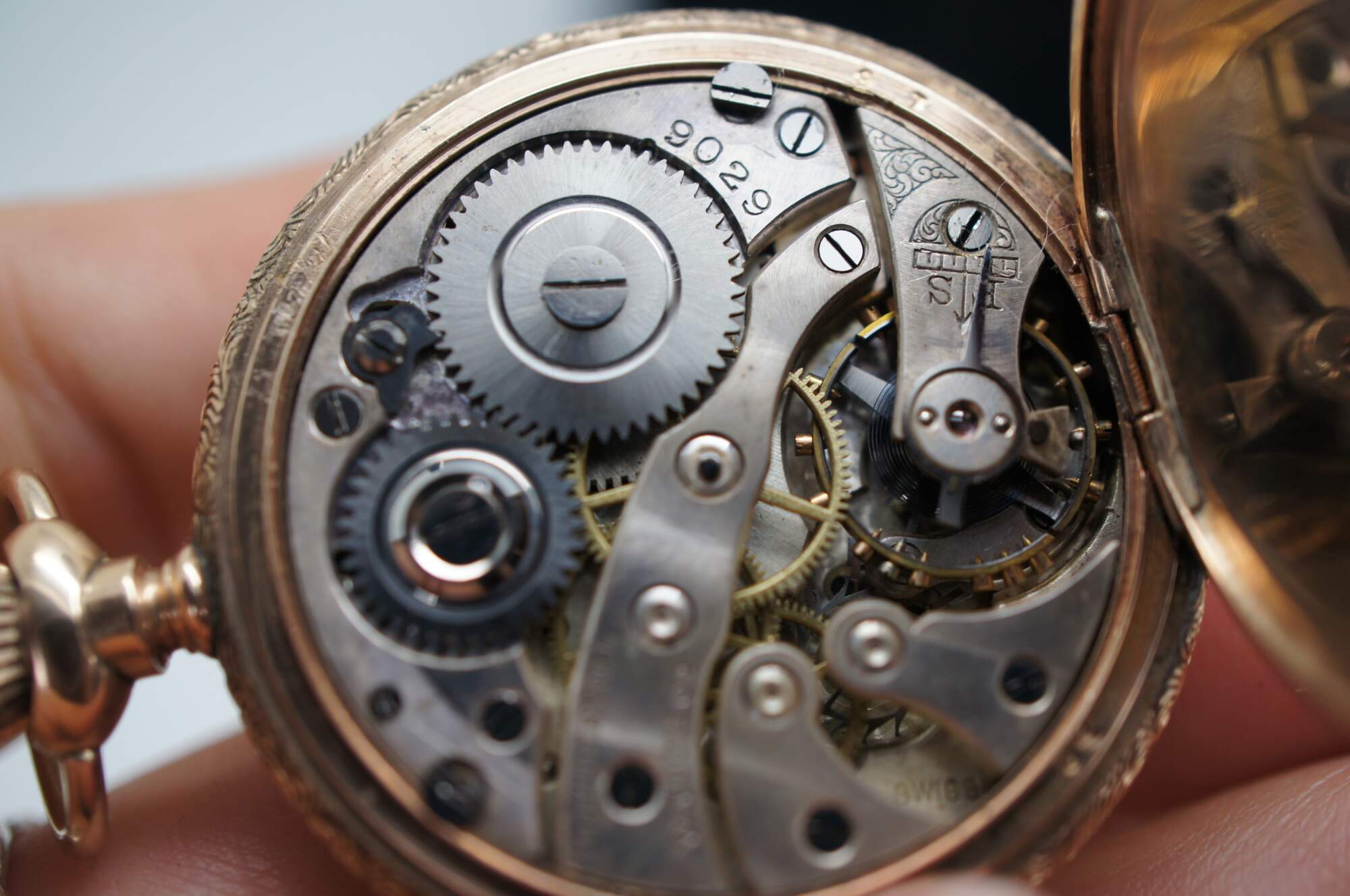 Early 20th century 8K gold pocket watch, intricately etched with swirling foliate motif around a bird and leaves on one side and foliate frame with monogram JW on the other. Case: Brooklyn Watch Case Company - Serial Number: 940416 - 8K Gold (A1 Eagle mark) - Interior of case engraved "Frank Hack / Josephine Woodrick. Movement: Continental Watch Company - Swiss - Number 9029 - White face marked C.W. Co, black and red lettering, Arabic numerals, one minute subdial, blue-black iridescent hands. Mechanical / wind up.