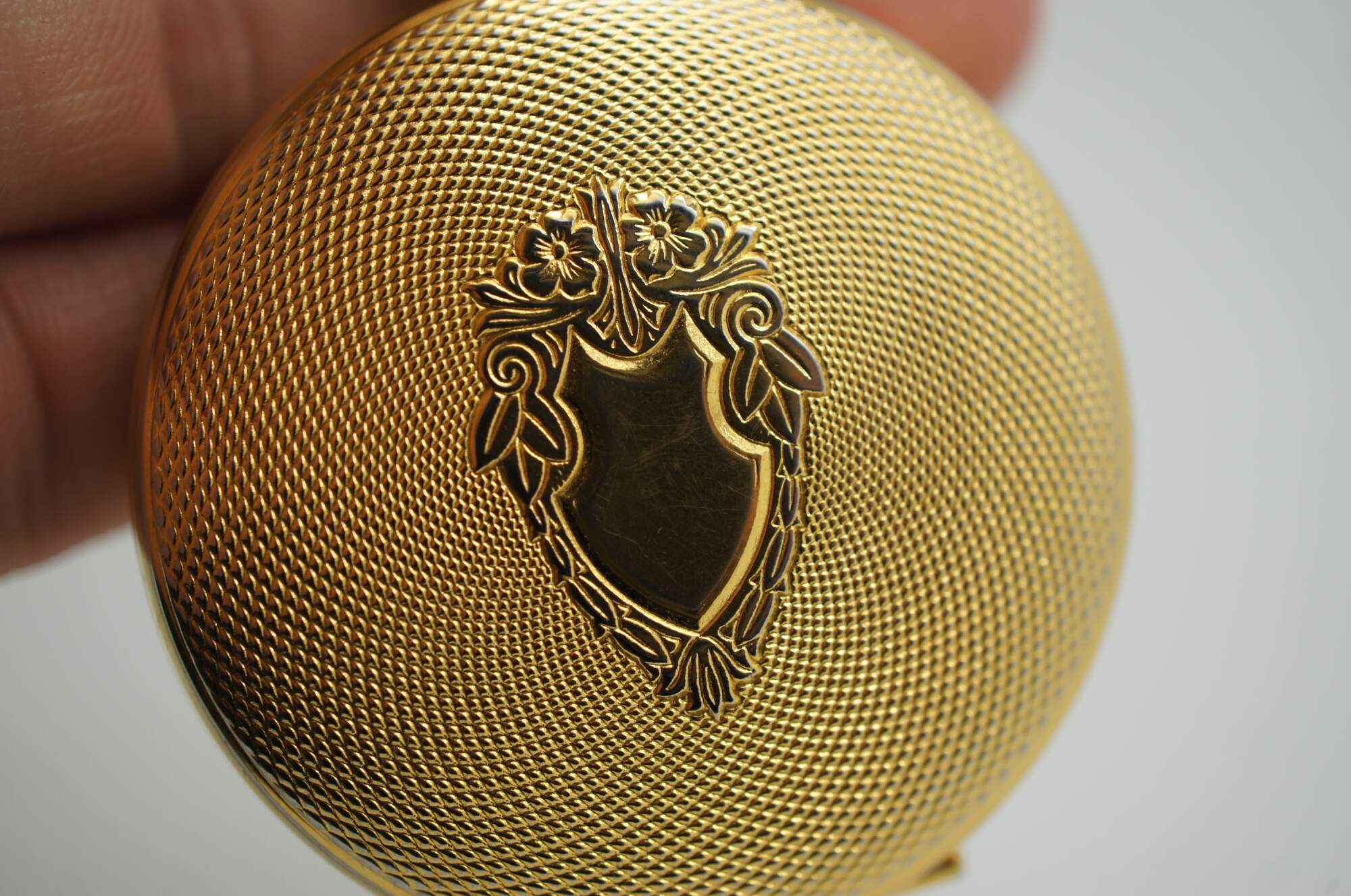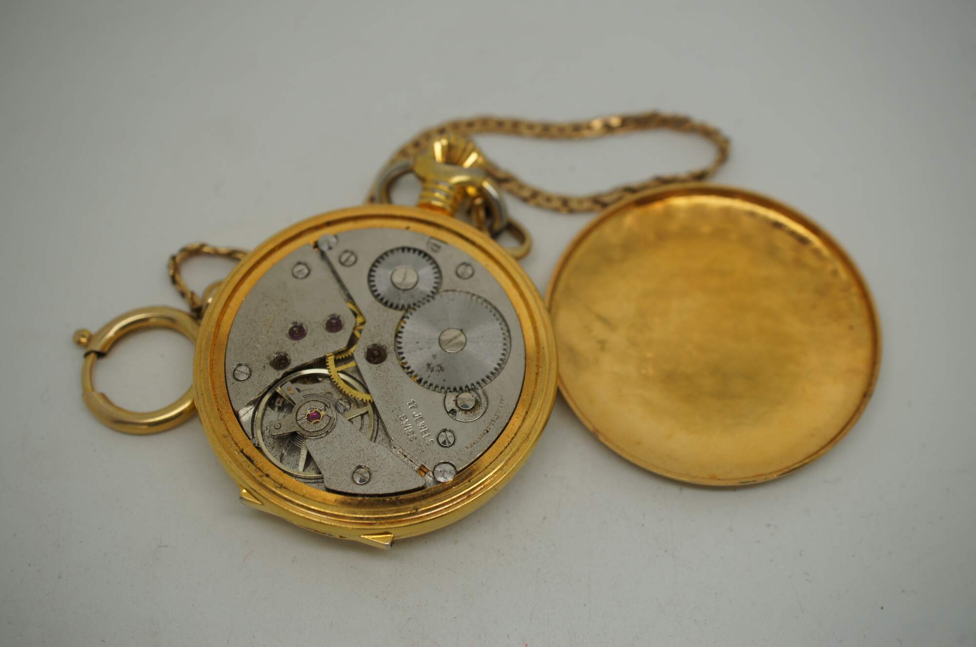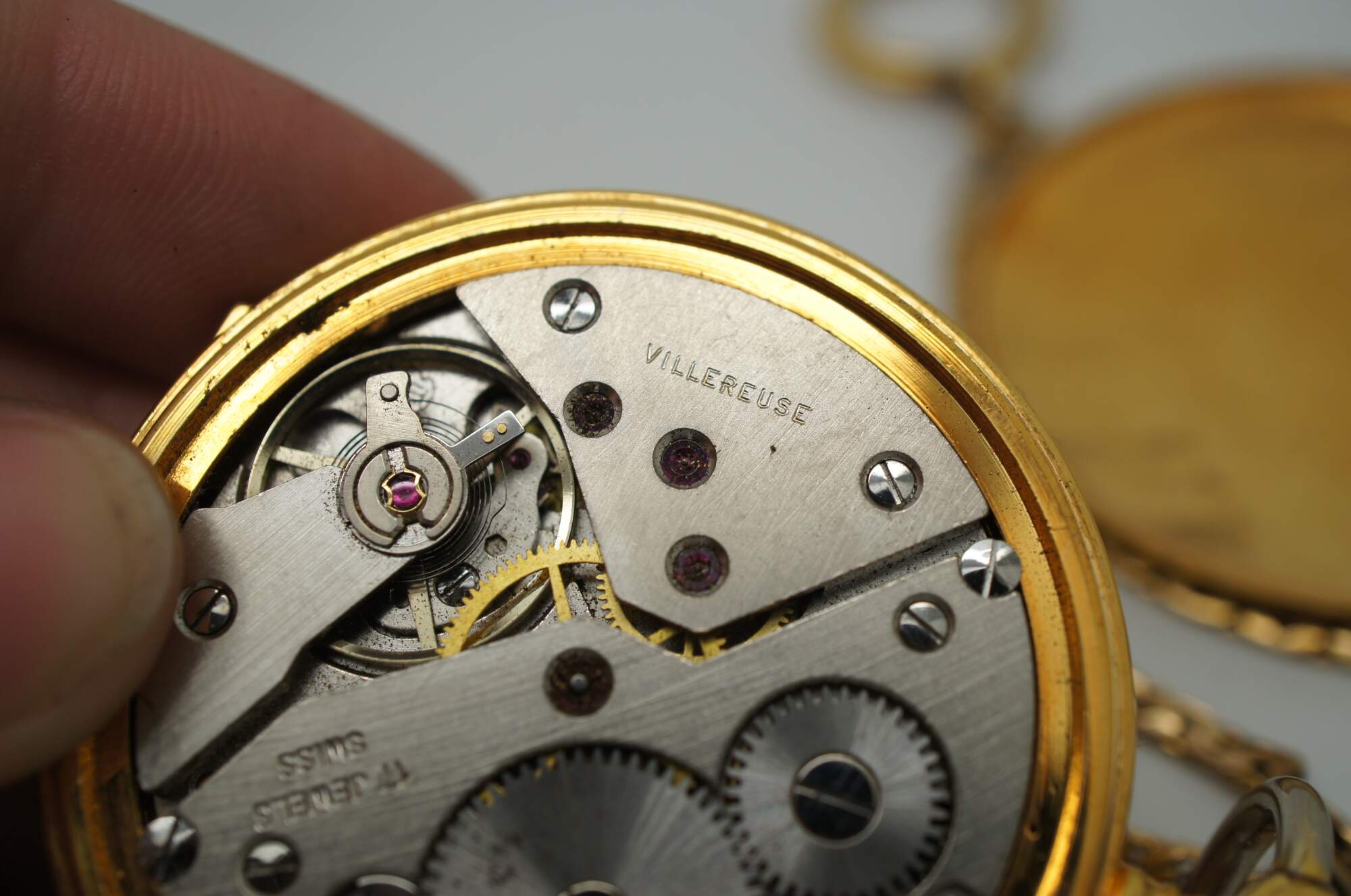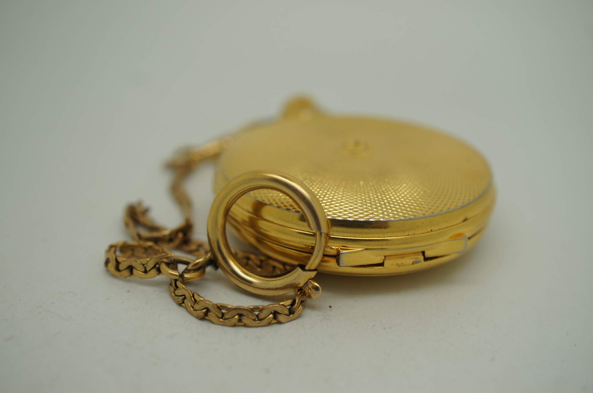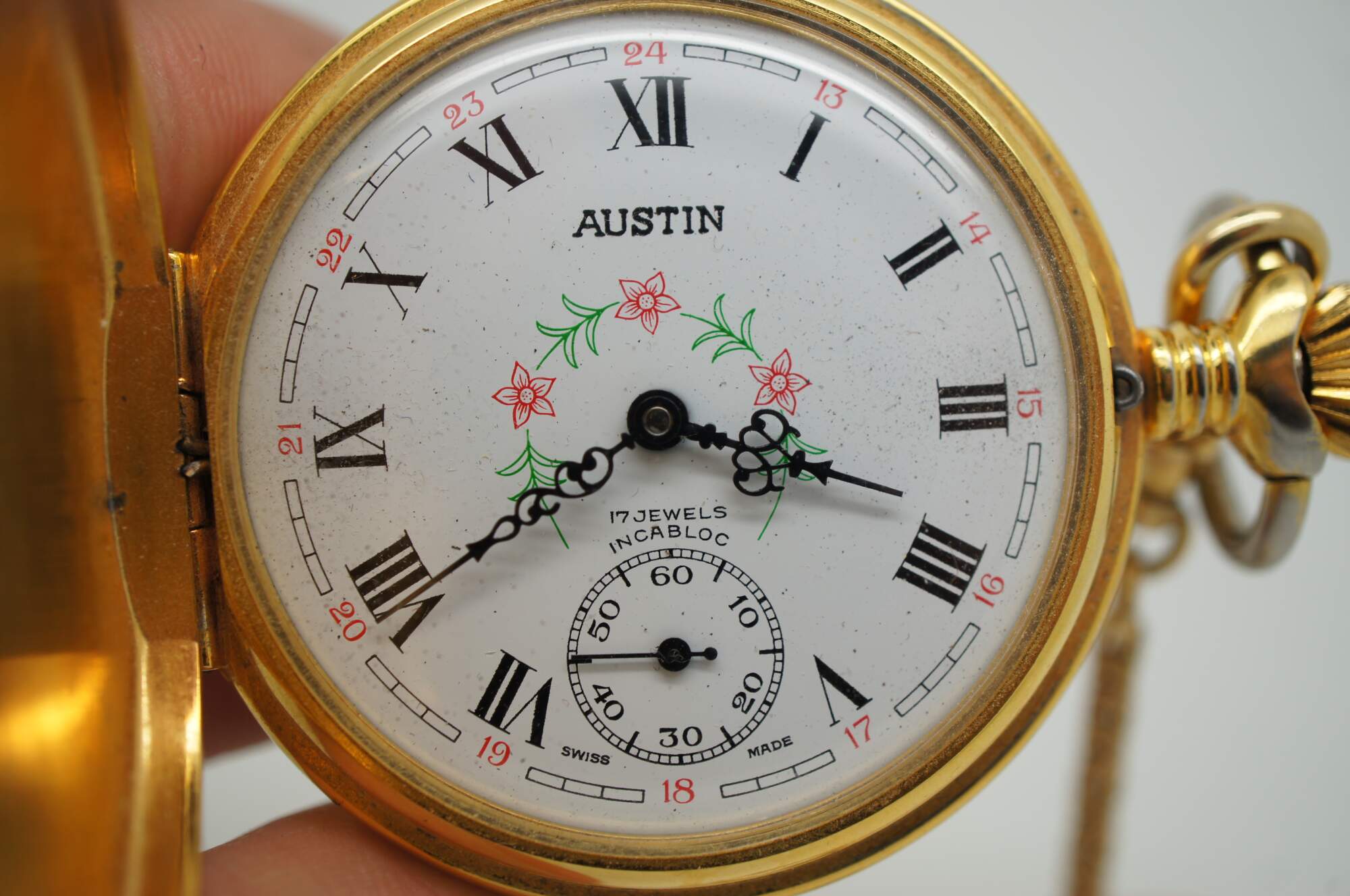 Mid to late 20th century Austin Incabloc pocket watch. Case features a tight diamond texture and a blank flower framed shield for monogram. White face with red and green wreath of flowers, black and red lettering, Roman and Arabic numerals, one minute subdial, black scrolled hands. Movement: Villereuse - Swiss - 17 Jewels. Includes 1/20-12K Gold filled C-link watch chain. Mechanical / wind up.