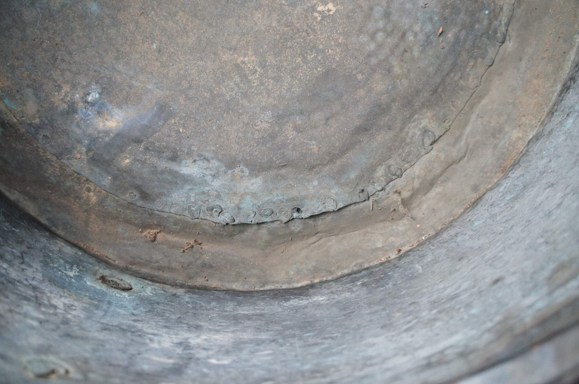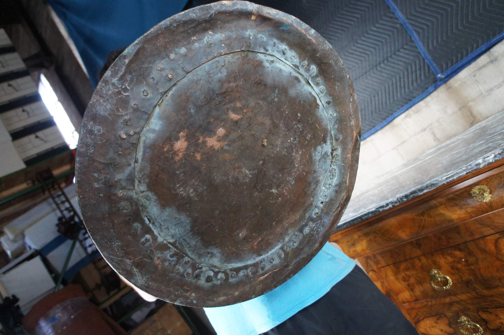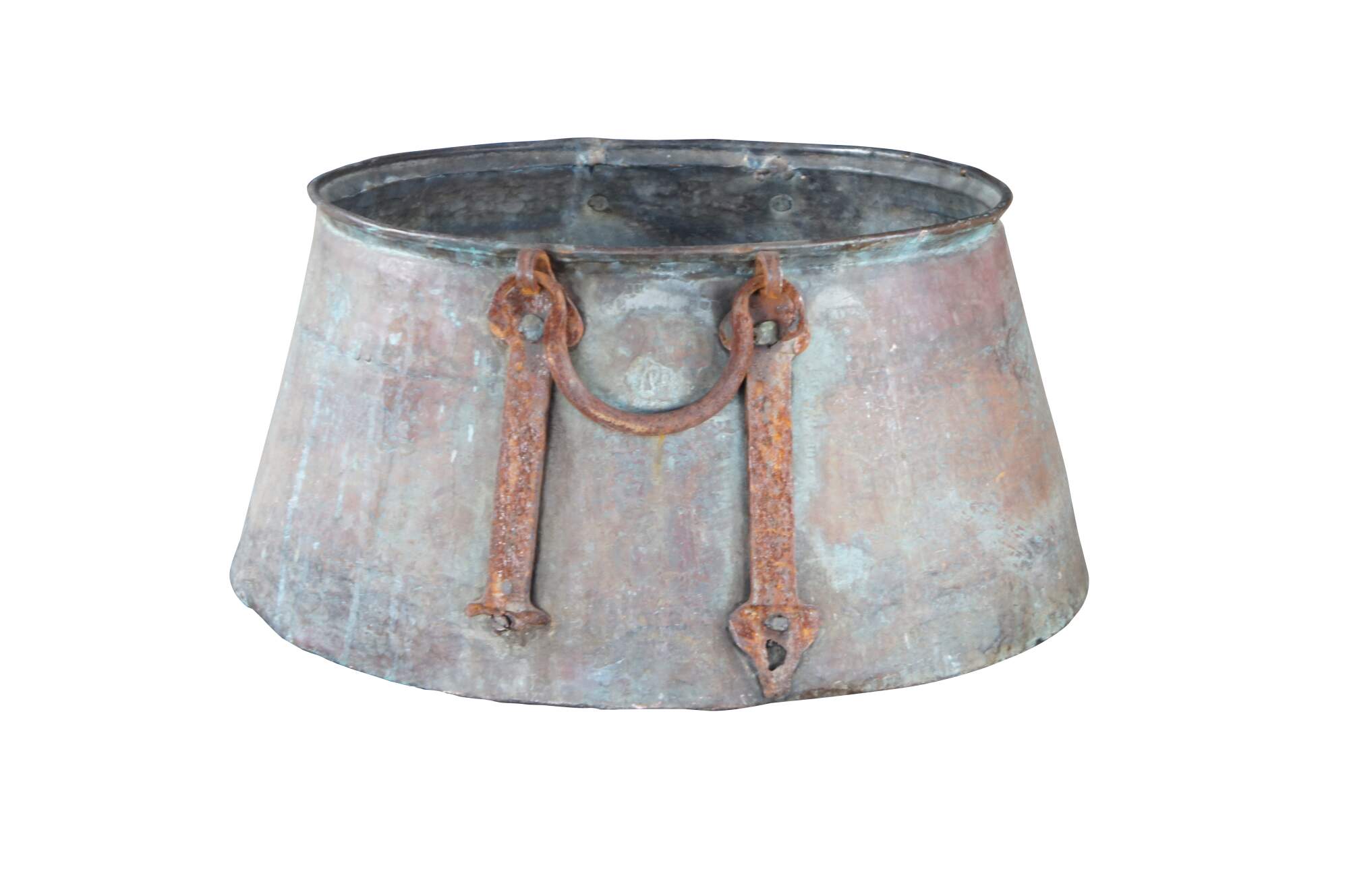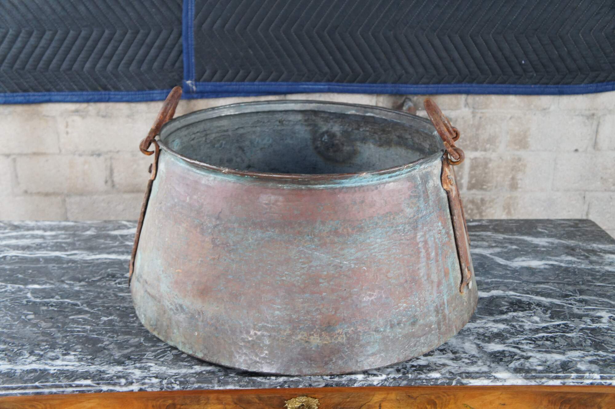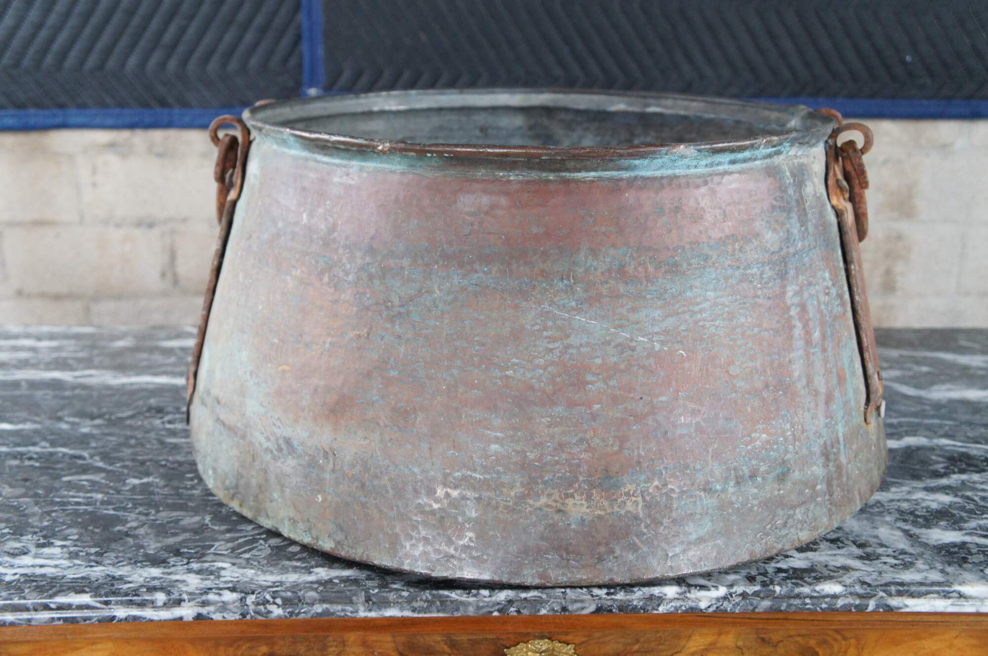 Monumental antique copper cauldron featuring hammered details with dovetailing and ornate forged iron handles.
