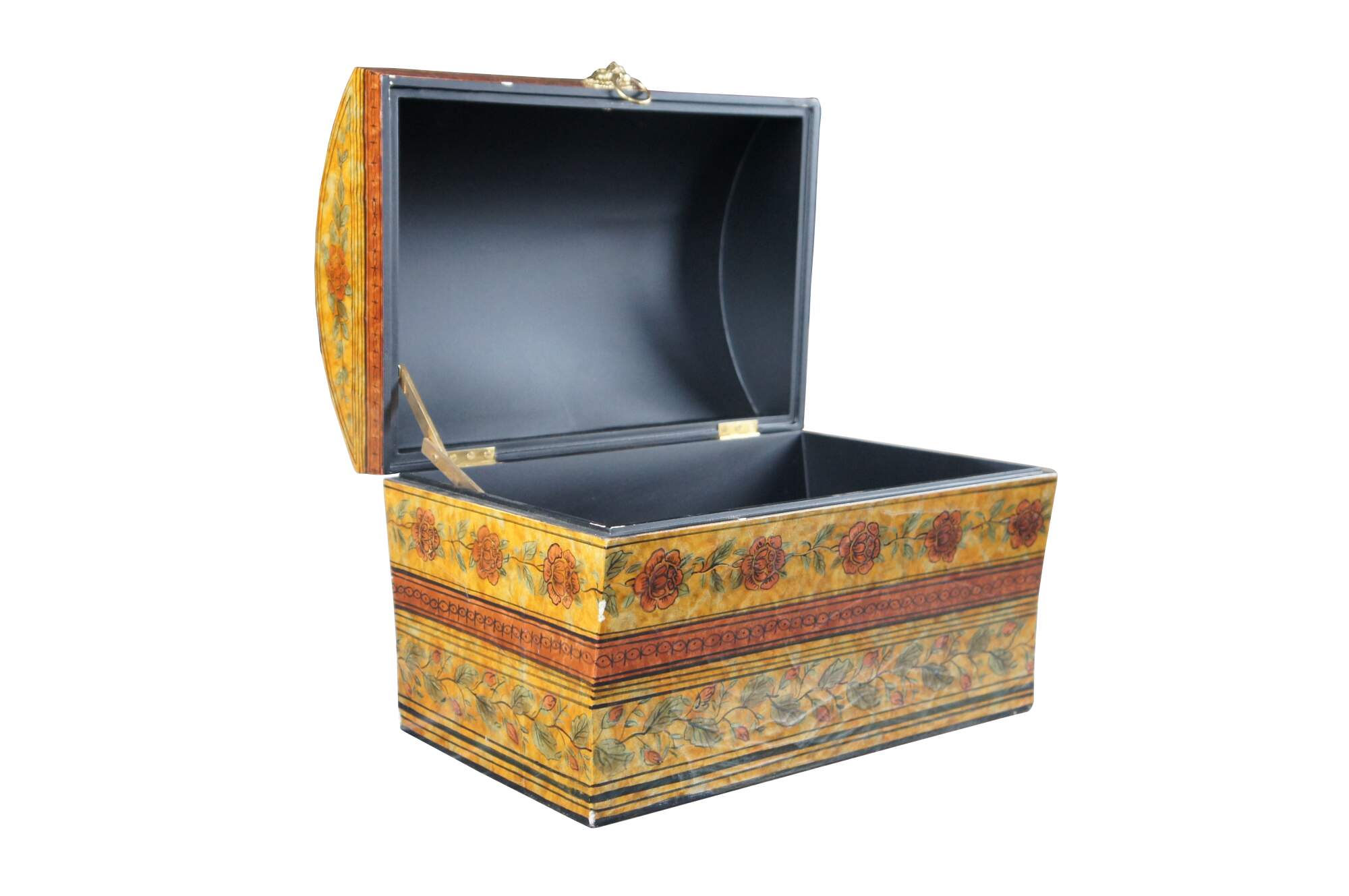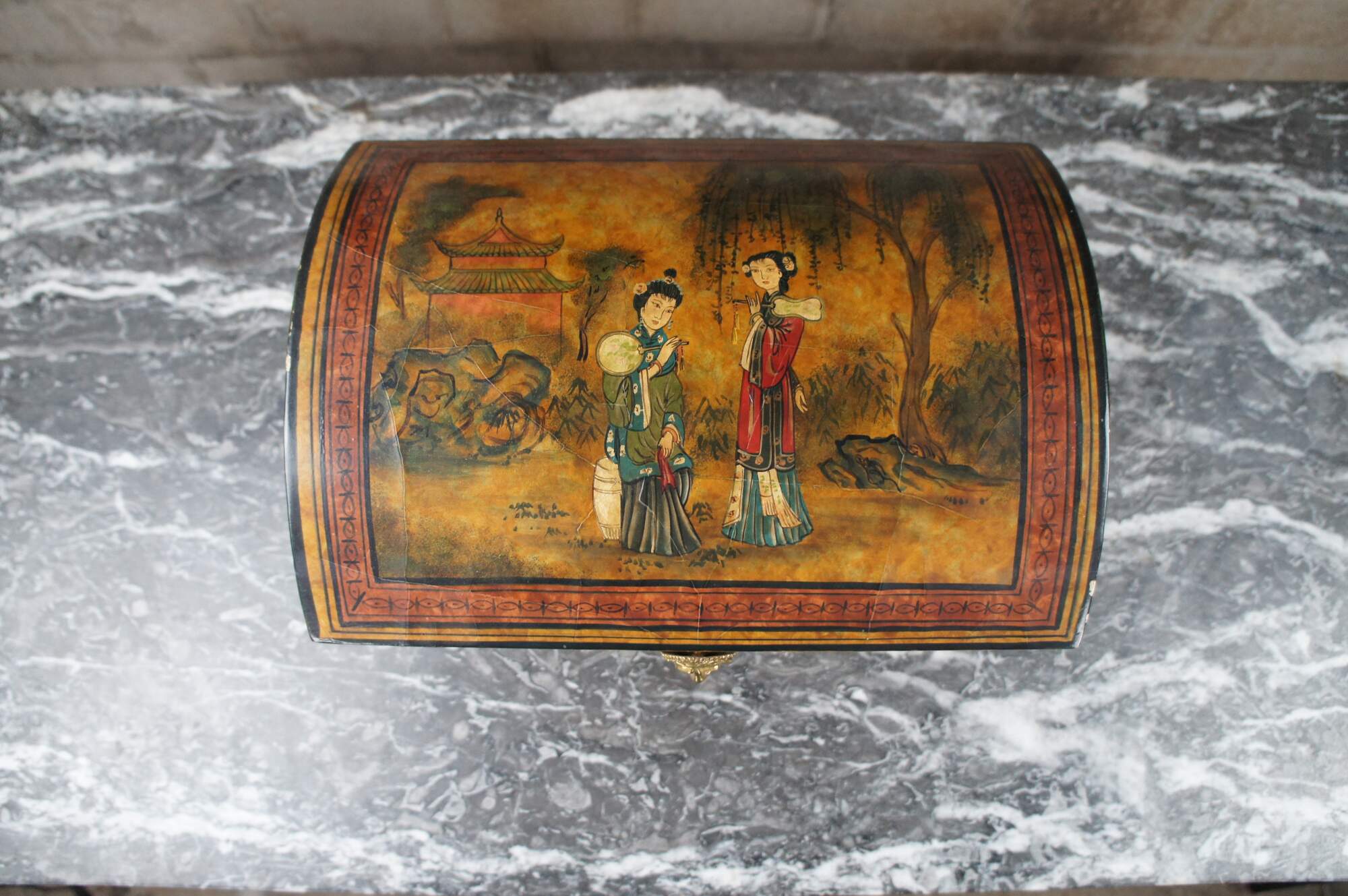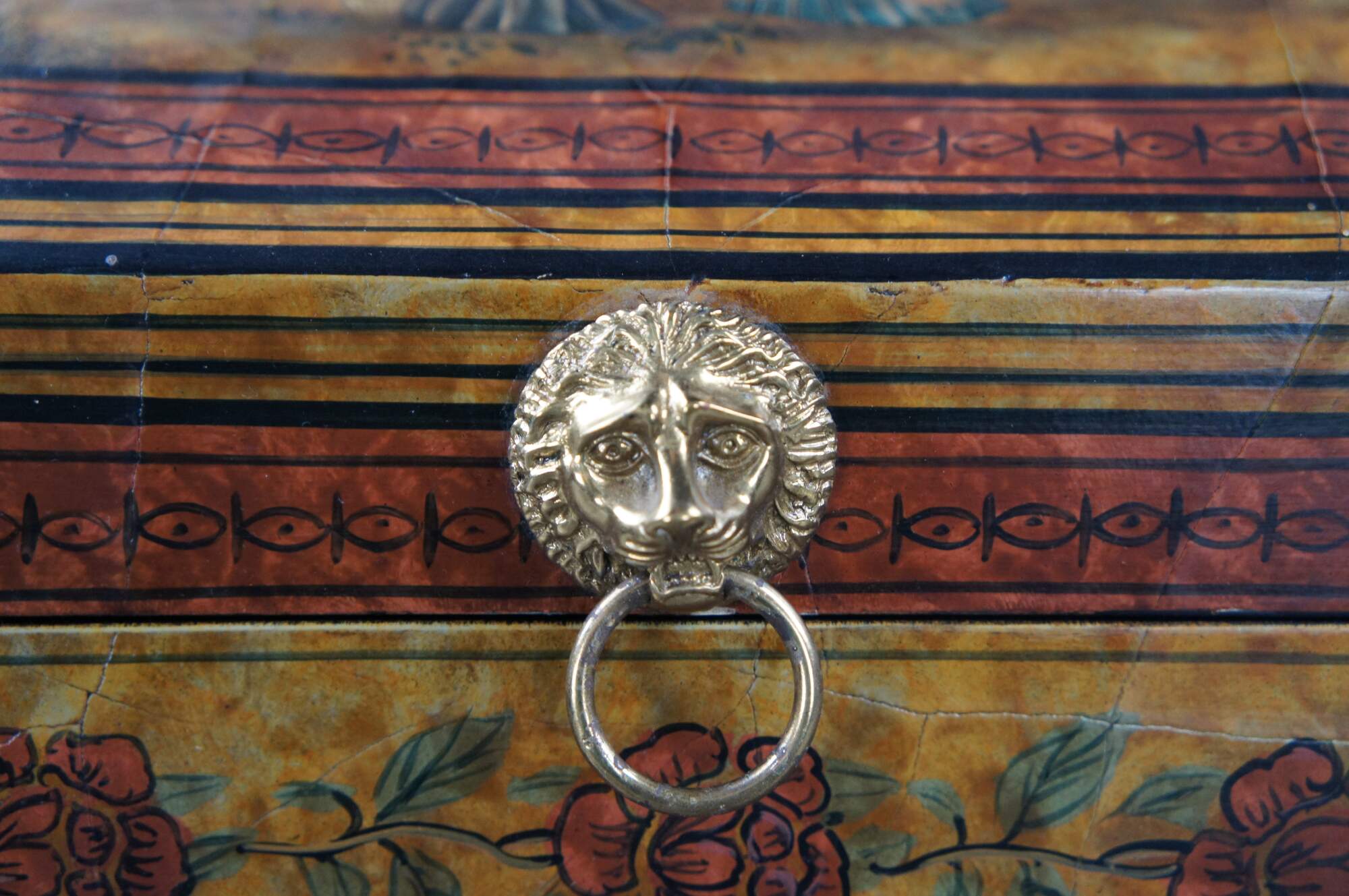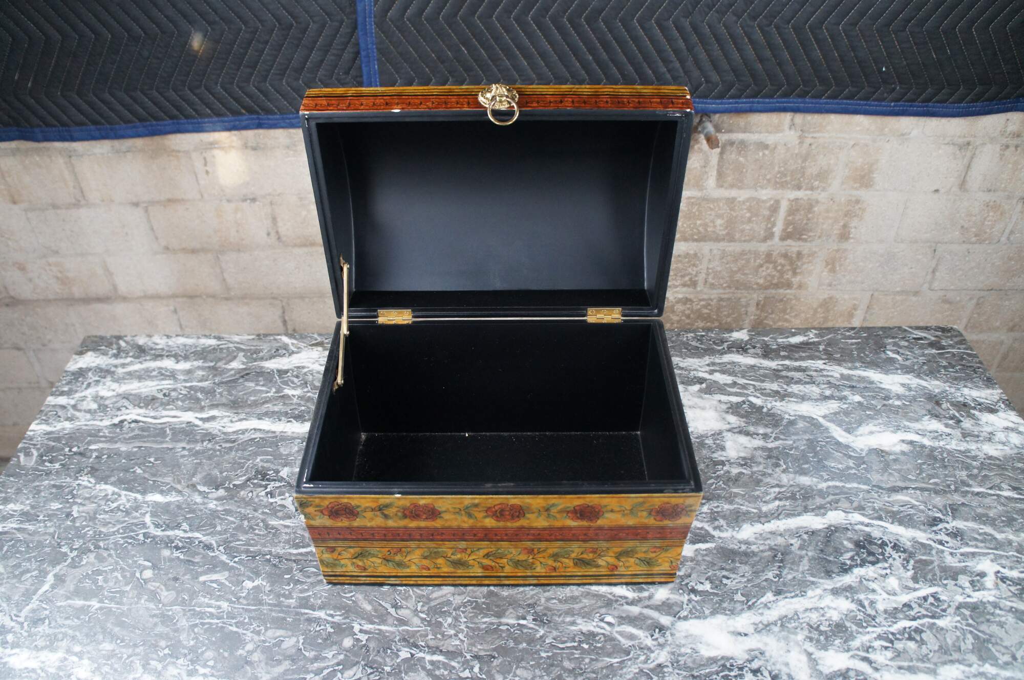 An impressive lacquered keepsake box by Maitland Smith, circa 1990s. Features a chioniserie motif with flowers and asian figures. the box is in the form of a treasure chest with hinged lid and black interior. Includes brass lion head handle along the front.
