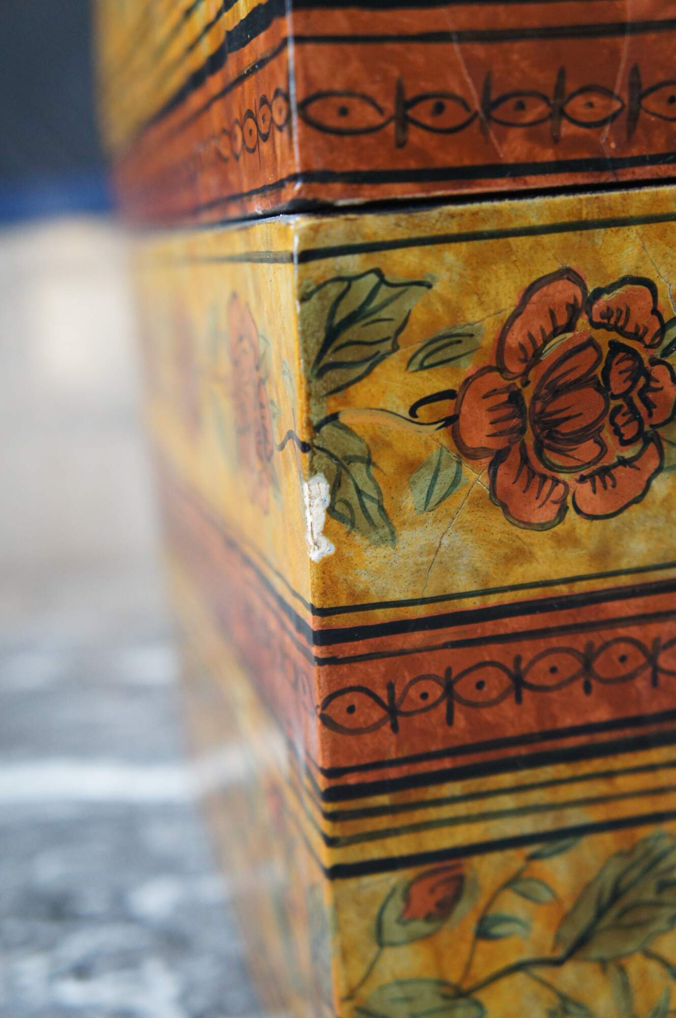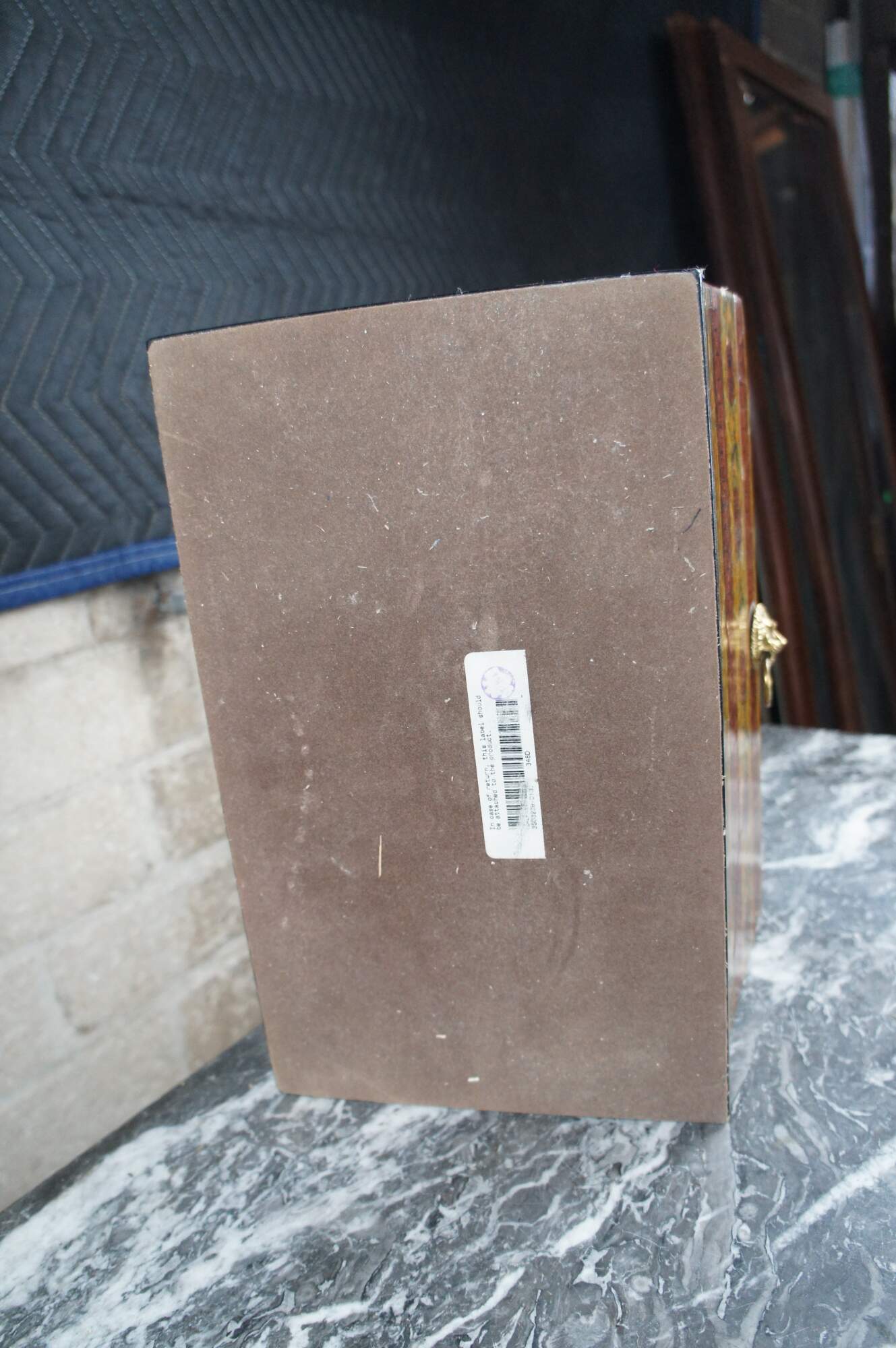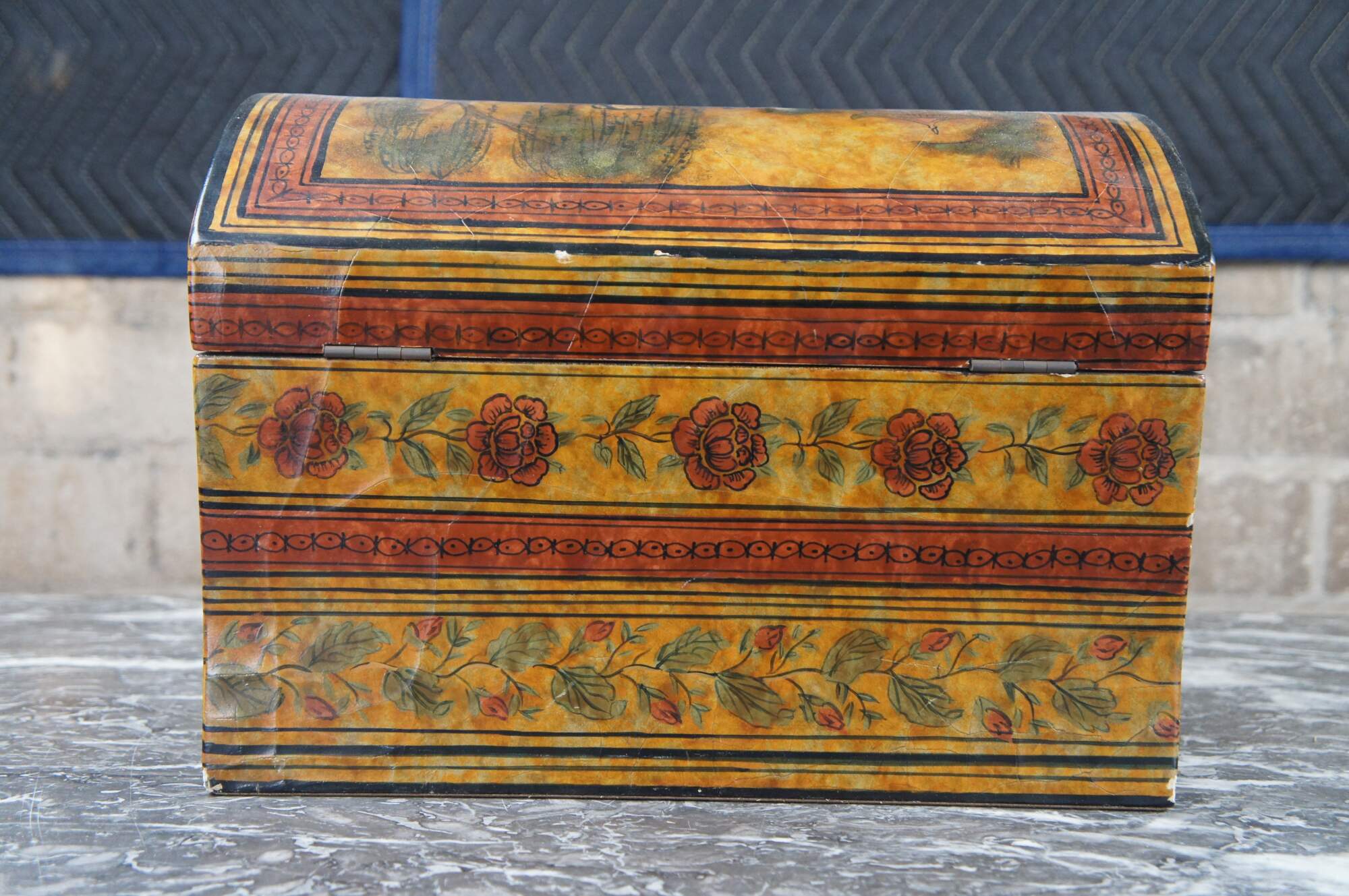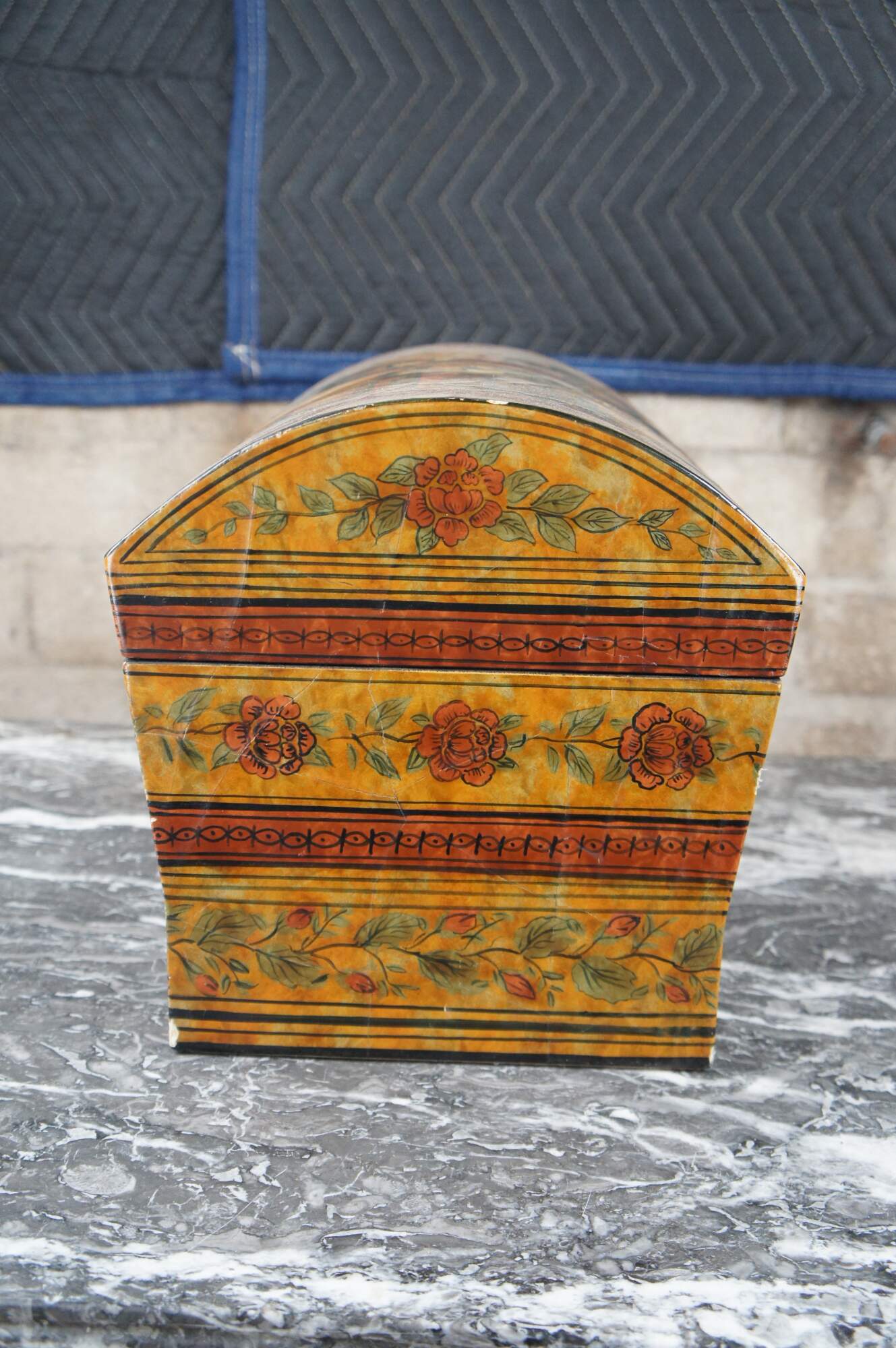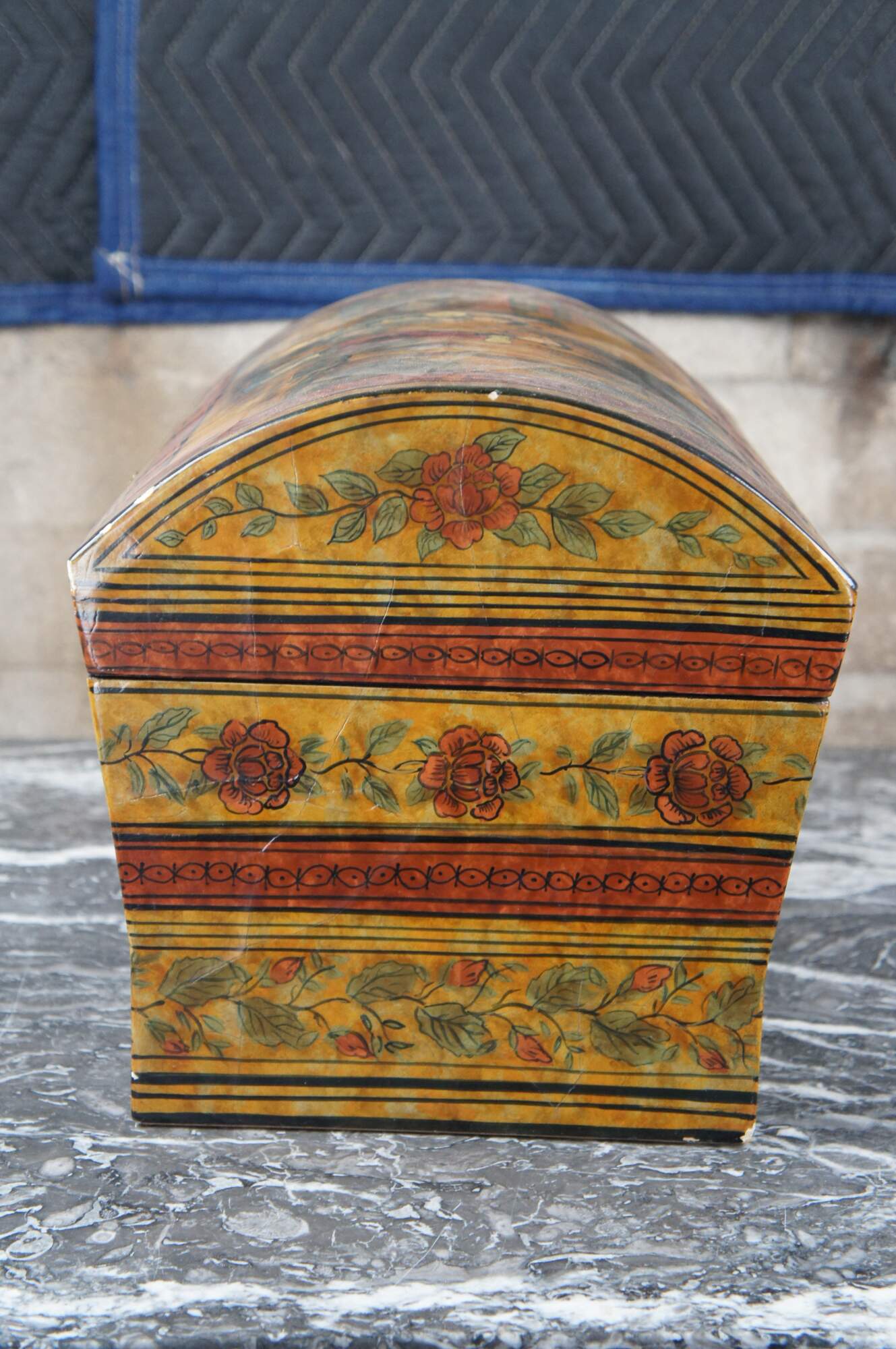 An impressive lacquered keepsake box by Maitland Smith, circa 1990s. Features a chioniserie motif with flowers and asian figures. the box is in the form of a treasure chest with hinged lid and black interior. Includes brass lion head handle along the front.