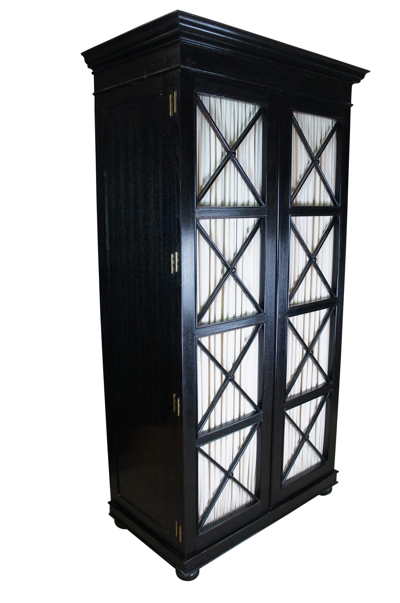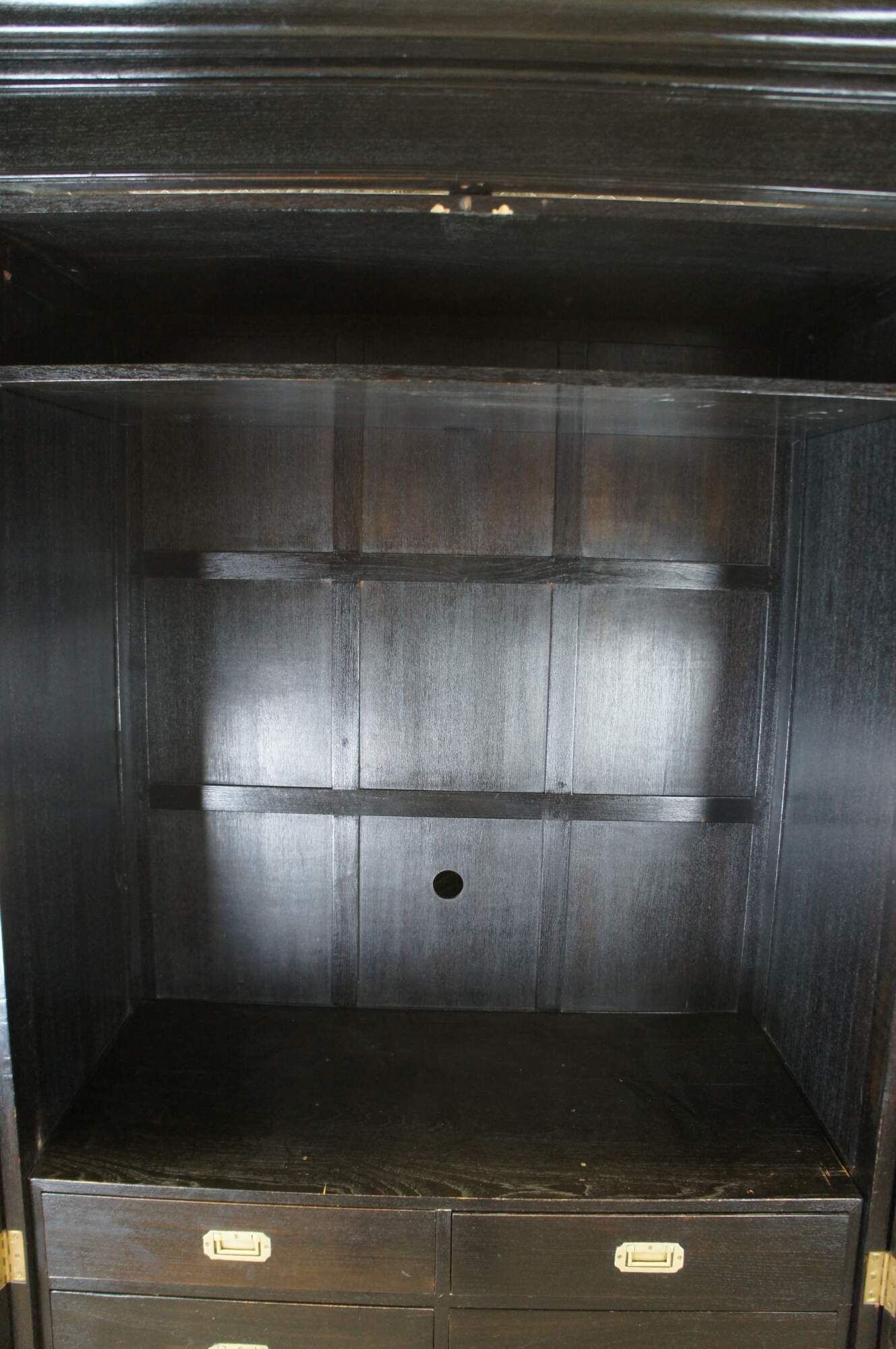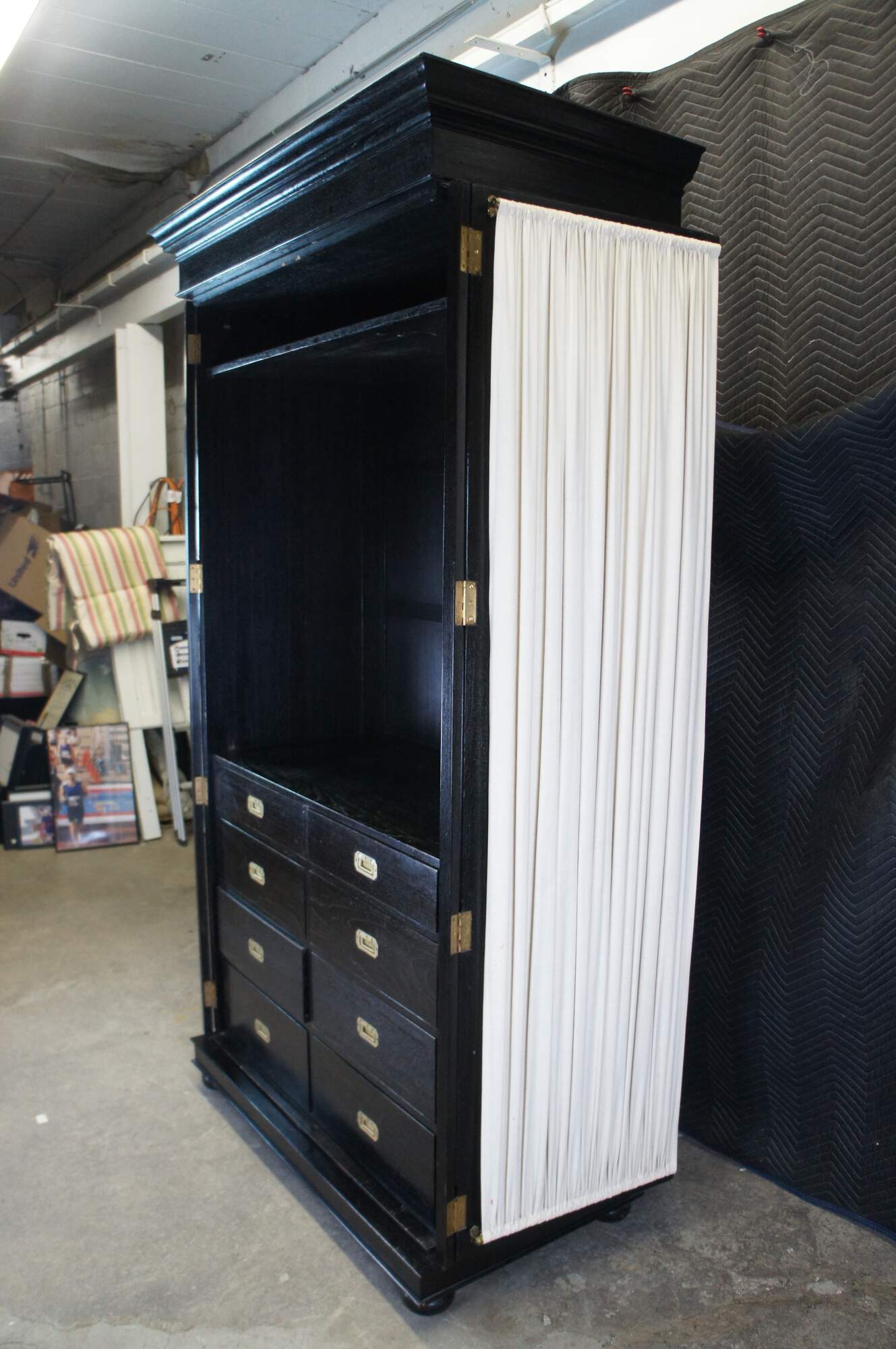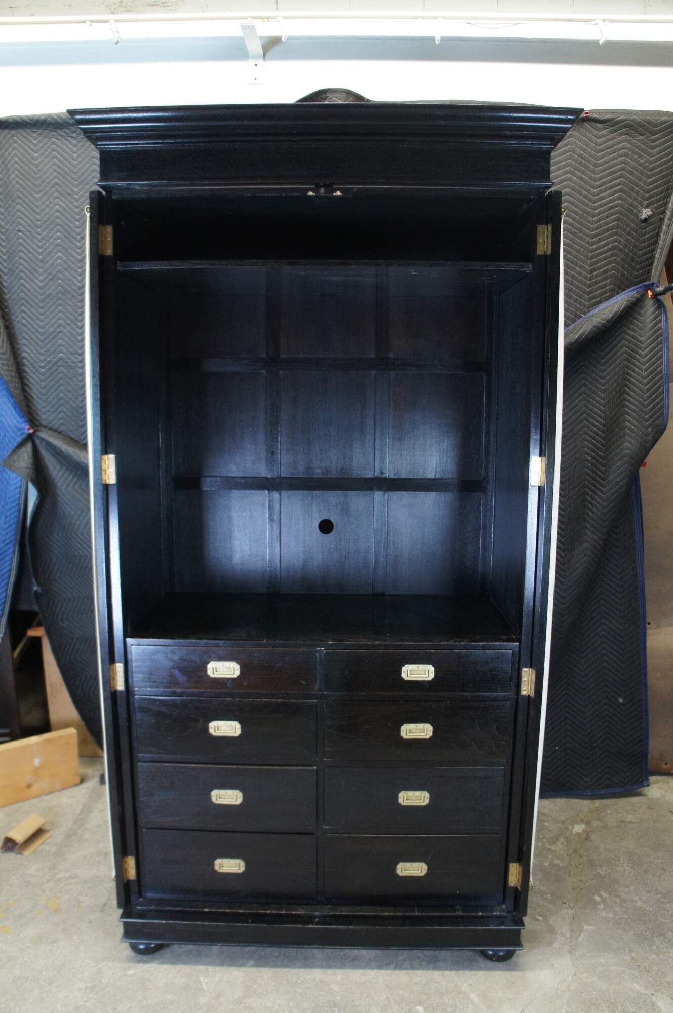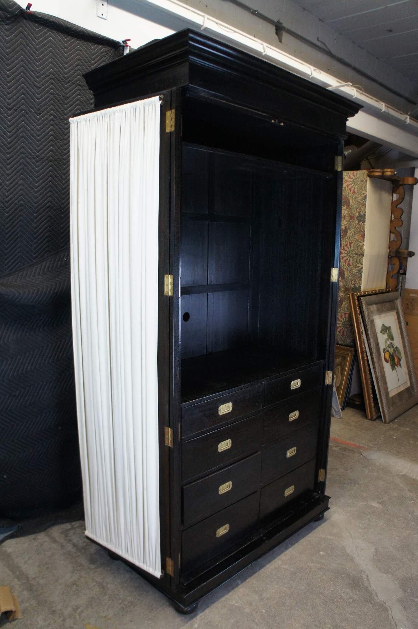 Vintage Robert Lighton British Khaki X armoire / wardrobe / TV console / cabinet. Made of teak featuring dark ebonized finish with double jointed doors that open to campaign style eight drawer dresser or chest with brass hardware.