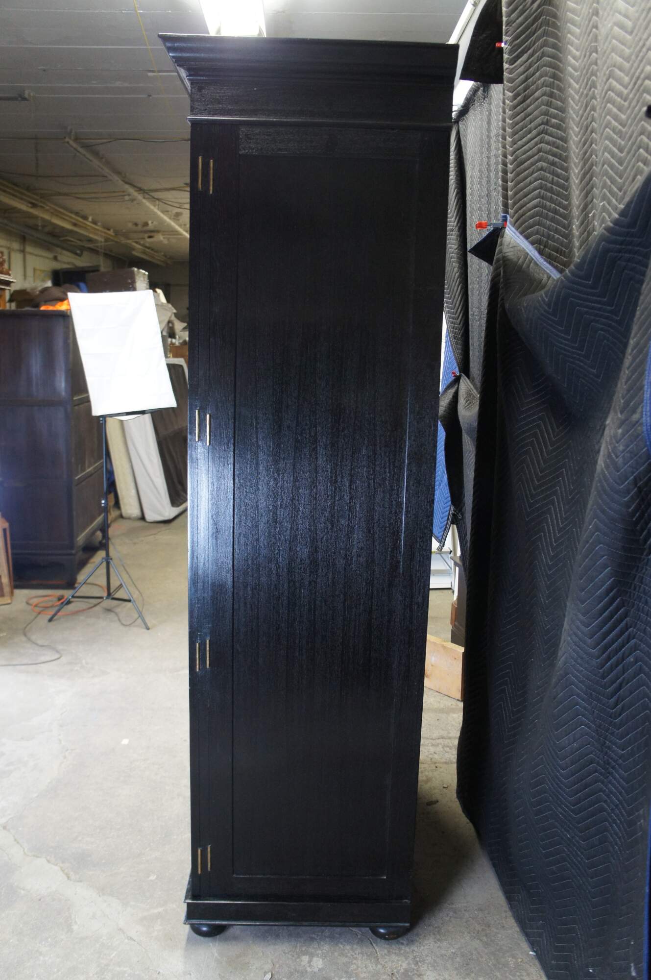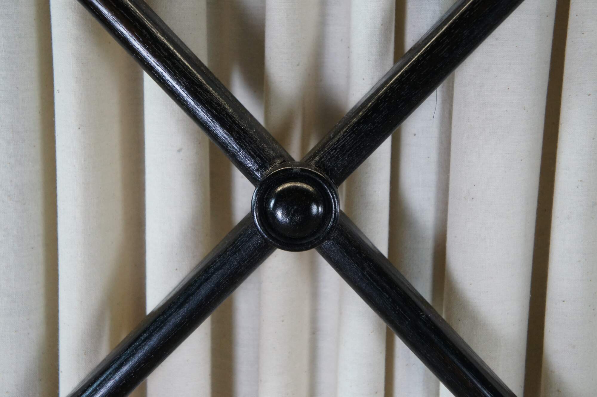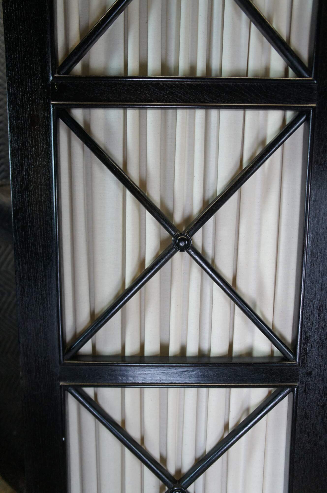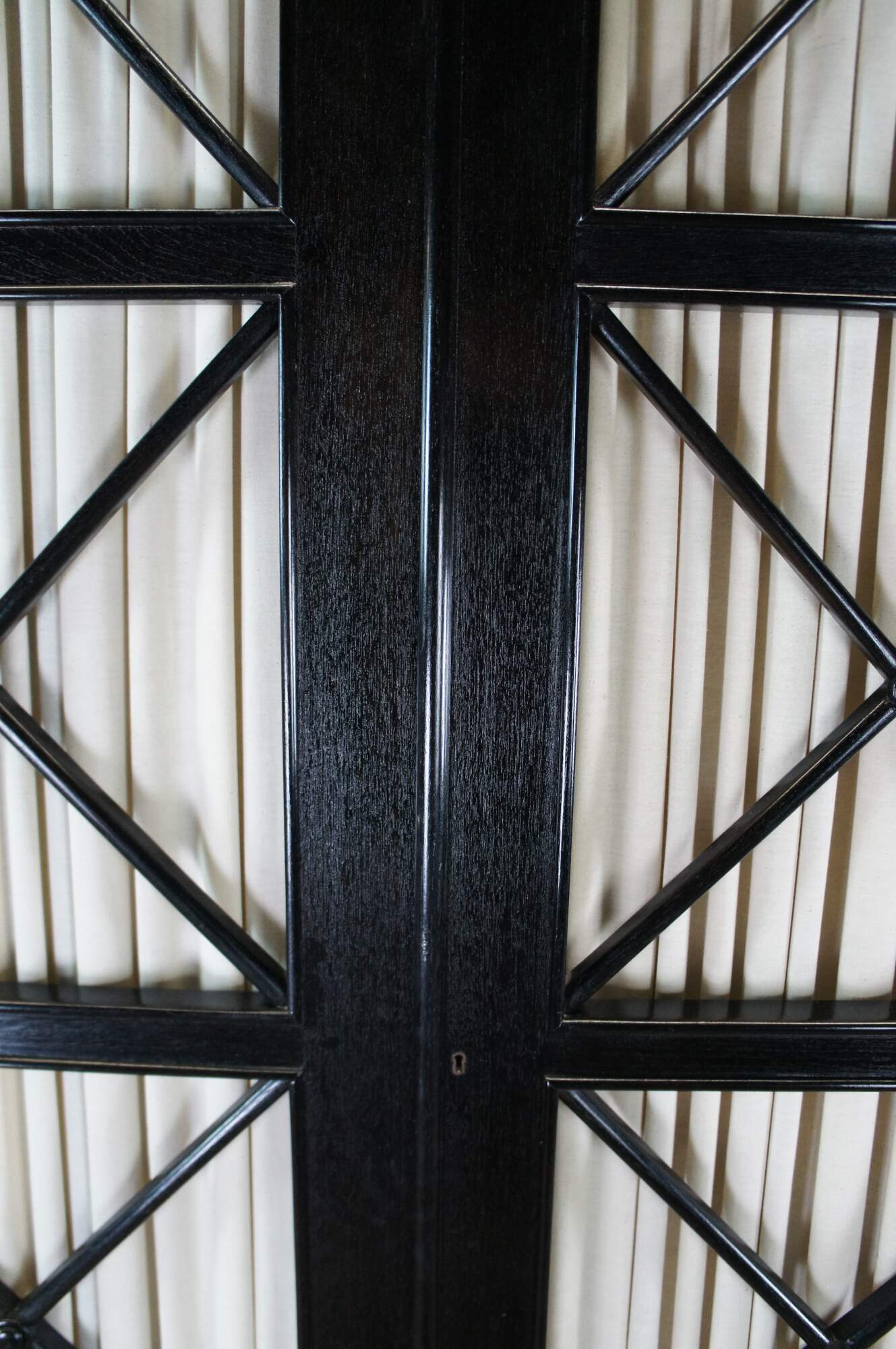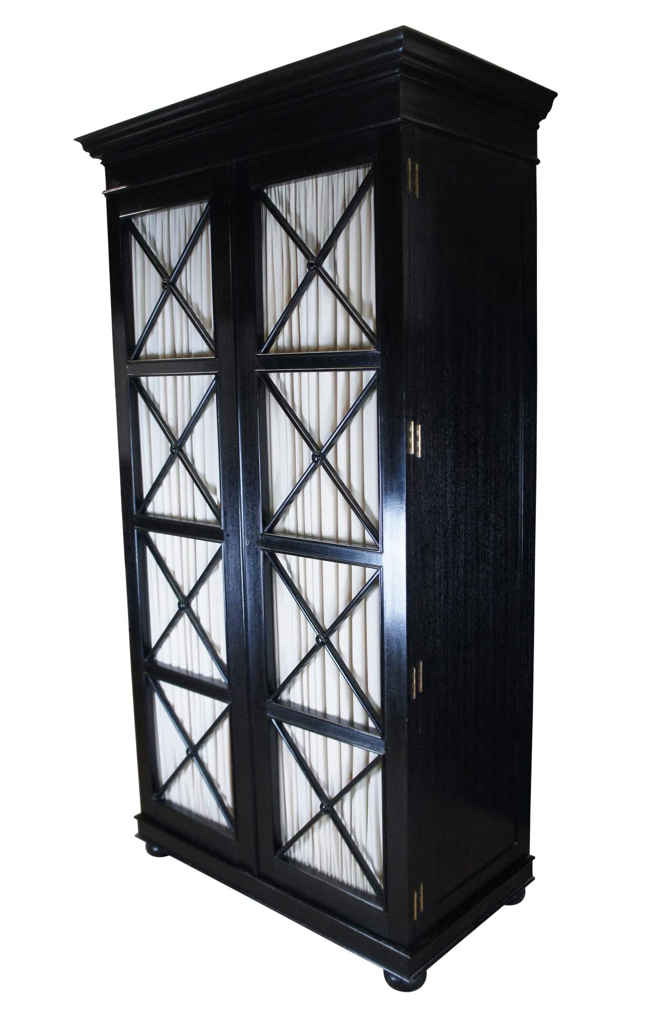 Vintage Robert Lighton British Khaki X armoire / wardrobe / TV console / cabinet. Made of teak featuring dark ebonized finish with double jointed doors that open to campaign style eight drawer dresser or chest with brass hardware.