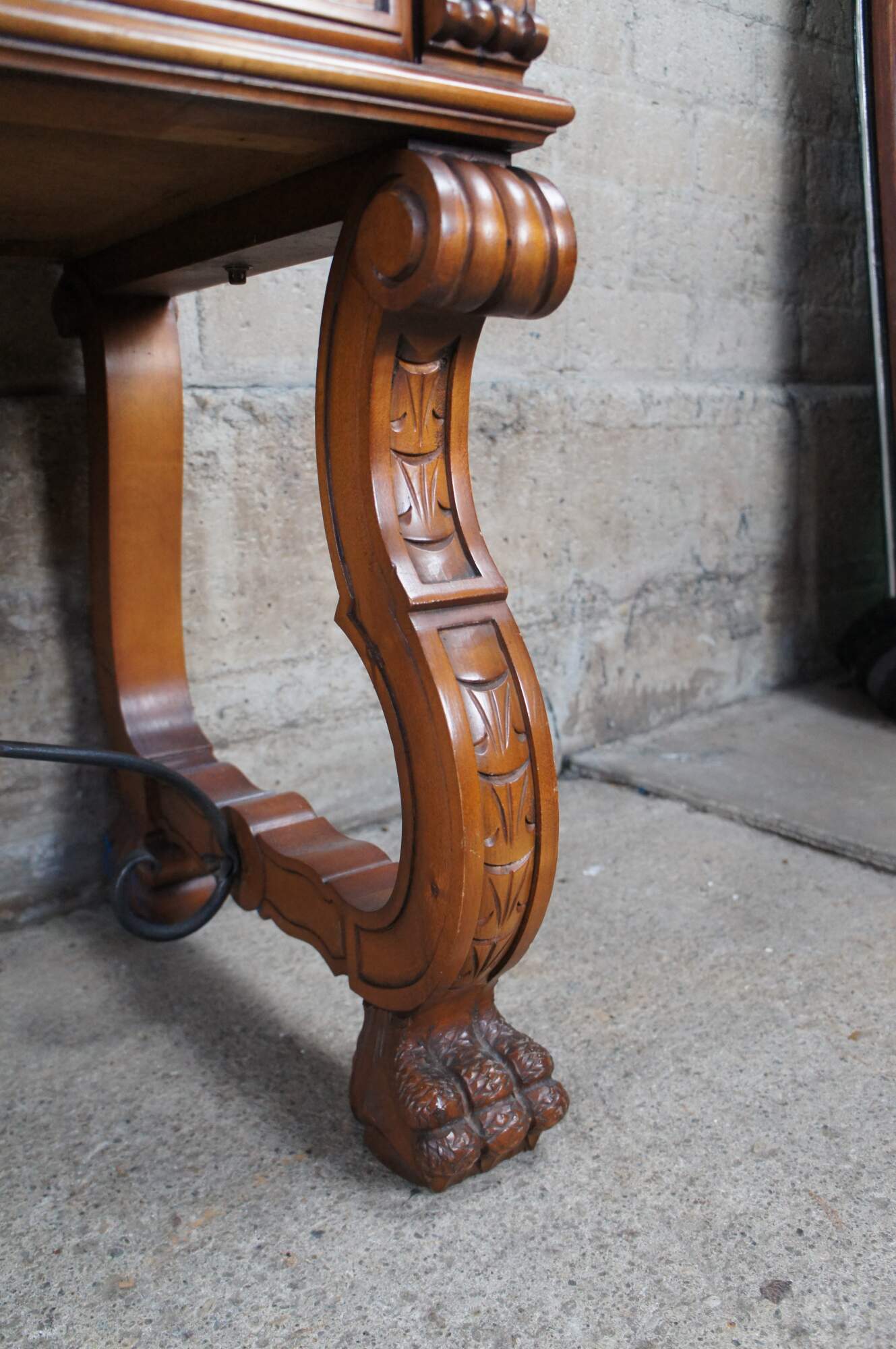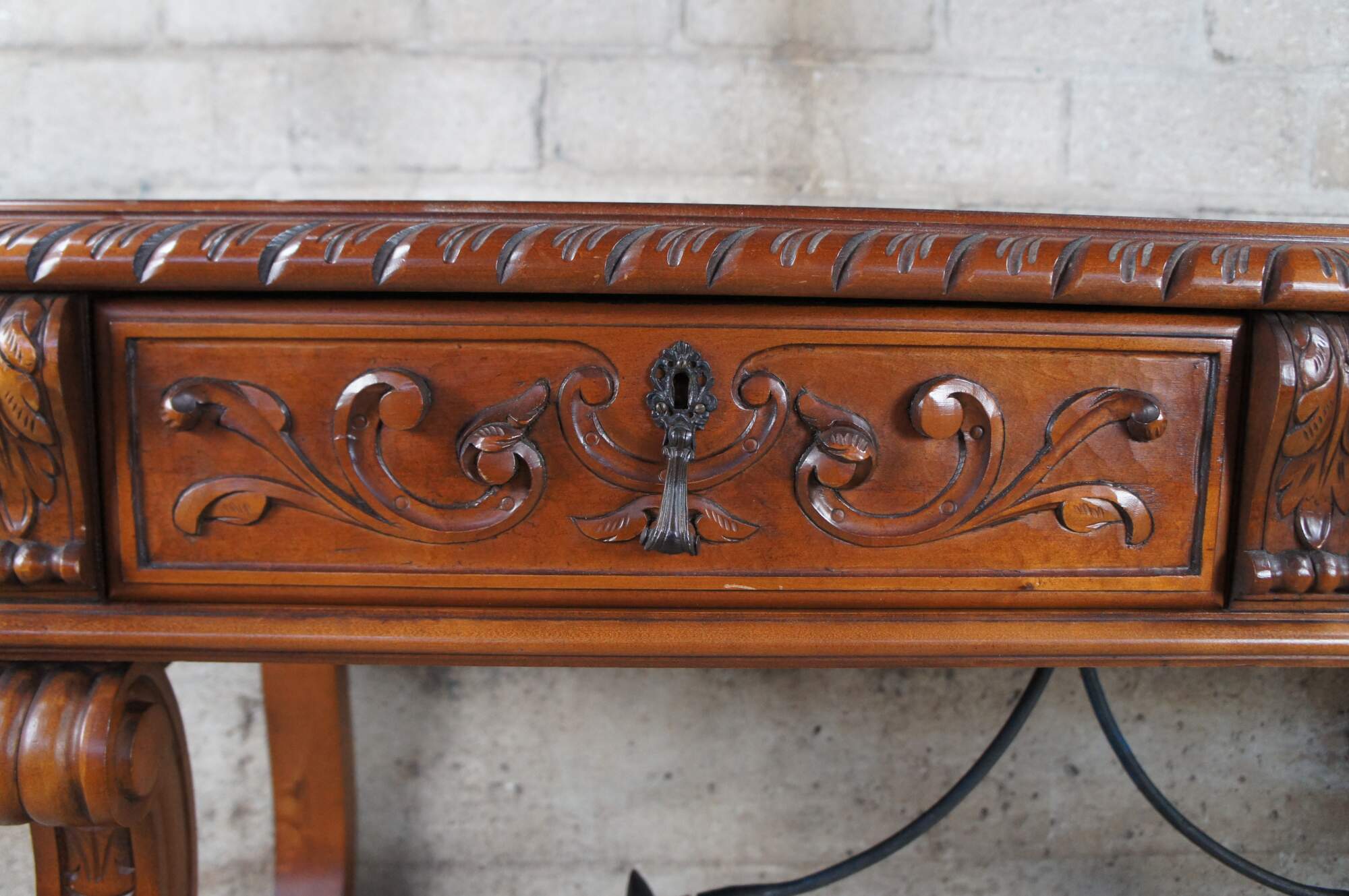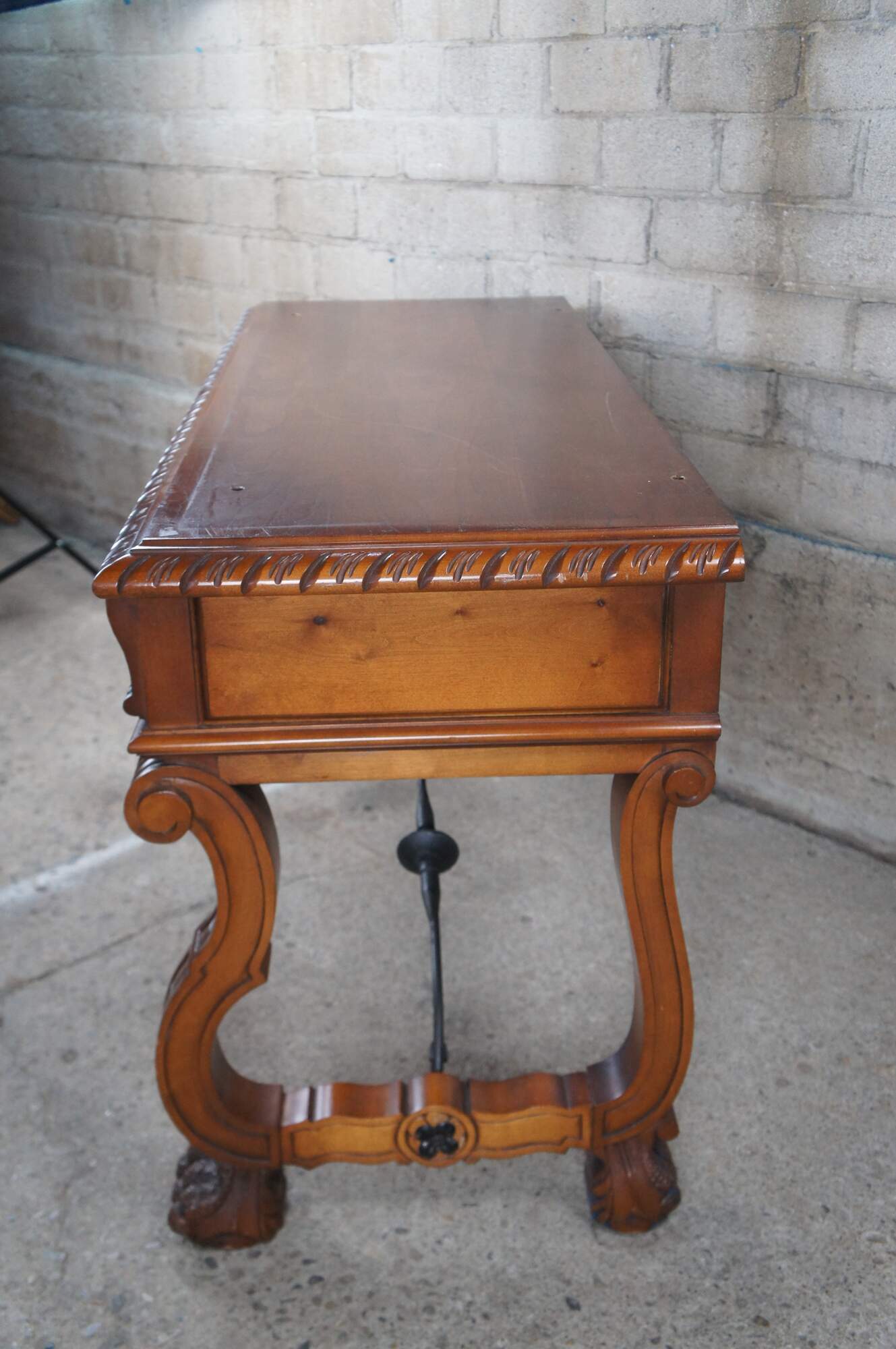 Vintage Jesus Ballester Marco of Valencia, Spain sideboard, library console or writing desk. Made of mahogany featuring rectangular form with scrolled iron and acanthus accents over harp shaped legs and hairy lion paw / claw feet.