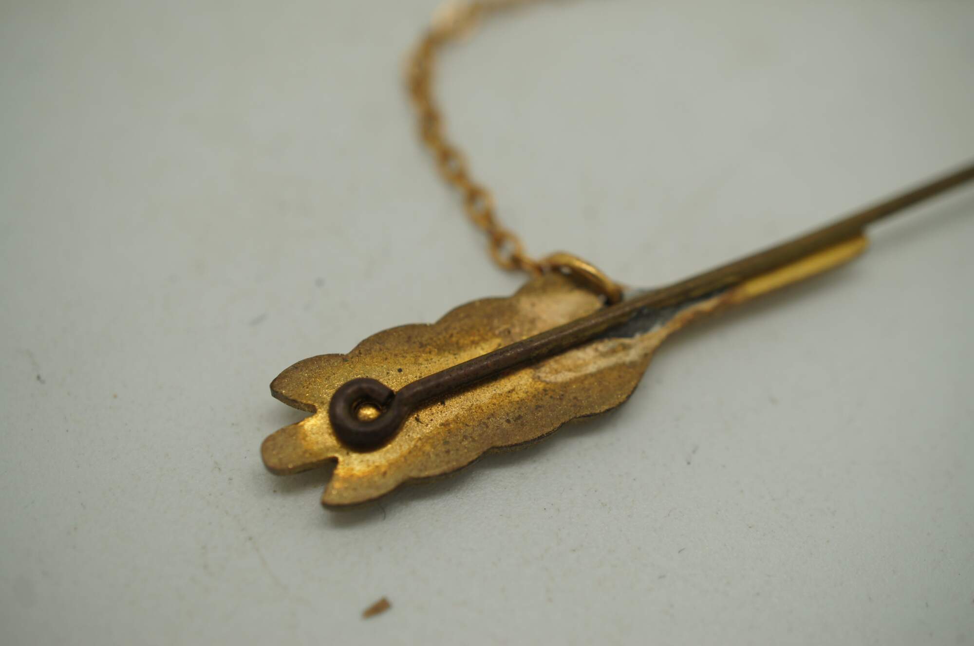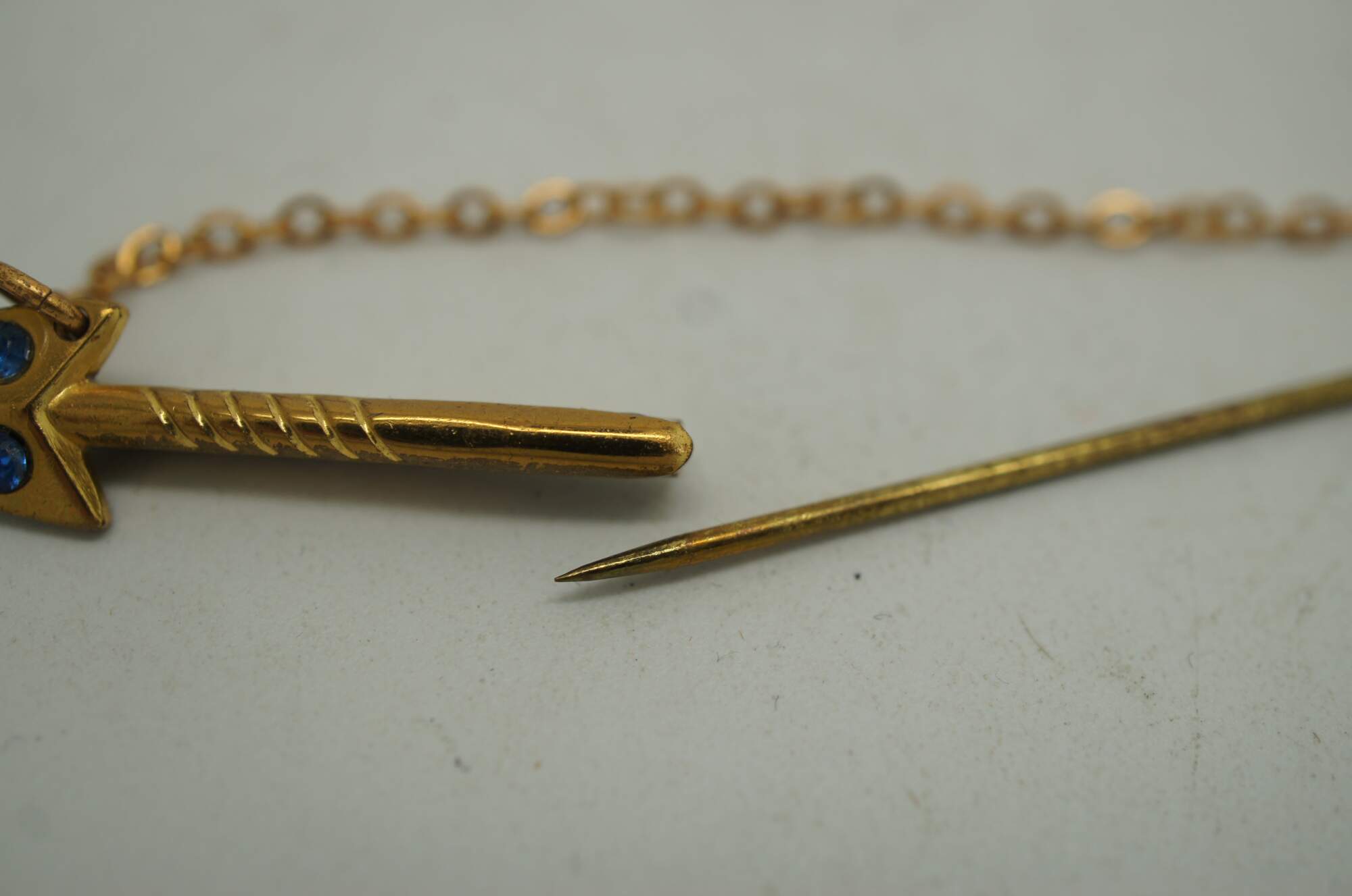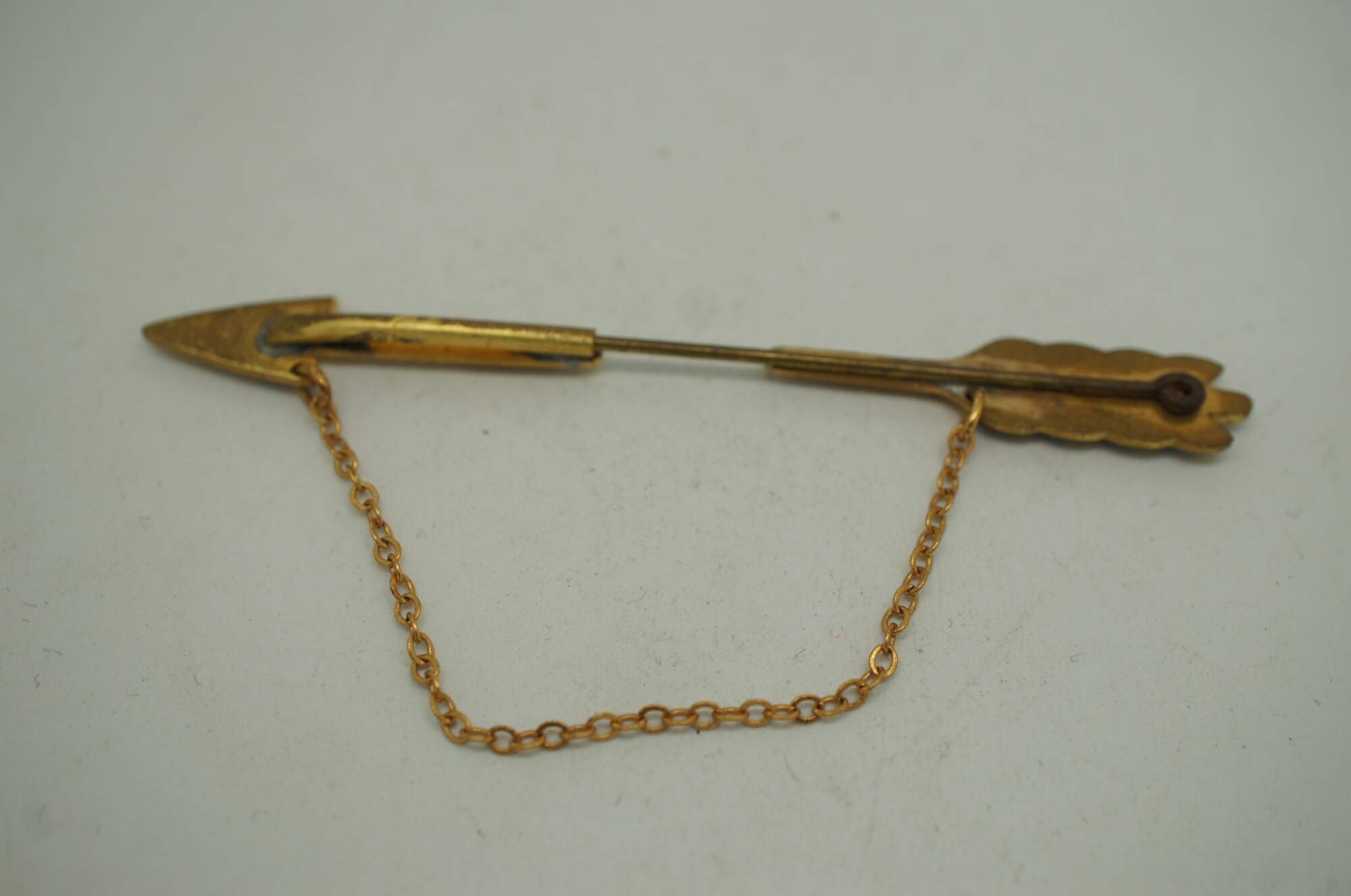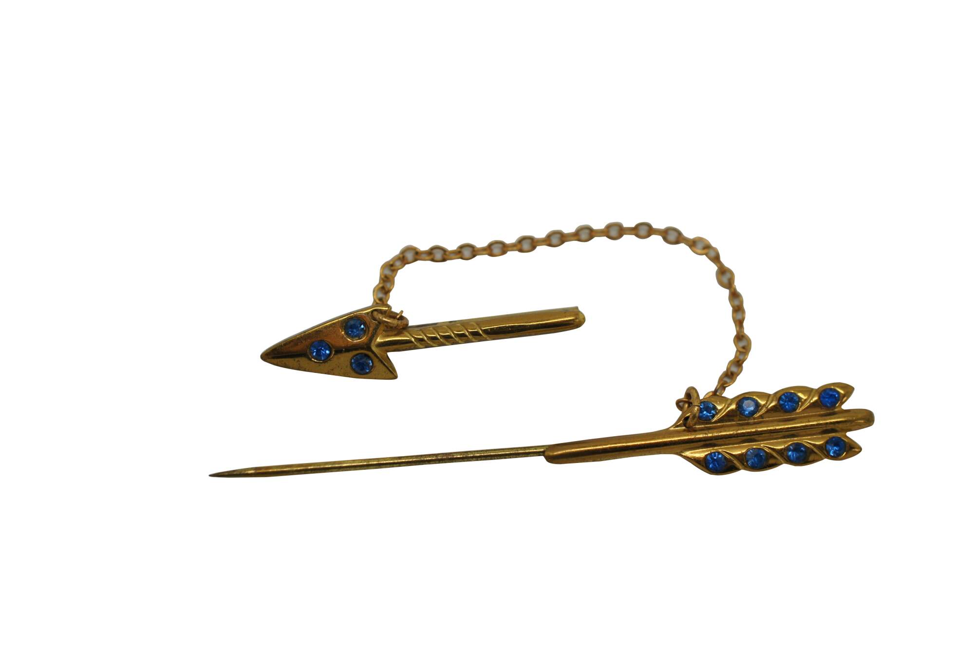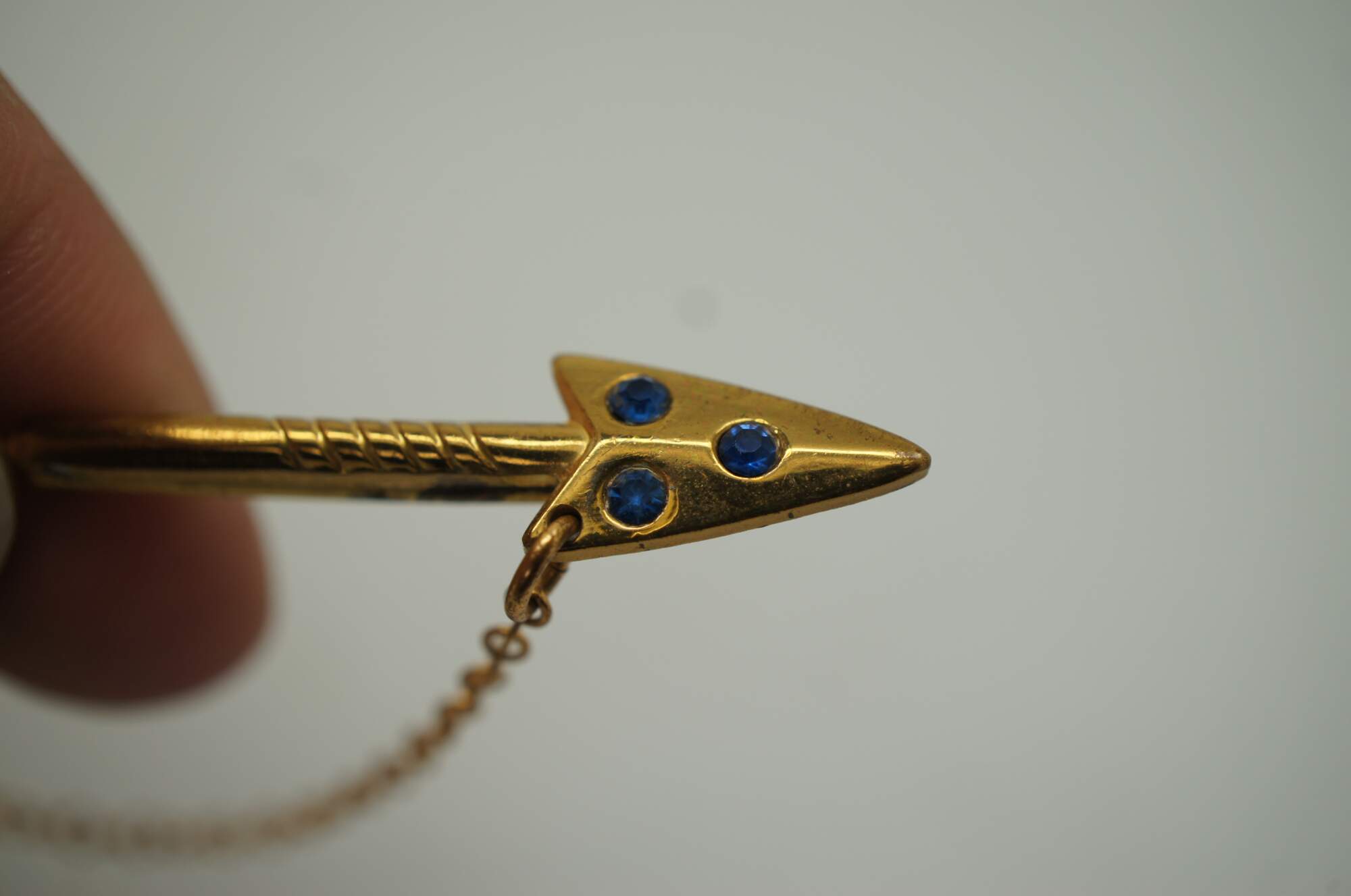 Circa mid 20th century gilt metal stick pin / jabot brooch in the shape of an arrow, accented with bright blue rhinestones.