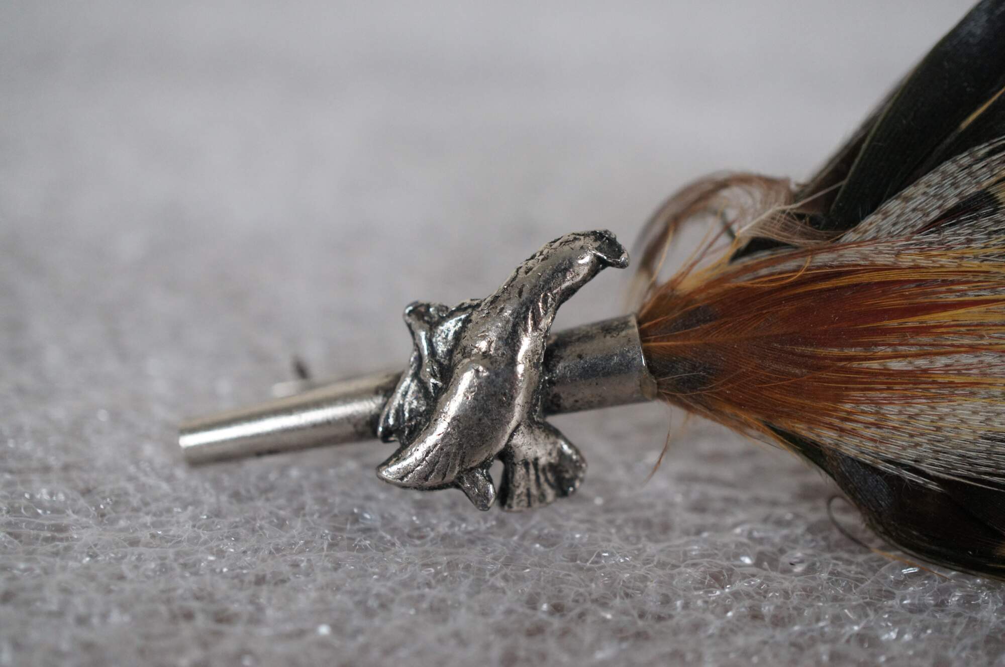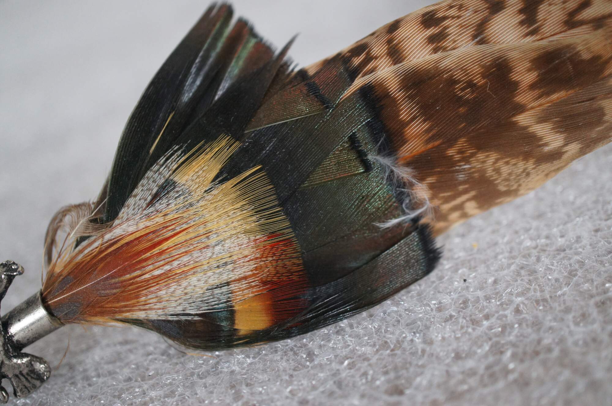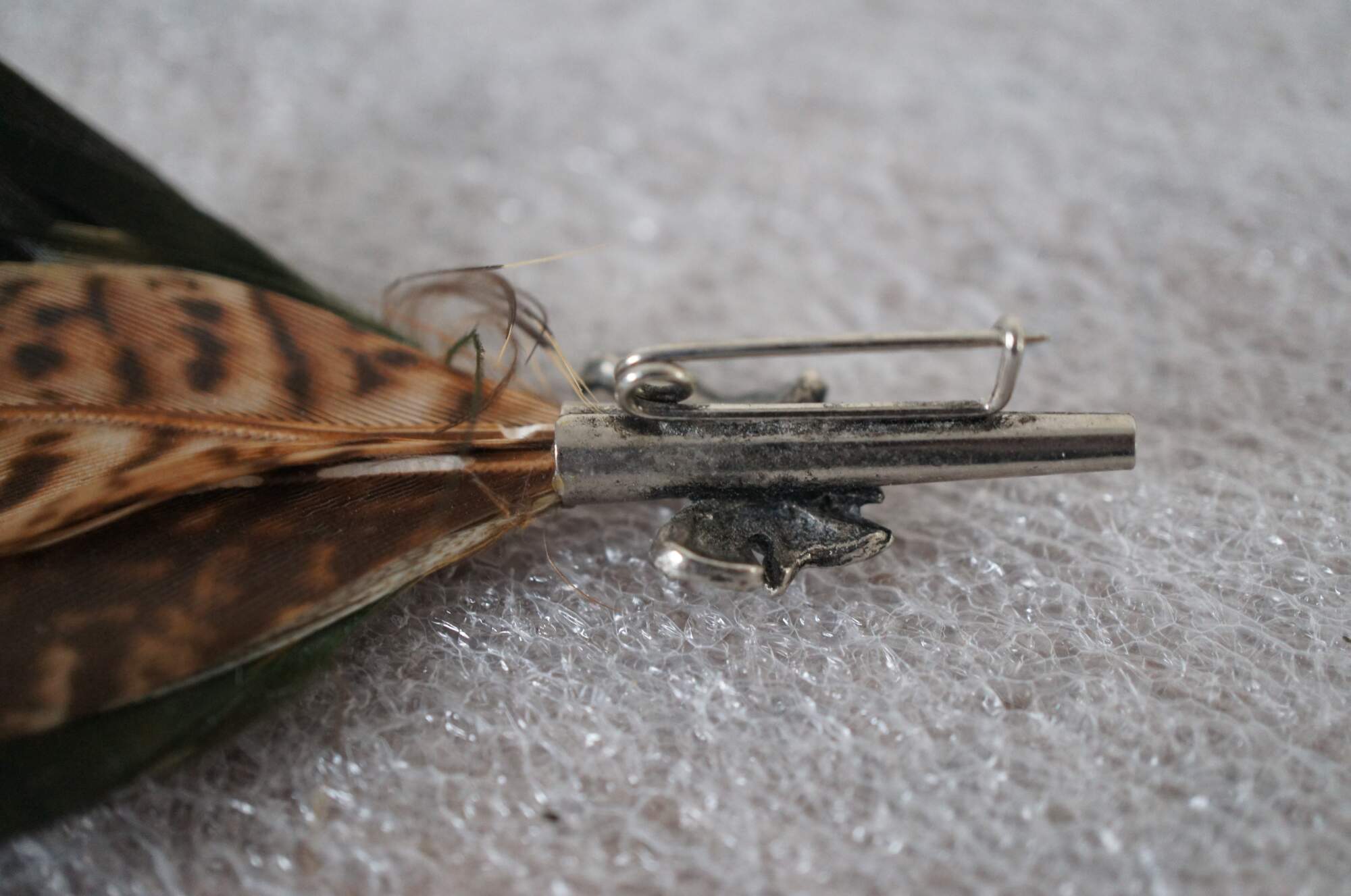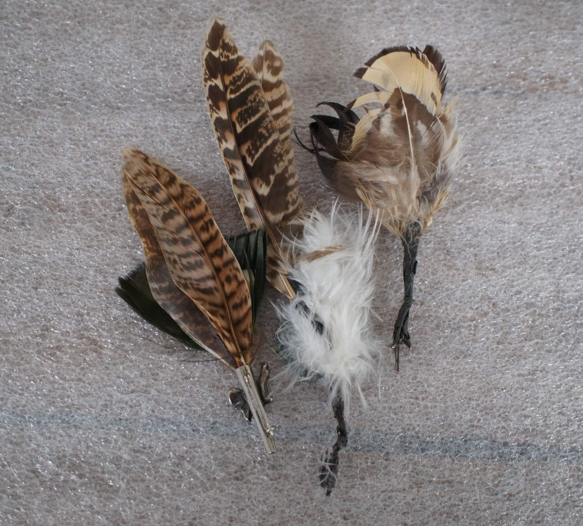 Set of three vintage Tyrolean / German / Bavarian hat feathers. One with pin base accented with a pheasant. One with felt medallion, mountain goat, and flowers. One with plastic accessory.
