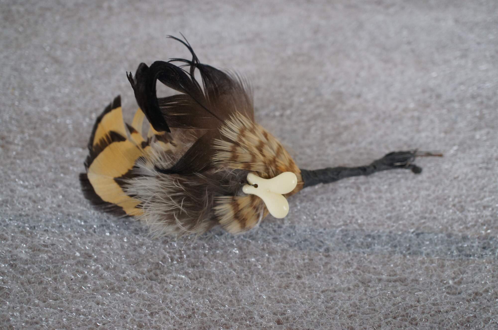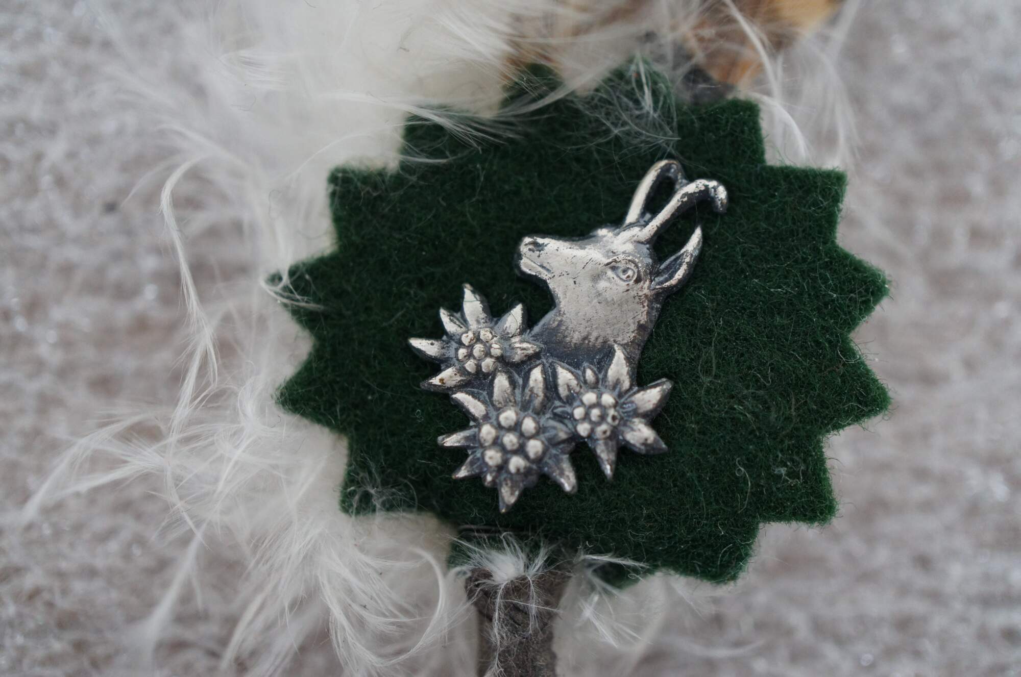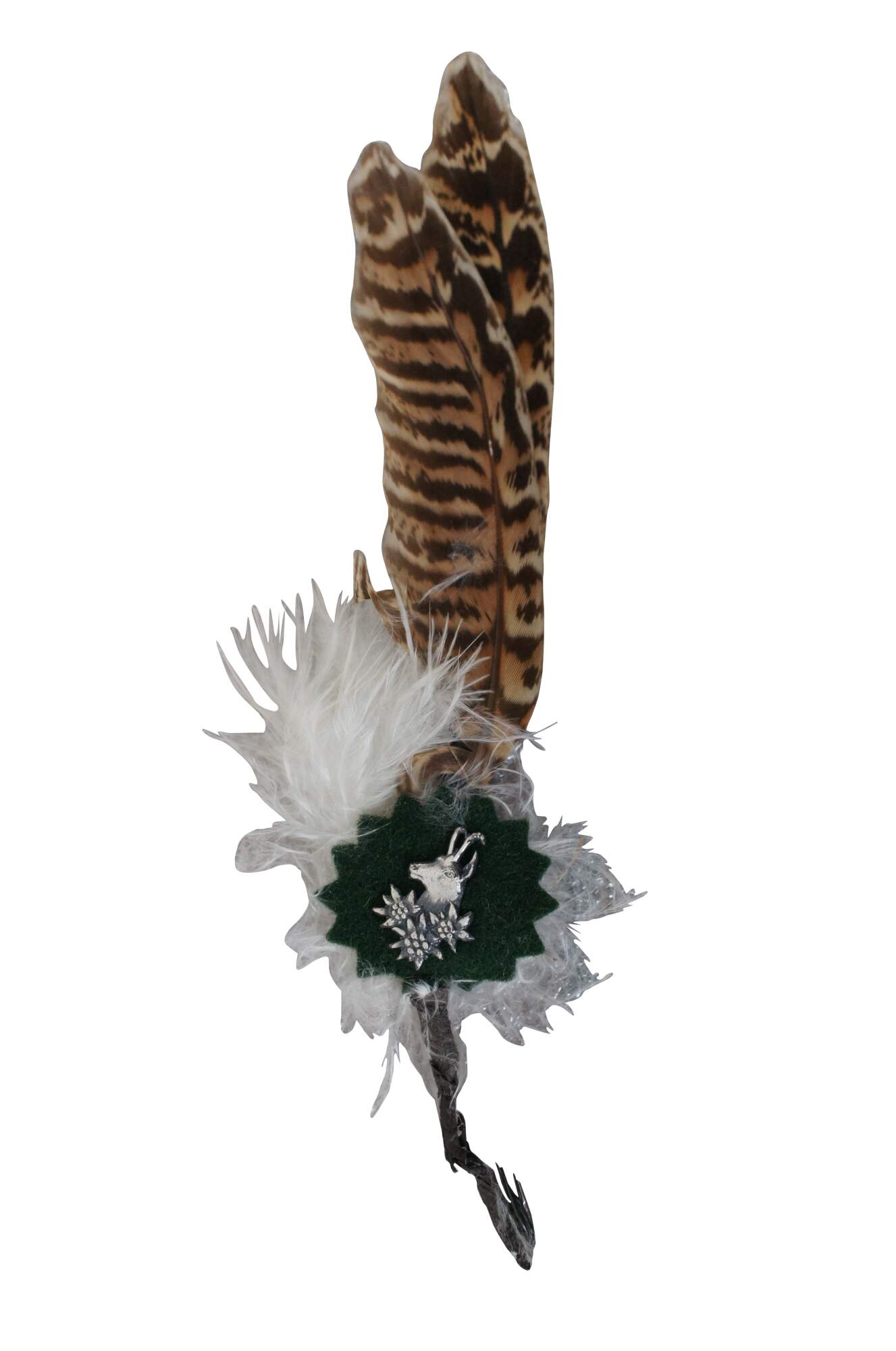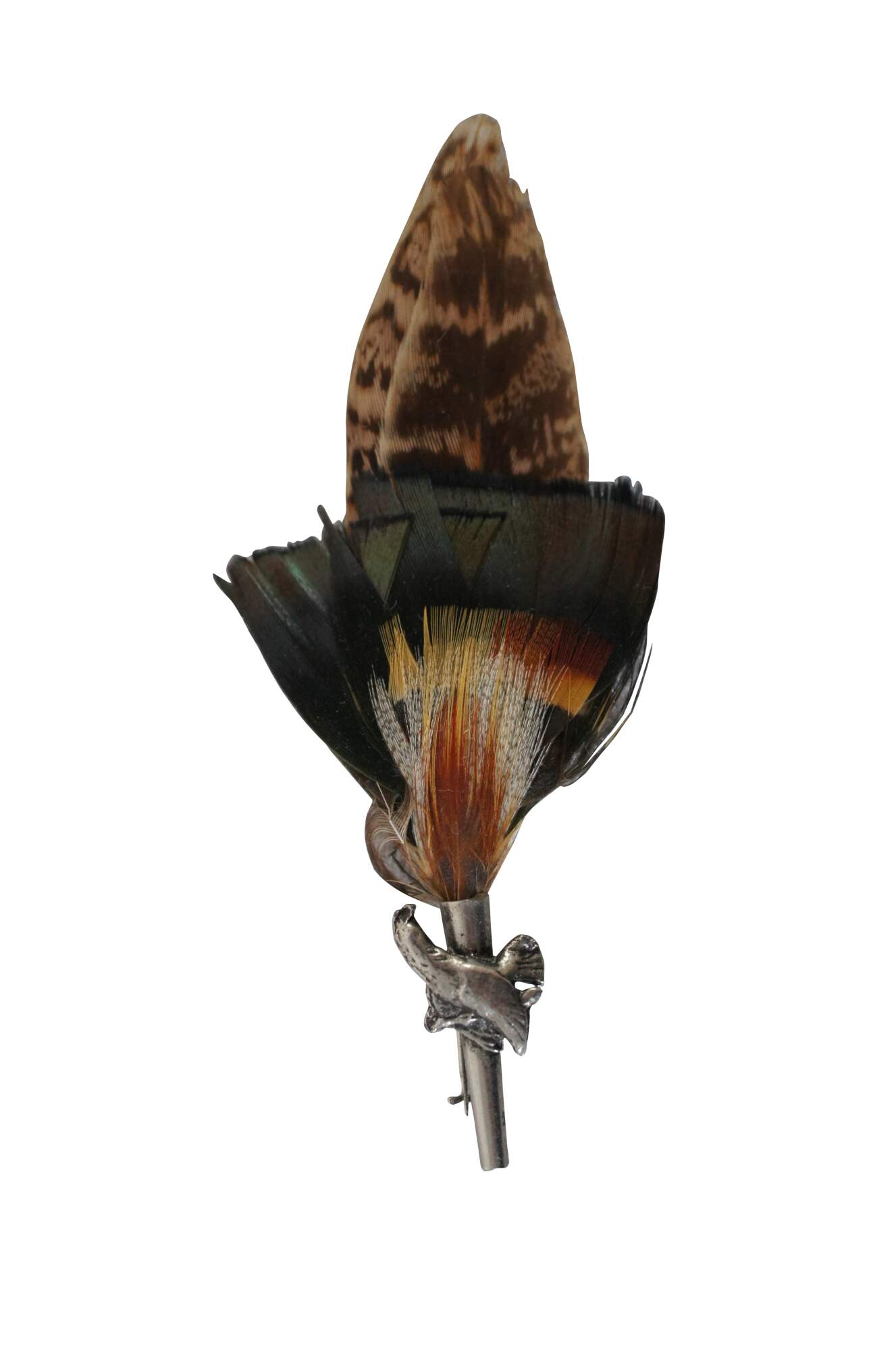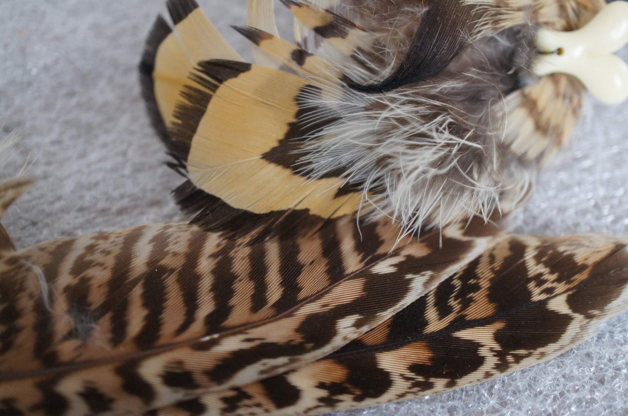 Set of three vintage Tyrolean / German / Bavarian hat feathers. One with pin base accented with a pheasant. One with felt medallion, mountain goat, and flowers. One with plastic accessory.