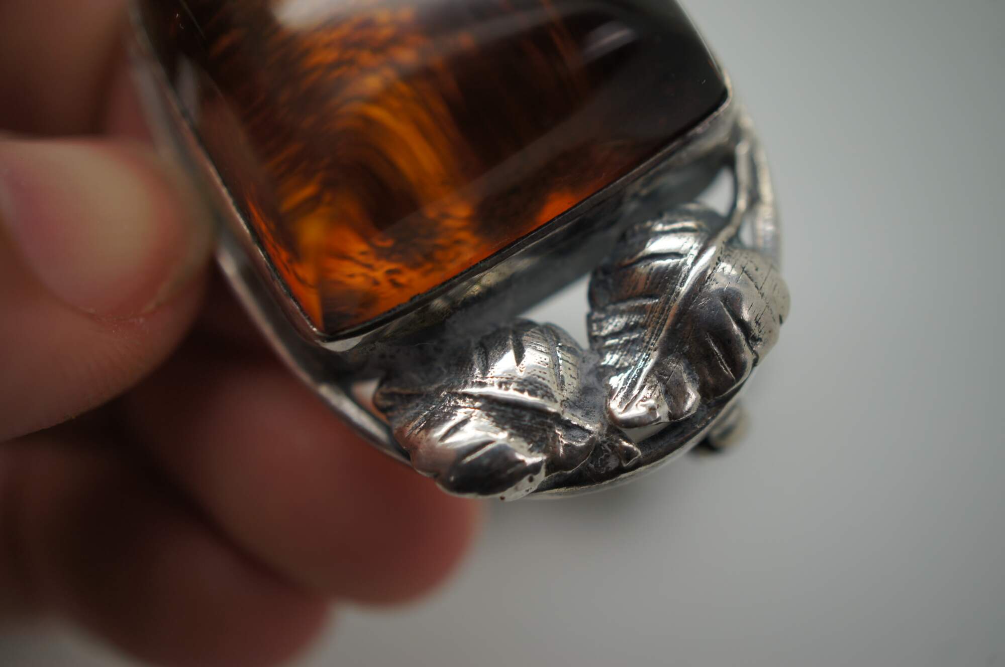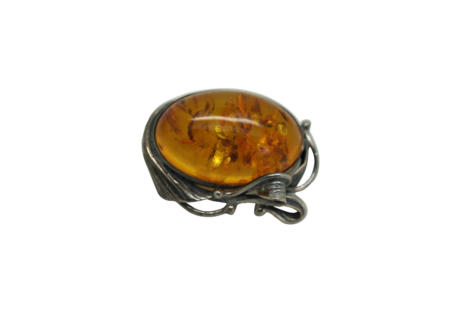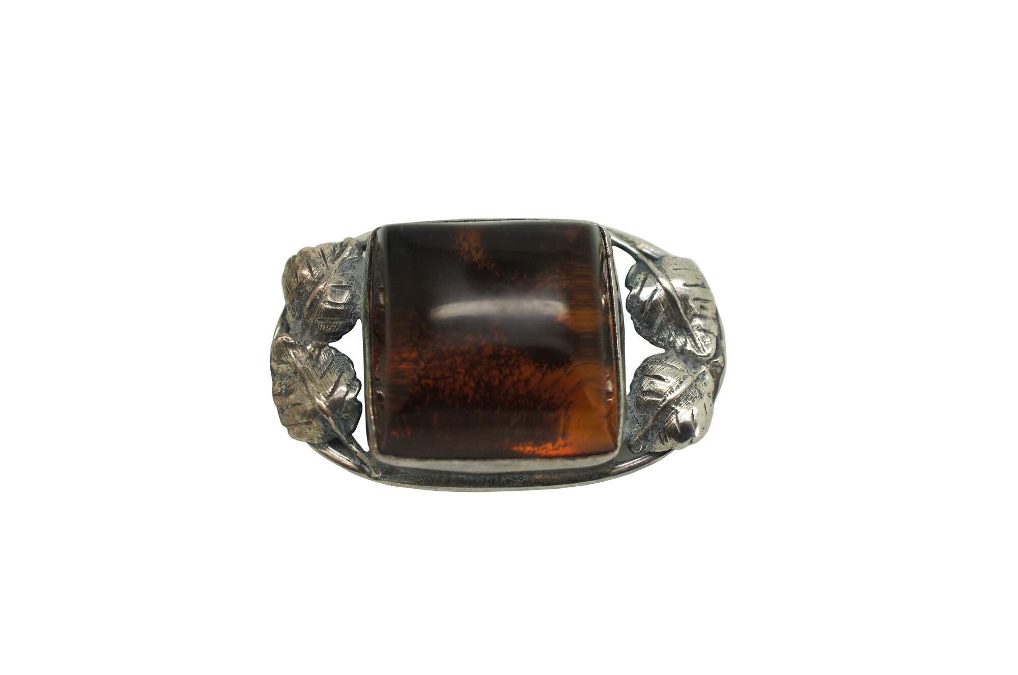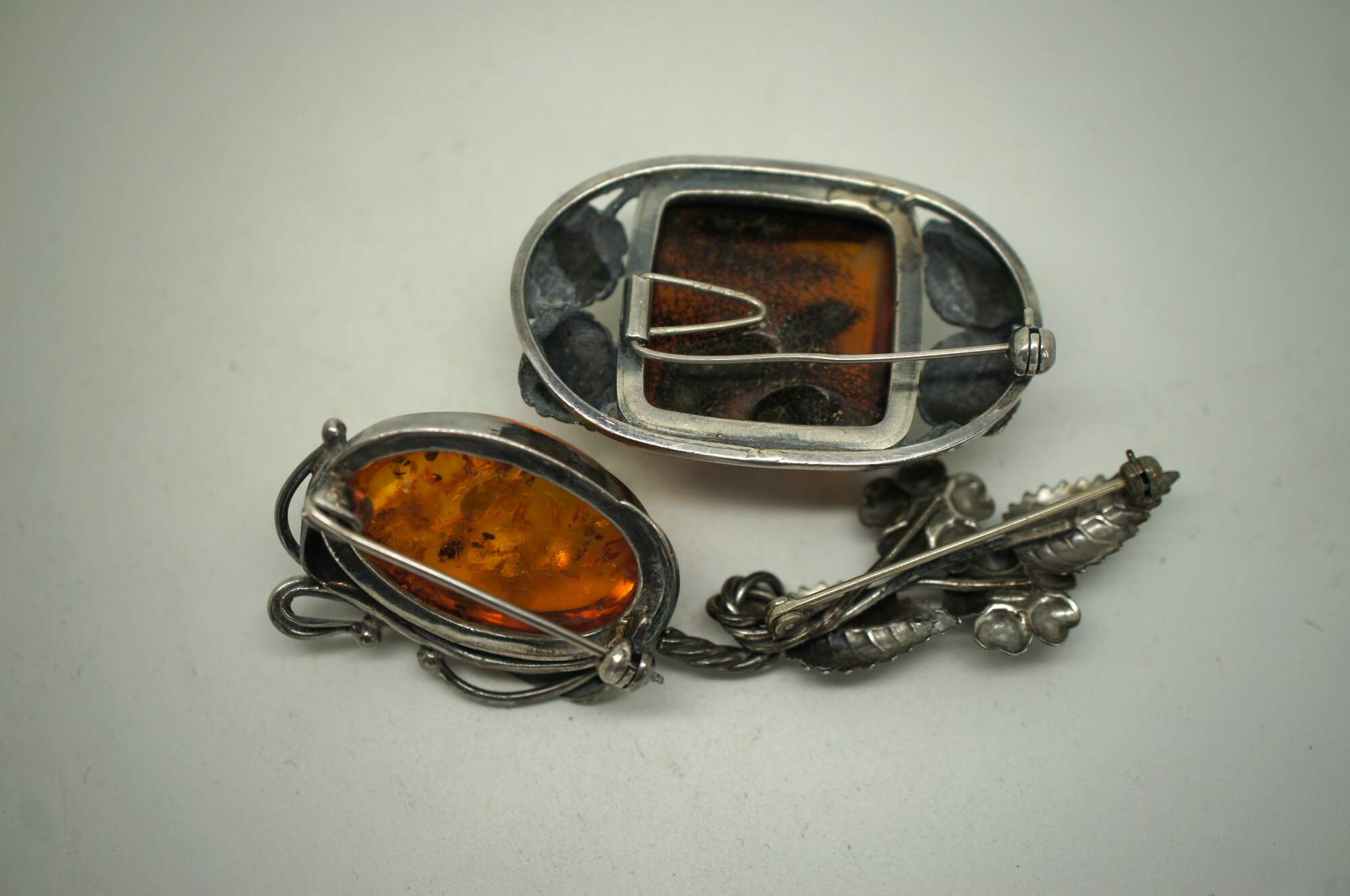Set of three mid to late 20th century silver pins / brooches. One plain in the shape of a twisted stem of leaves and roses. One square amber stone frames in leaves. One oval amber stone framed in swirling art nouveau inspired leaves.