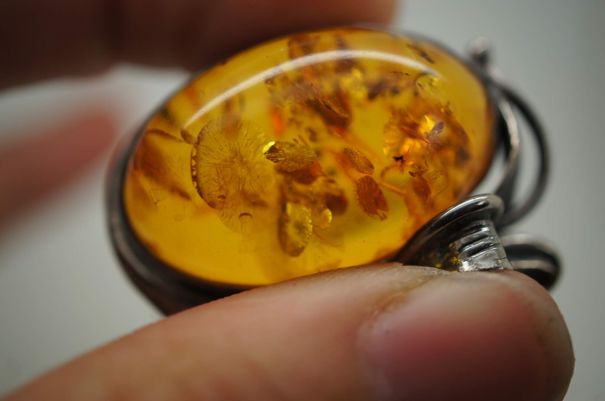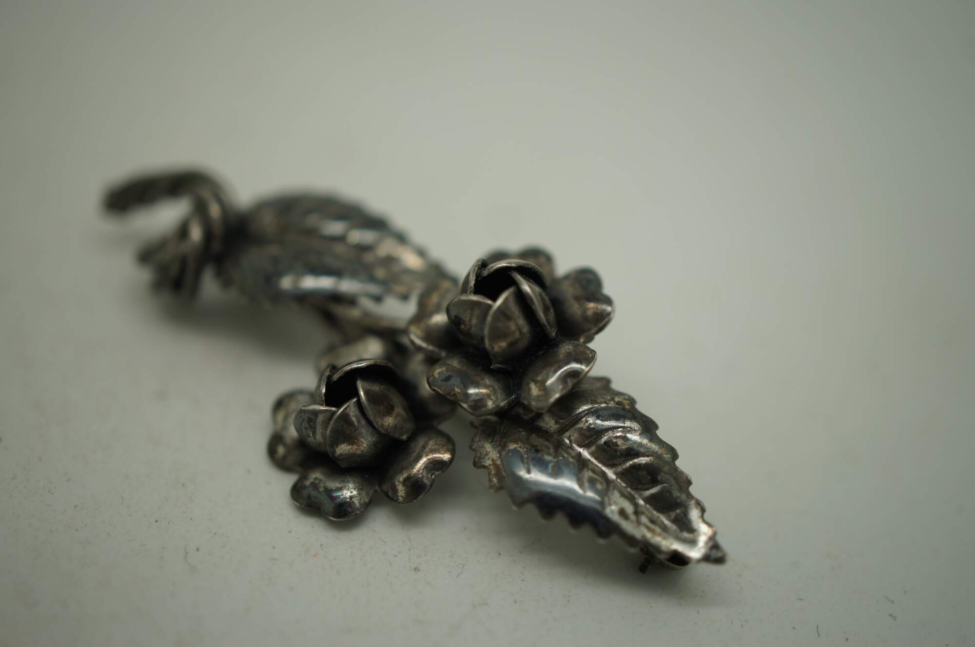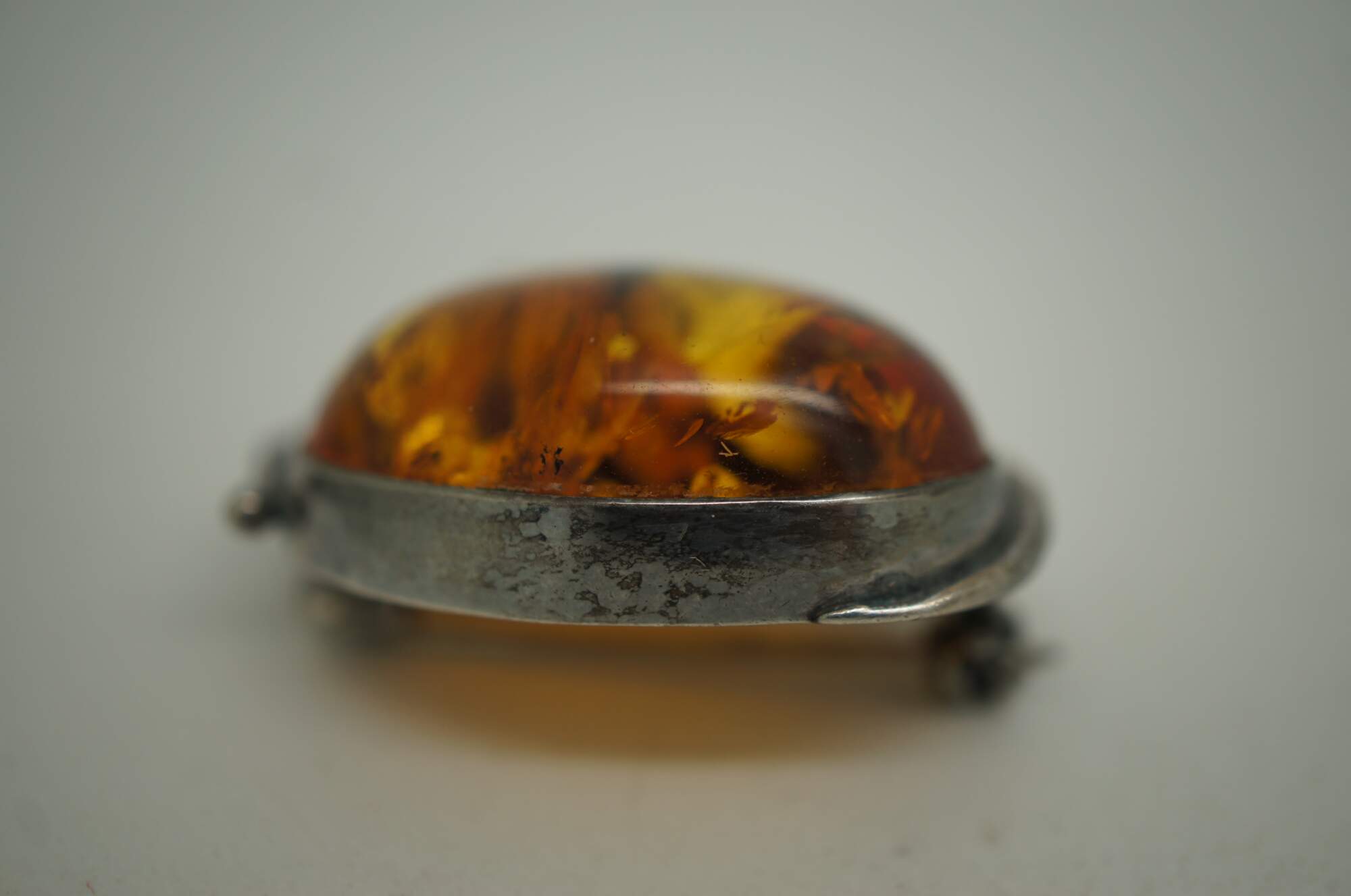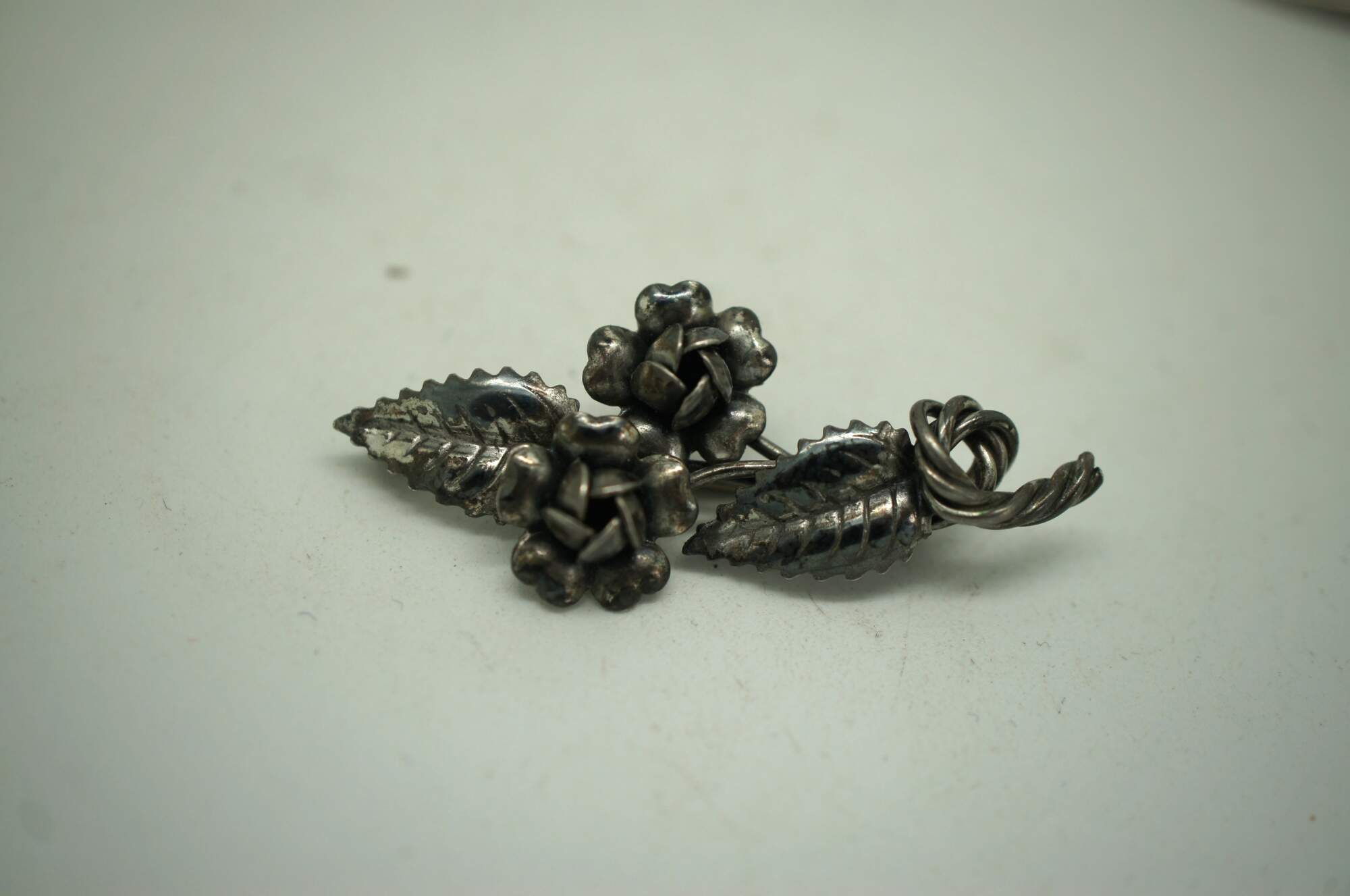 Set of three mid to late 20th century silver pins / brooches. One plain in the shape of a twisted stem of leaves and roses. One square amber stone frames in leaves. One oval amber stone framed in swirling art nouveau inspired leaves.