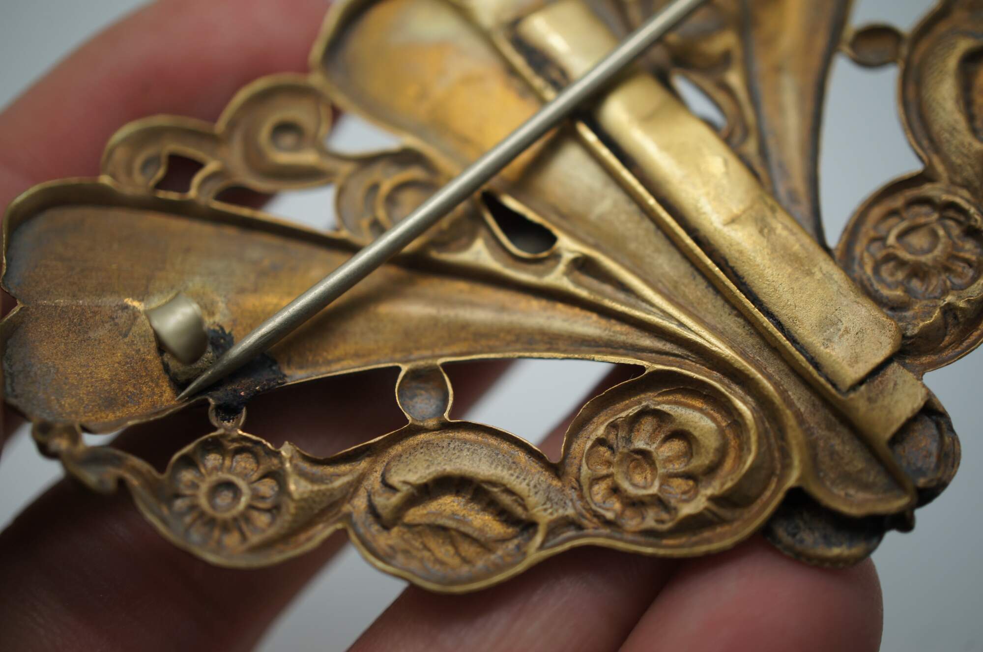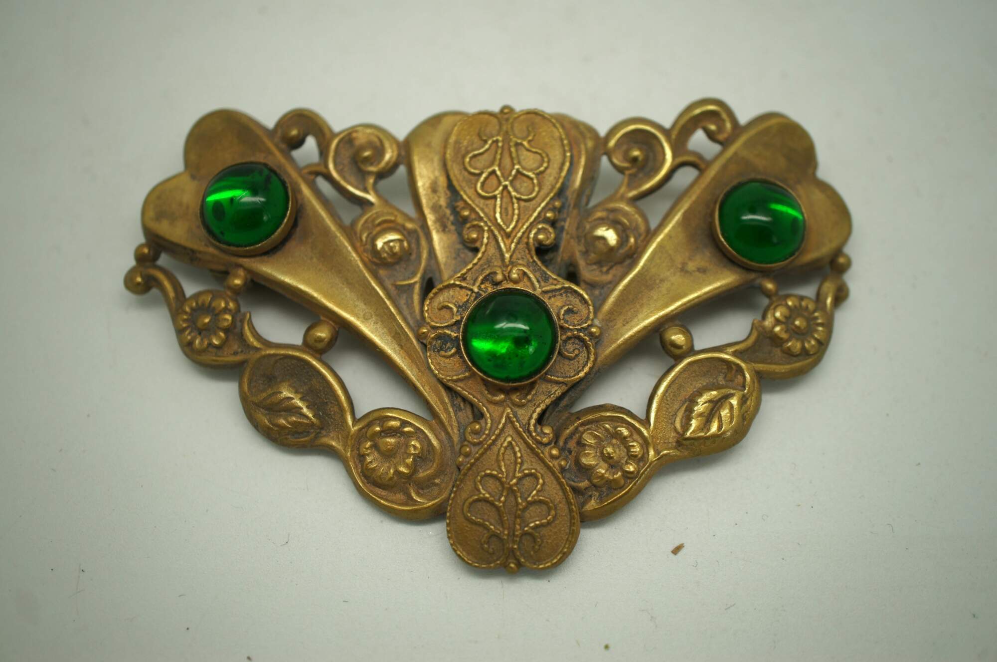 Late 19th century Art Nouveau brass sash pin / brooch featuring a trangular shield-like shape decorated with flowers and foliate motifs, accented with a trio of round green glass stones.