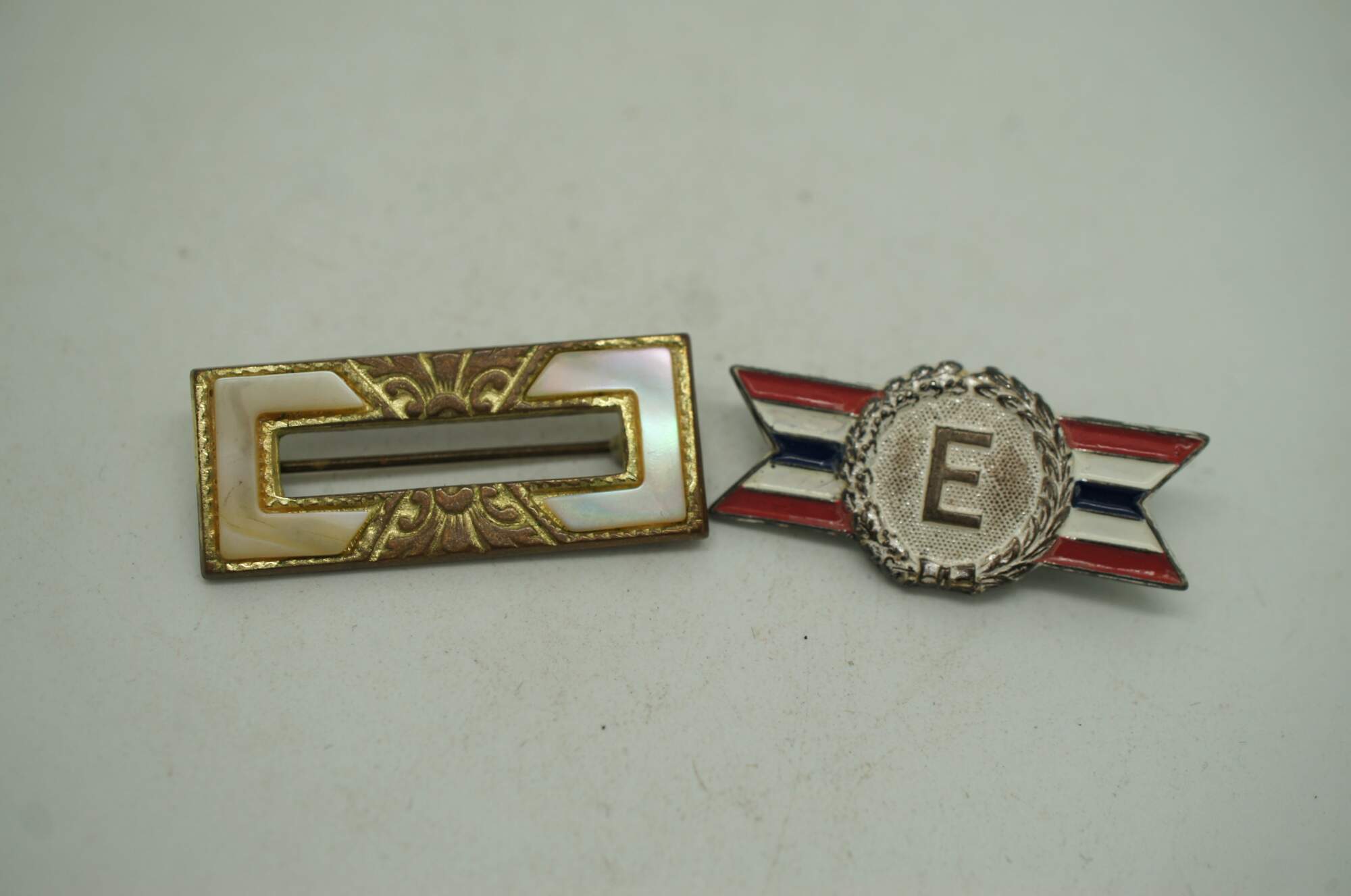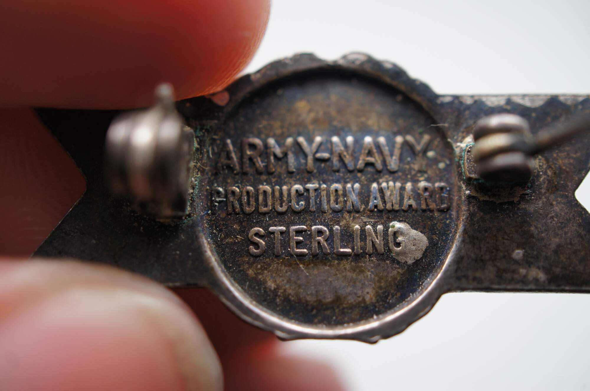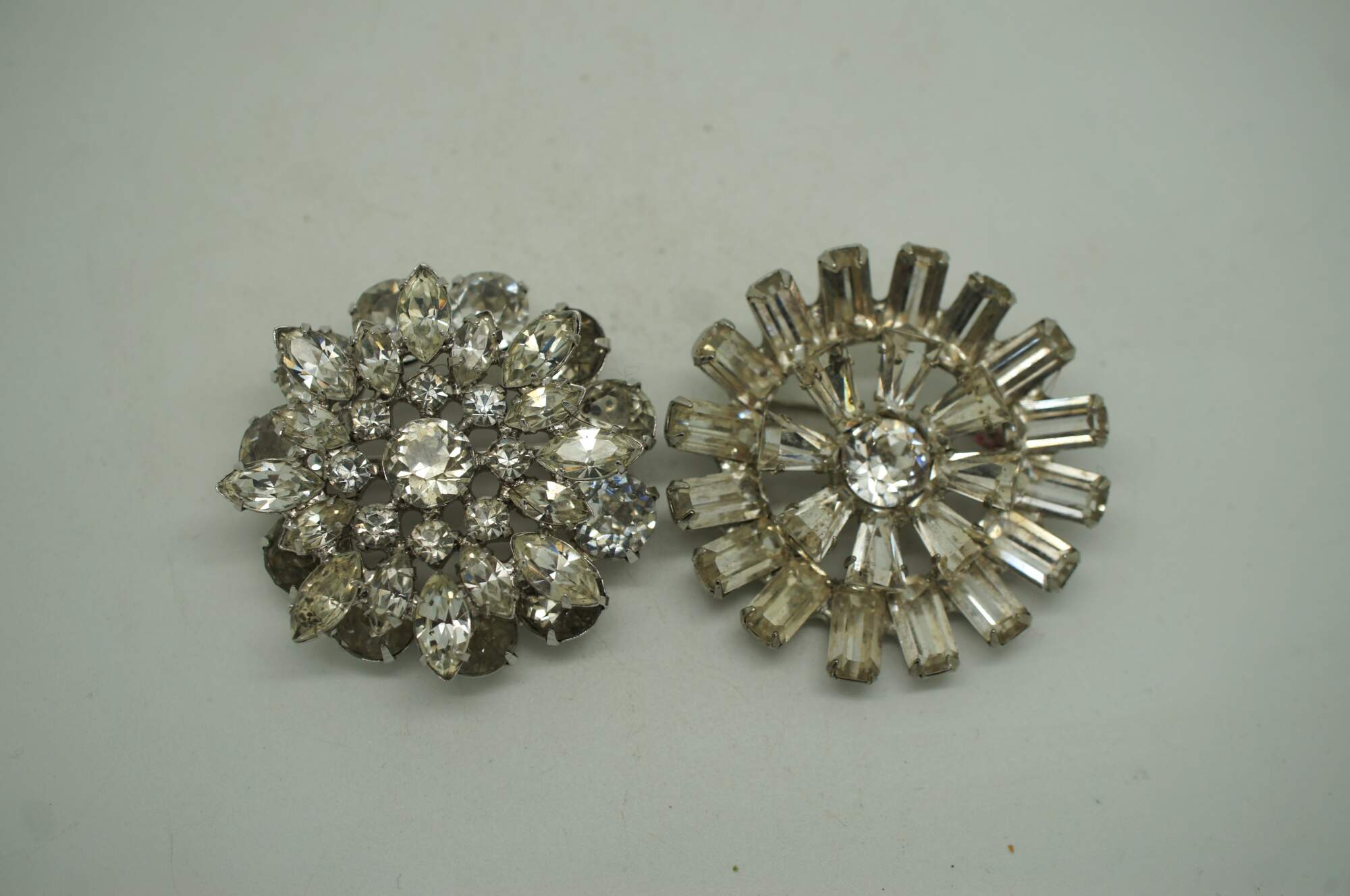 Lot of 16 mid to late 20th century pins / brooches in a variety of styles. Rhinestones, mother of pearl, enamel. One Army-Navy Production Award. Souvenir pin from USSR / Soviet 1959 exhibition in New York City. Marked brands include Weiss, AMA.