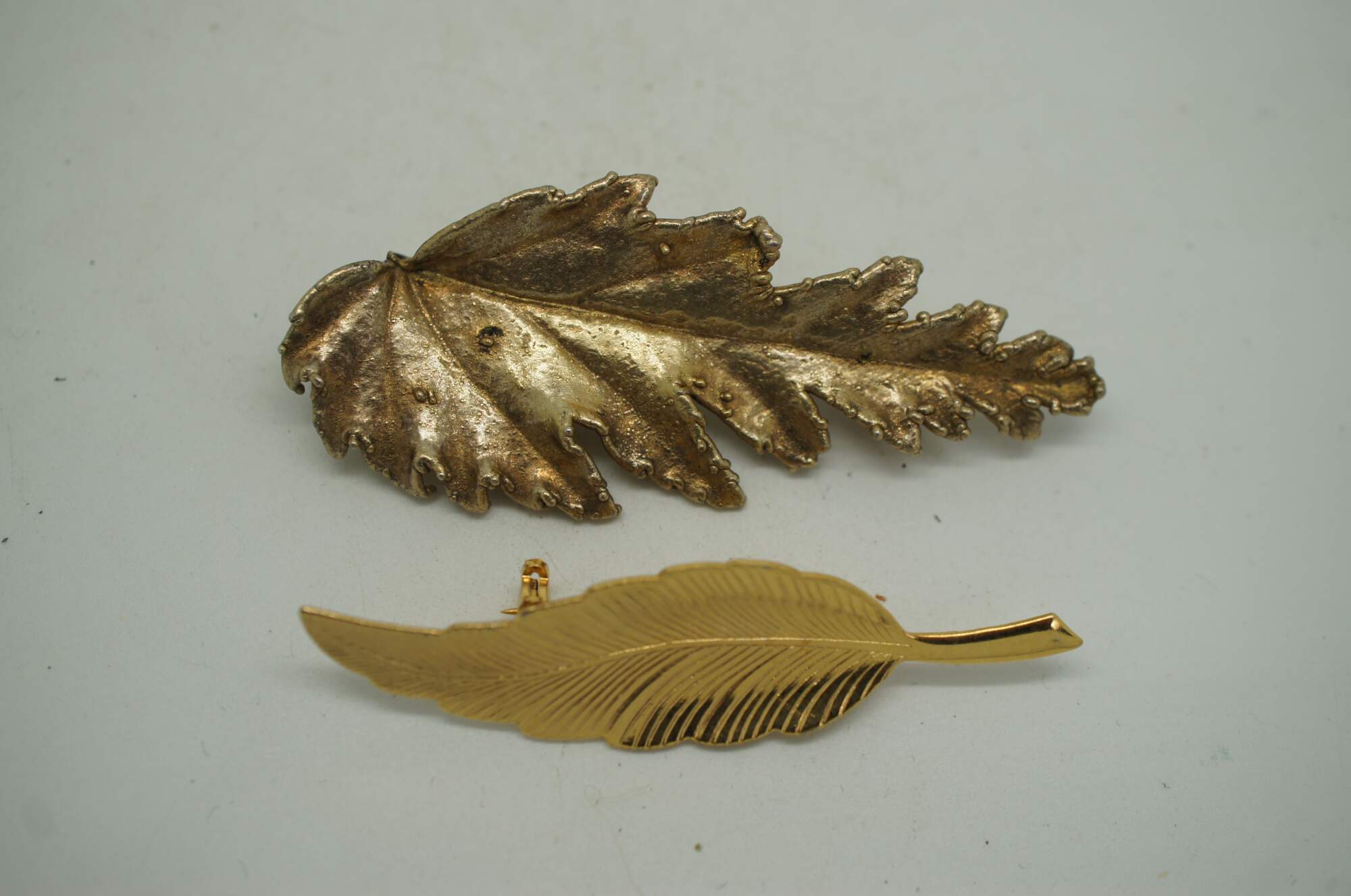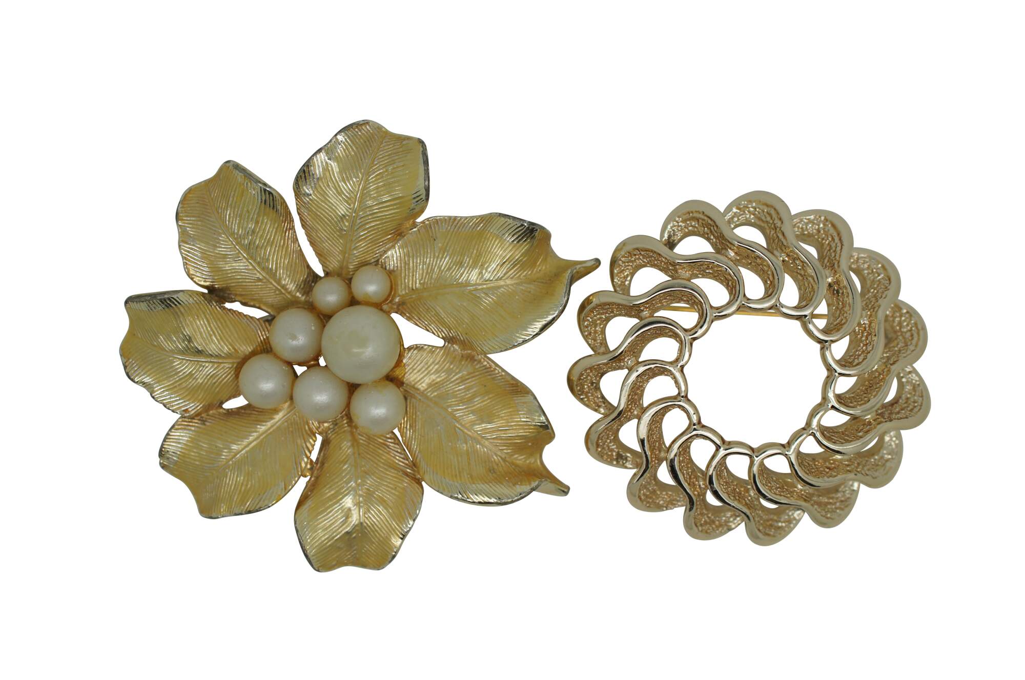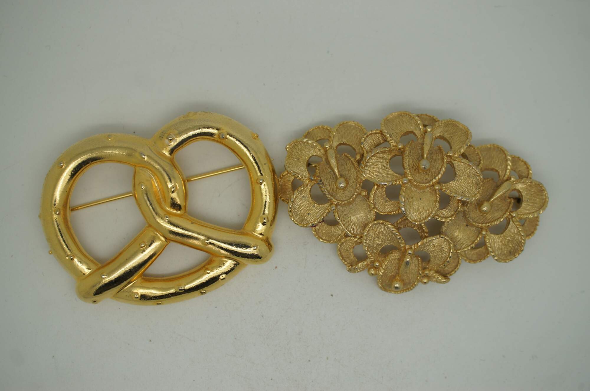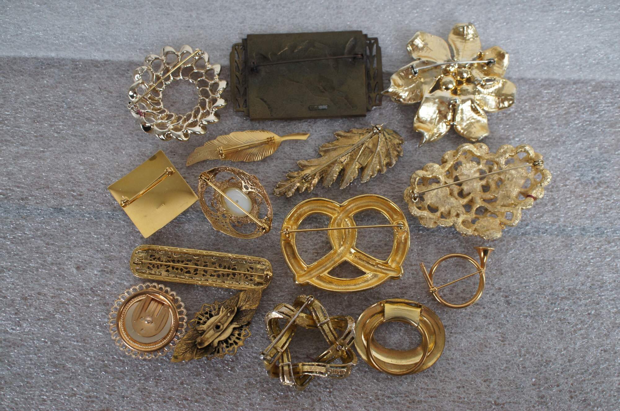 Lot of 15 mid to late 20th century gold tone metal pins / brooches and two scarf clips. Marks include JJ, Sarah Cov, Flora Danica / Eggert Denmark, Monet, Lisner, Germany, / Western Germany. Antelope, flowers, leaves, ribbon, pretzel.
