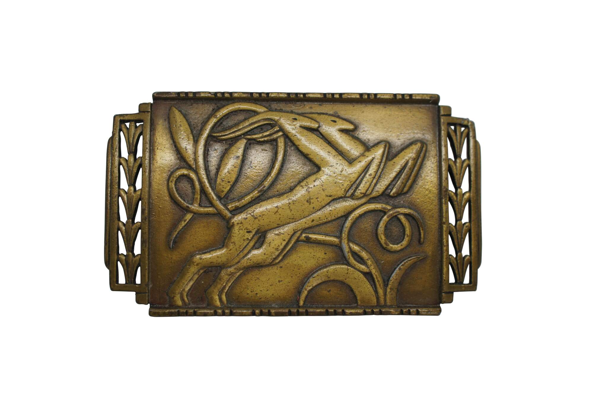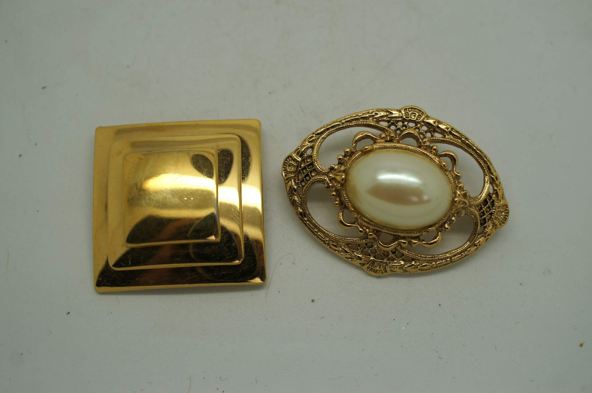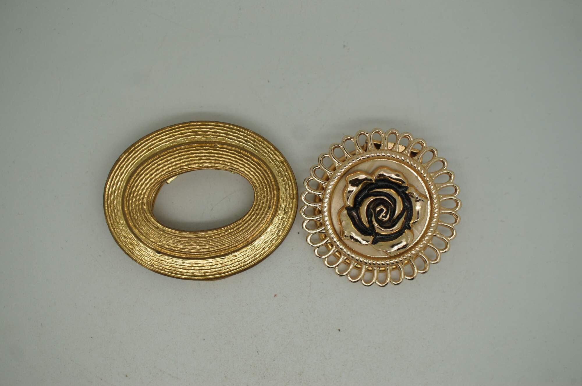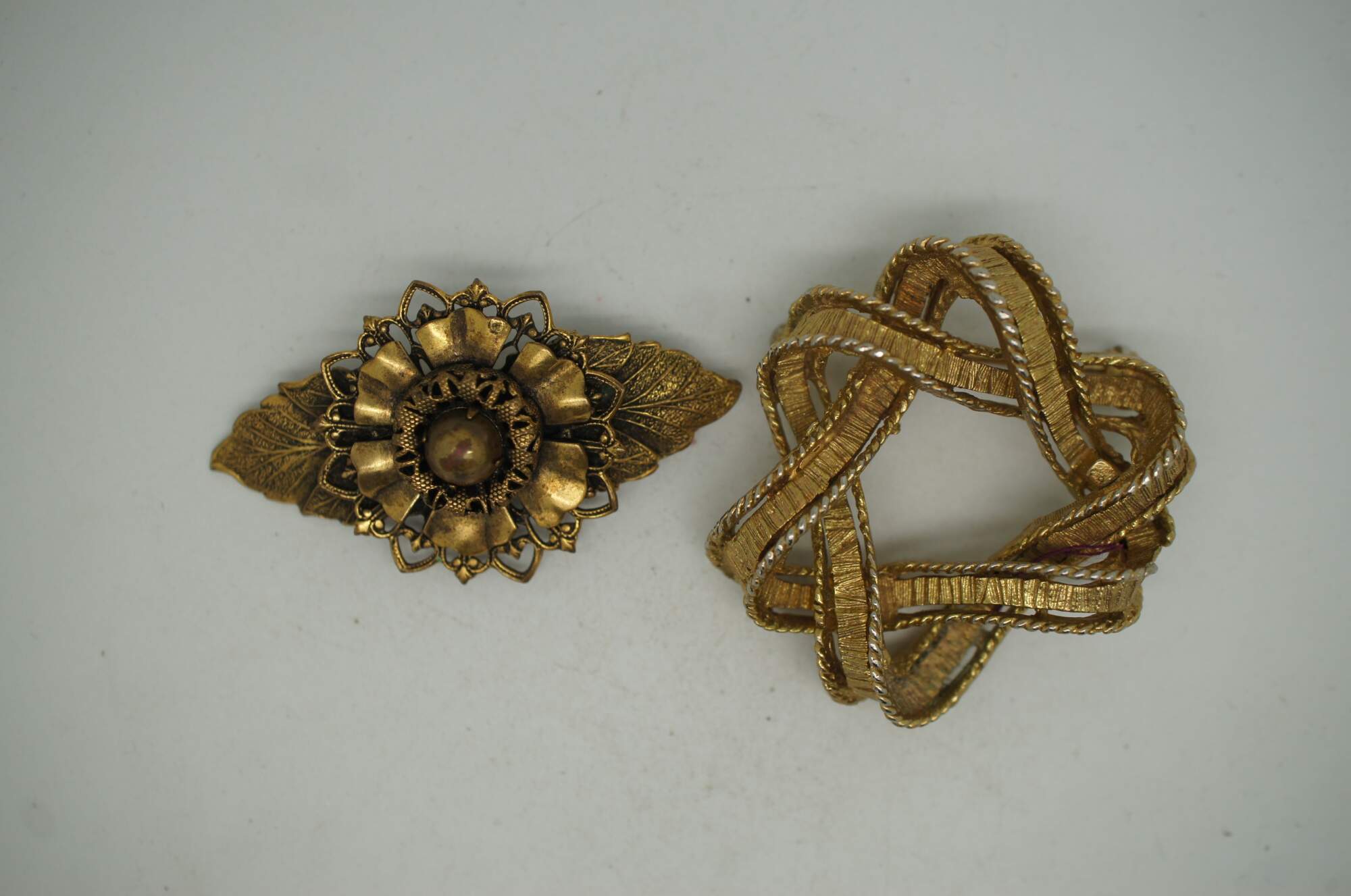 Lot of 15 mid to late 20th century gold tone metal pins / brooches and two scarf clips. Marks include JJ, Sarah Cov, Flora Danica / Eggert Denmark, Monet, Lisner, Germany, / Western Germany. Antelope, flowers, leaves, ribbon, pretzel.