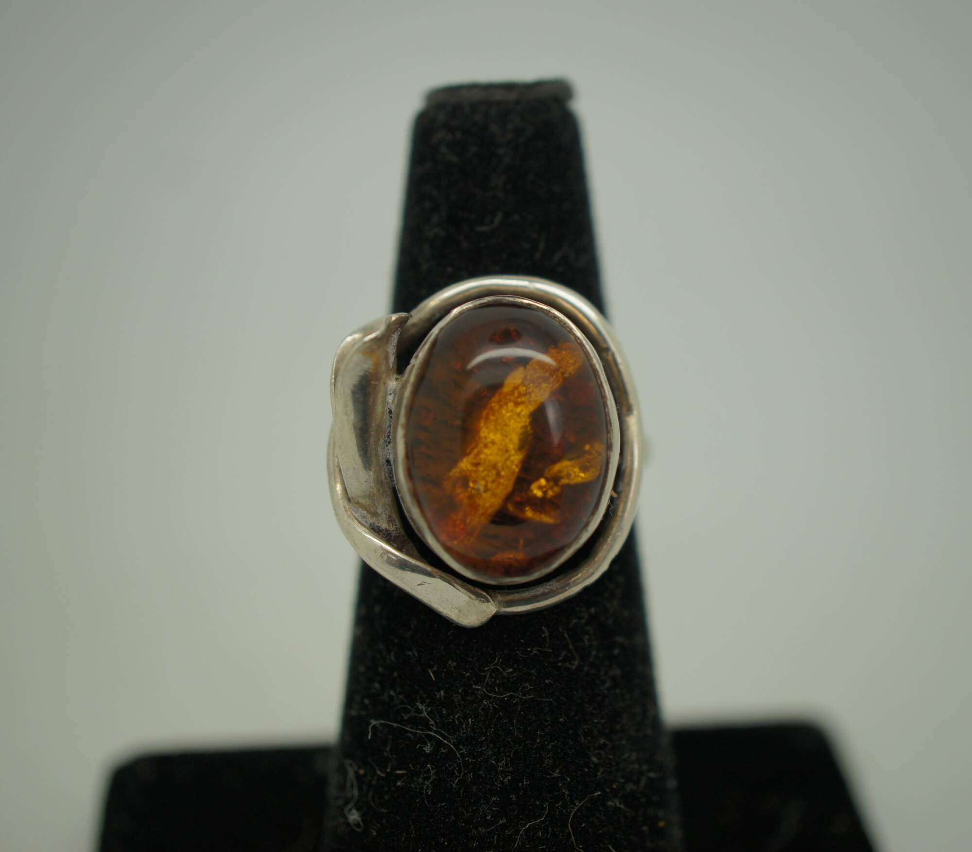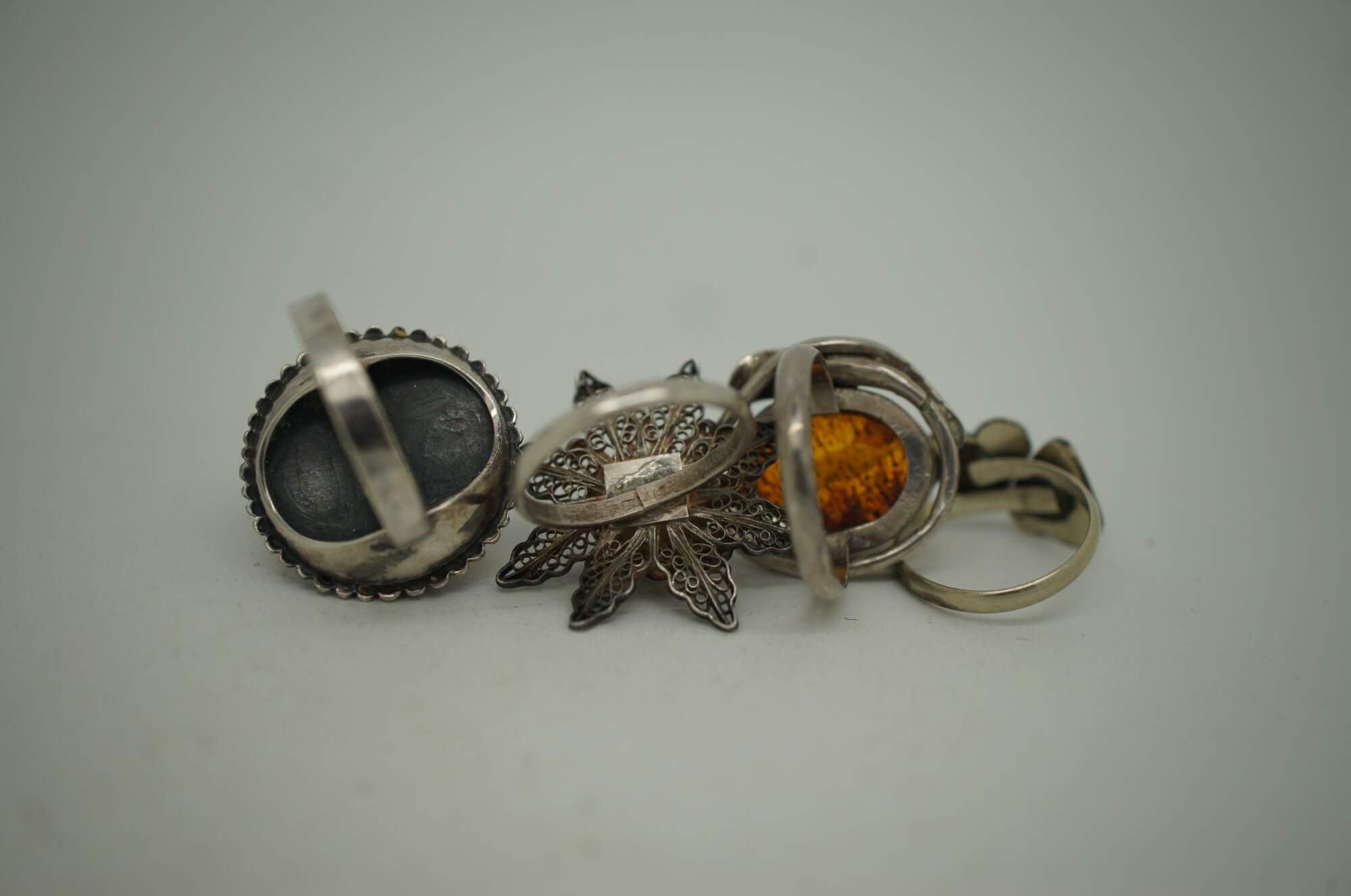 Set of 4 mid to late 20th century rings. Silver tone metal; un-marked. Two with amber cabochon stones. One filigree flower. One pair of hearts with turquoise chip.