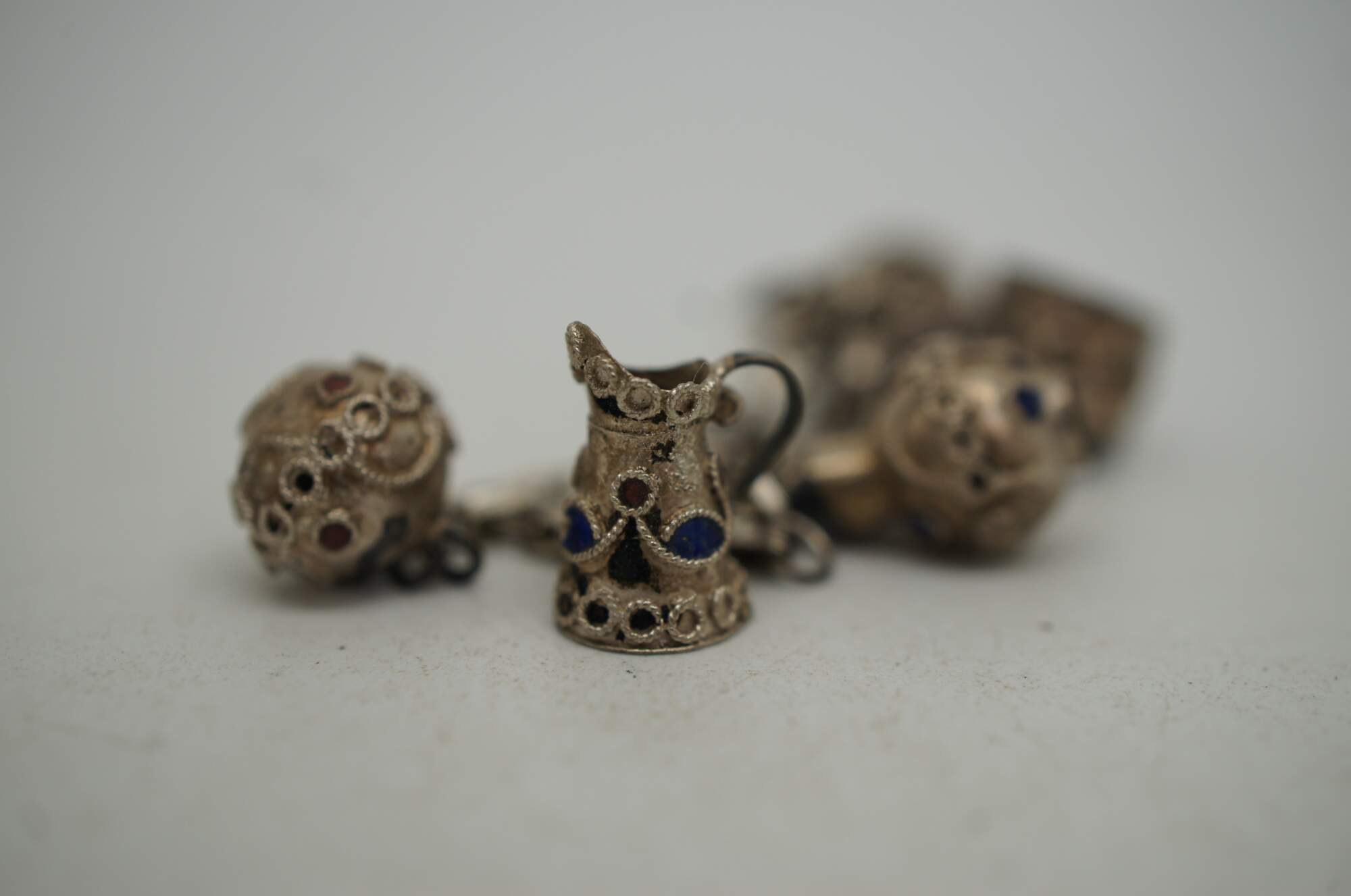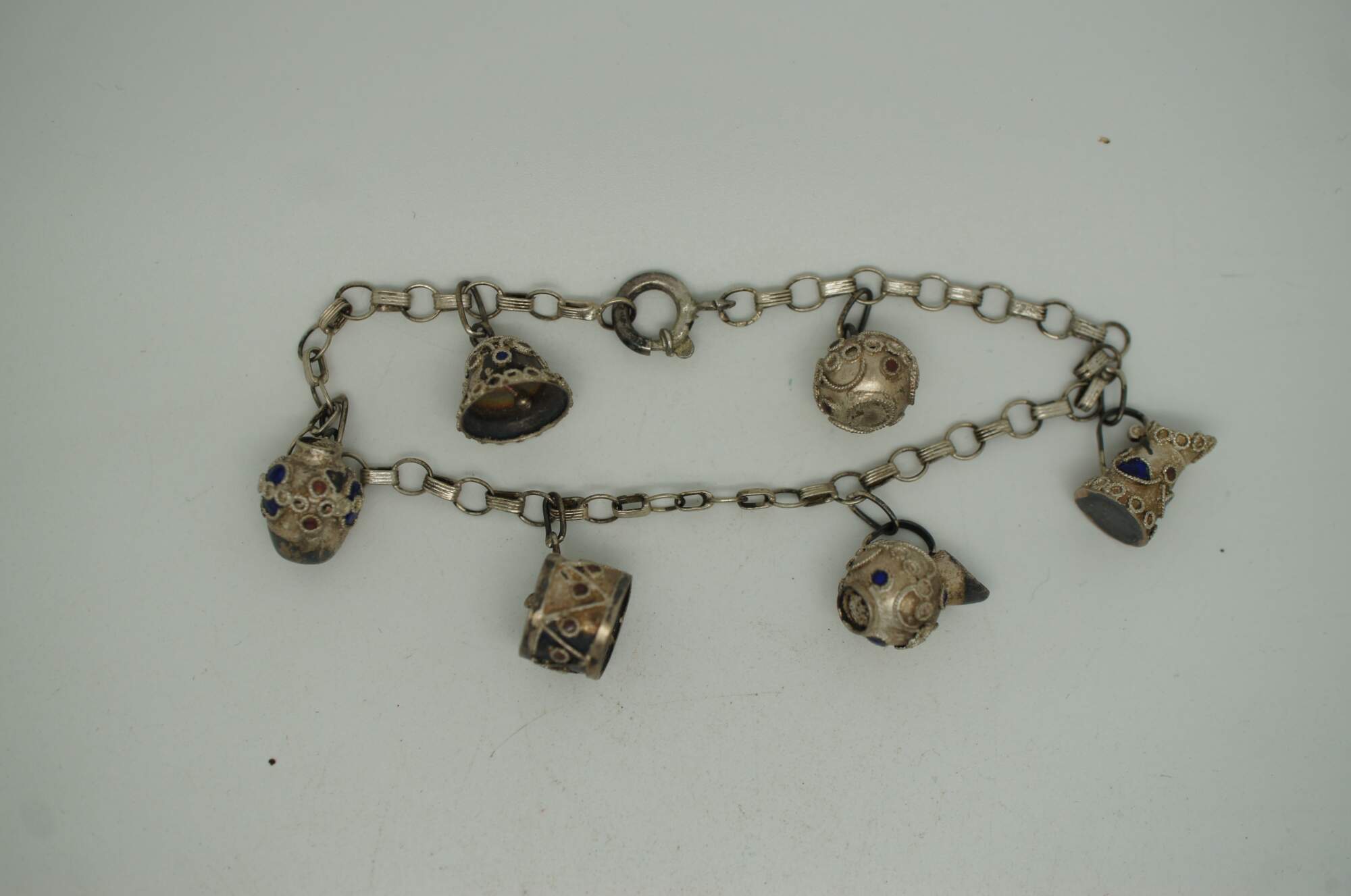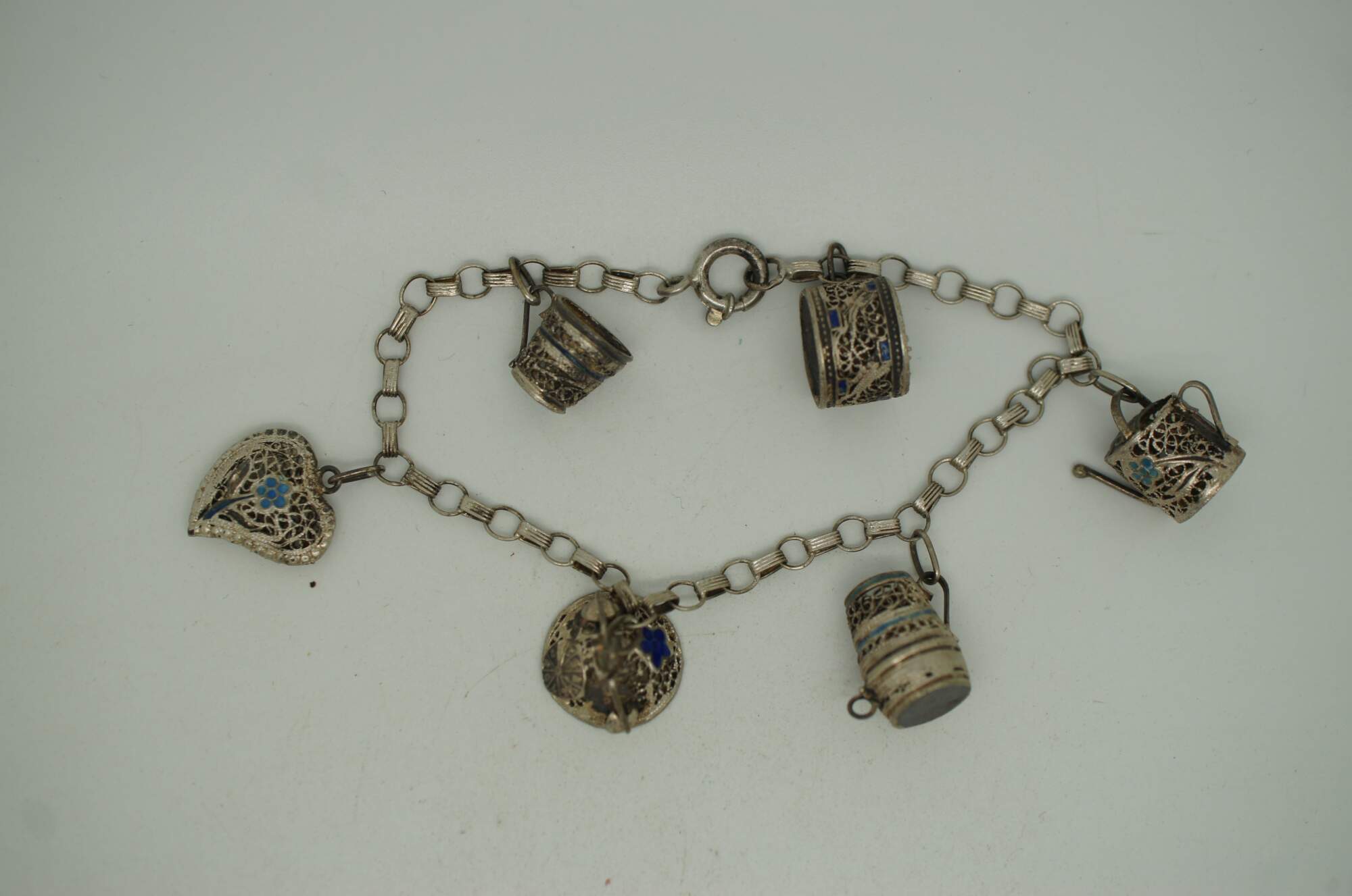 Small lot four early to mid 20th century silver tone metal charm bracelets - one assorted charms, one British coins, two Portugese filigree and enamel charms.