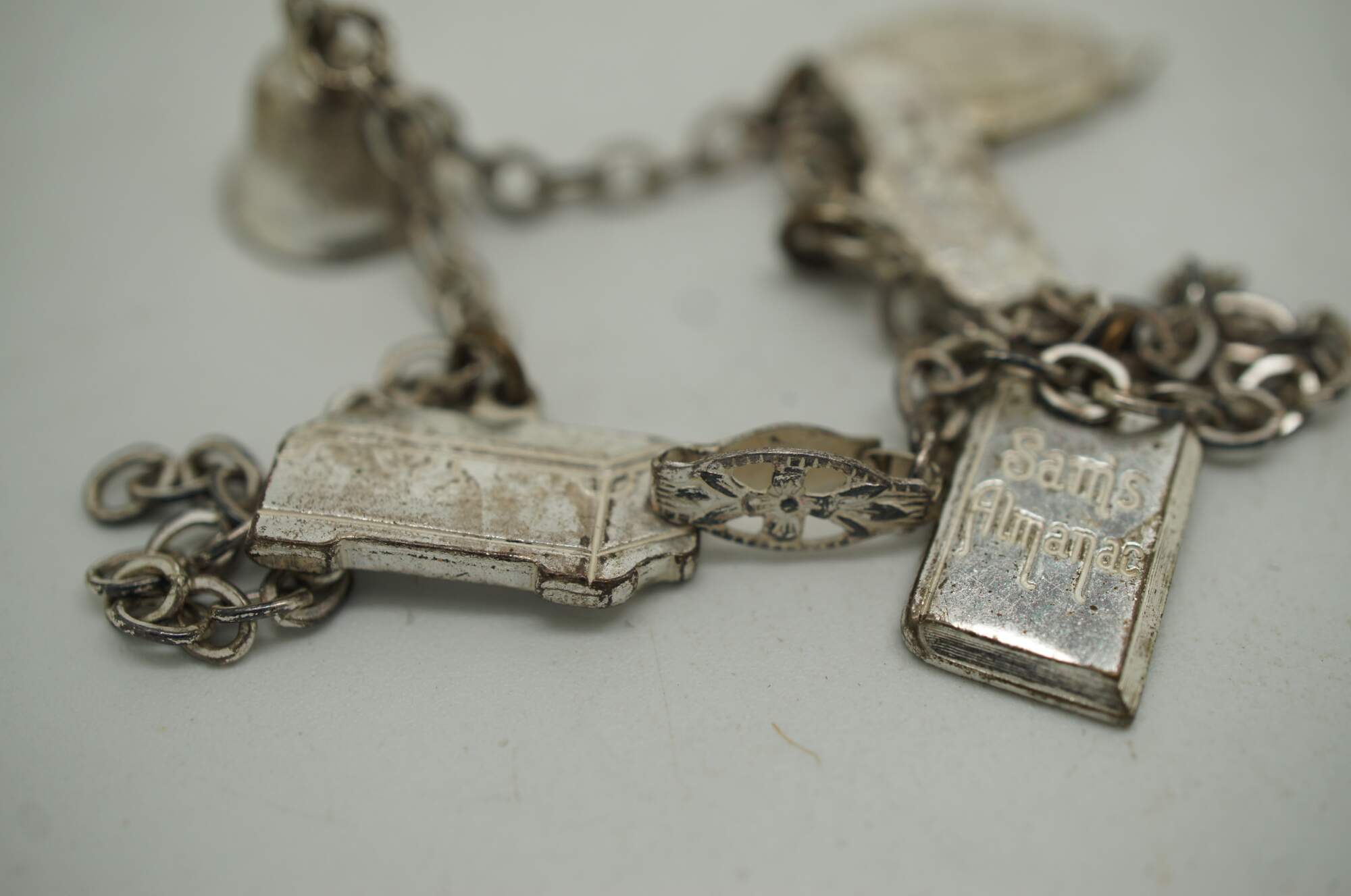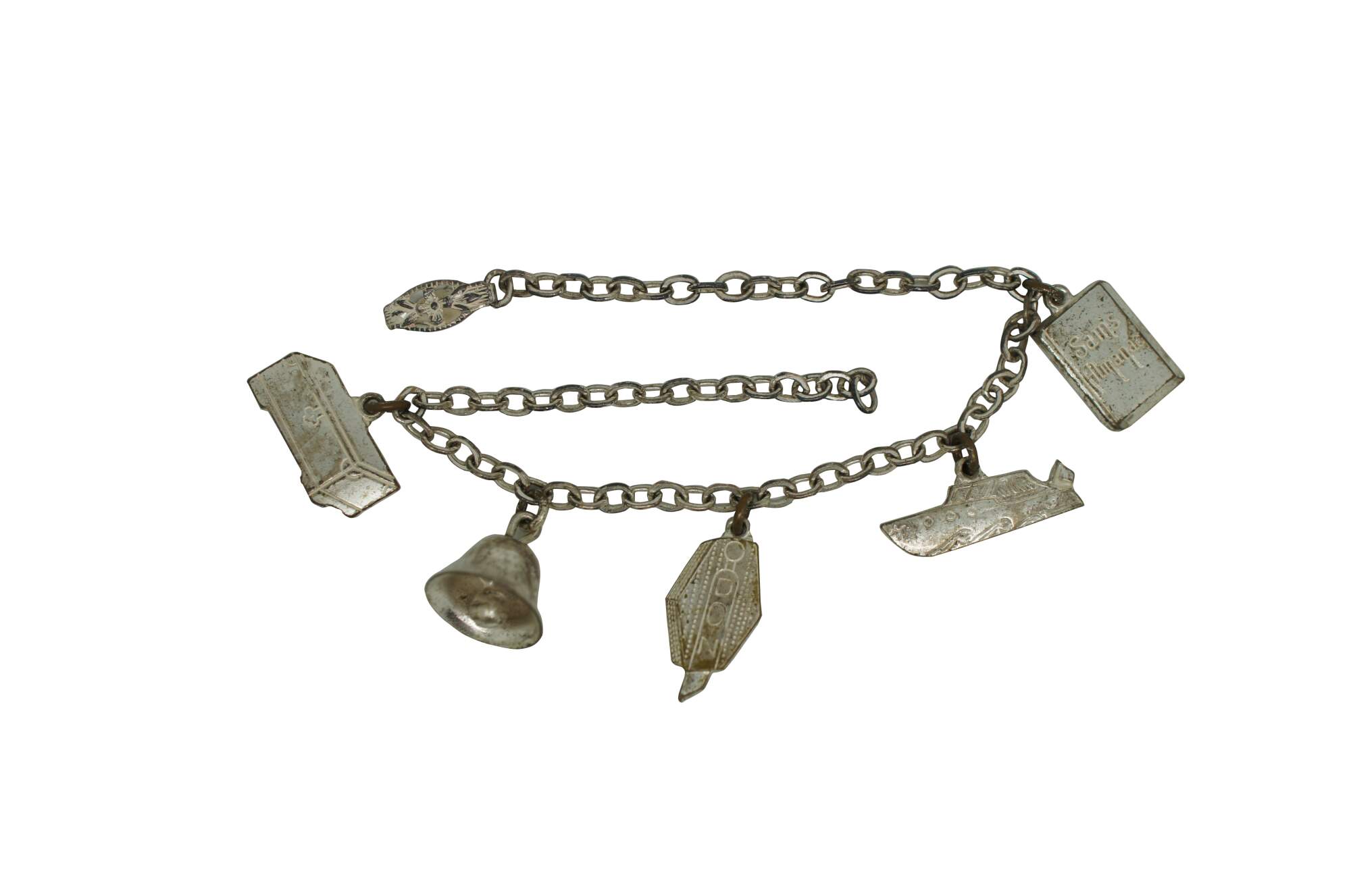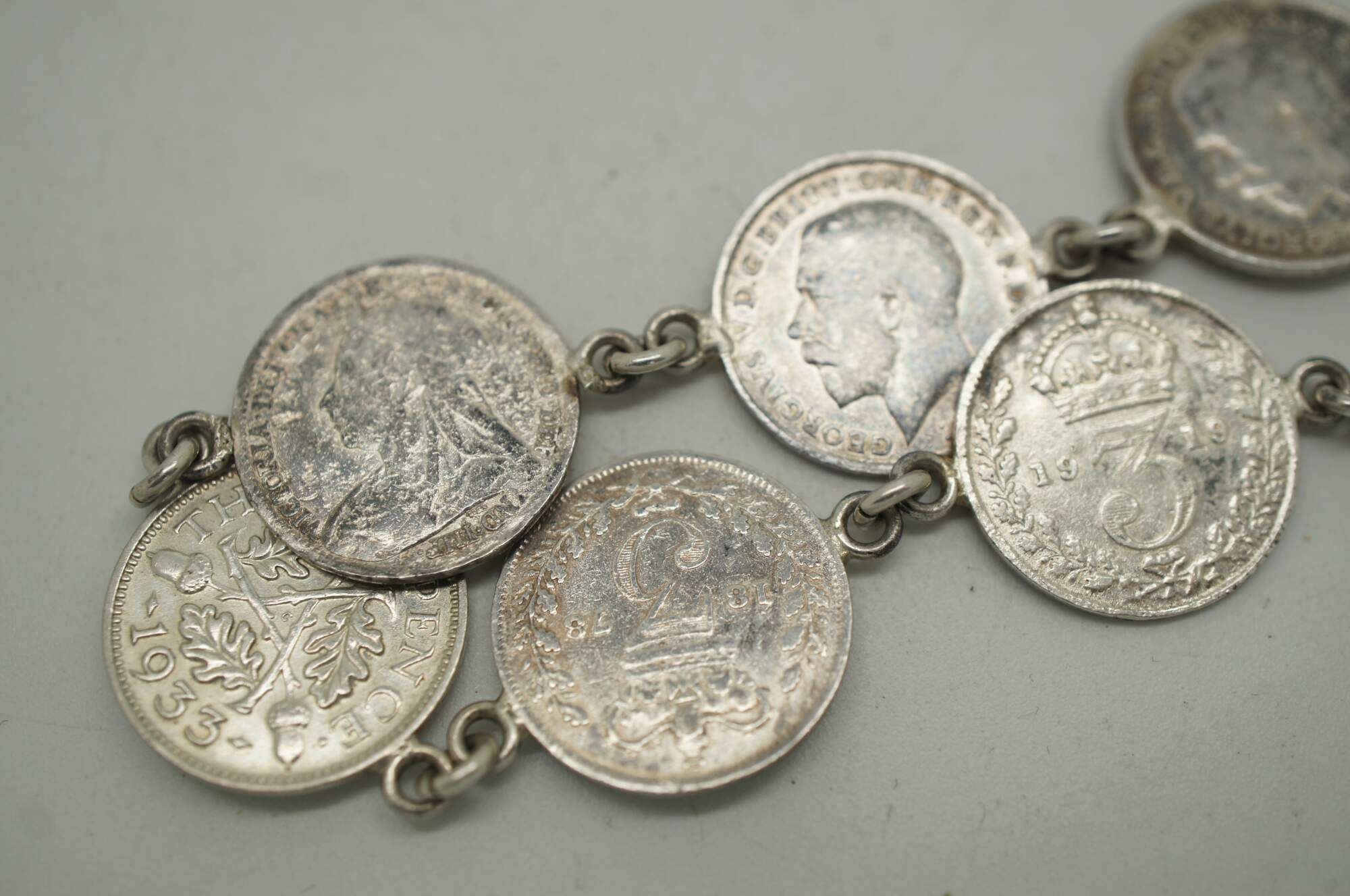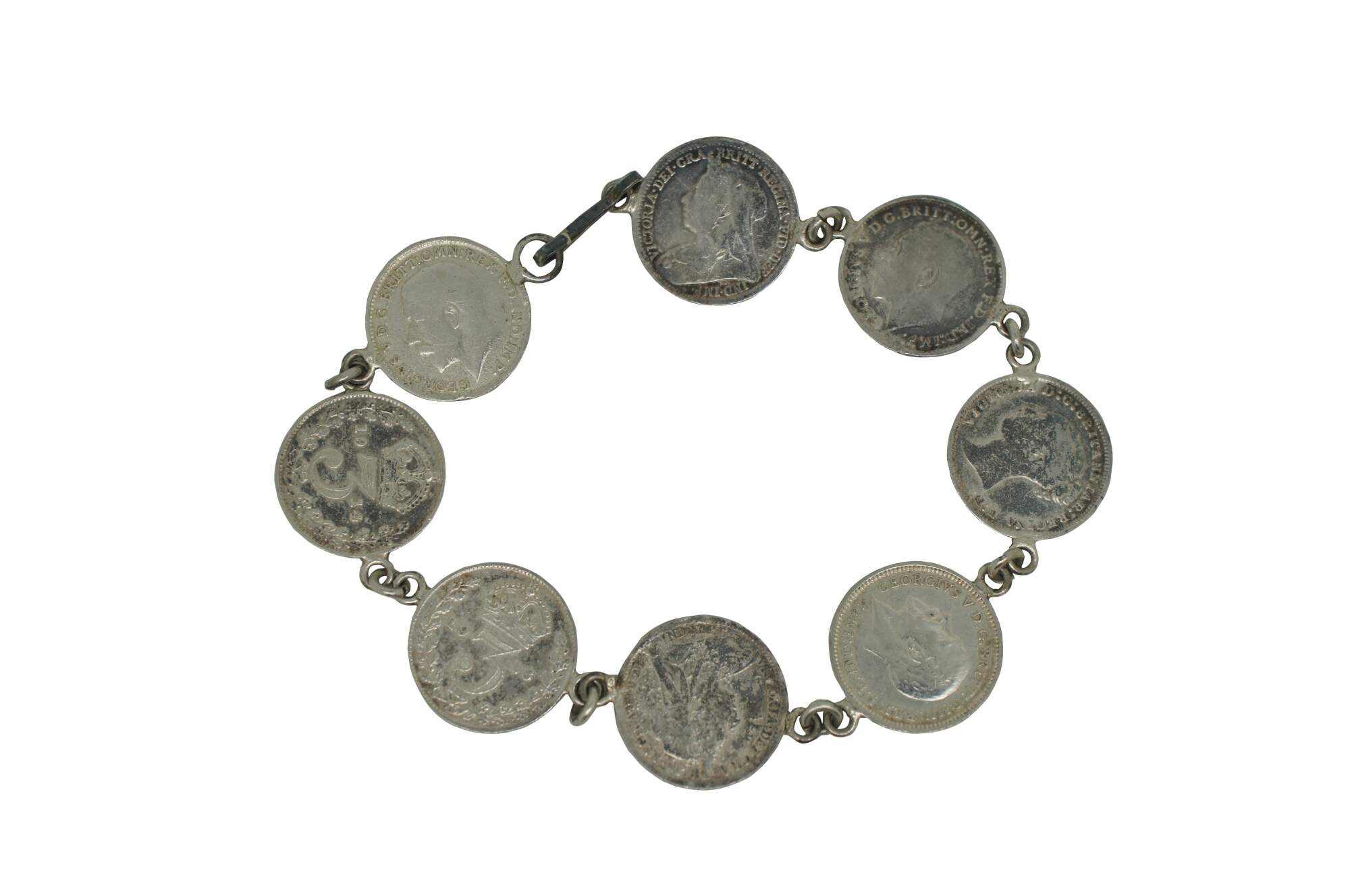 Small lot four early to mid 20th century silver tone metal charm bracelets - one assorted charms, one British coins, two Portugese filigree and enamel charms.