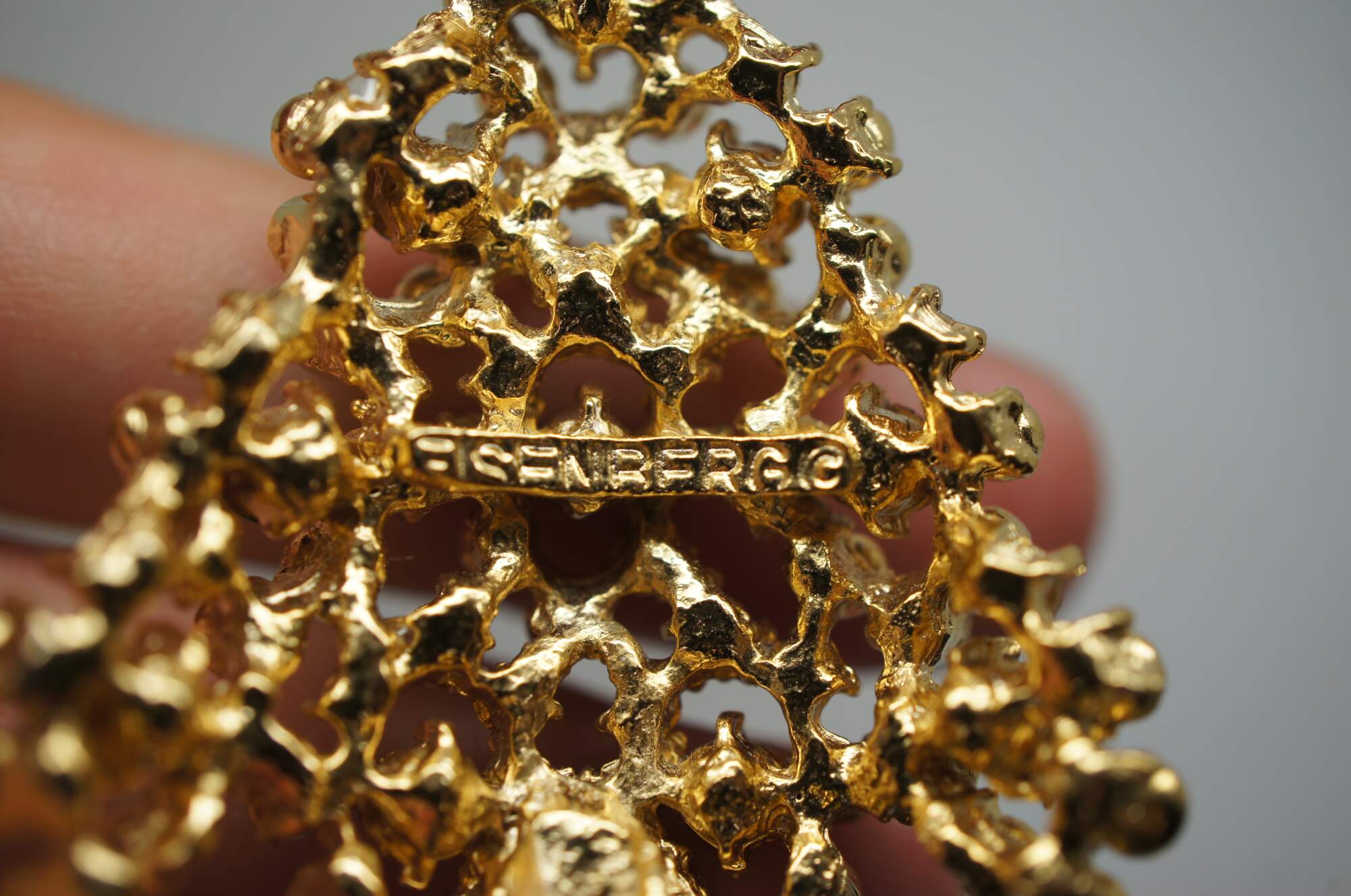 Lot of 8 late 20th century Christmas / holiday pins / brooches. Gold tone metal with enamel and rhinestones. Three Christmas trees, reindeer with holly, wreath with bell, wreath with candles, angel. Marks: Eisenberg, BJ.