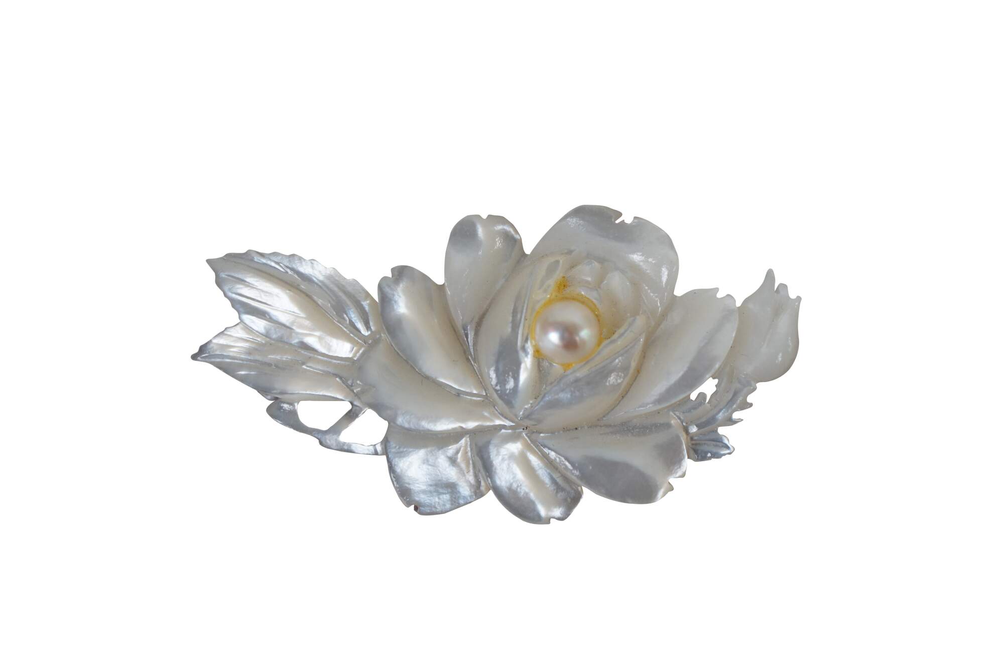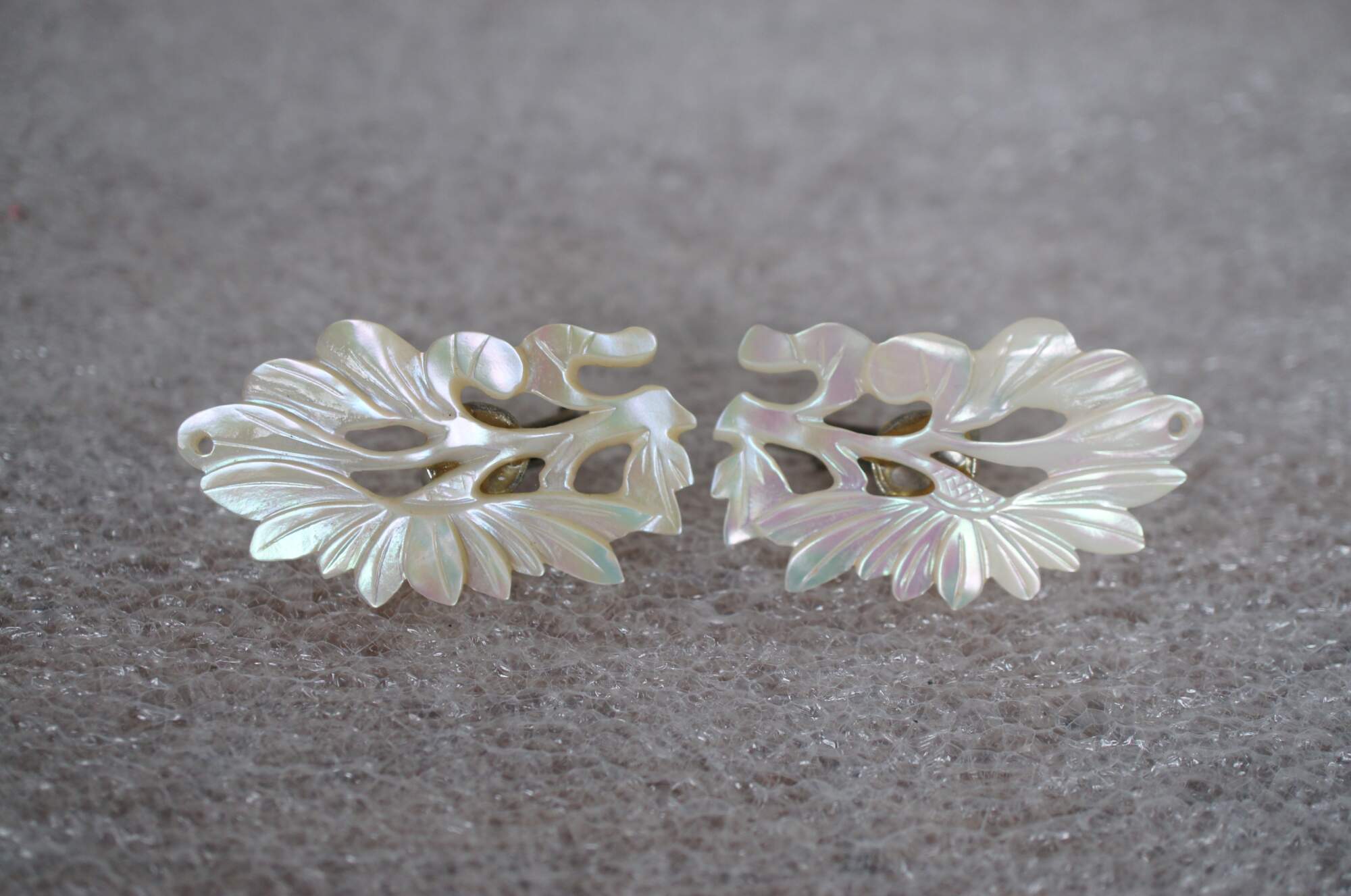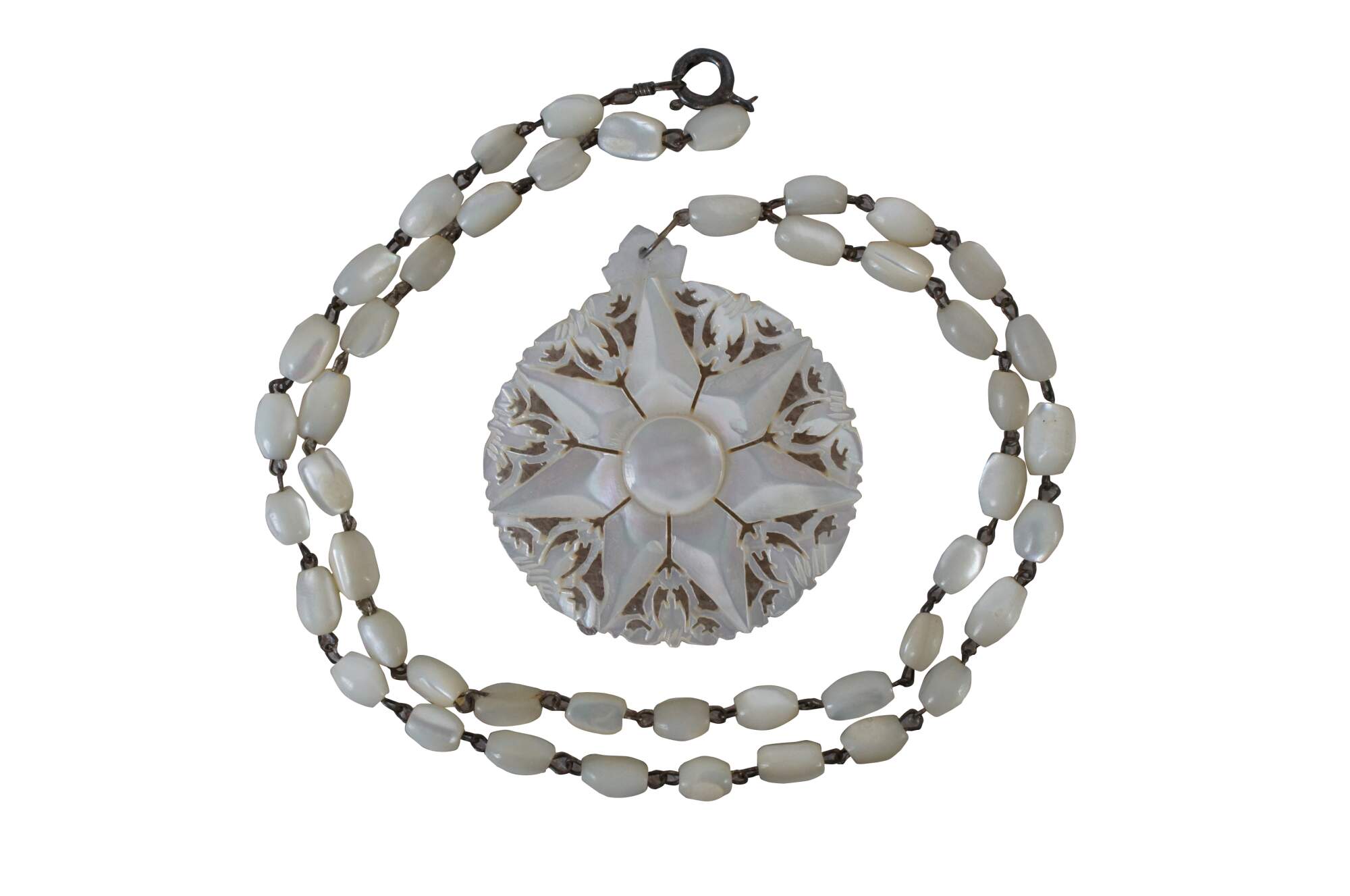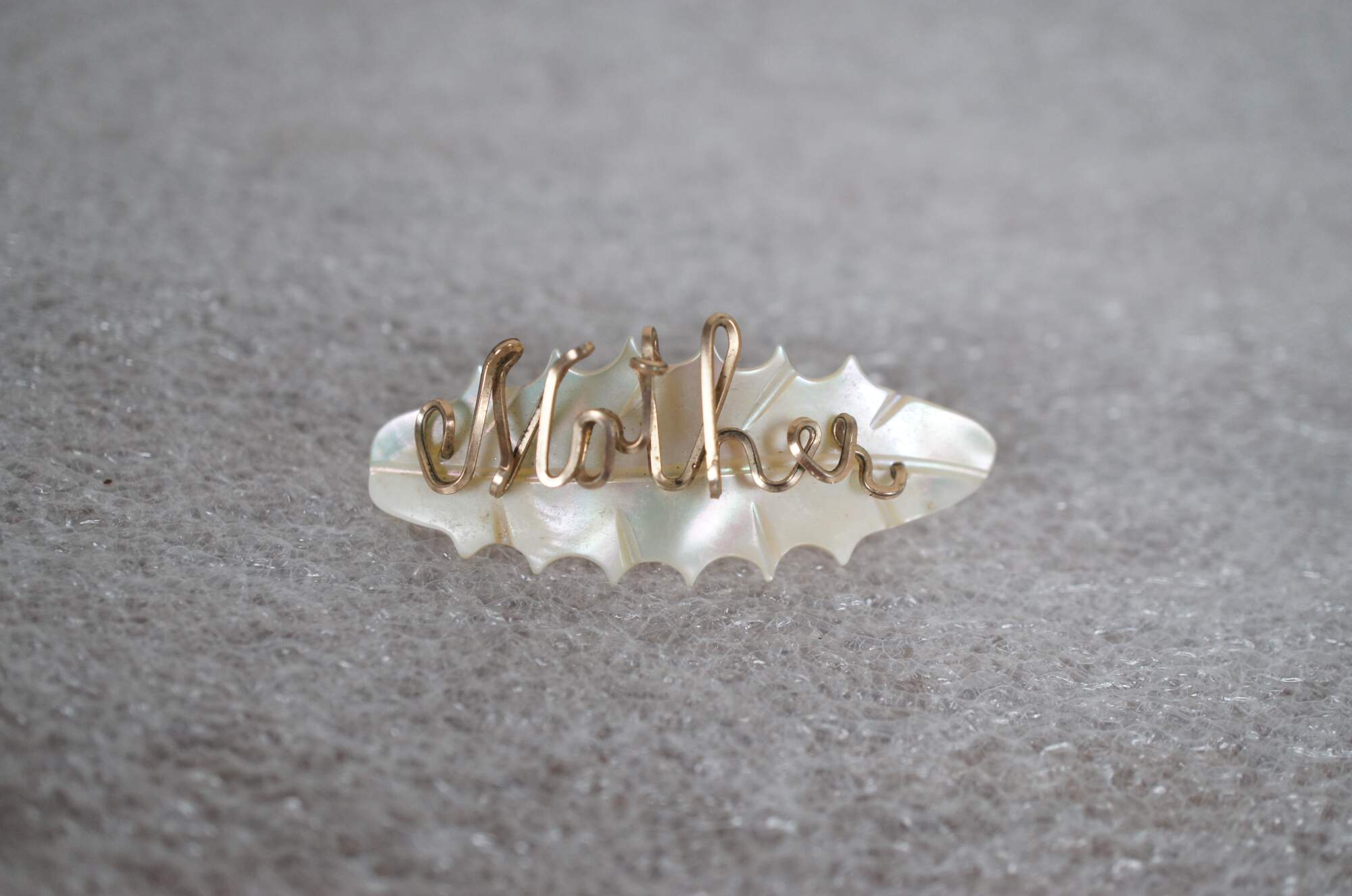 Set of six piece of mid to late 20th century mother of pearl jewelry. Star pendant necklace with beaded chain, matching floral leaf pin pair, rose pin, carved horn shaped pin, leaf pin reading Mother in brass wire.