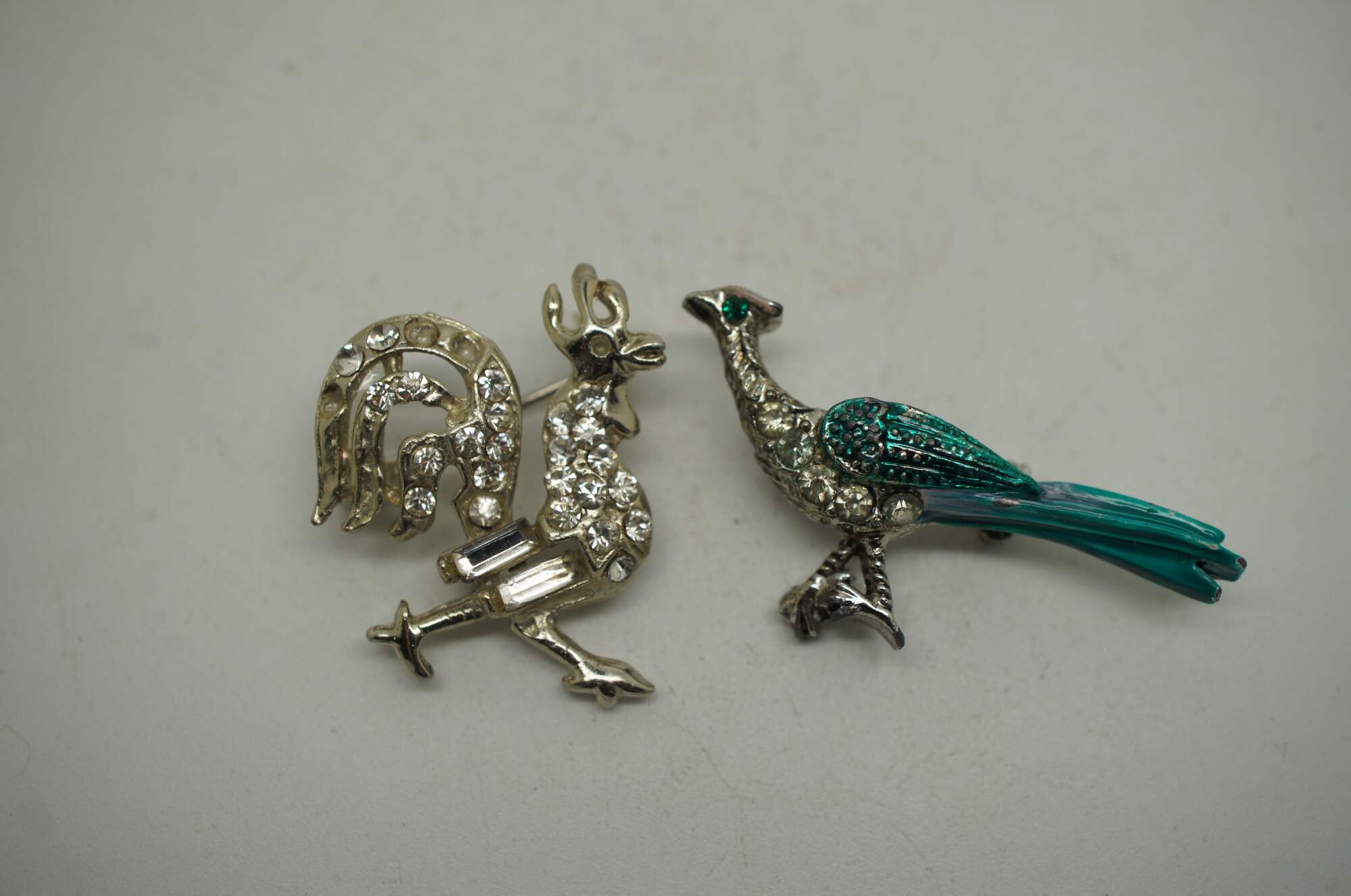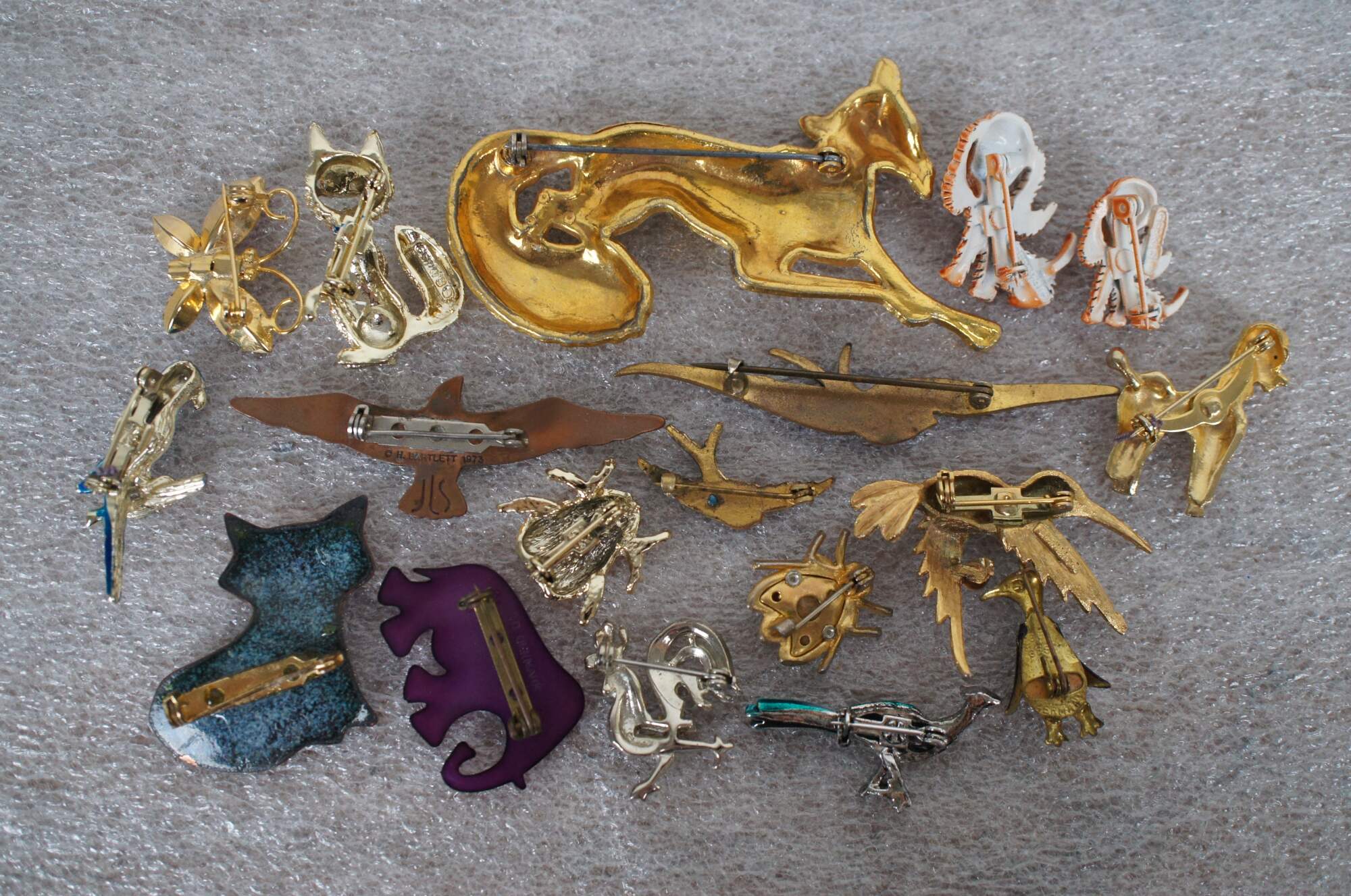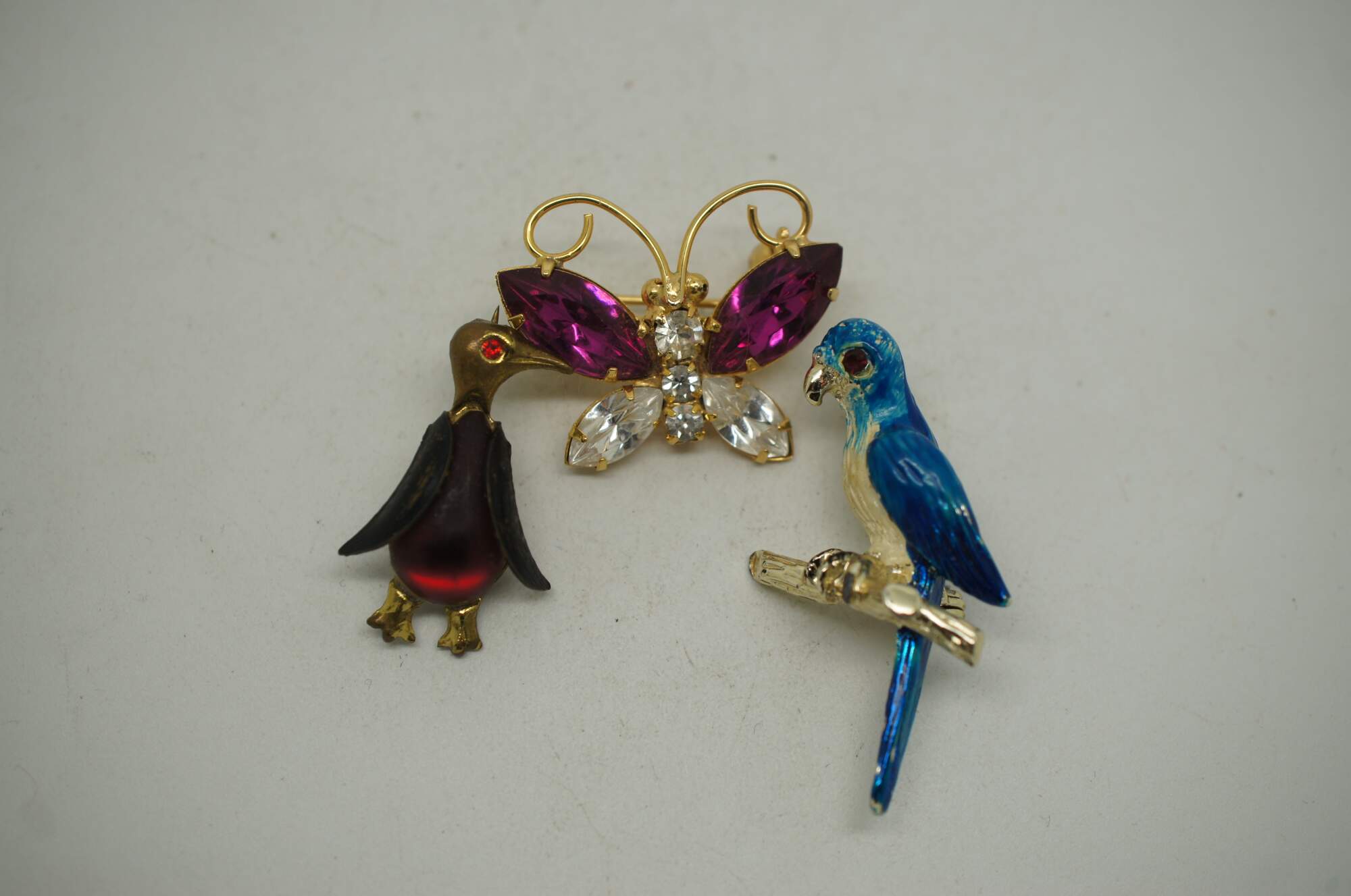 Lot of 18 mid to late 20th century animal themed pins / brooches in a variety of styles, embellished with rhinestones and enamel. Animals includes foxes, dogs, birds / sparrows, seagull, insects / beetles, butterfly, elephant, rooster, peacock, penguin, parrrot. Marks include Made in Germany, H. Bartlett 1973, BD Denmark, Gerrys.