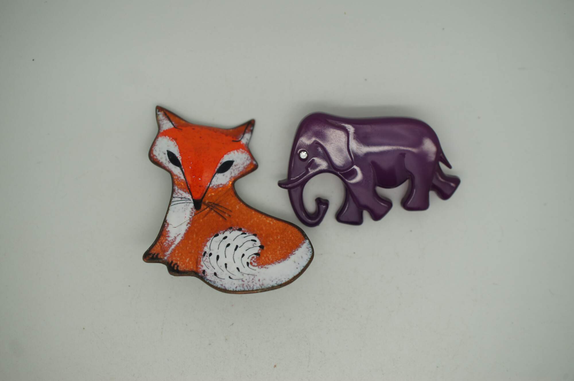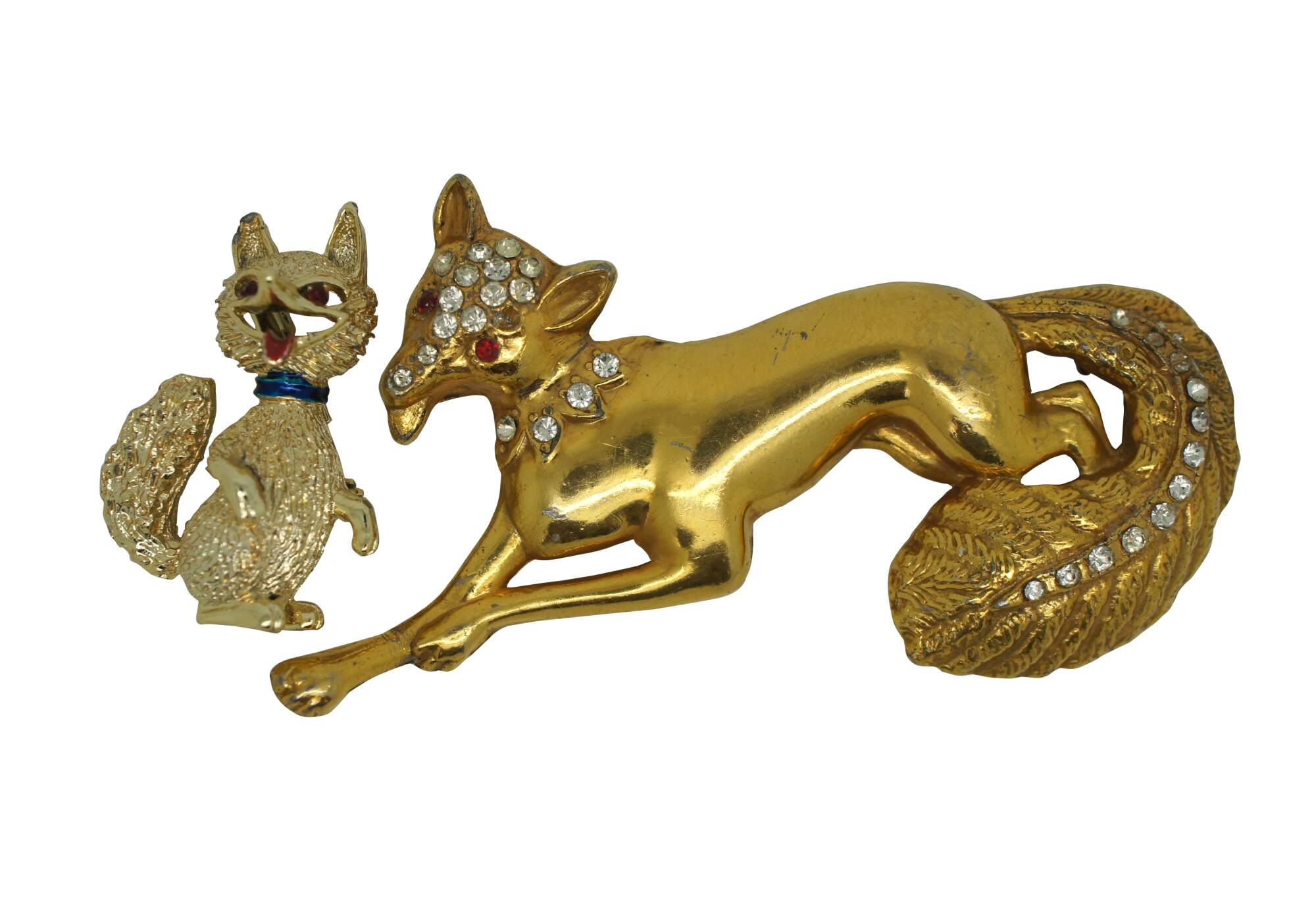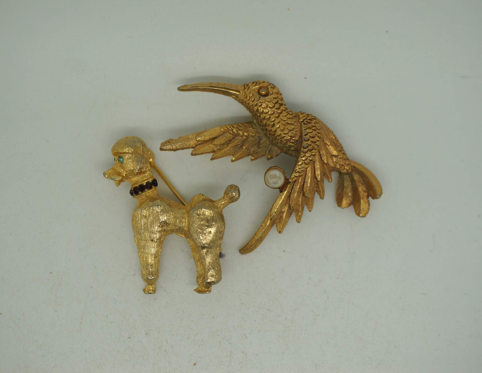 Lot of 18 mid to late 20th century animal themed pins / brooches in a variety of styles, embellished with rhinestones and enamel. Animals includes foxes, dogs, birds / sparrows, seagull, insects / beetles, butterfly, elephant, rooster, peacock, penguin, parrrot. Marks include Made in Germany, H. Bartlett 1973, BD Denmark, Gerrys.