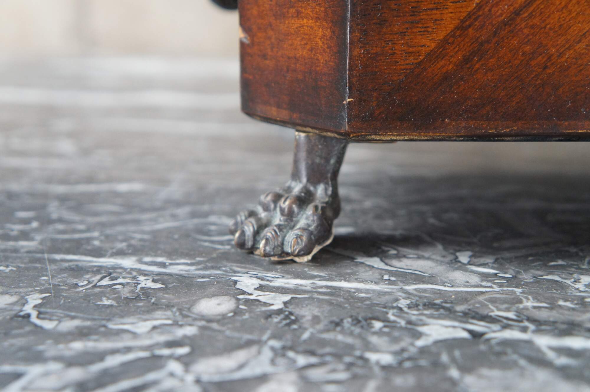 Theodore Alexander keepsake, trinket box or casket. Features a matchbook veneer mahogany frame with parquetry top and dove finial. Includes two handles along the sides and claw feet. The marquetry inlay top is inspired by the meticulous inlays from the Federal and Sheraton era. A nice display piece that will look great on any desk, table or bookcase.