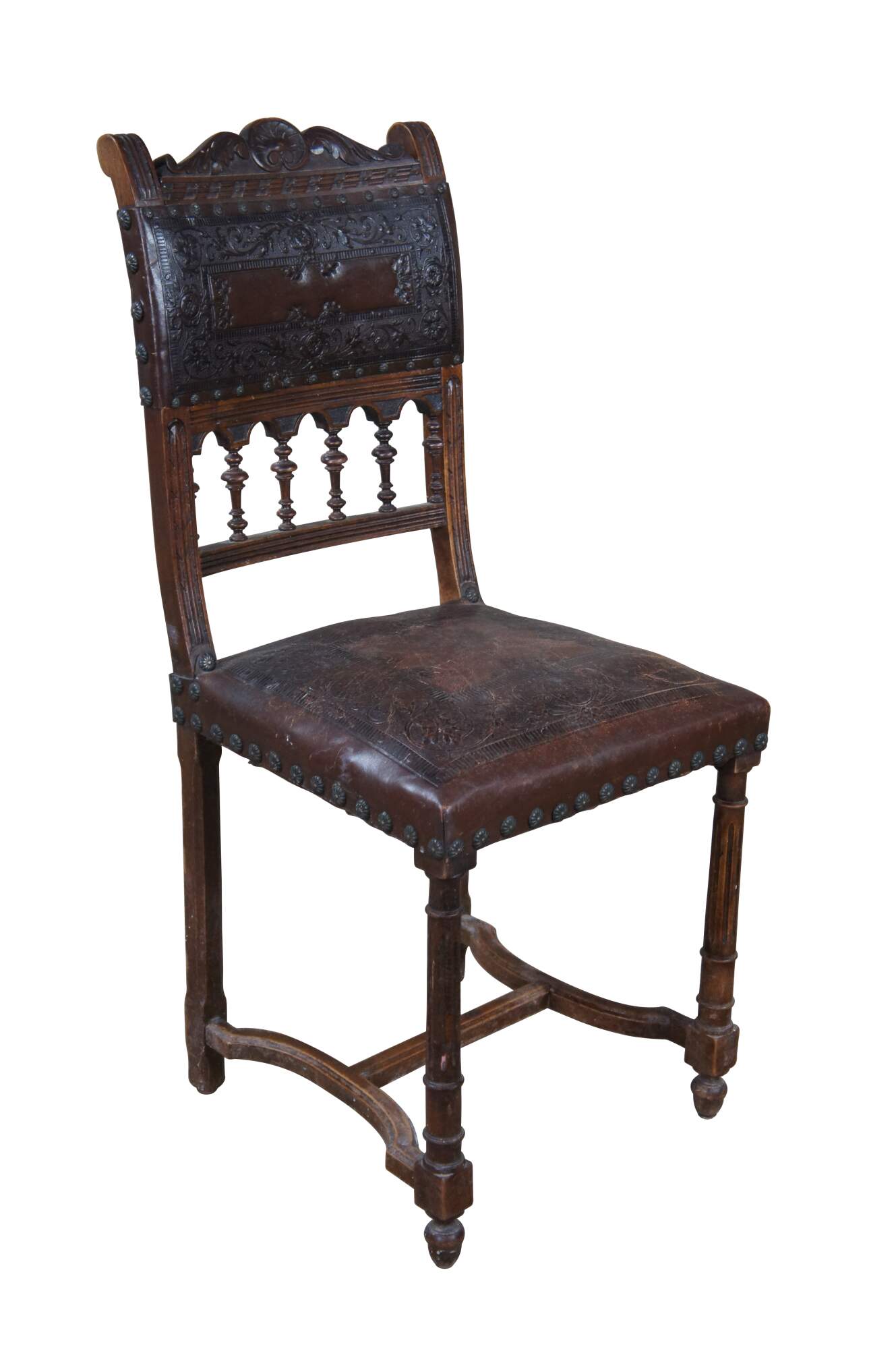 An antique set of 5 French Henry II style dining side chairs, circa 1880s. Features an oak frame with embossed leather seat and back with pierced lower arcade accented by ornate spindles. Each chair had nailhead trim and fluted legs leading to an H stretcher and turnip feet.