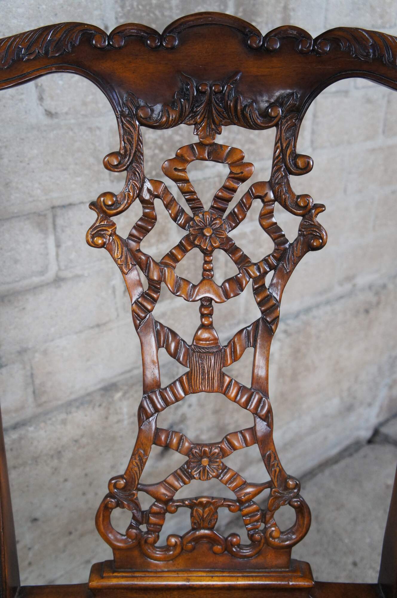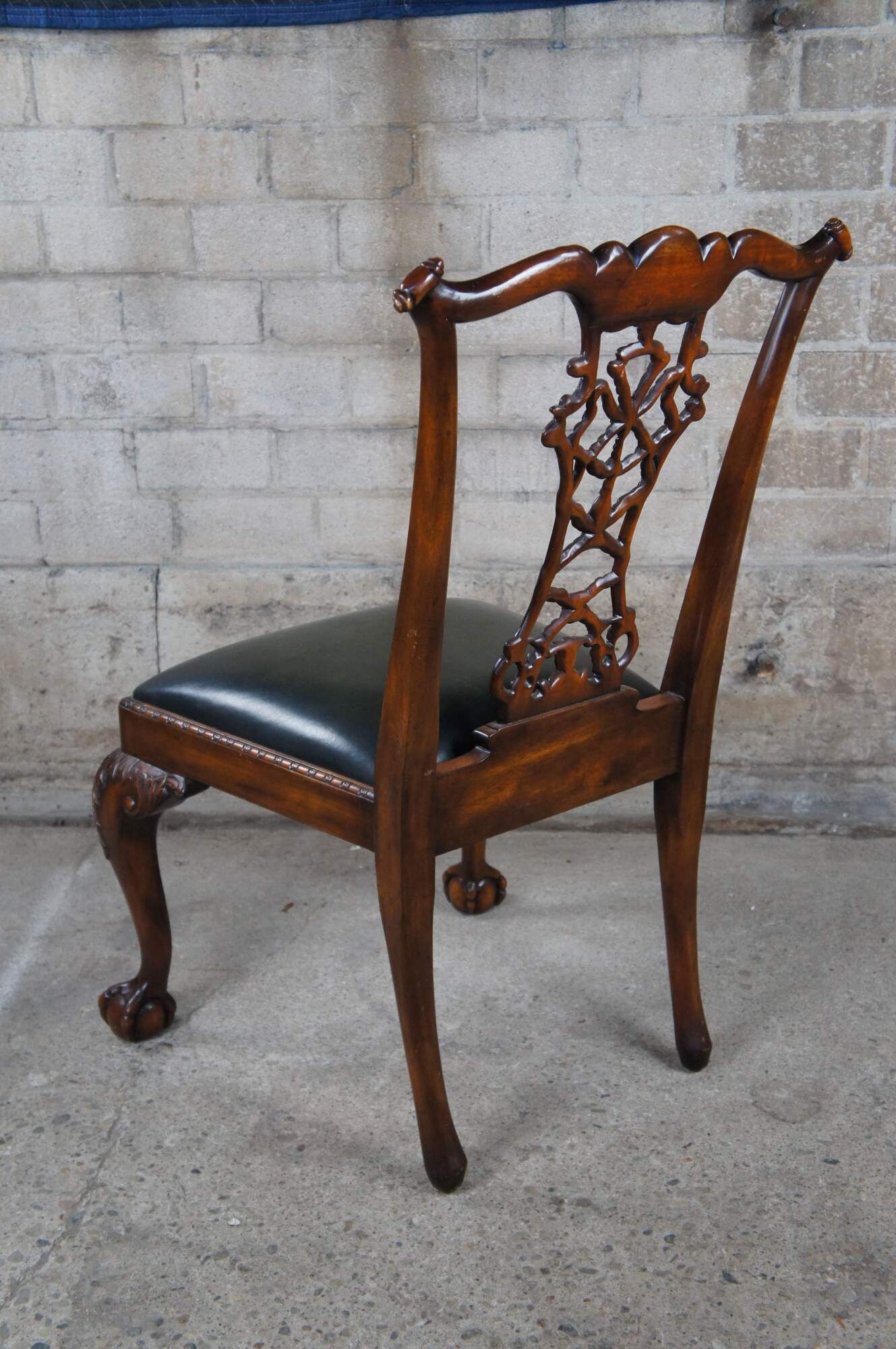Pair of Theodore Alexander Chippendale Dining Side Chairs. Features a serpentine crest rail with cared ears over an ornate pierced and ribboned back splat. Each chair has a green leather seat surrounded by beaded accents over cabriole legs with canthus carved knees leading to ball and claw feet.