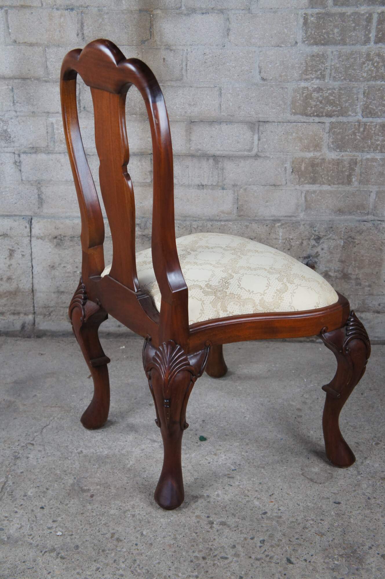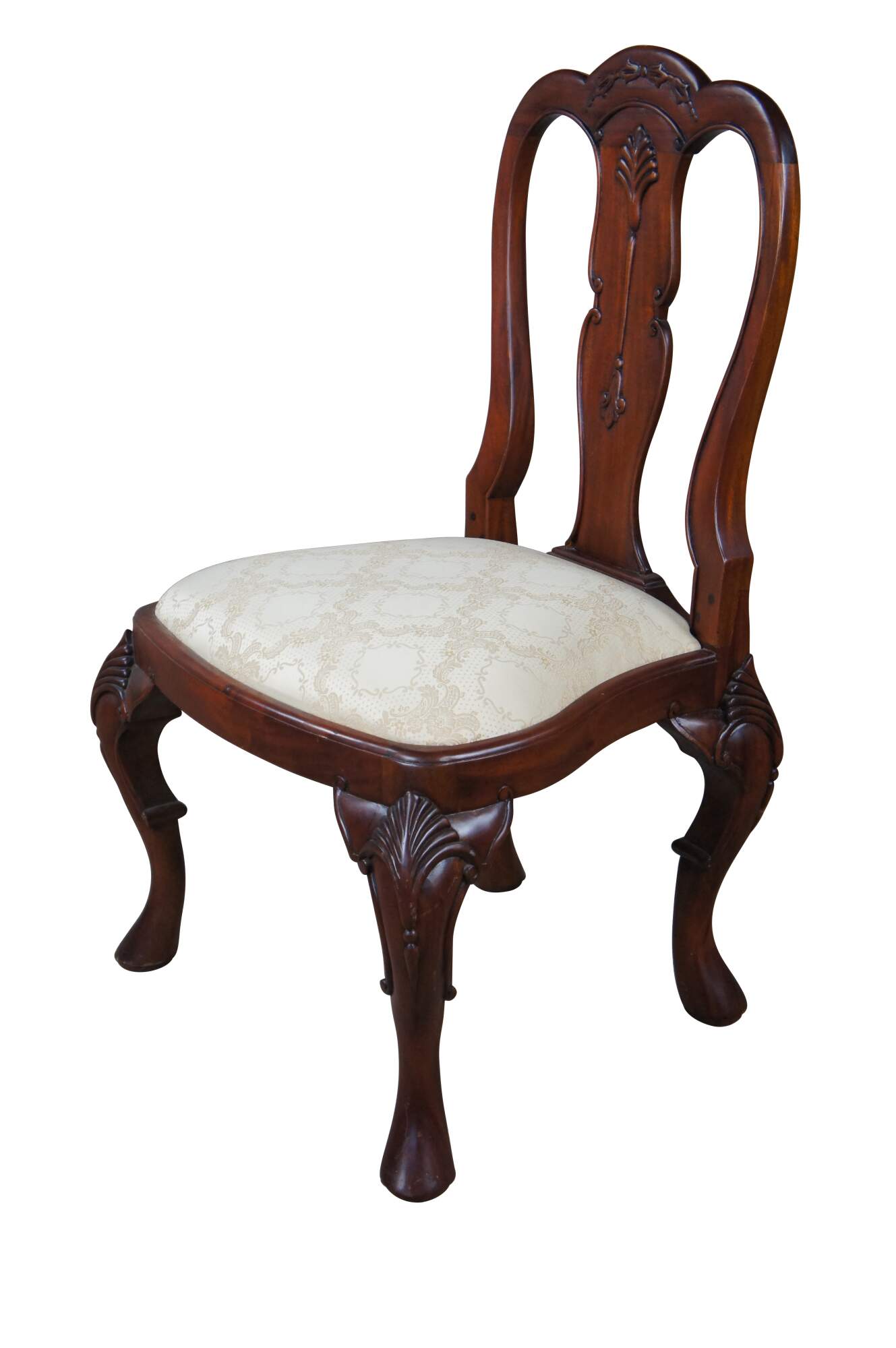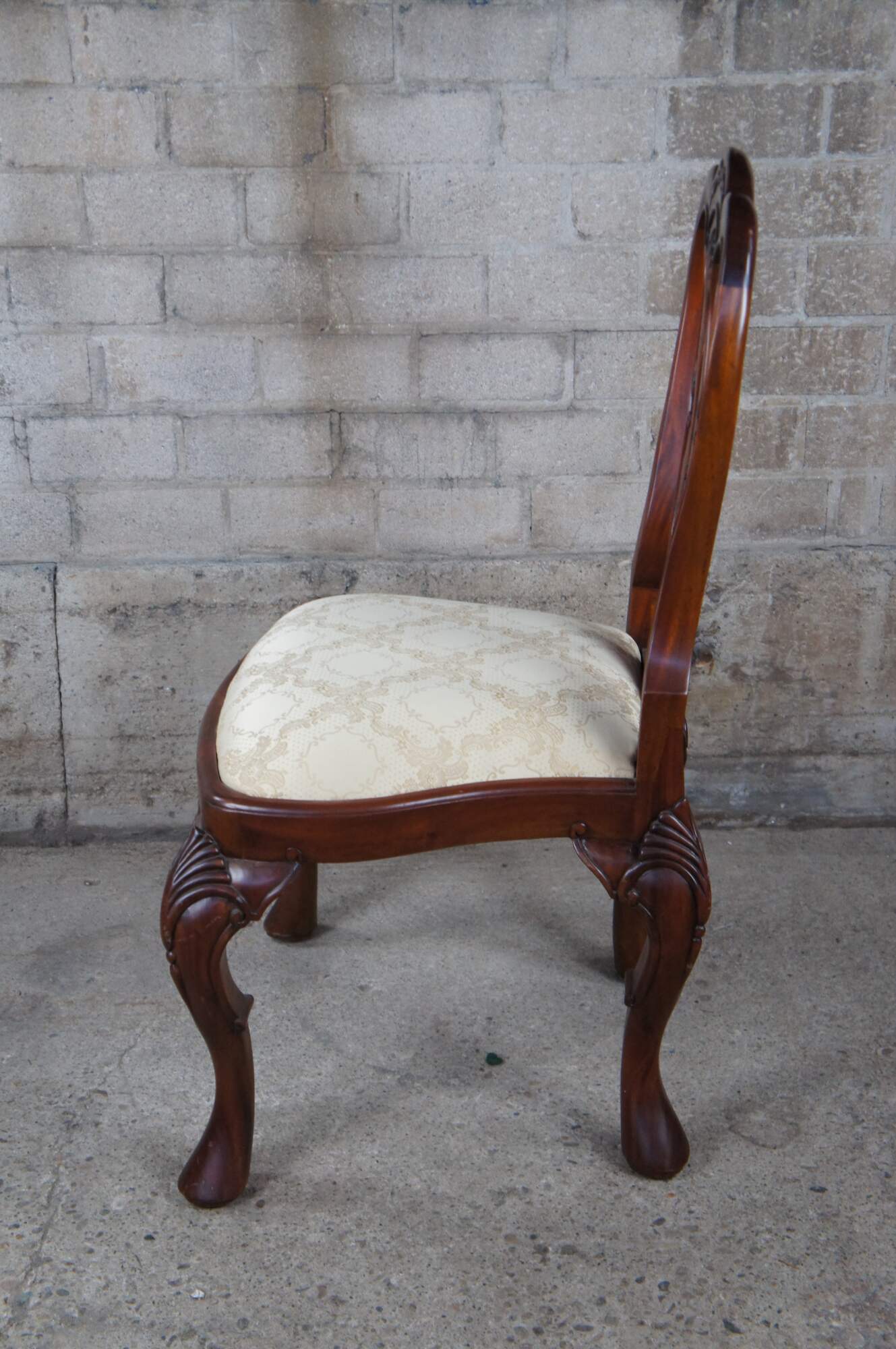 An ornately carved mahogany Georgian style side chair. Features a sarved back splat, silk brocade seat and pronounced cabriole legs with scalloped knees.
