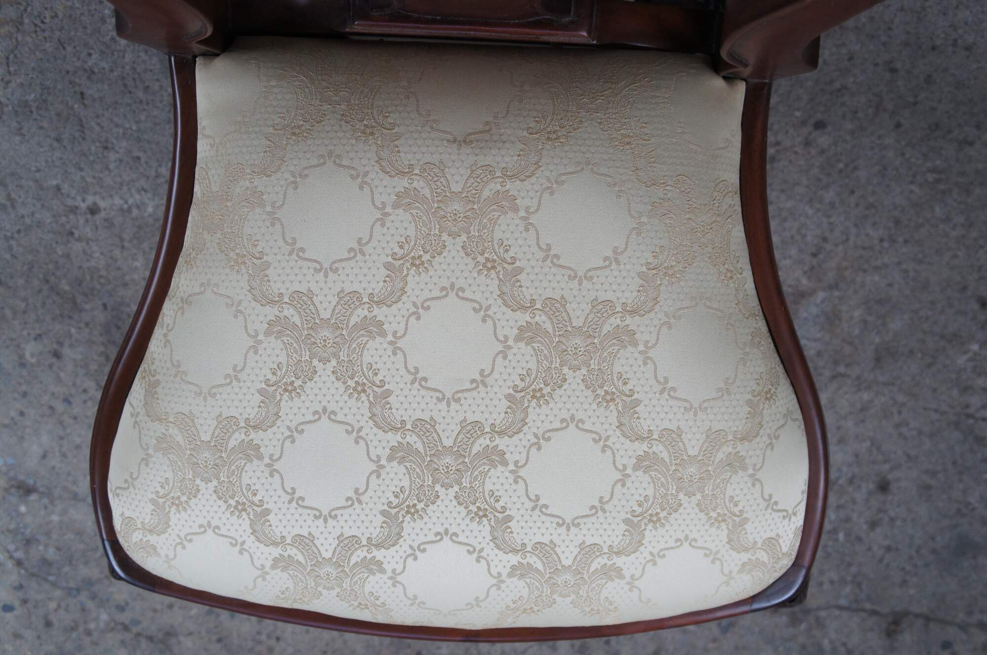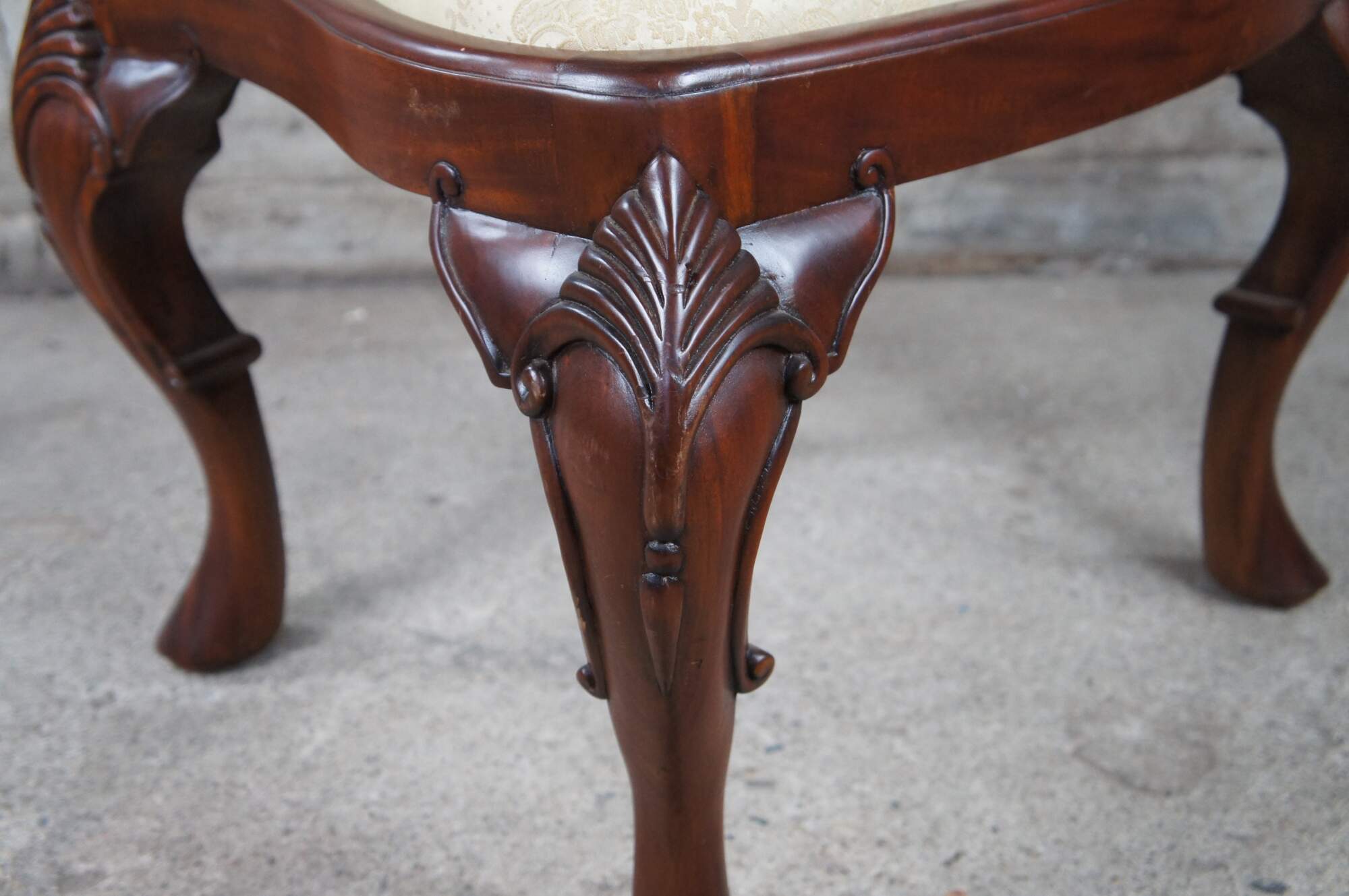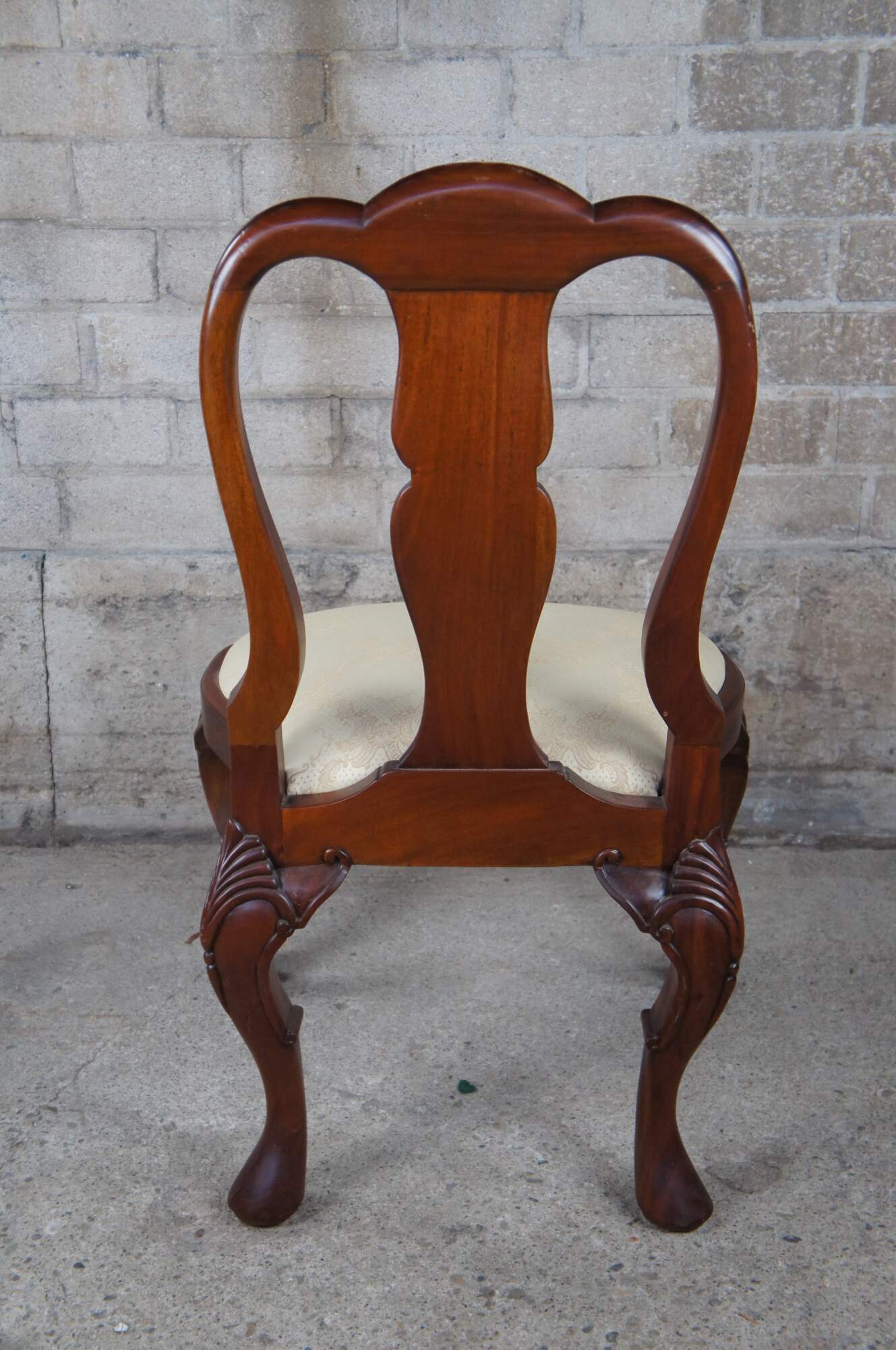 An ornately carved mahogany Georgian style side chair. Features a sarved back splat, silk brocade seat and pronounced cabriole legs with scalloped knees.