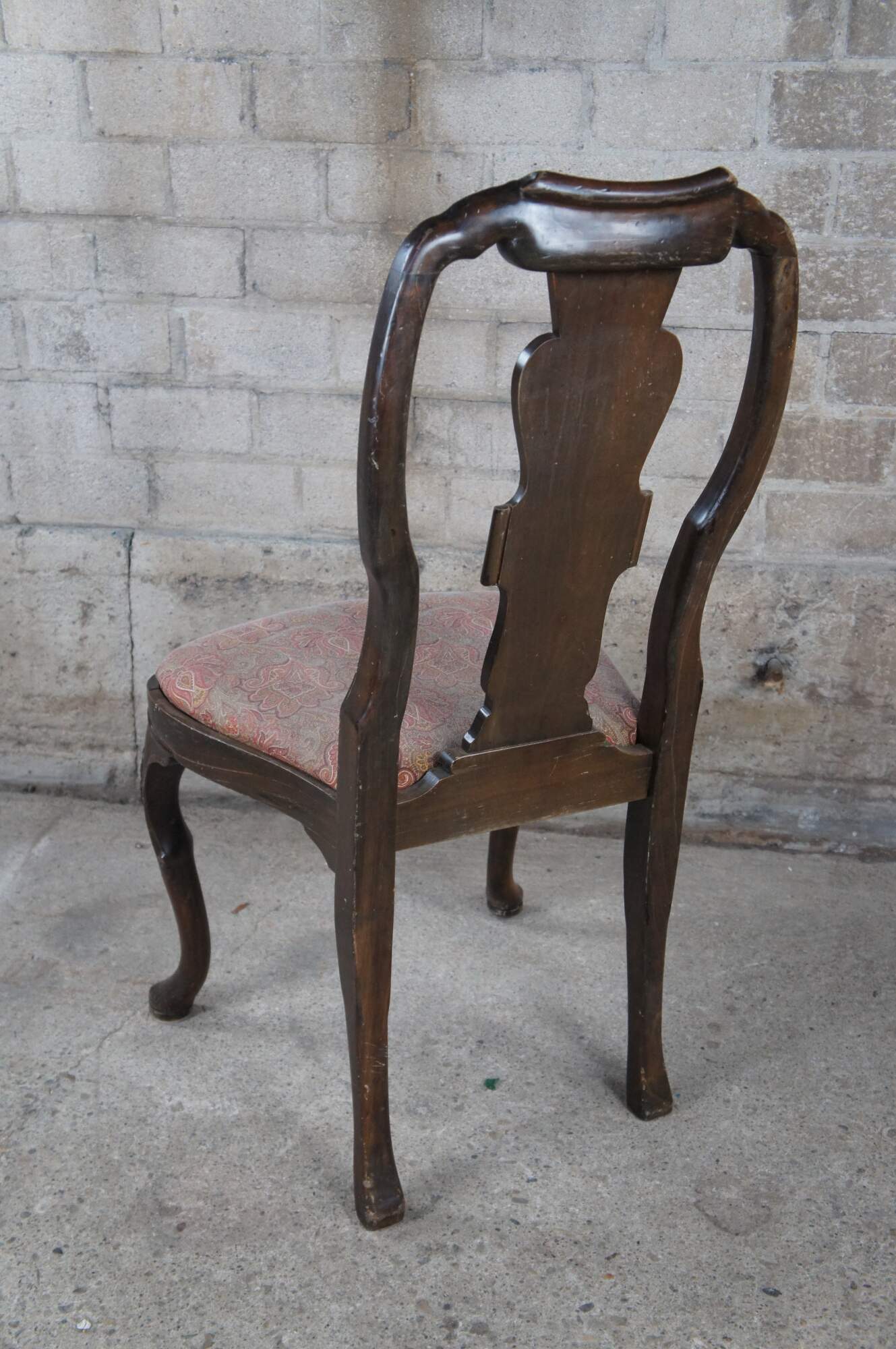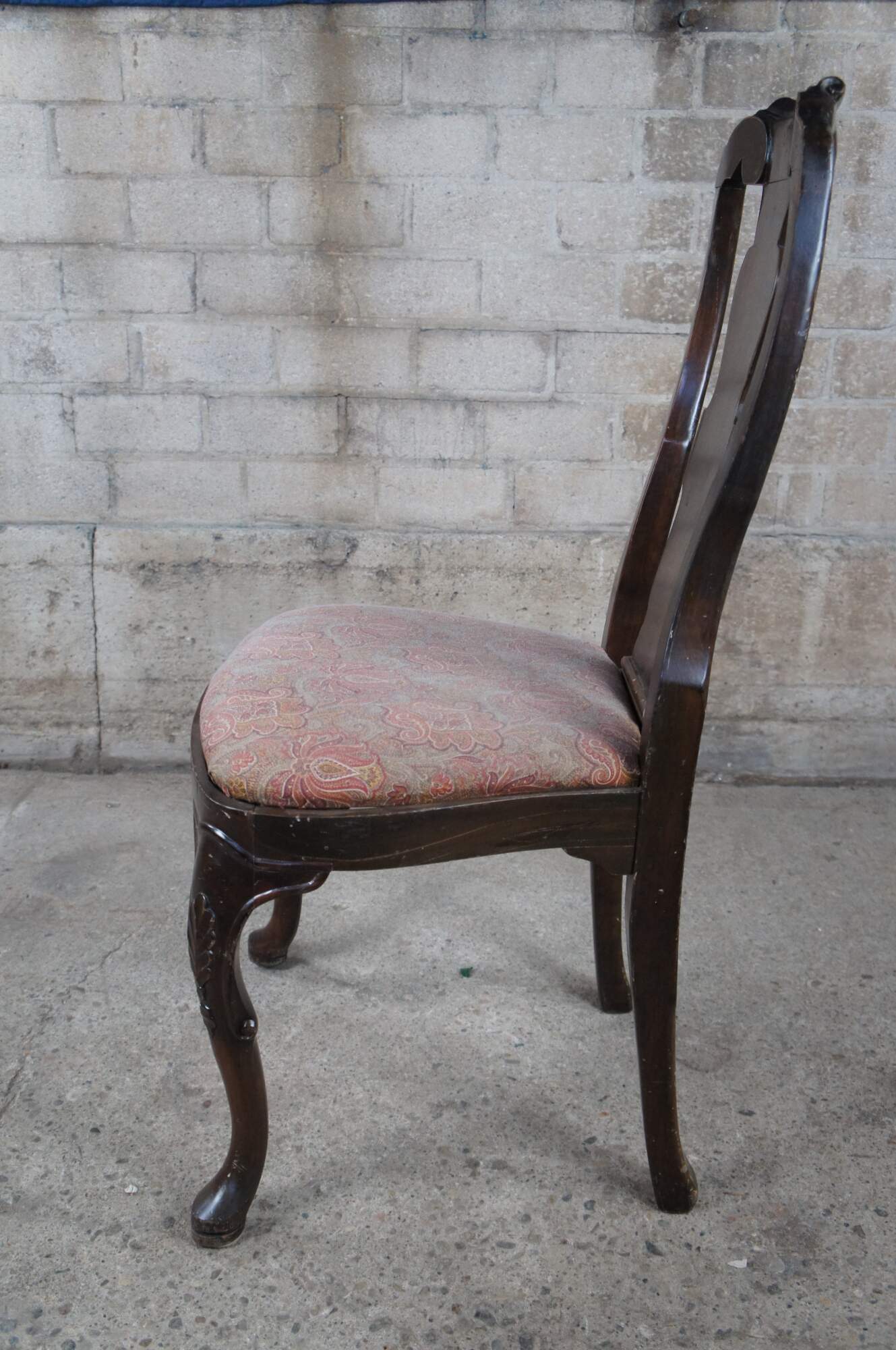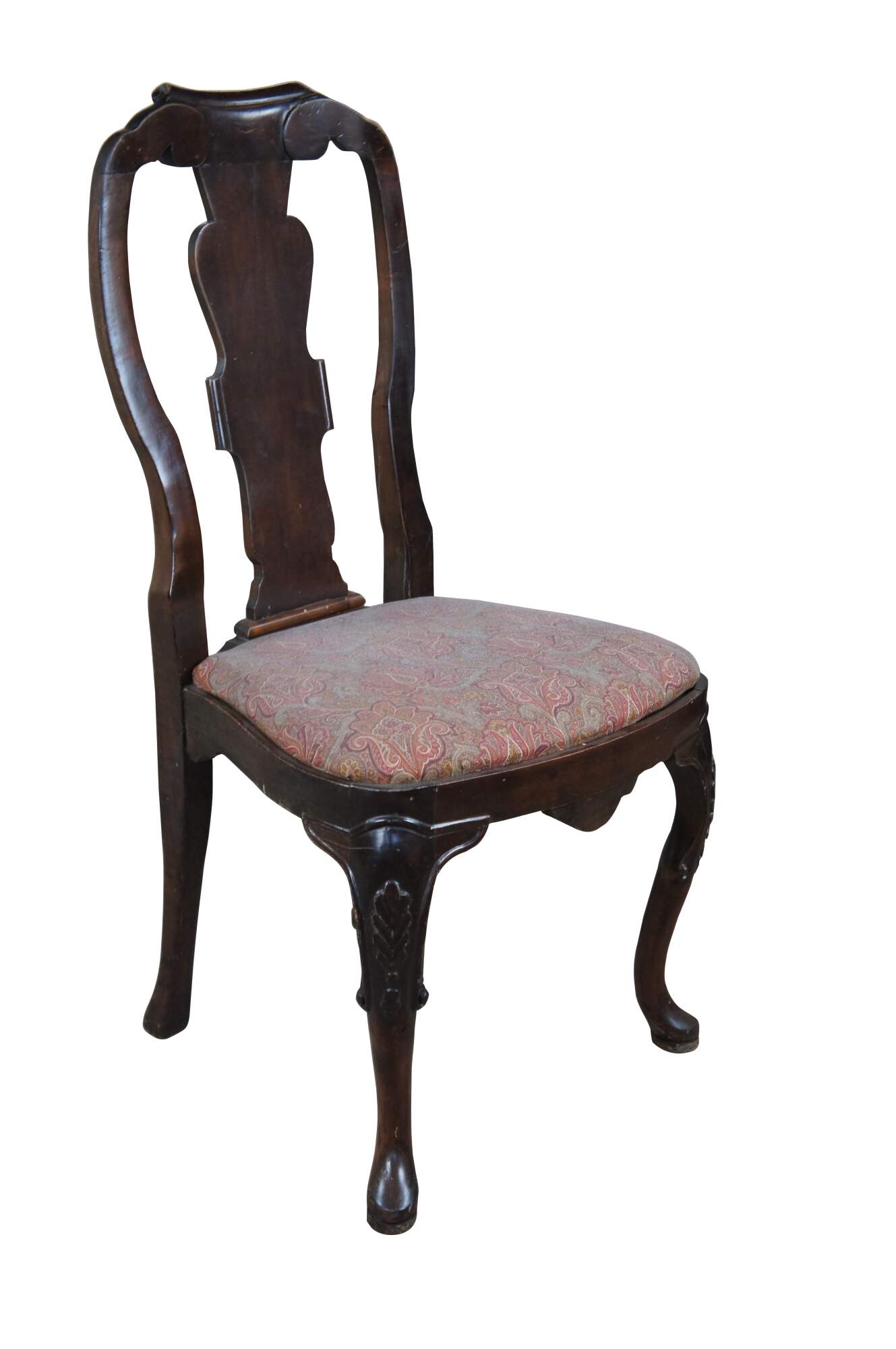 Italian side chair, circa last quarter 20th century. Featured an aged appearance in Queen Anne styling with long slender back featuring scrolled accents. Seat is upholstered with paisley design over cabriole legs with carved knees.
