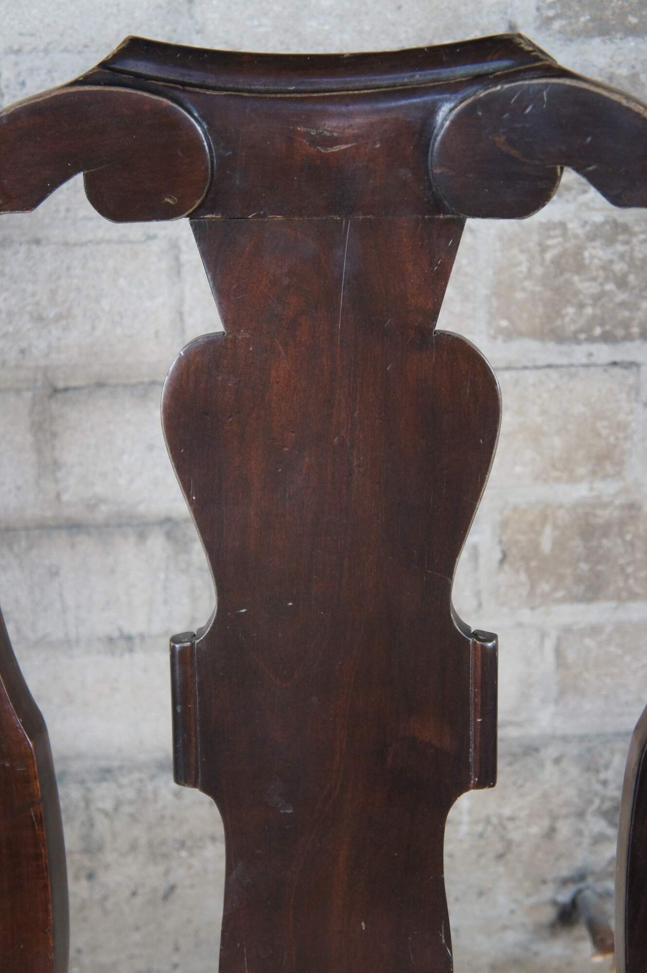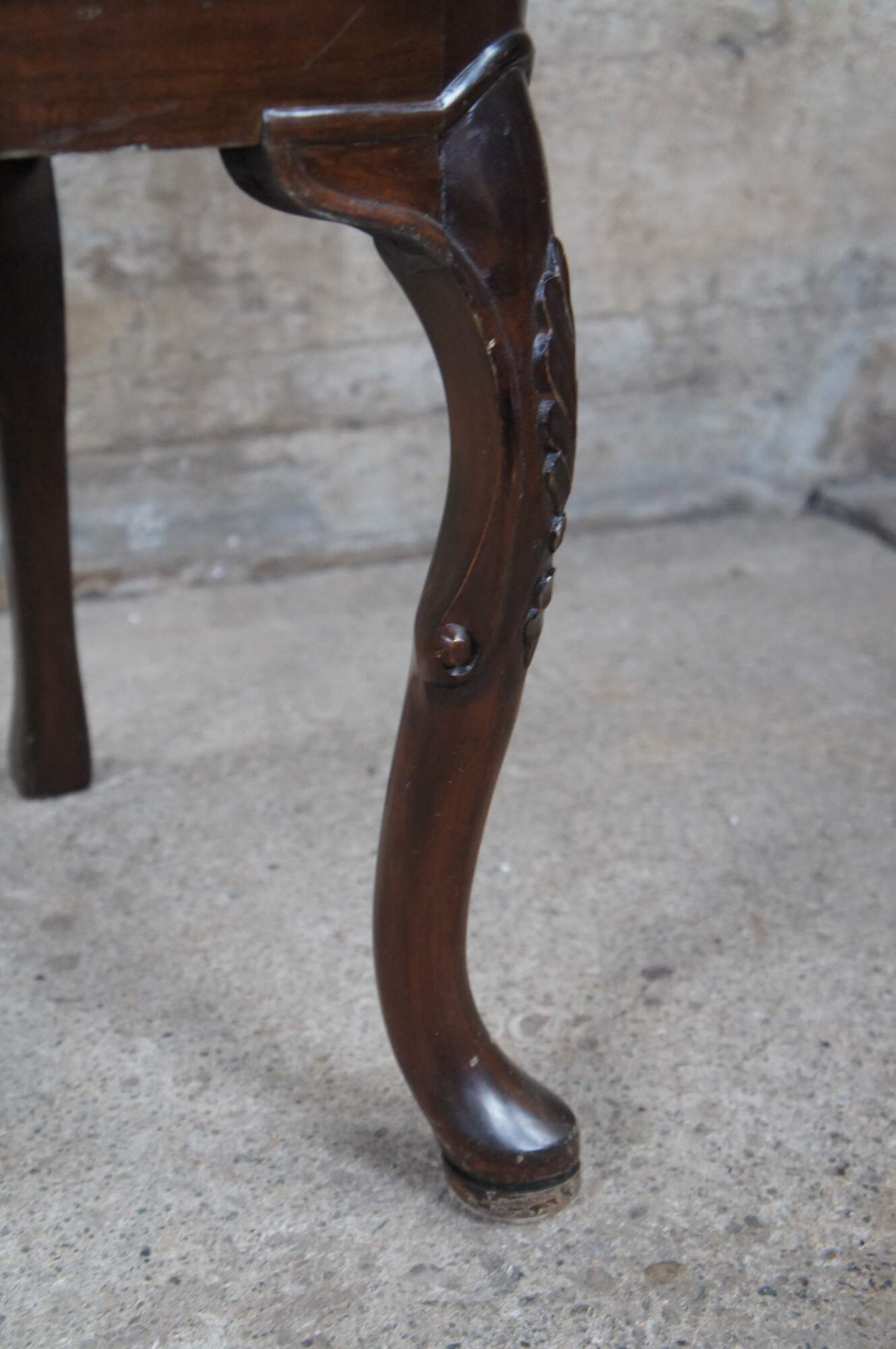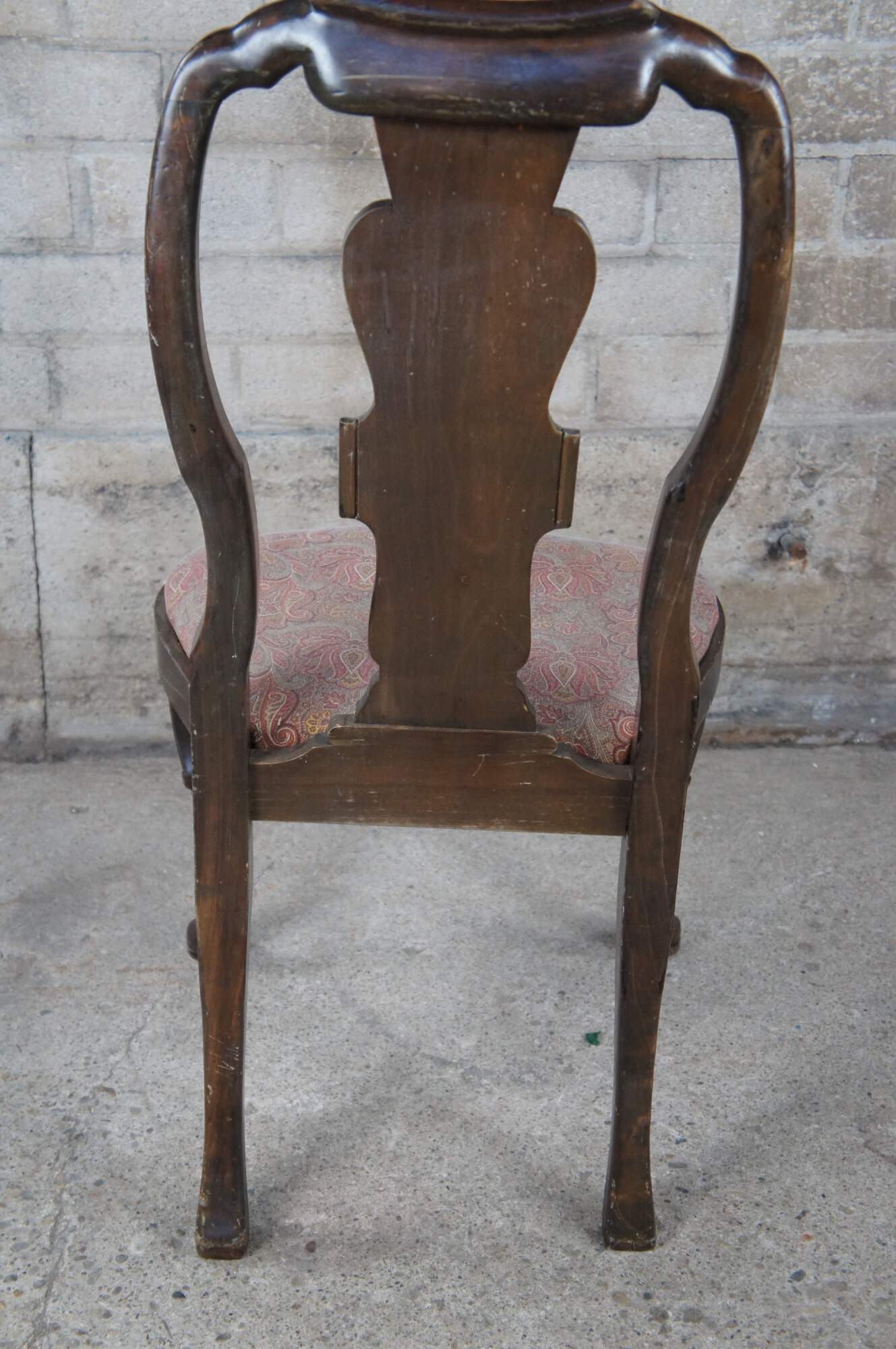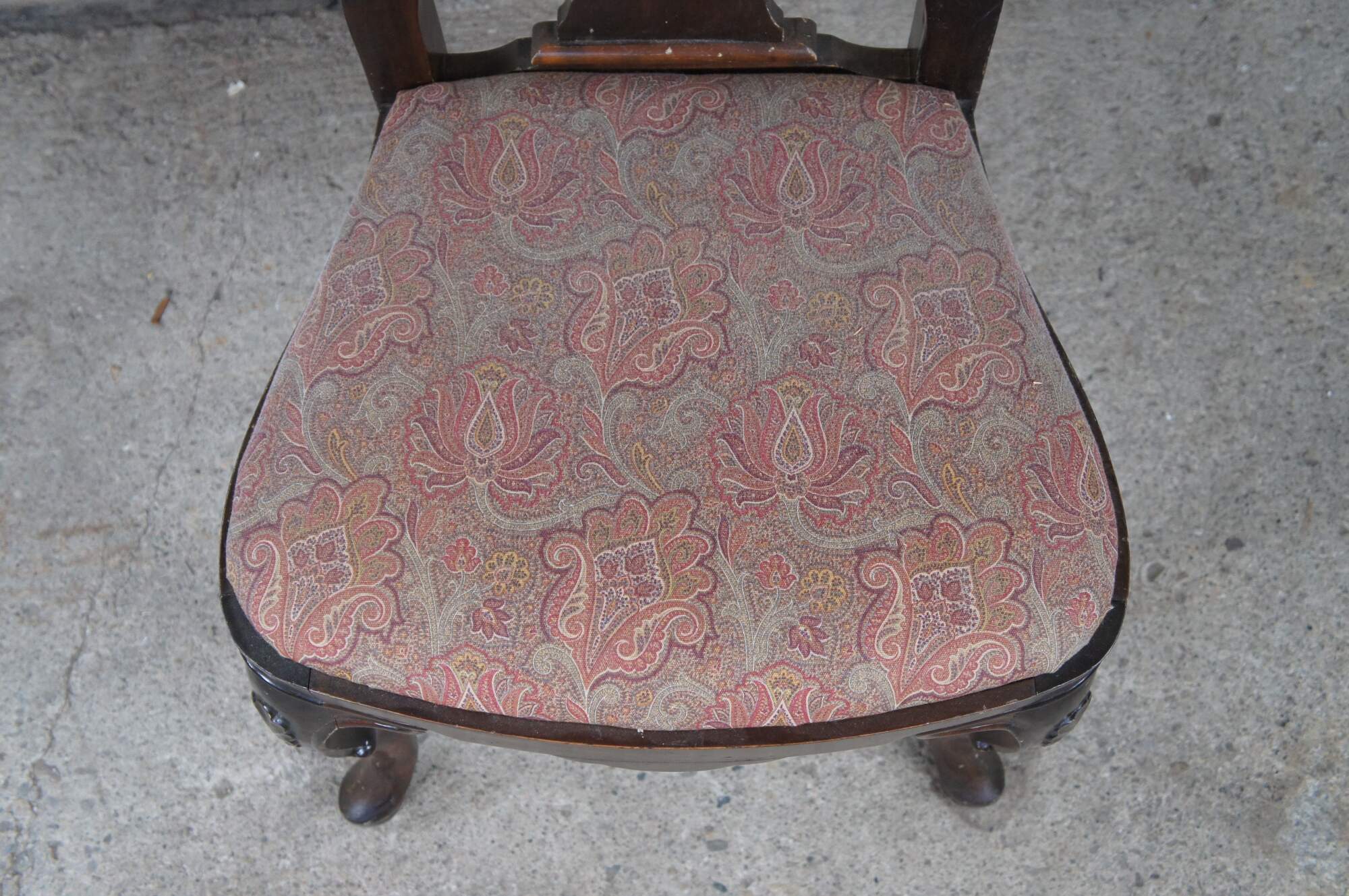 Italian side chair, circa last quarter 20th century. Featured an aged appearance in Queen Anne styling with long slender back featuring scrolled accents. Seat is upholstered with paisley design over cabriole legs with carved knees.