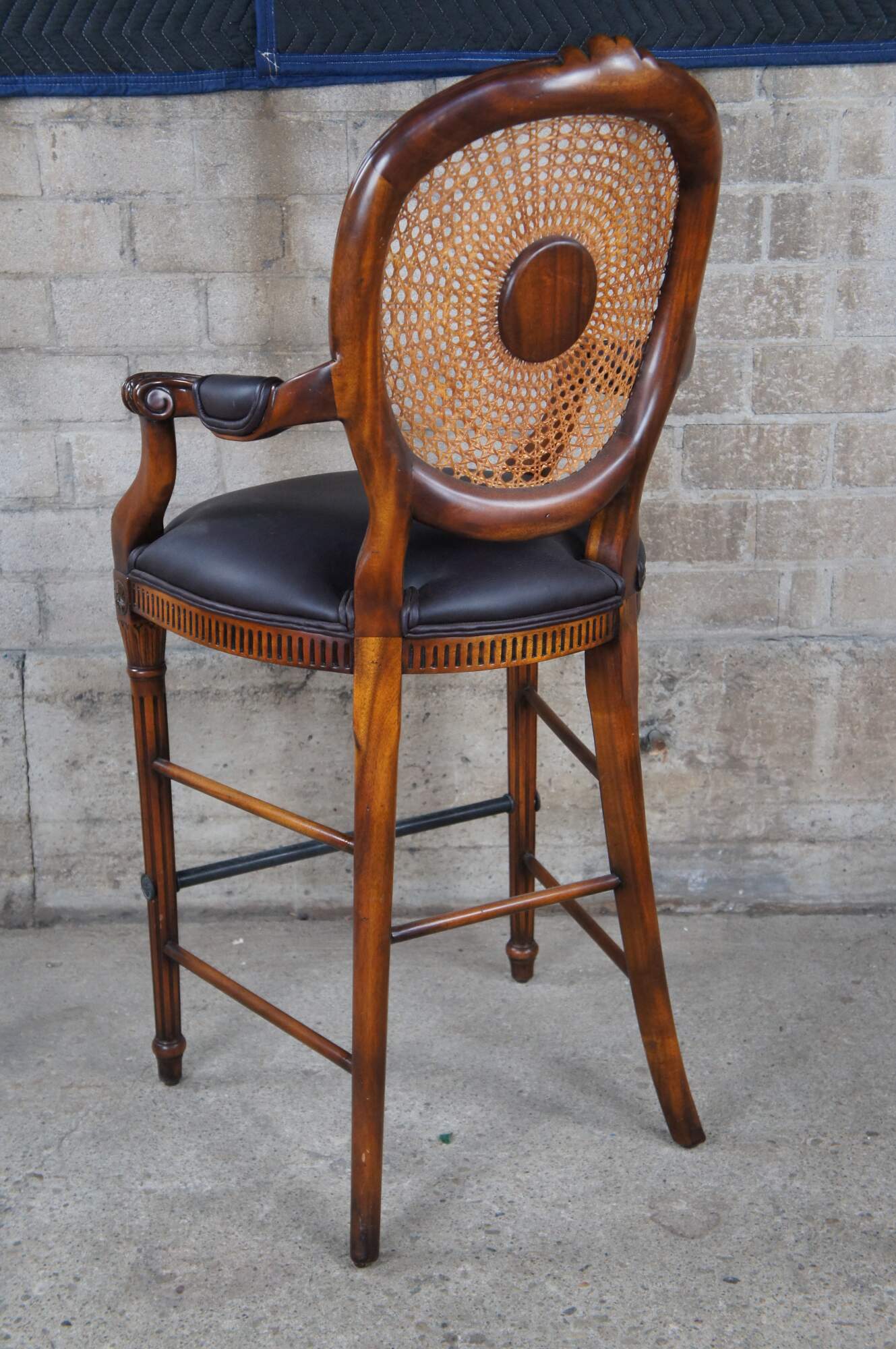 Theodore Alexander French Louis XV Bar Stool. Made from mahogany with cane back, padded arms, brown leather seat and turned fluted legs leading to foot rest and turnip feet. The chair is carved with traditional french medallions, fluting and foliate detail.
