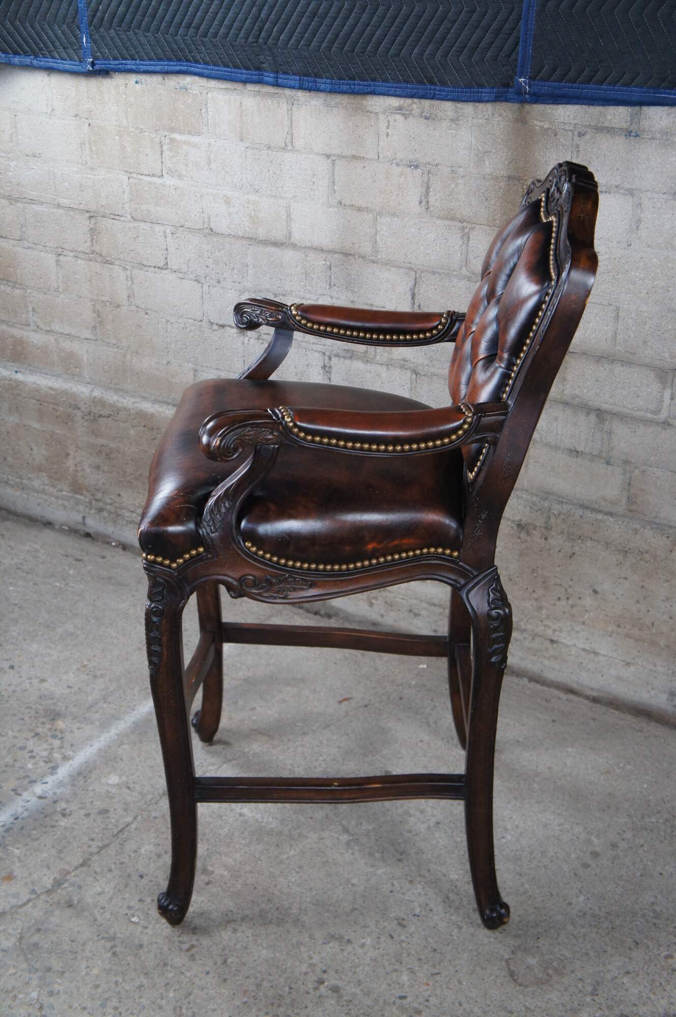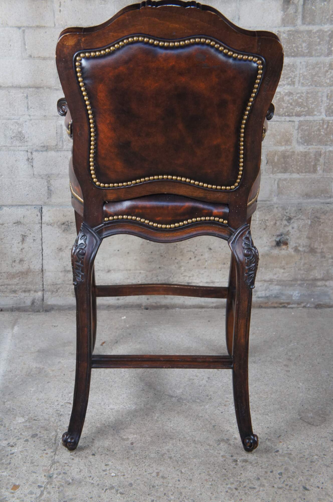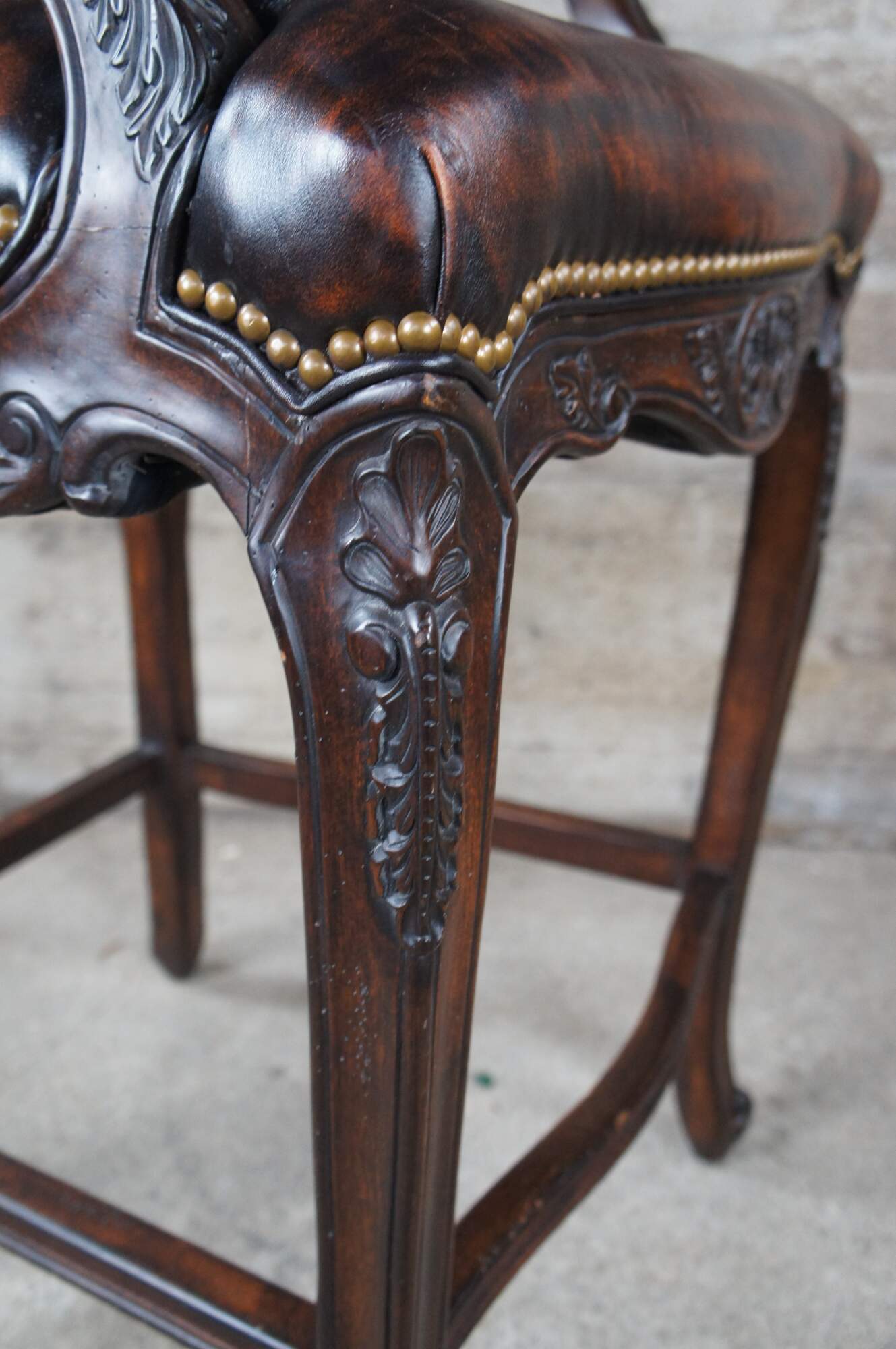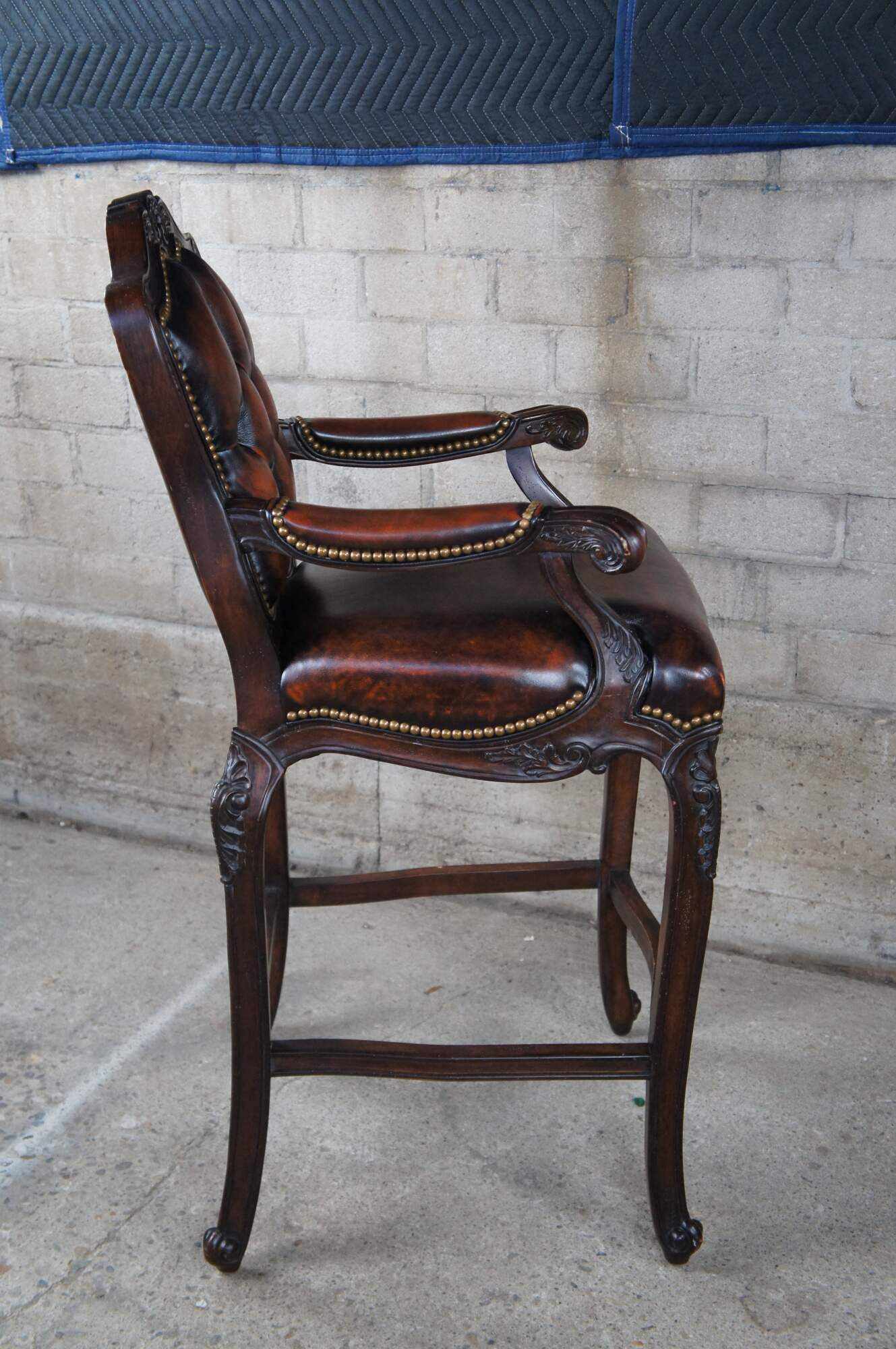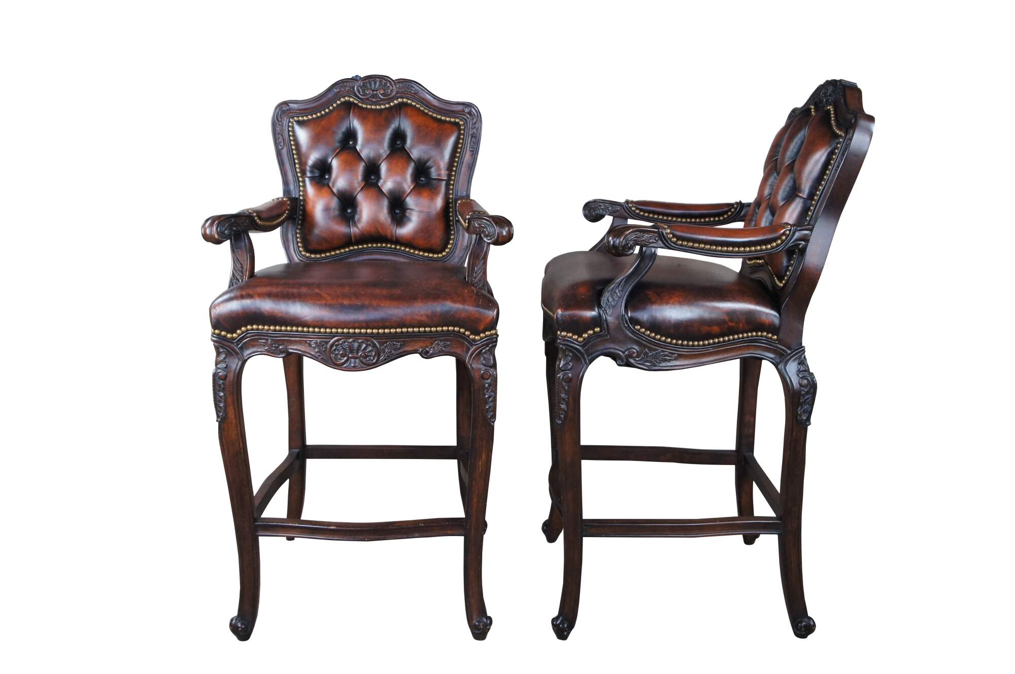 Pair of Hancock & Moore French Country / Louis XV style bar stools. Features a carved and scalloped frame with brown leather seats and tufted back. Accented by brass nail head trim over long cabriole legs with scrolled feet. MSRP $4,000+/per