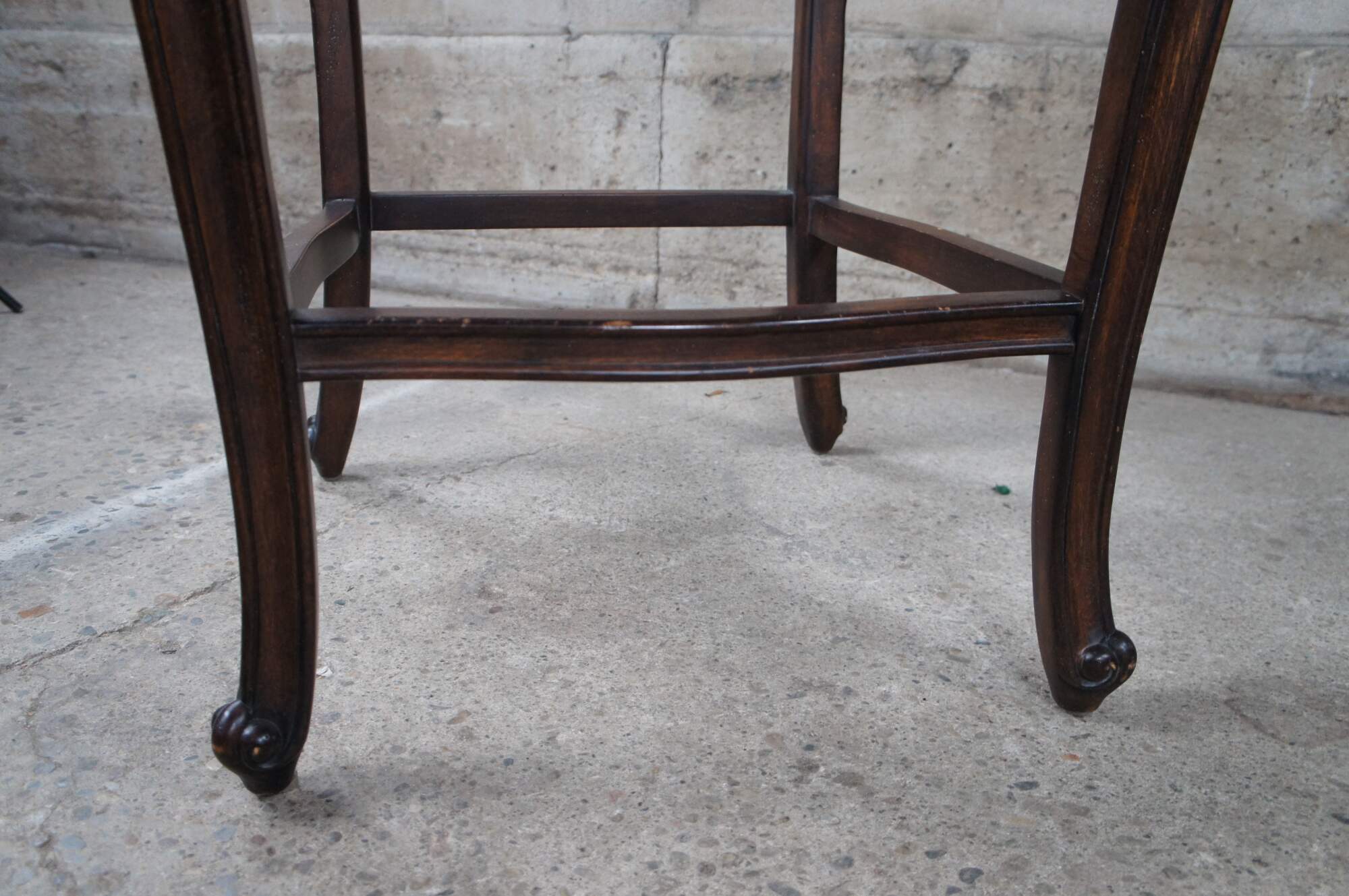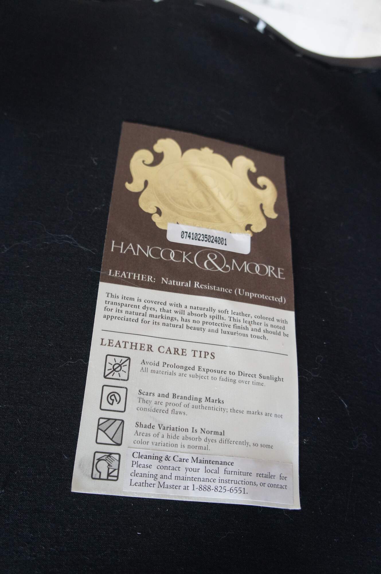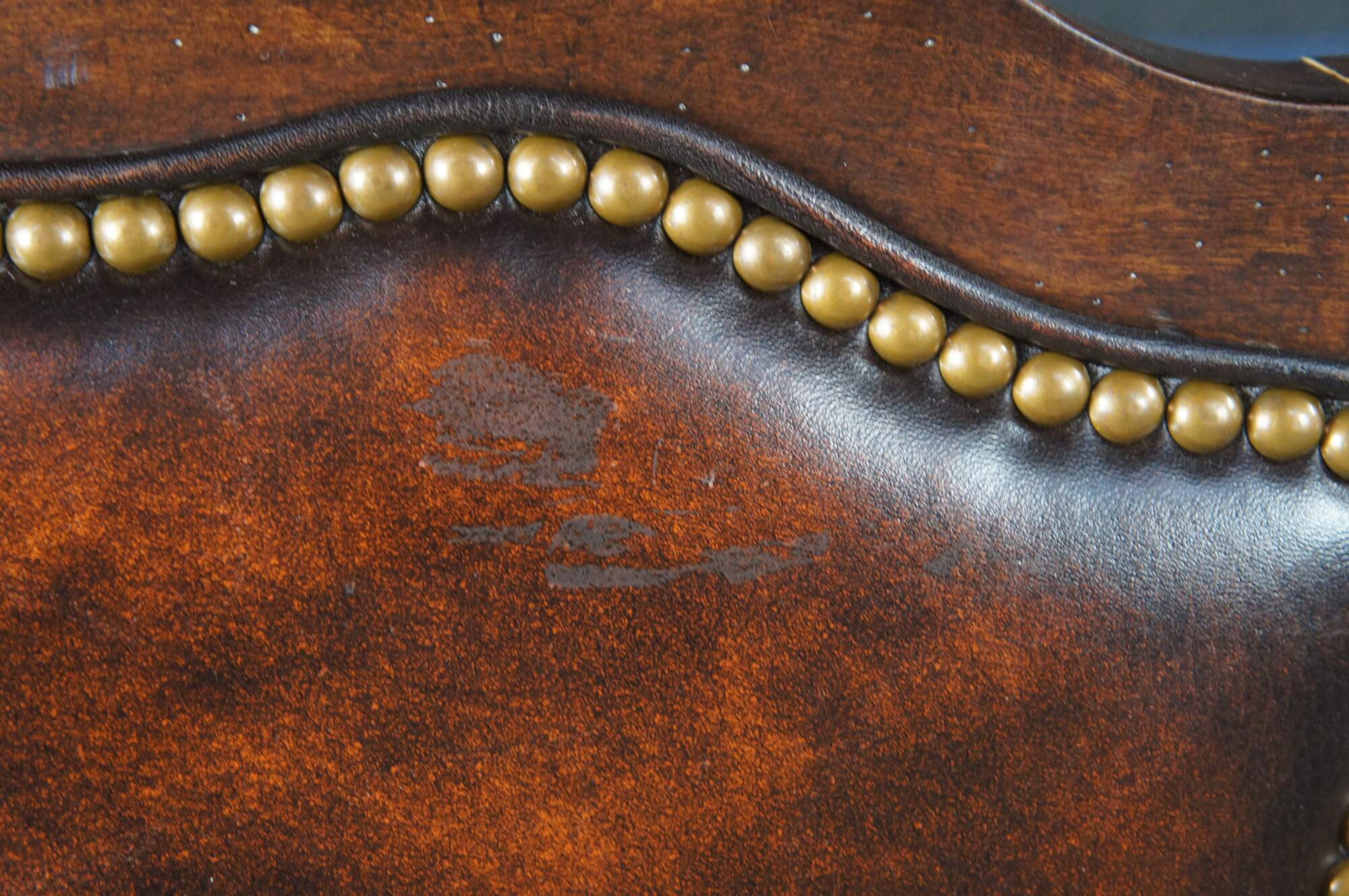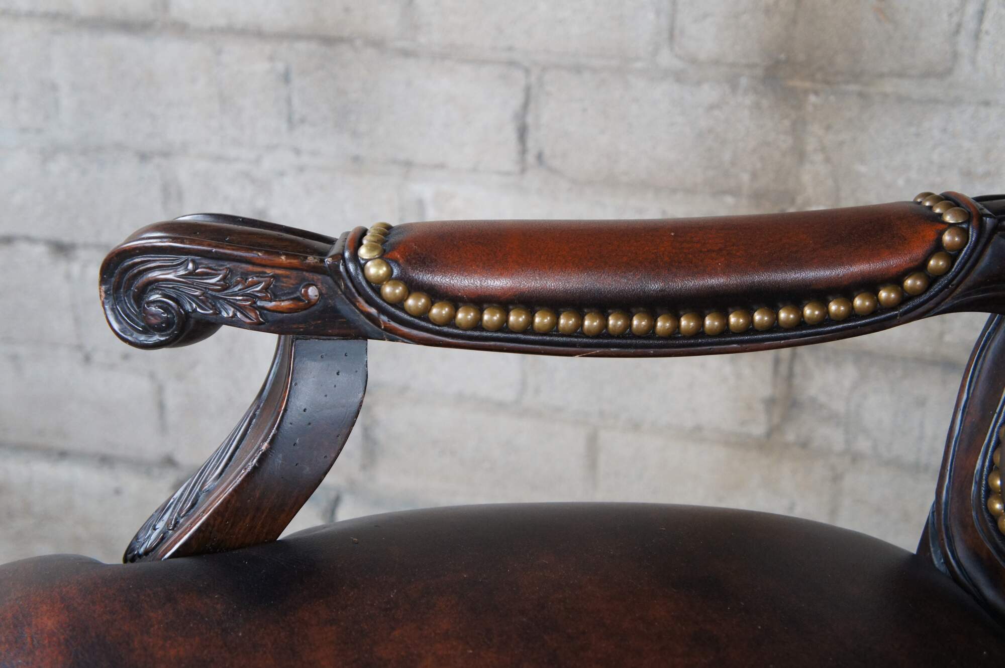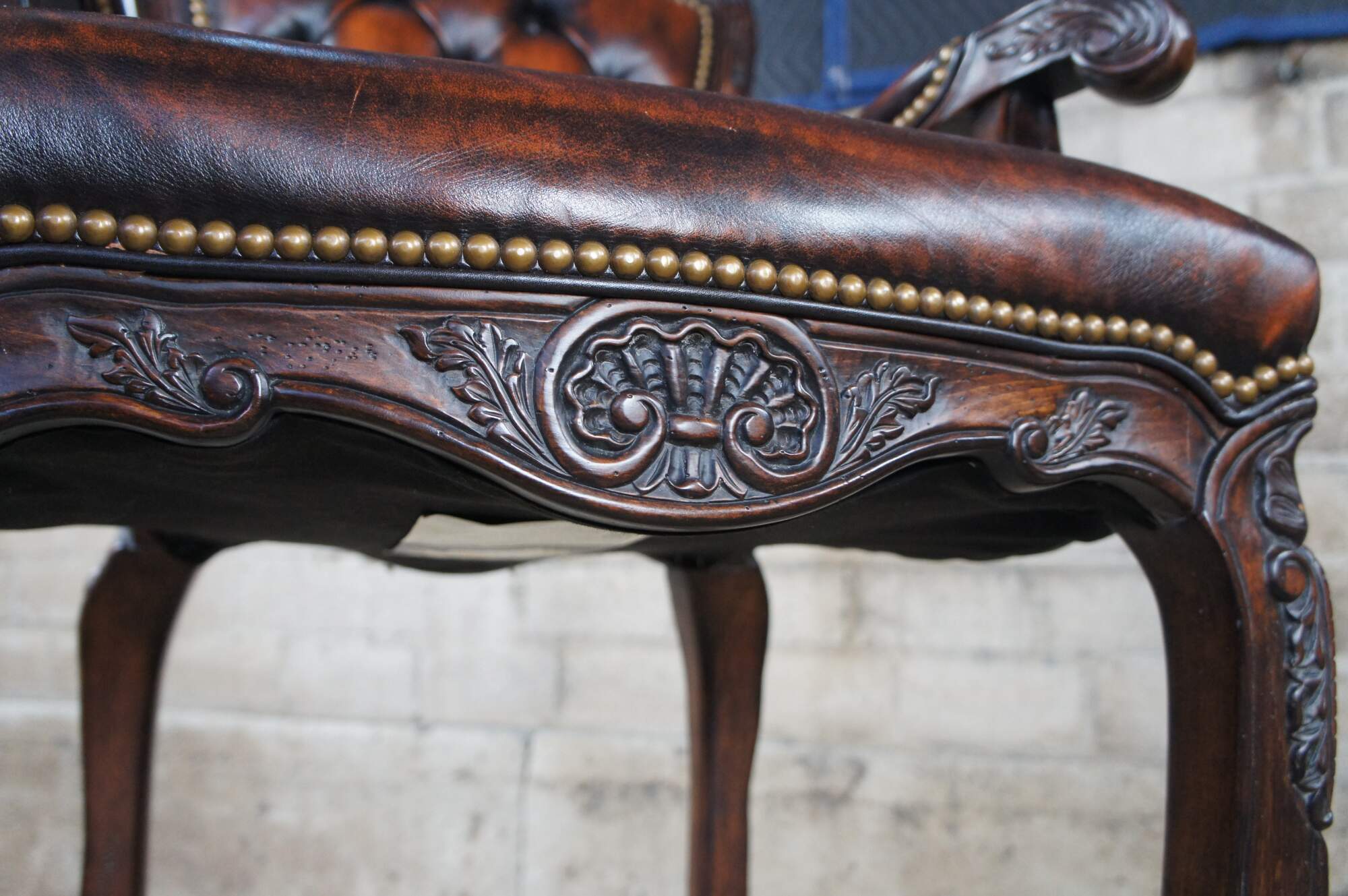 Pair of Hancock & Moore French Country / Louis XV style bar stools. Features a carved and scalloped frame with brown leather seats and tufted back. Accented by brass nail head trim over long cabriole legs with scrolled feet. MSRP $4,000+/per