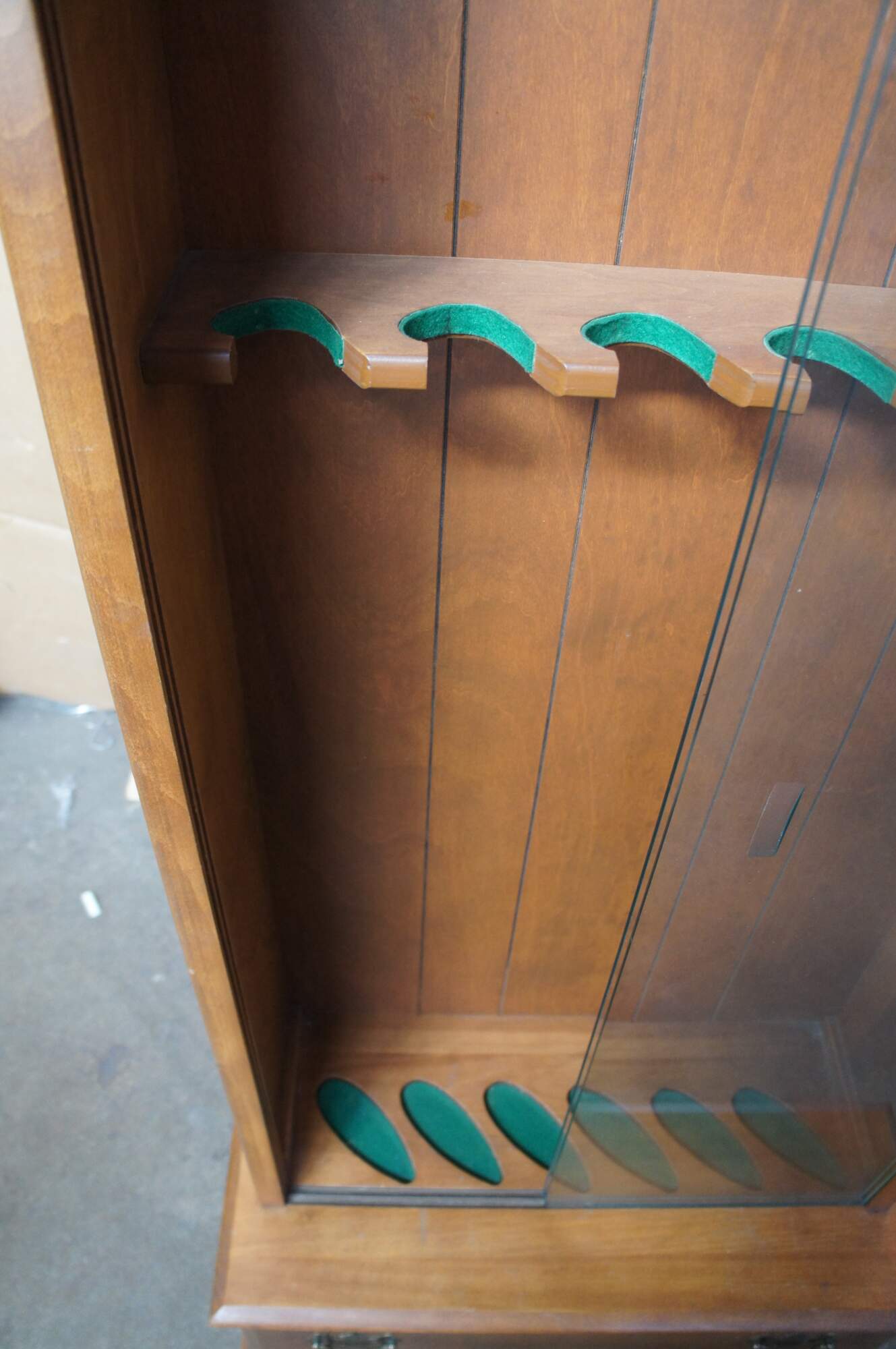 American Country maple gun cabinet. Features a step-back frame with glass front and space for six rifles. Lower section has a drawer for ammunition / supplies. Drawers is fitted with two colonial brass batwing drawer pulls.