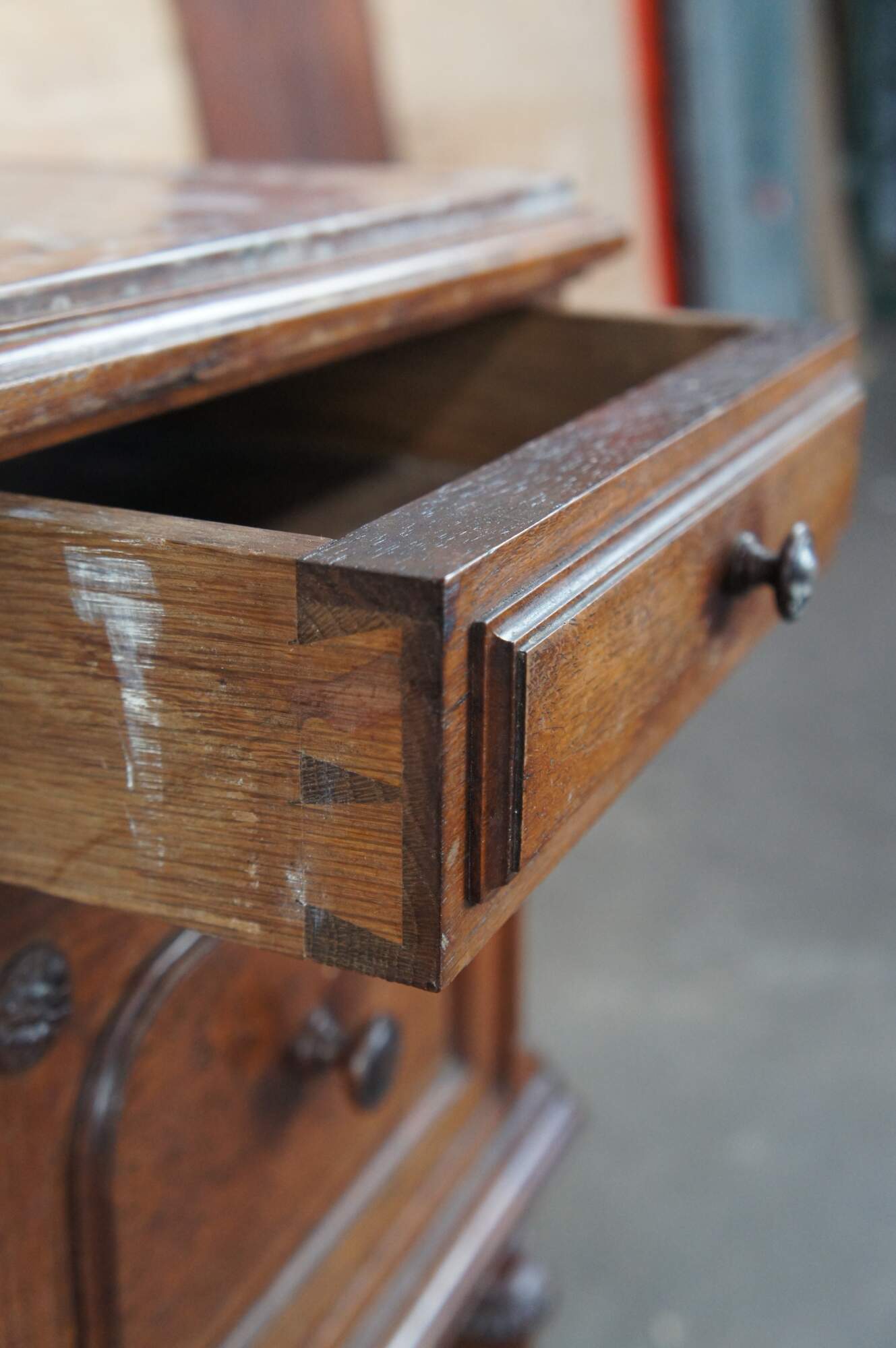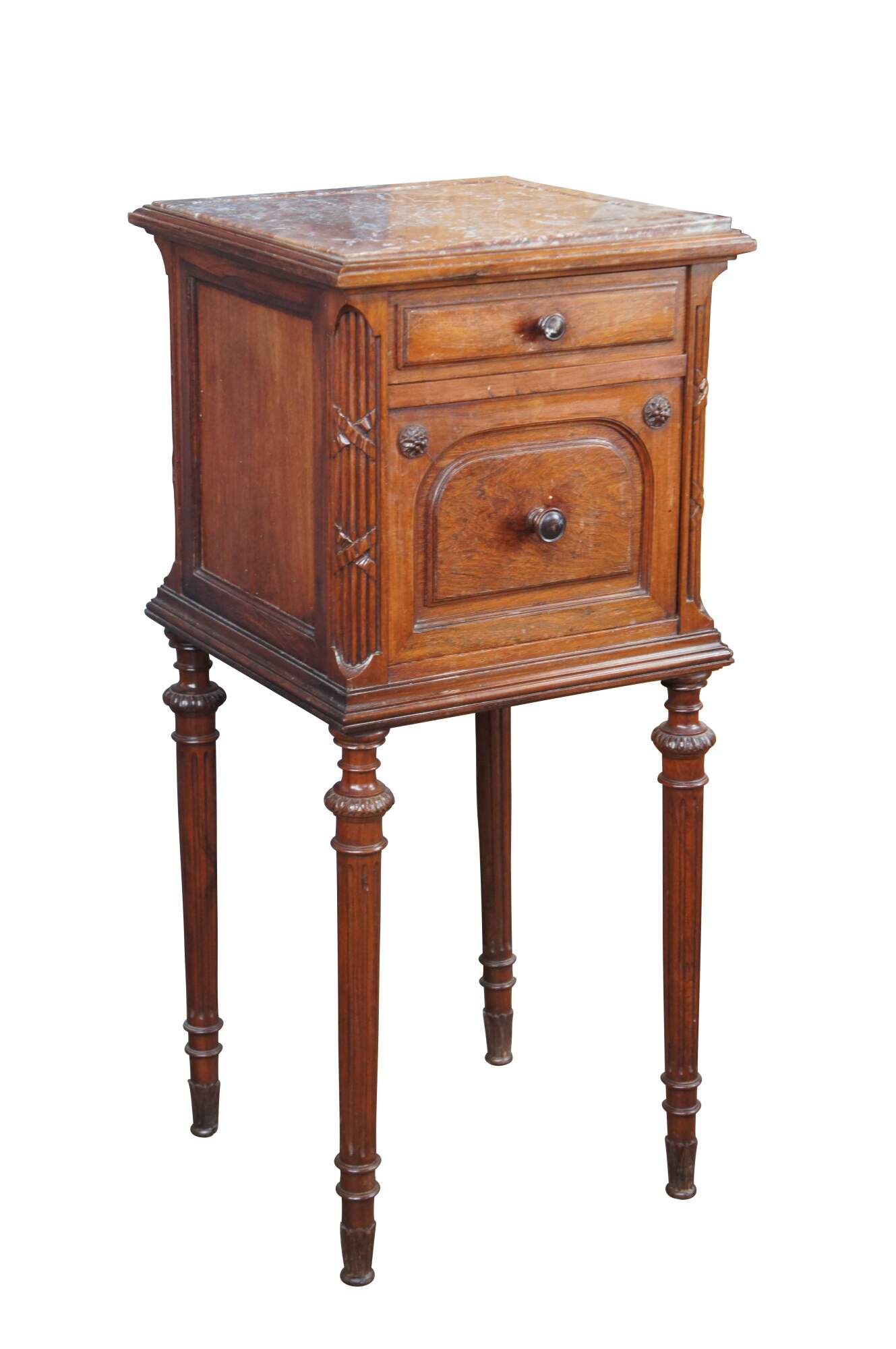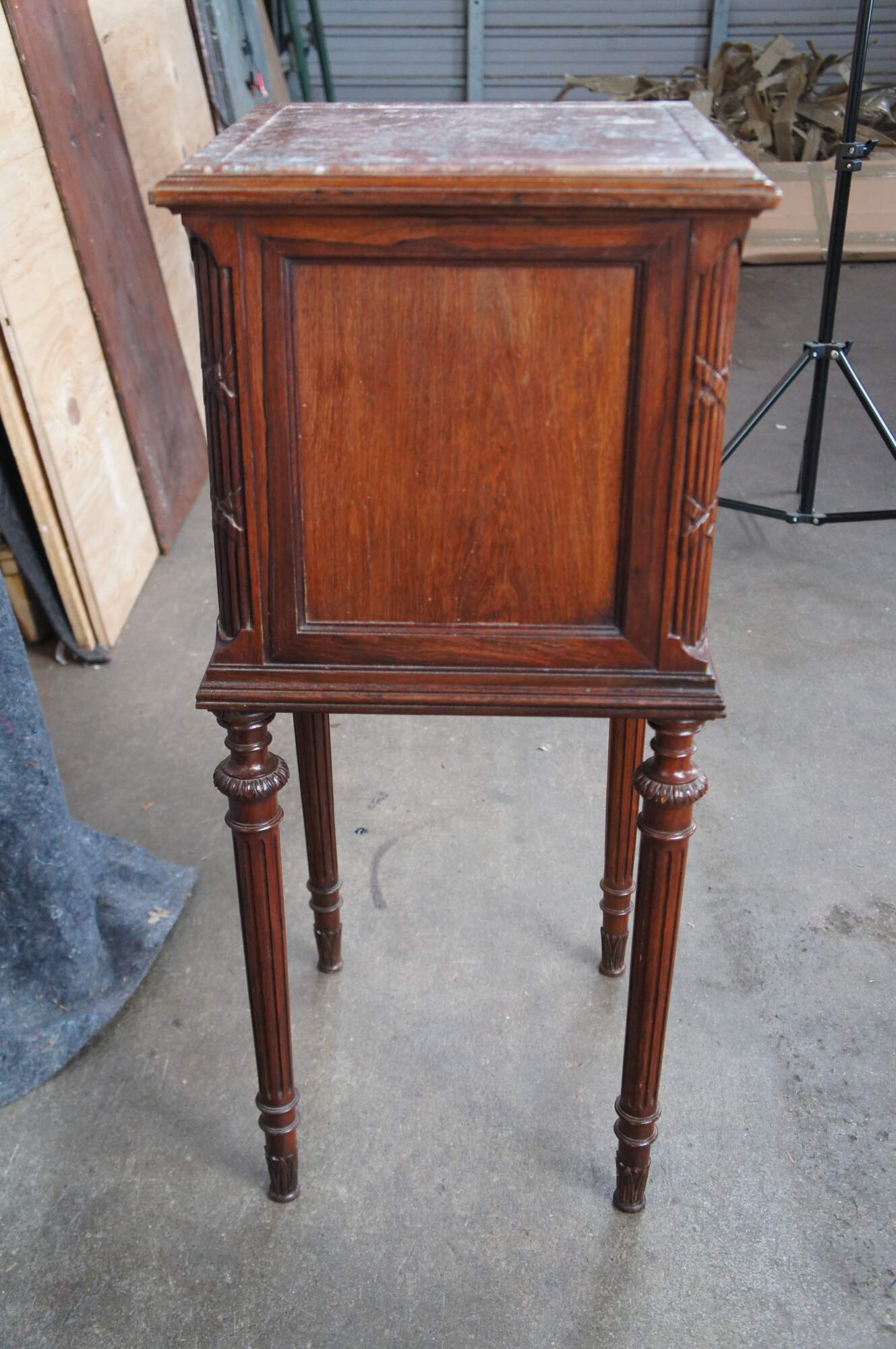 An antique late 19th Century French bedside table. Features a square frame made from walnut with inset rouge marble top. The case is accented by French medallions and ornate reeded and ribboned stiles. Includes one upper hand dovetailed drawer and a marble lined interior. The marble lined interior allows for use as a humidor. The cabinet is set over turned, fluted tapering legs with foliate carved feet.