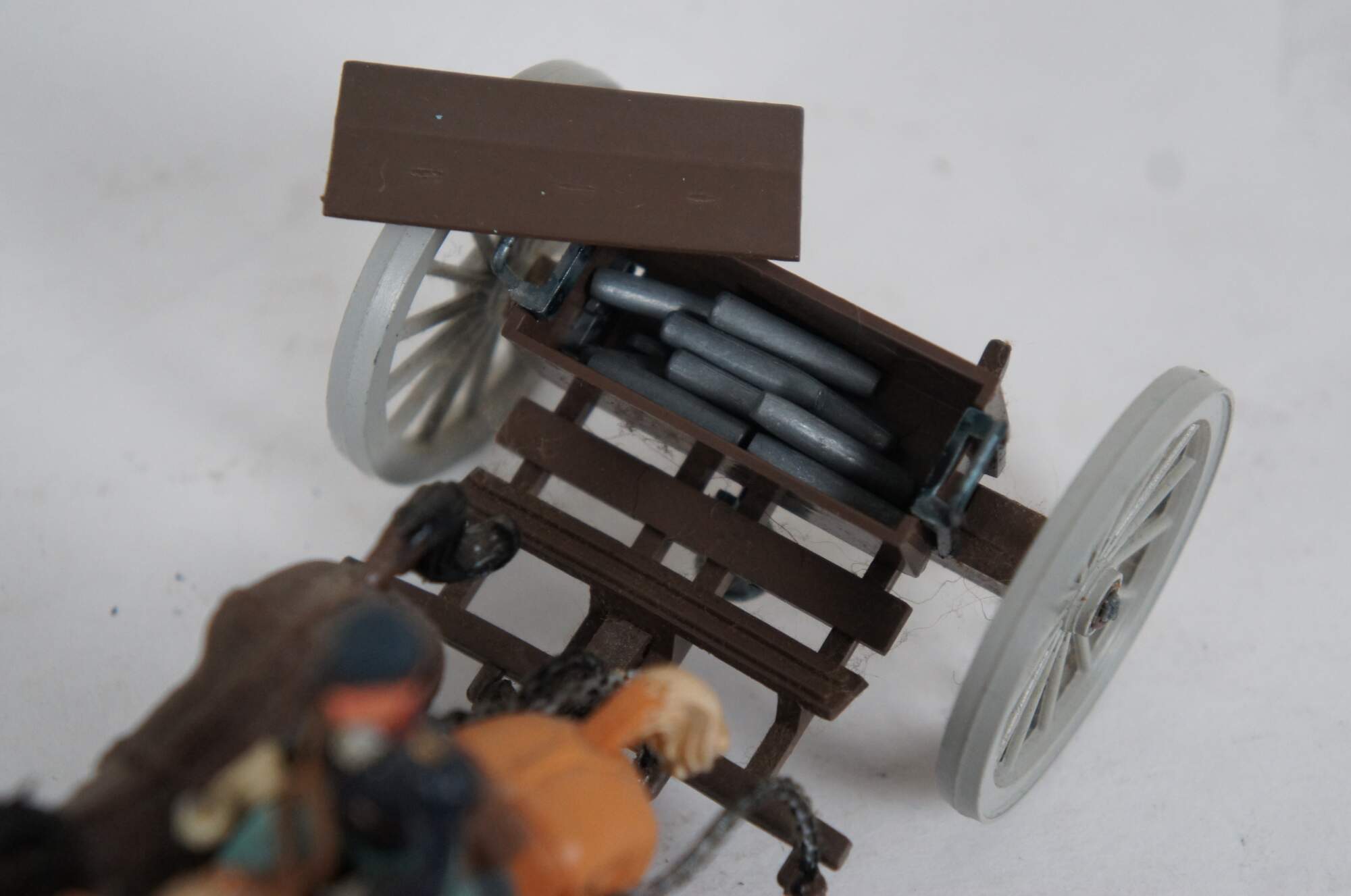 Circa 1970s set of plastic miliatary toys by Britains Ltd, portraying Union soldiers from the American Civil War. Includes a four horse carriage with two soldiers on horseback and trio of wagon riding soldiers, gun carriage / wagon with shells in the storage seat, and five cannons.