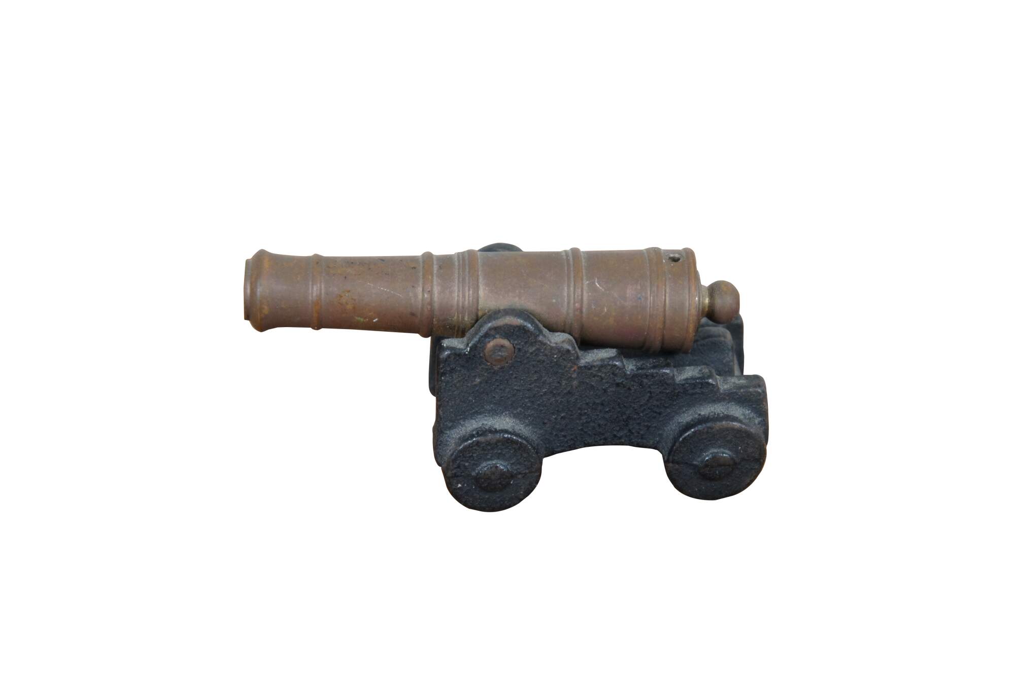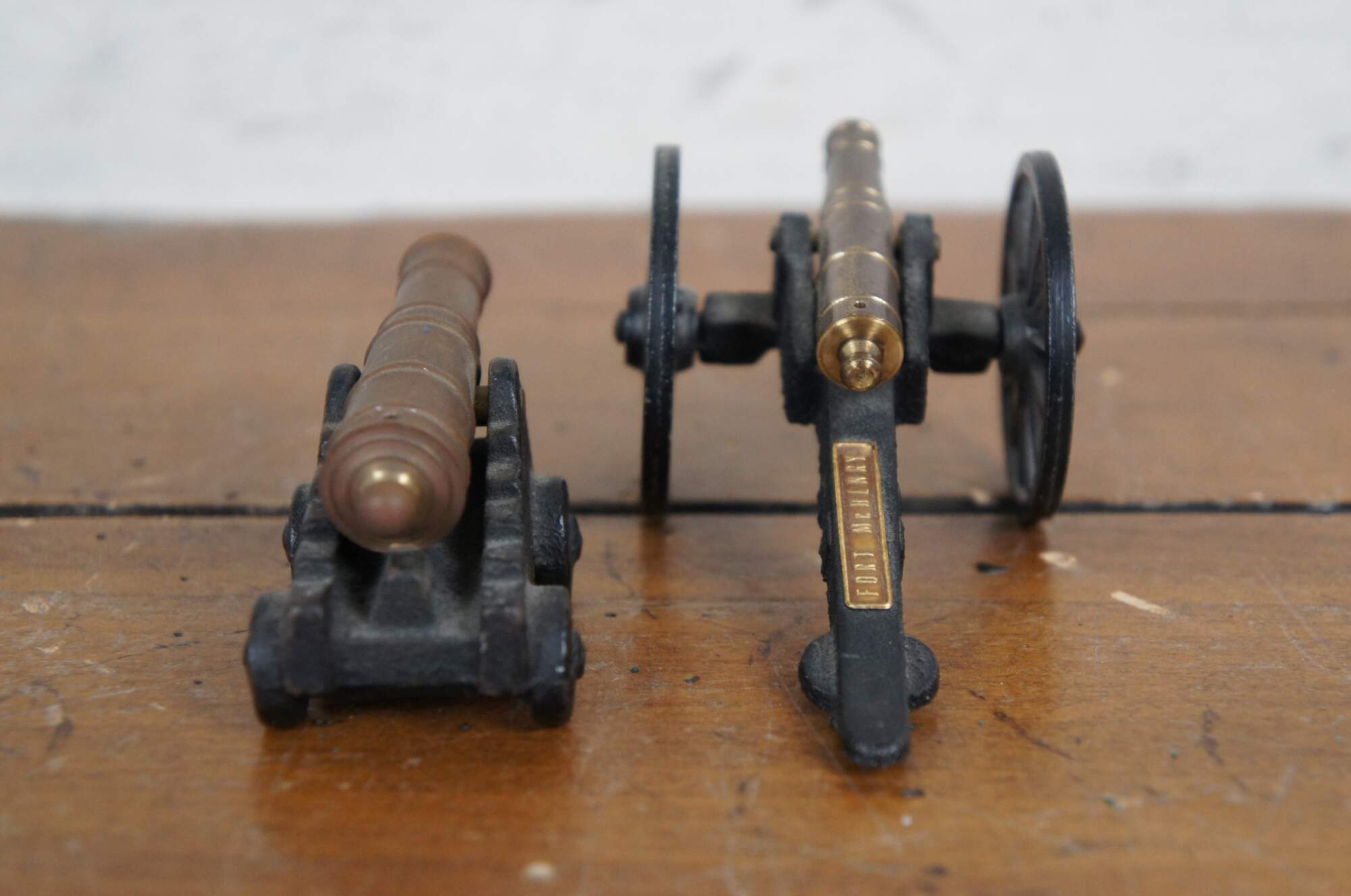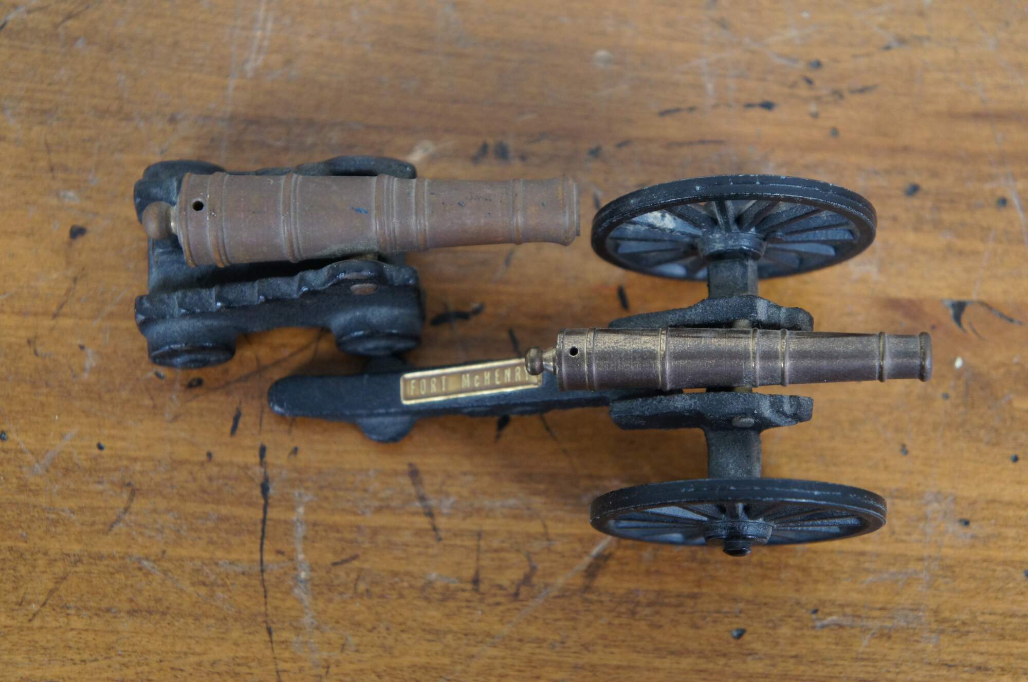 Pair of late 20th century miniature replica Civil war cannons featuring cast iron bases and brass barrels. One from Fort McHenry, made by MFCo.