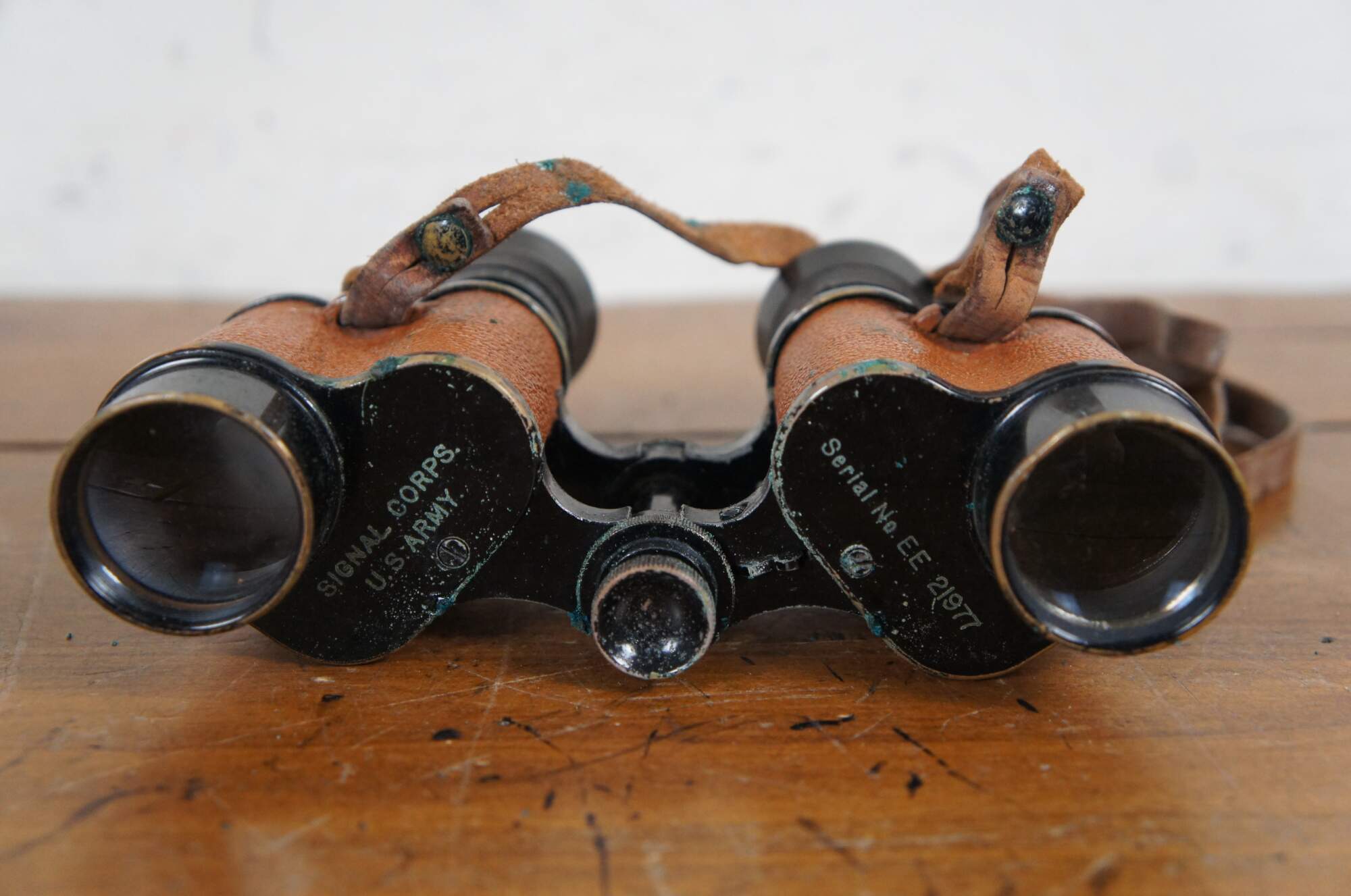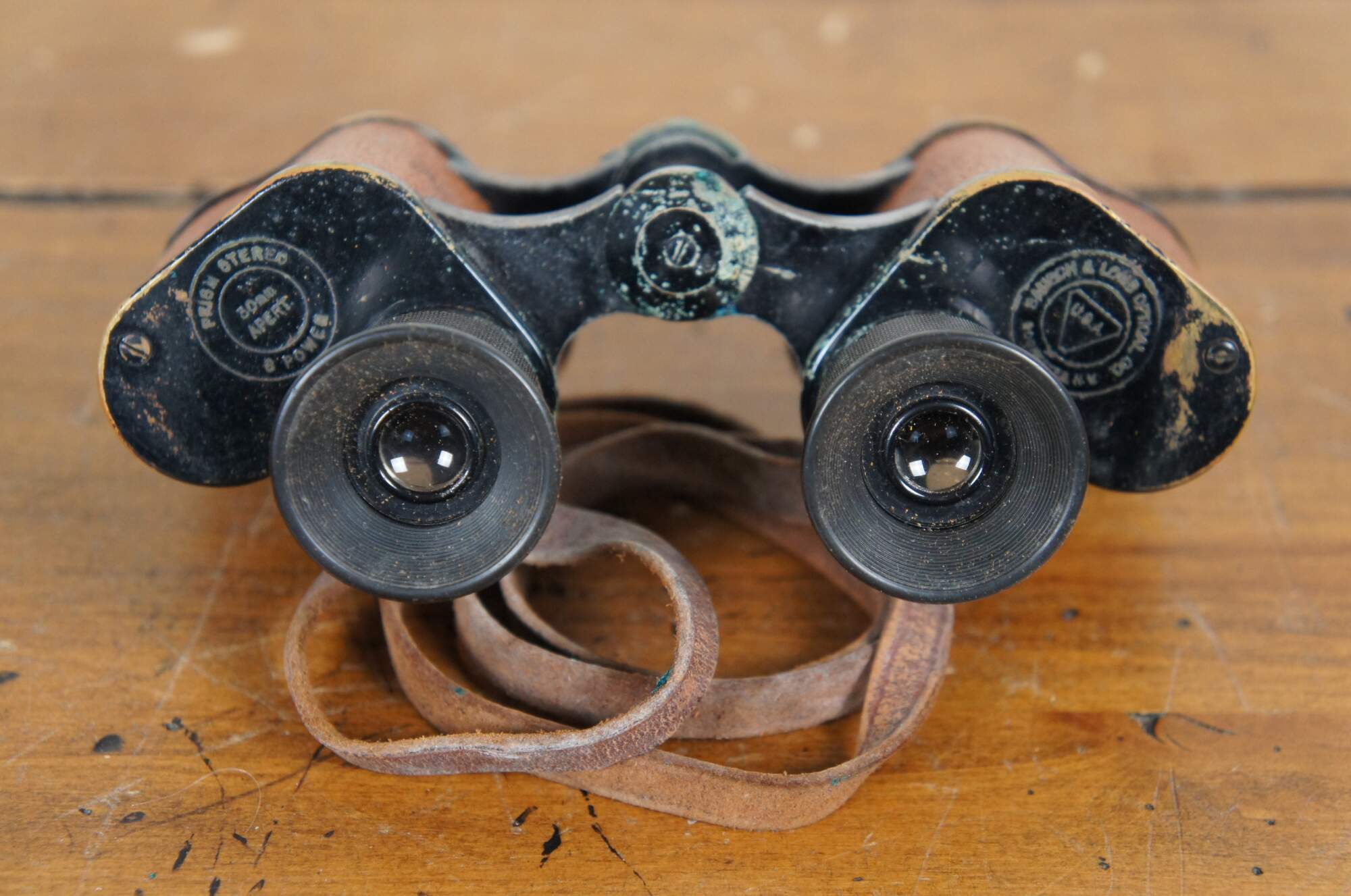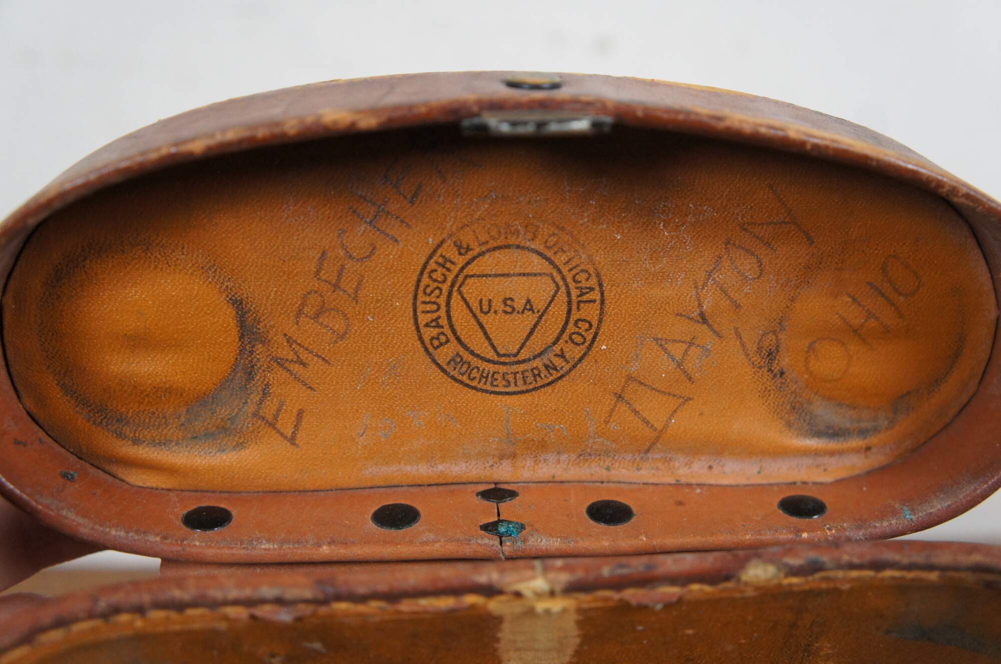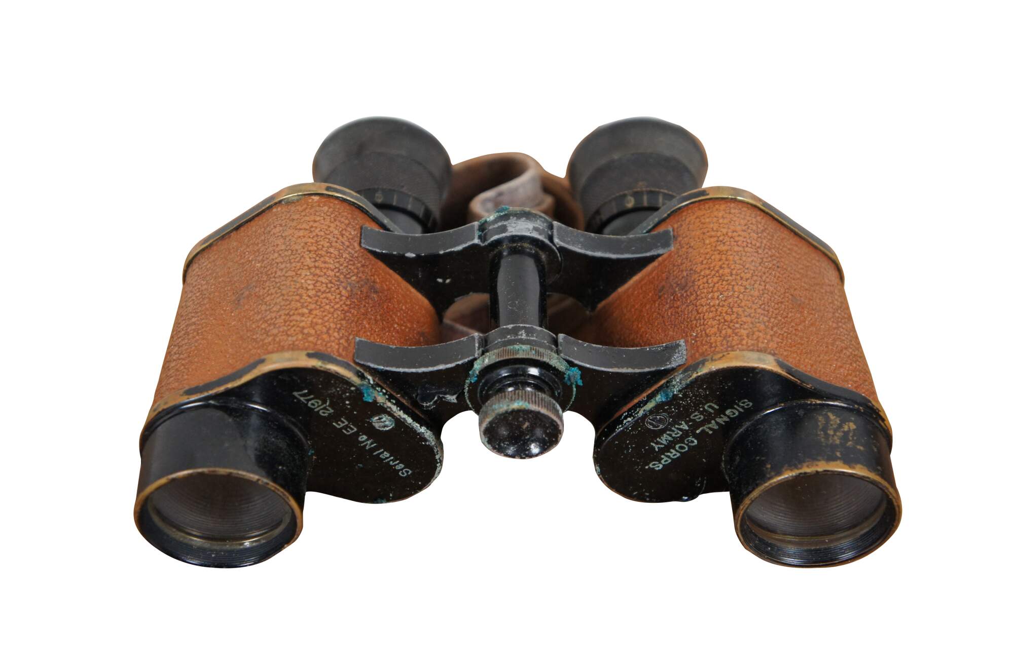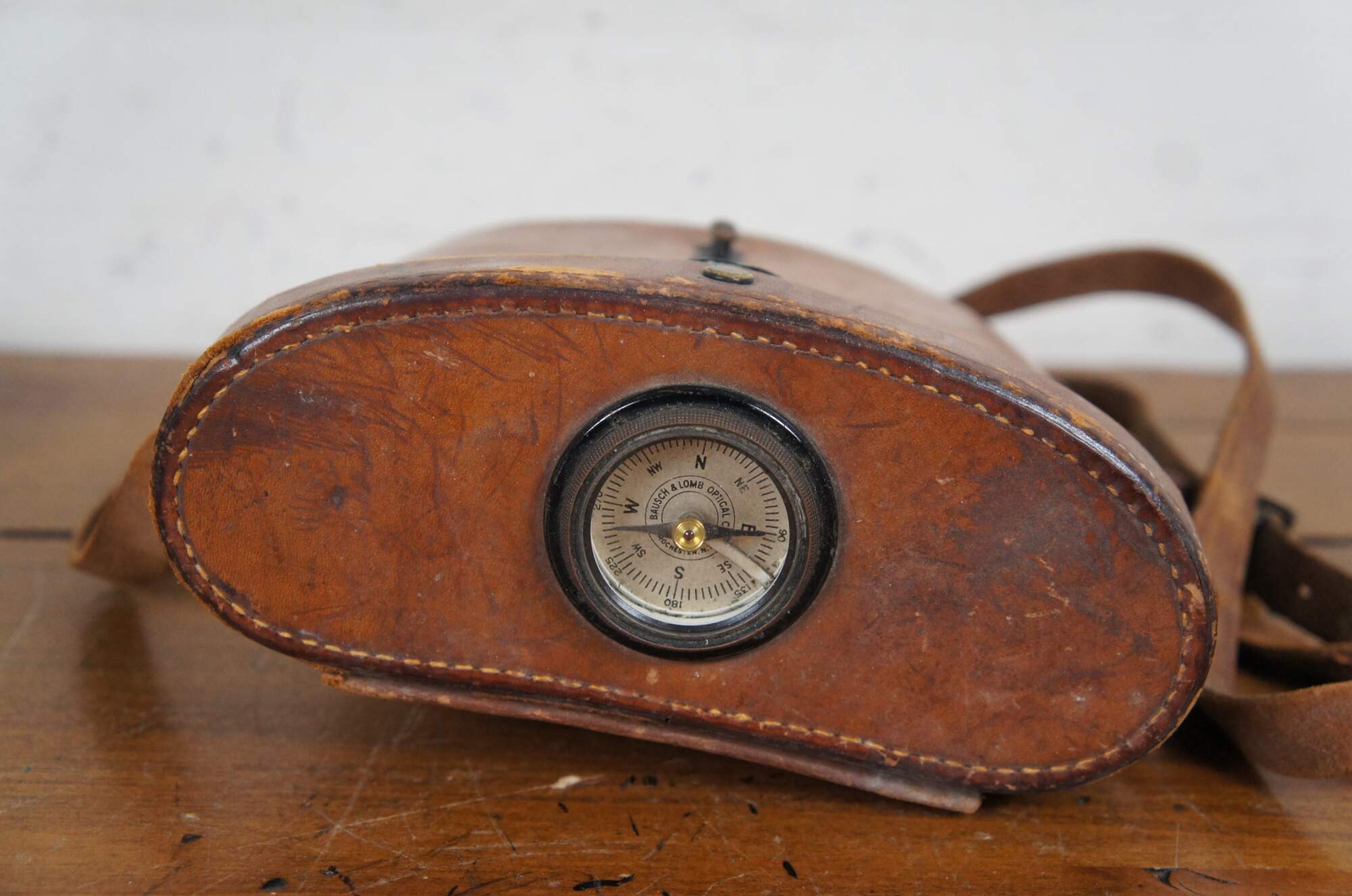 Antique 1940's / World War II US Army / Military Signal Corps binoculars, manufactured by Bausch & Lomb Optical Co. Black painted brass with brown leather grips. Brown leather carrying case with compass in lid. Serial No. EE 21977. Made in USA. Interior of case marked "EMBecher Dayton 6 Ohio.
