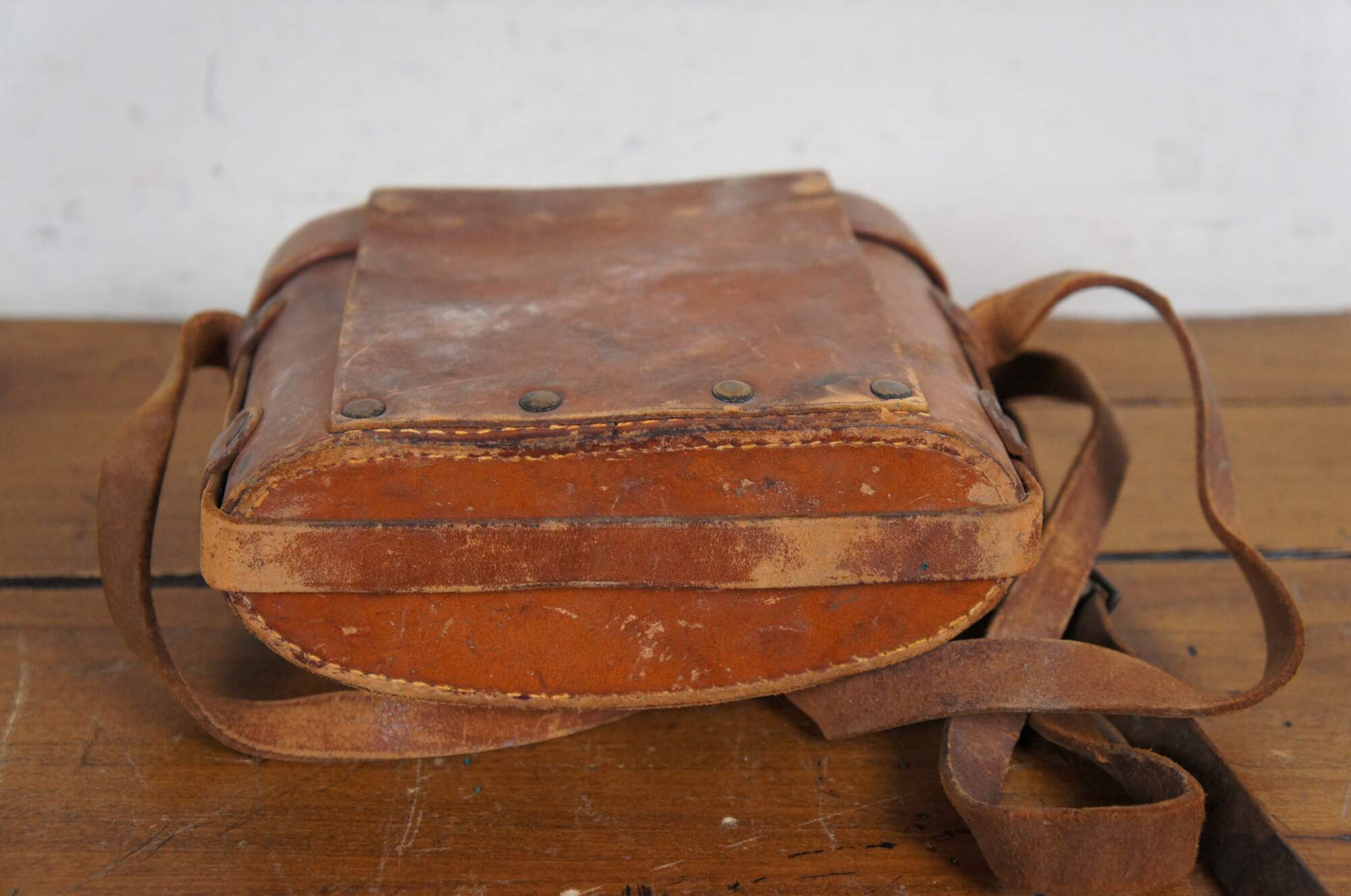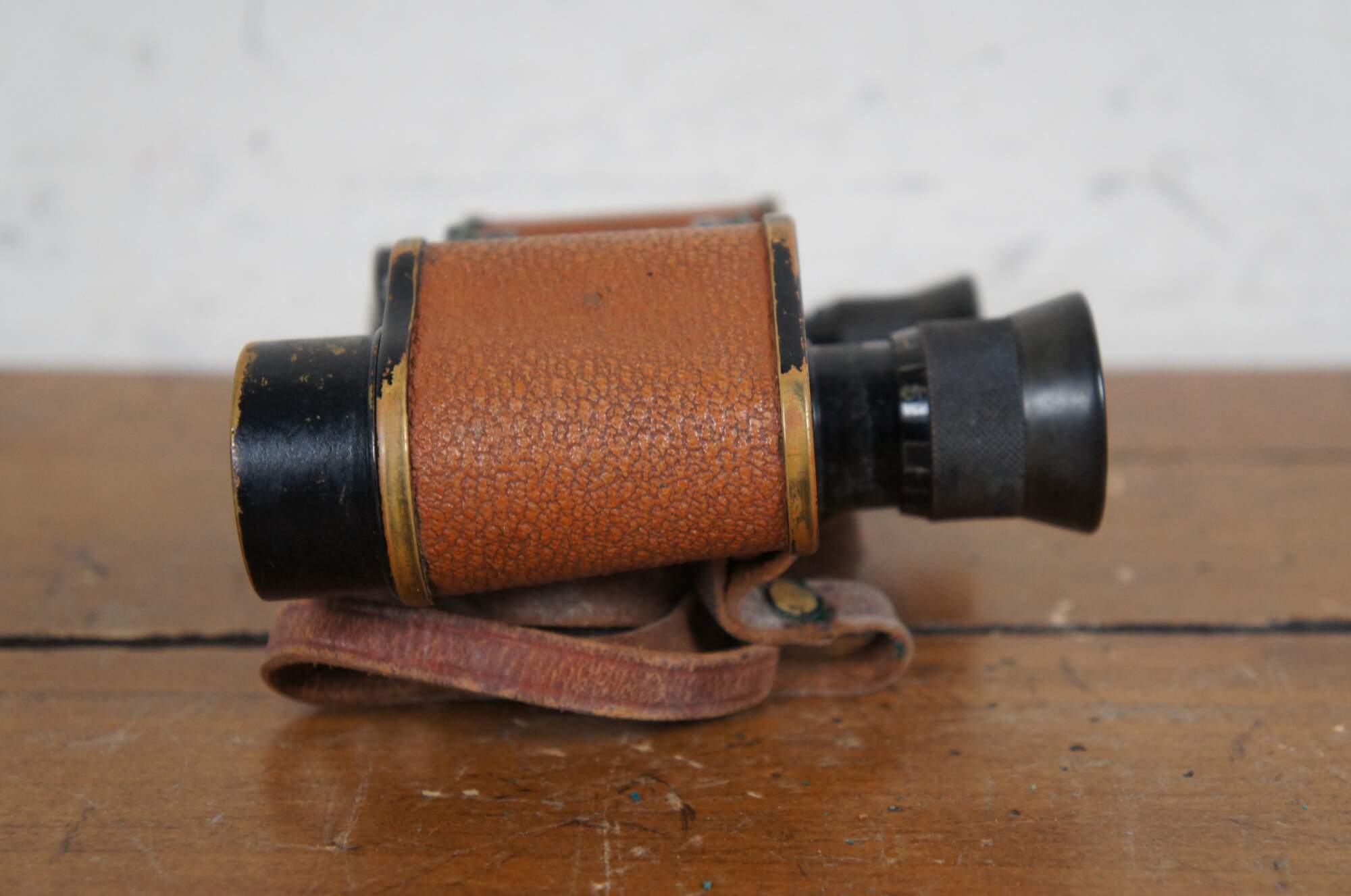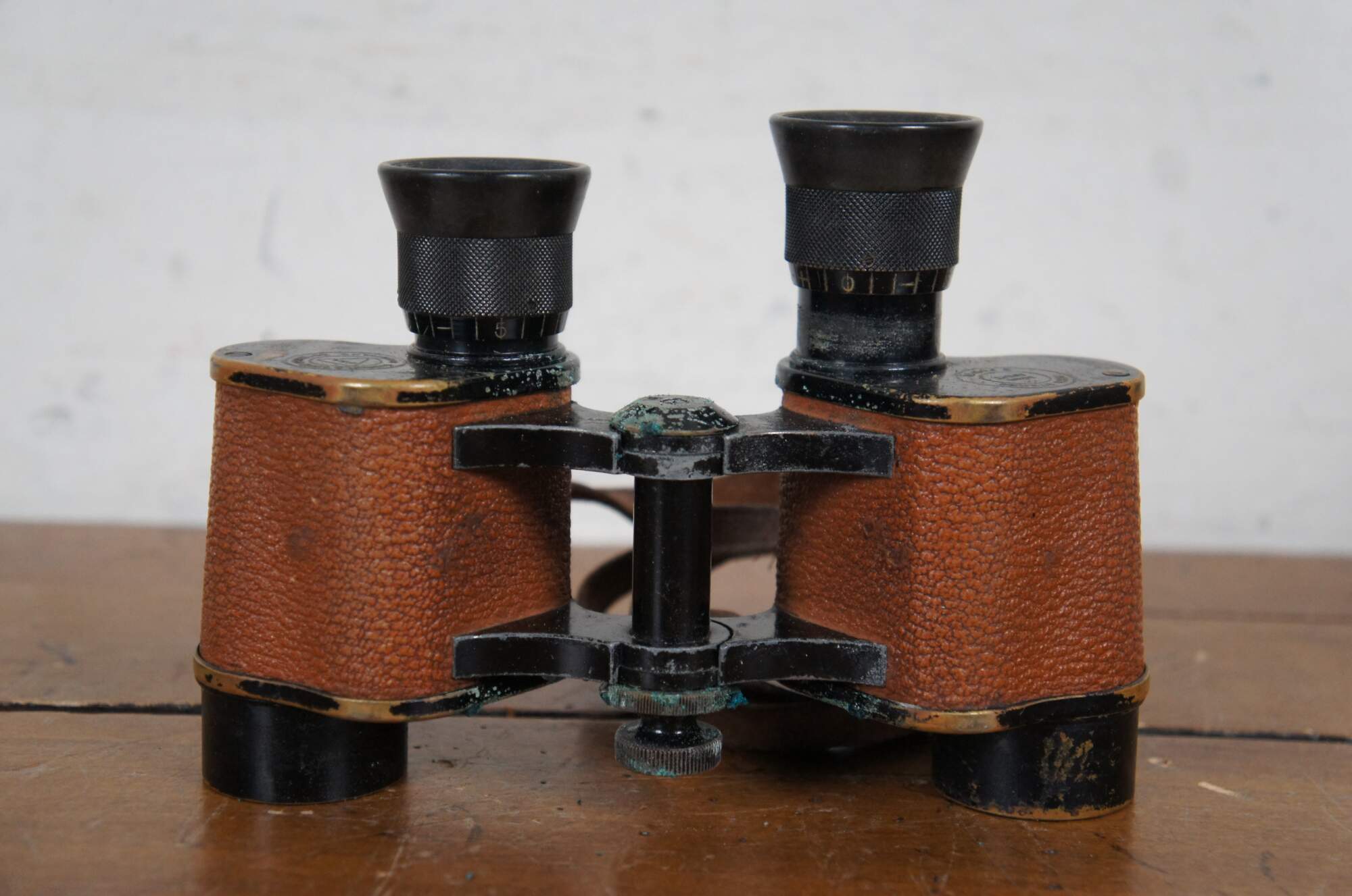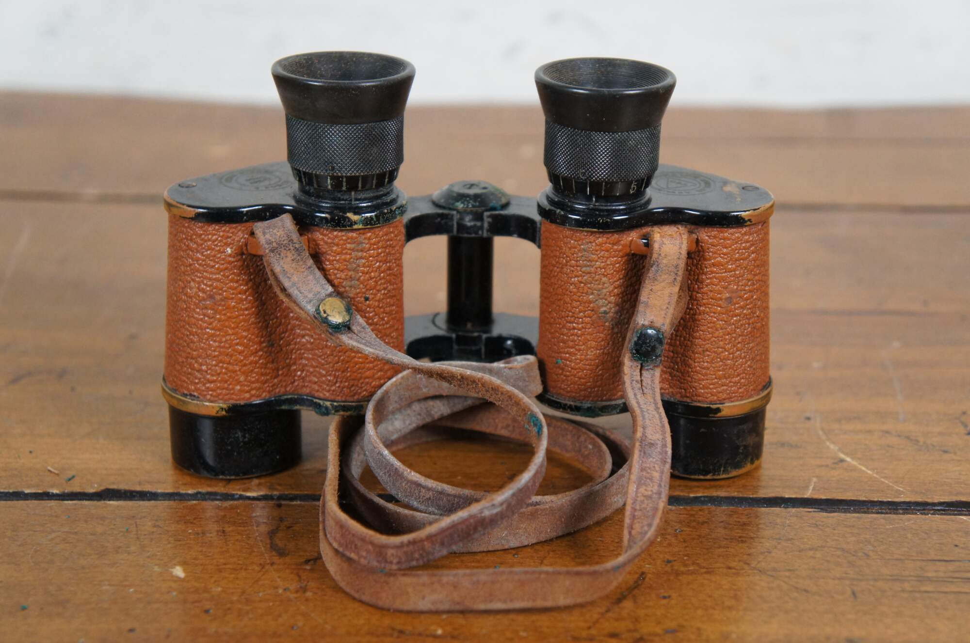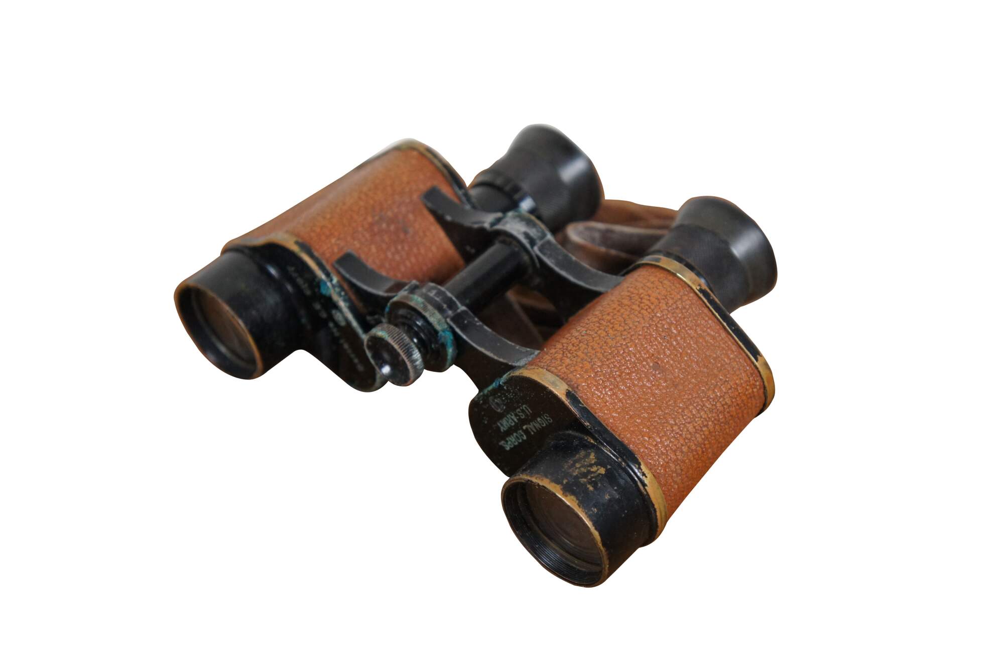 Antique 1940's / World War II US Army / Military Signal Corps binoculars, manufactured by Bausch & Lomb Optical Co. Black painted brass with brown leather grips. Brown leather carrying case with compass in lid. Serial No. EE 21977. Made in USA. Interior of case marked "EMBecher Dayton 6 Ohio.