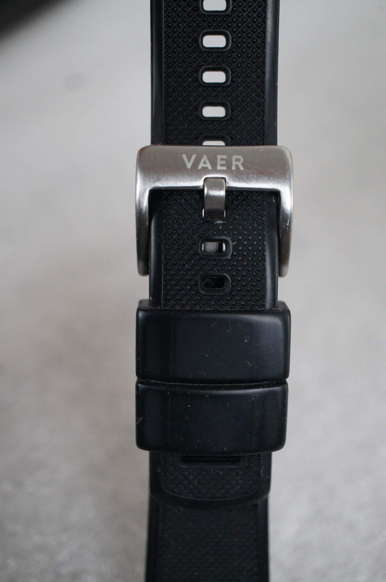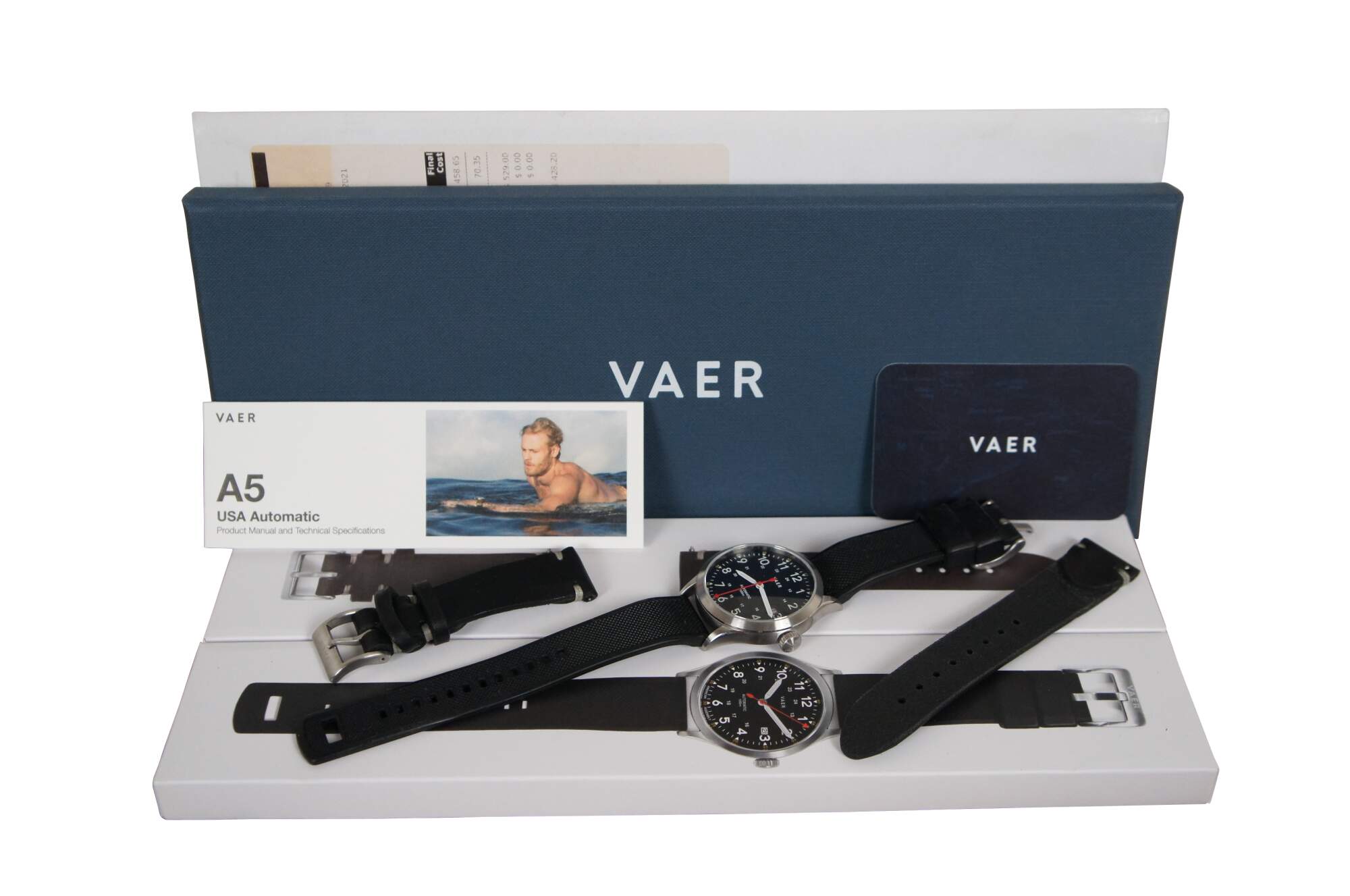 Vaer A5 Field Black 10ATM Automatic Wristwatch - 316L Stainless Steel Case, Domed Sapphire Crystal with Internal AR, Screwdown Crown, Japanese Miyota 9015 Movement, Sapphire Exhibition Caseback, 20mm Straps. SKU: A5-FB-QRSLBLK. Assembled in the USA. Black silicone band. QR Horween Black 20mm Quick Release Strap - Leather Tanned by Horween in Chicago, Illinois, Heavy Native Steerhide, 316L Stainless Steel Buckle. SKU: QRHWBLK. Made in USA.