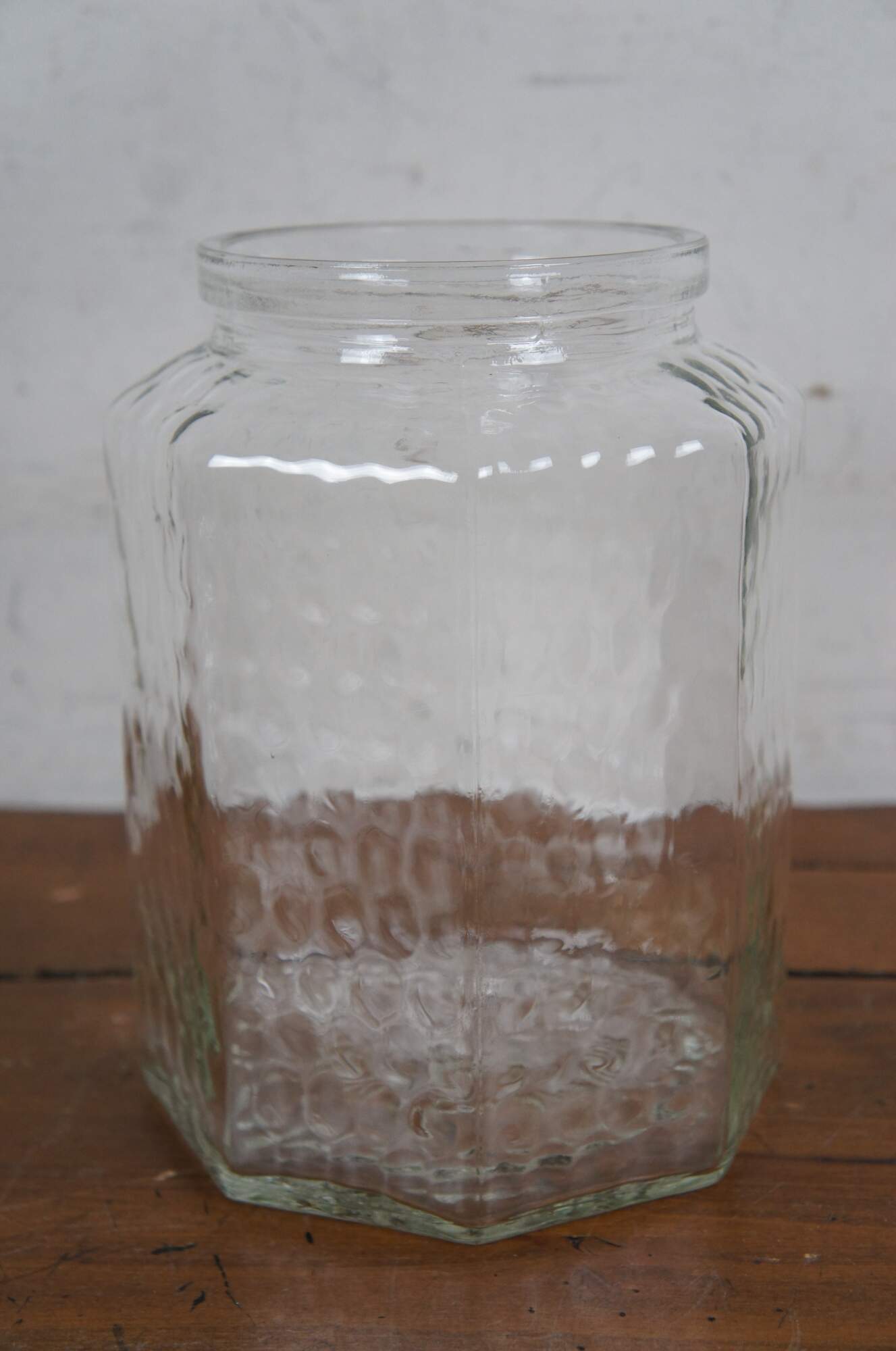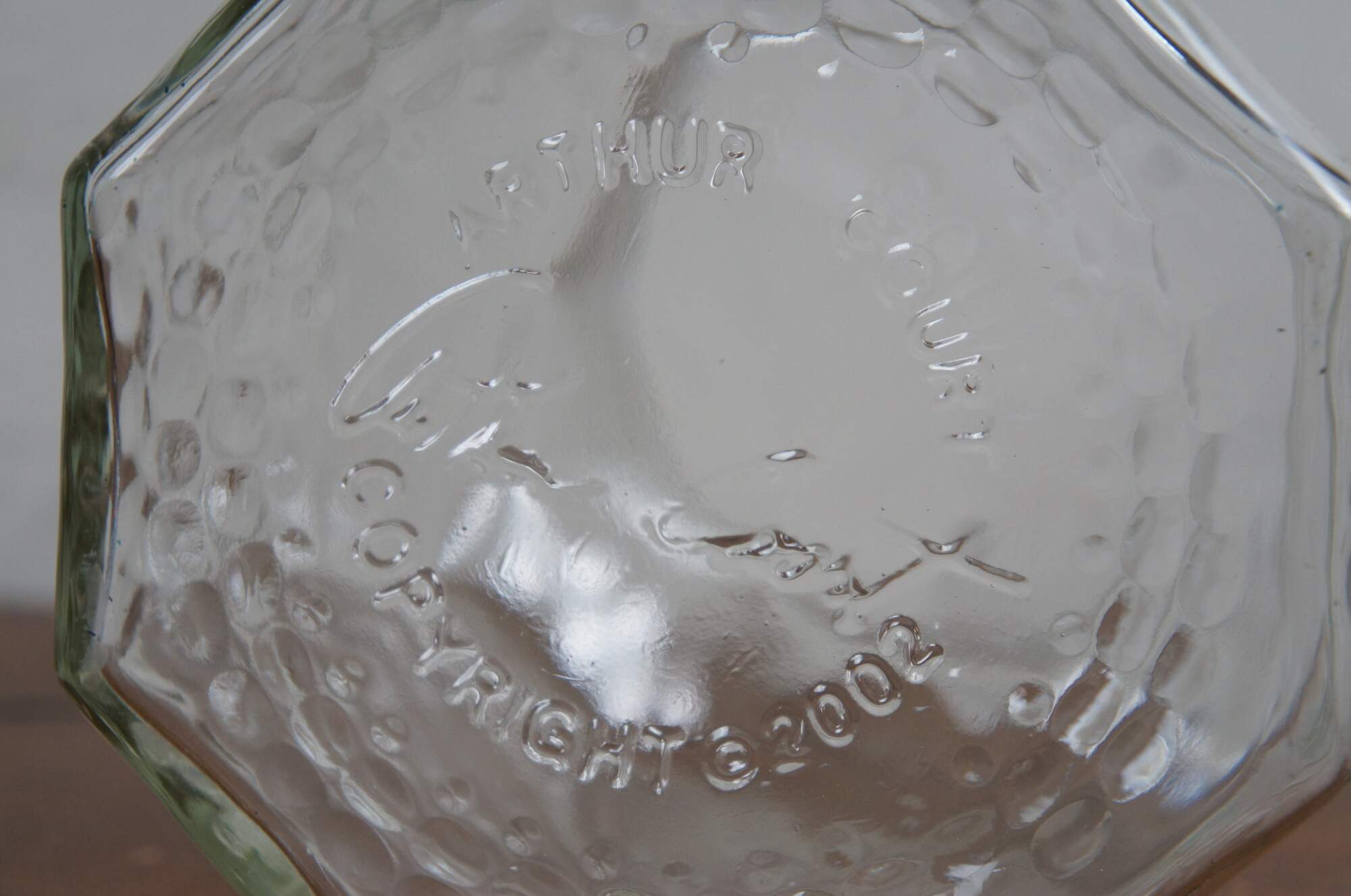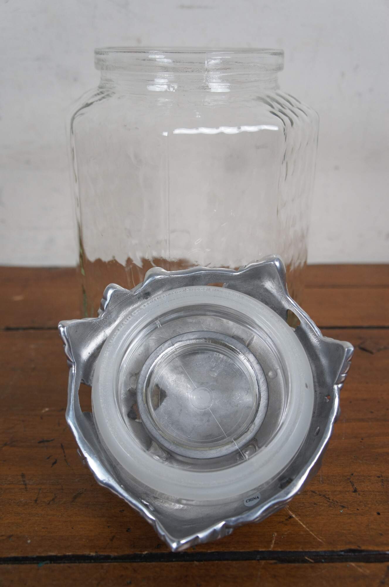 Vintage 2002 Arthur Court kitchen canister featuring an octagonal dimpled glass jar with a brightly polished cast aluminum grapevine lid. Retired design.
