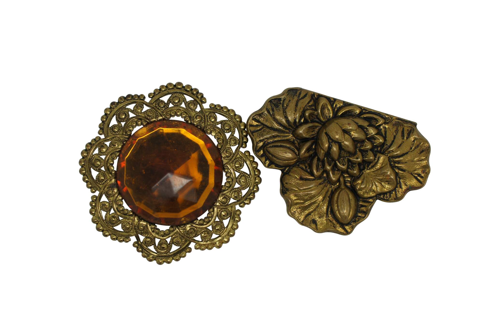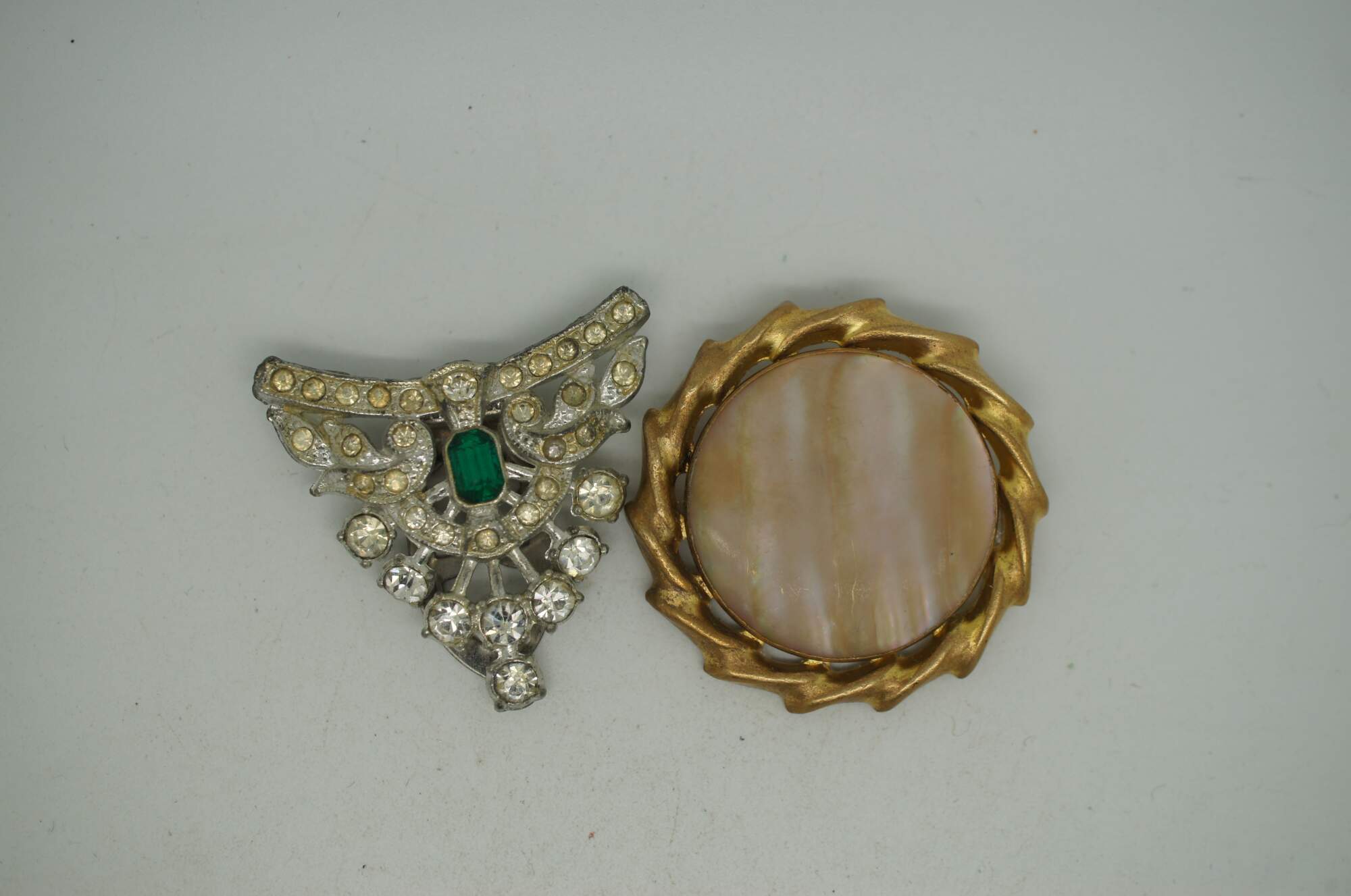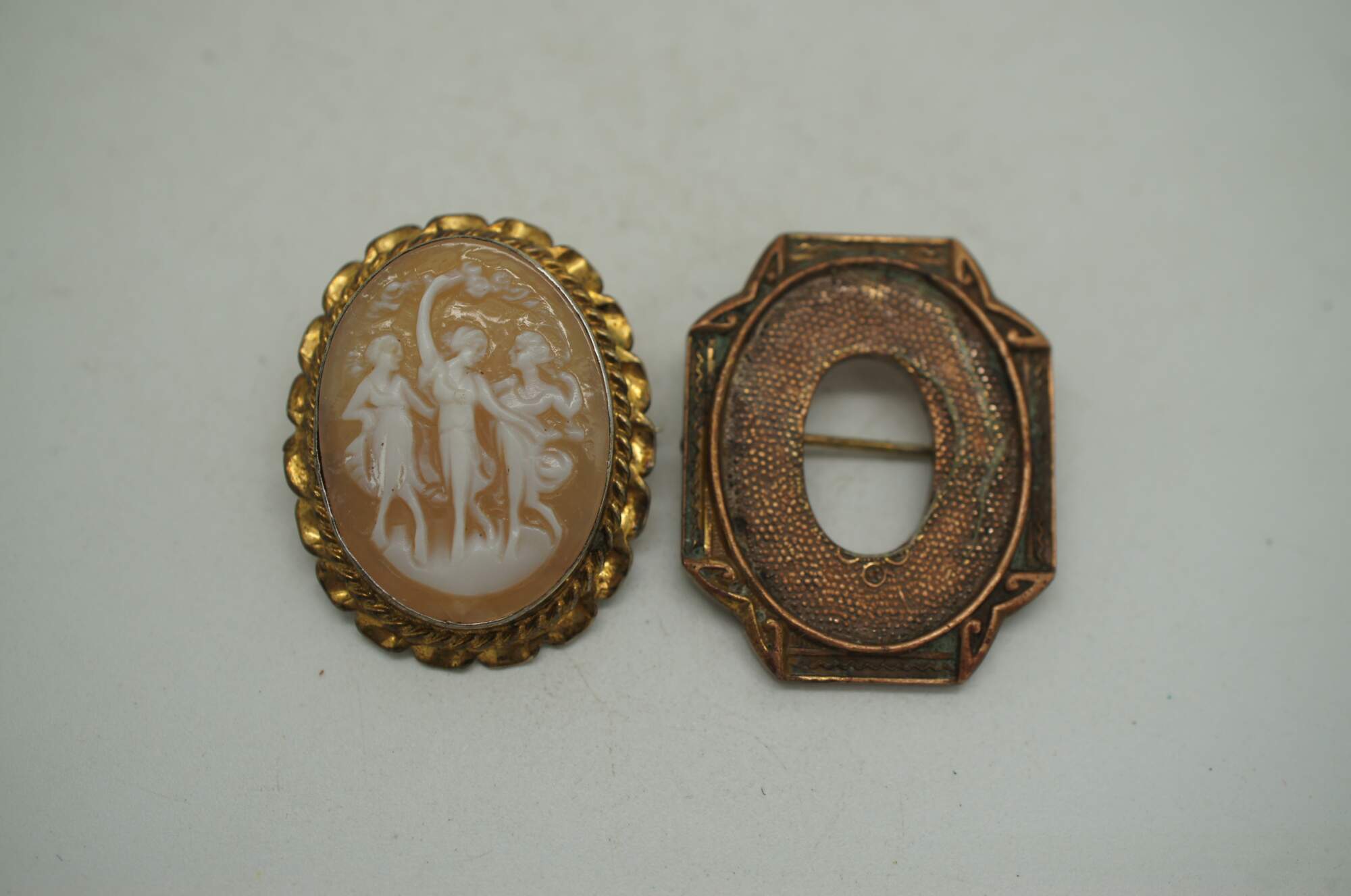 Lot of 17 mid to late 20th century pins / brooches in a variety of styles, many sporting a Victorian / Art Nouveau style. Brass, enamel, rhinestone, cameo, mother of pearl.