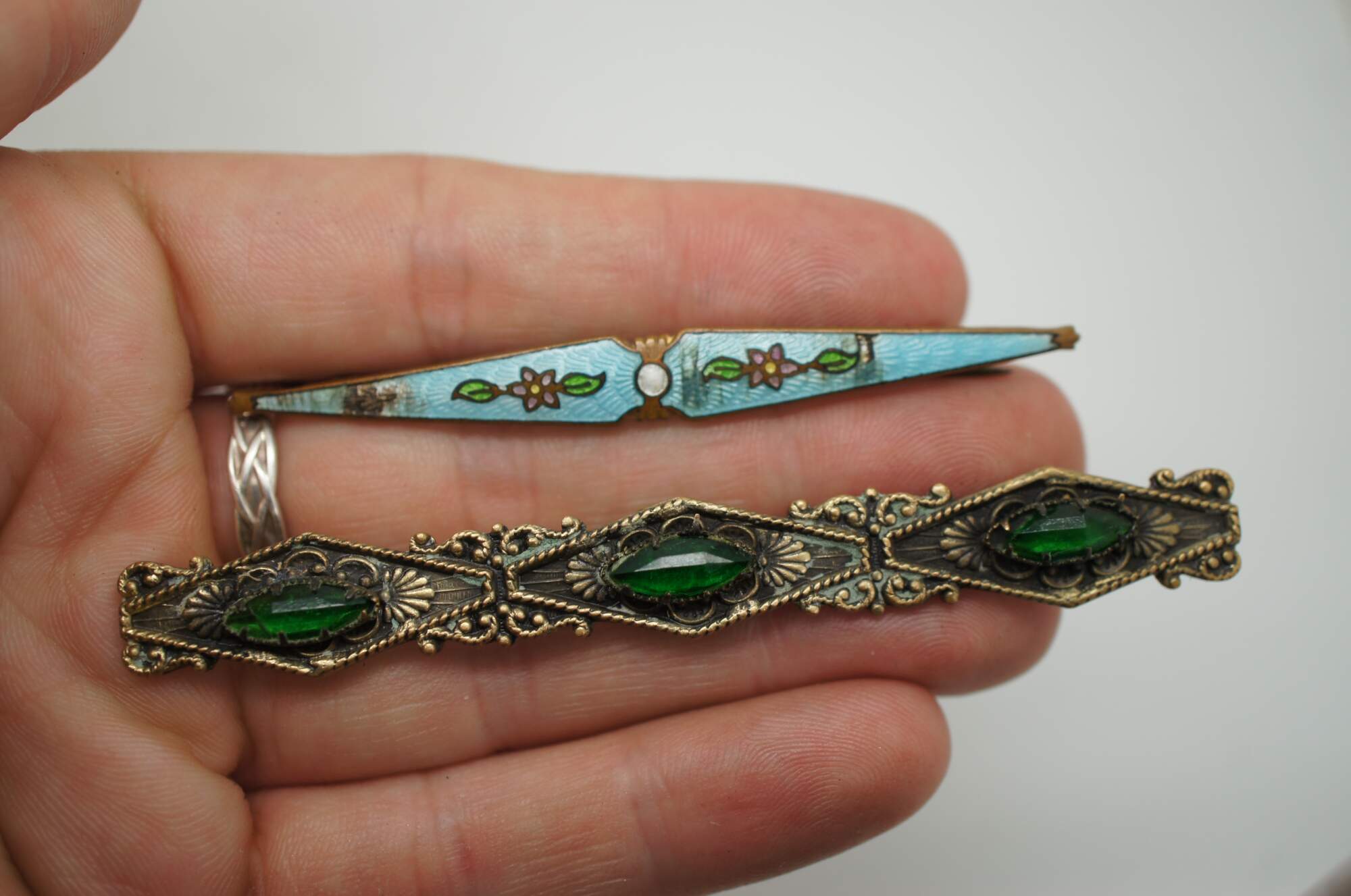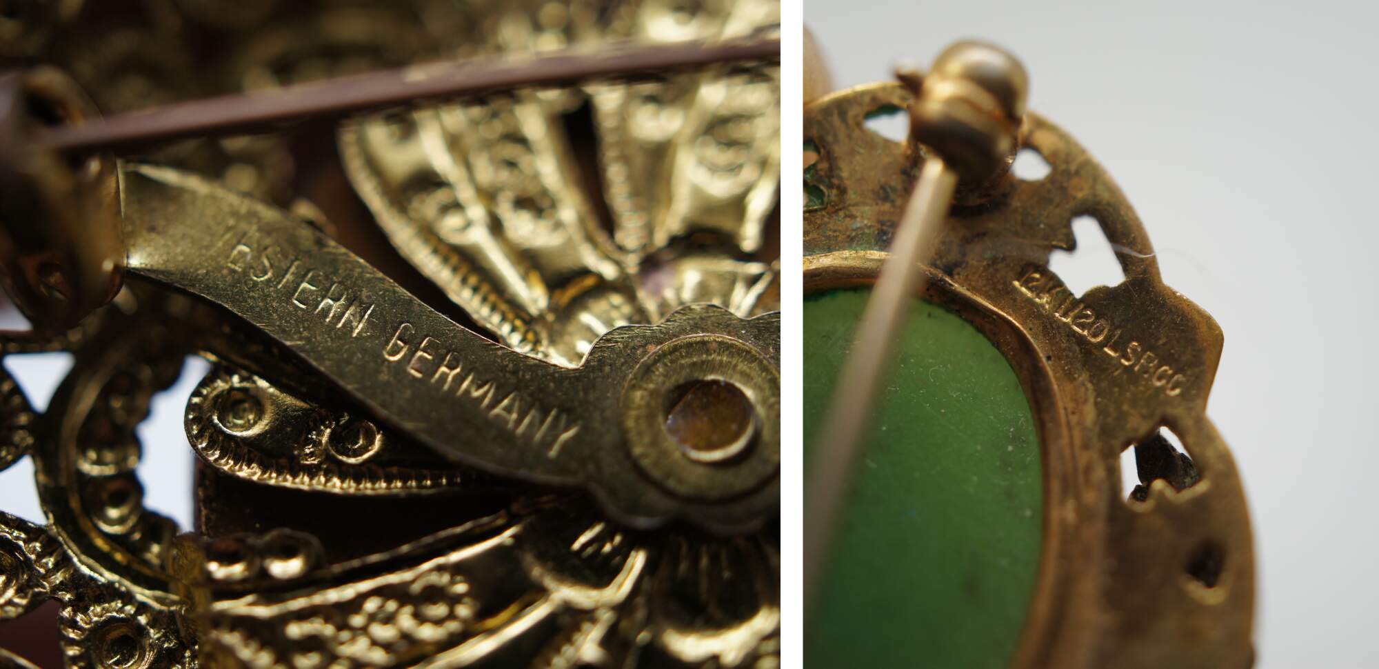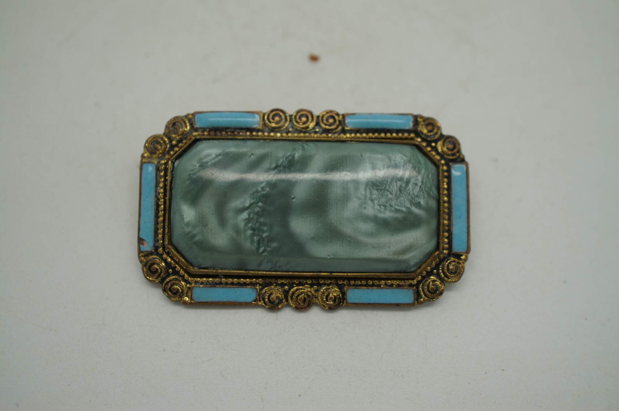 Lot of 17 mid to late 20th century pins / brooches in a variety of styles, many sporting a Victorian / Art Nouveau style. Brass, enamel, rhinestone, cameo, mother of pearl.