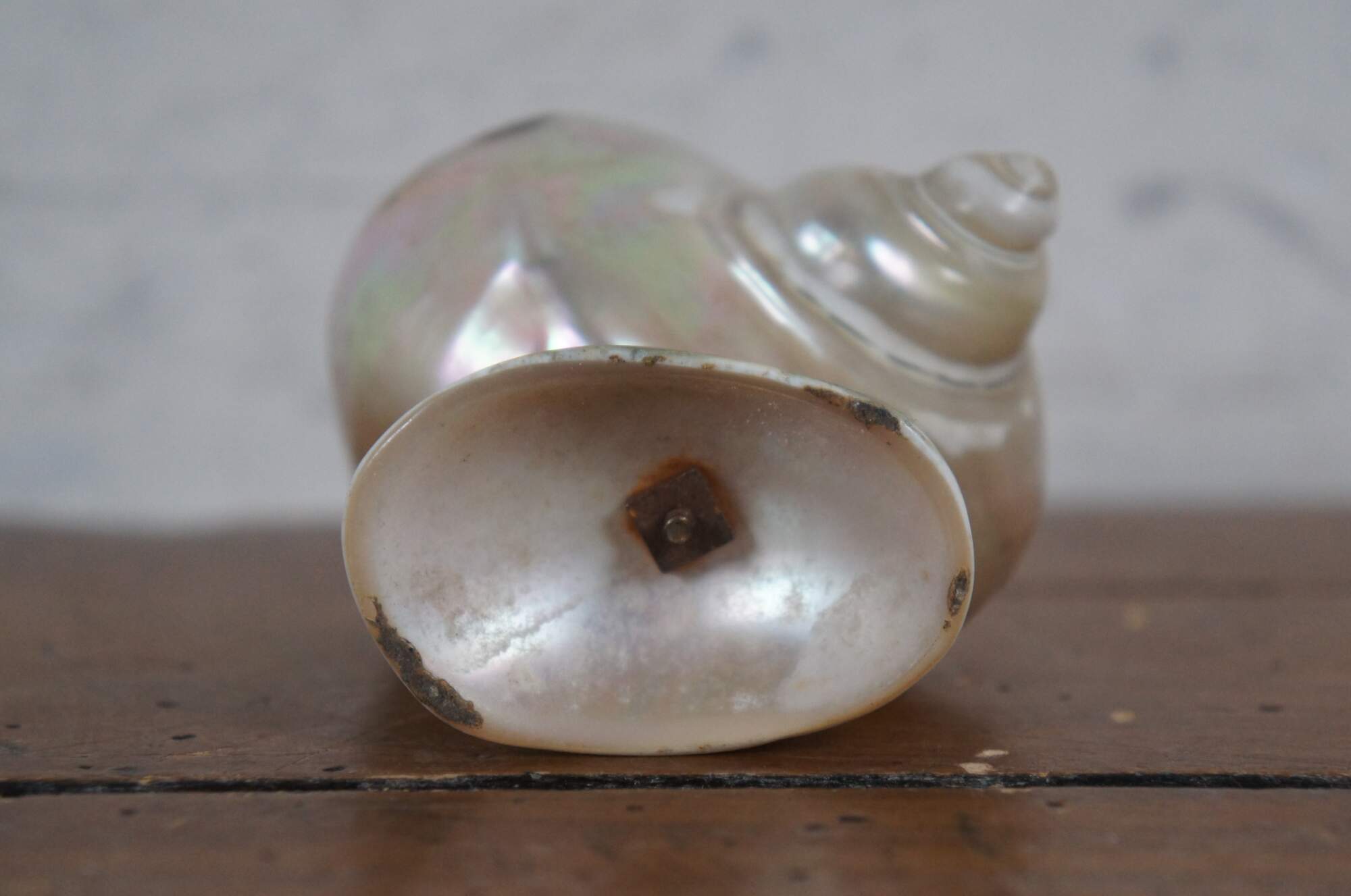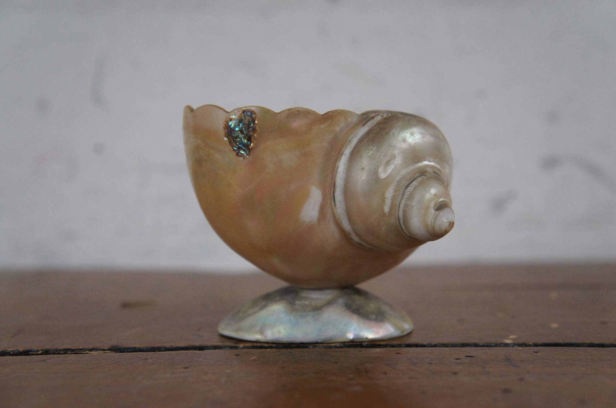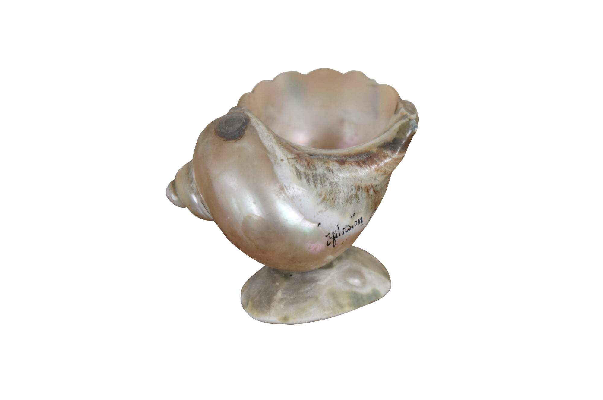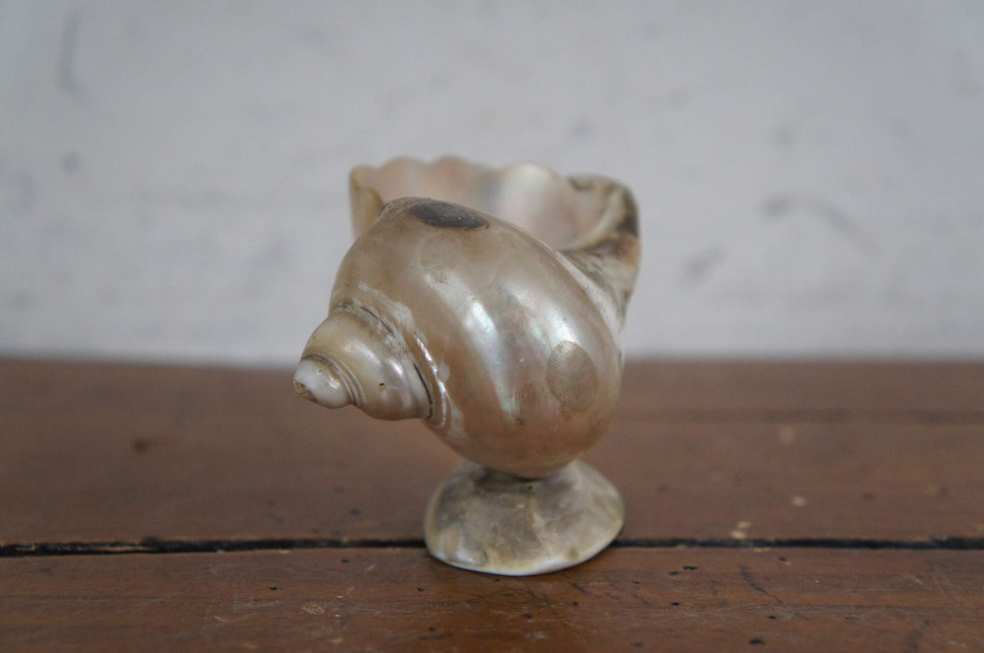 Antique polished mother or pearl spiral nautical sea shell with scalloped edge mounted to a matching base, painted with the worn name of the place it was from. Petite size perfect for use as a bud vase or ashtray / inkwell / petite compote.